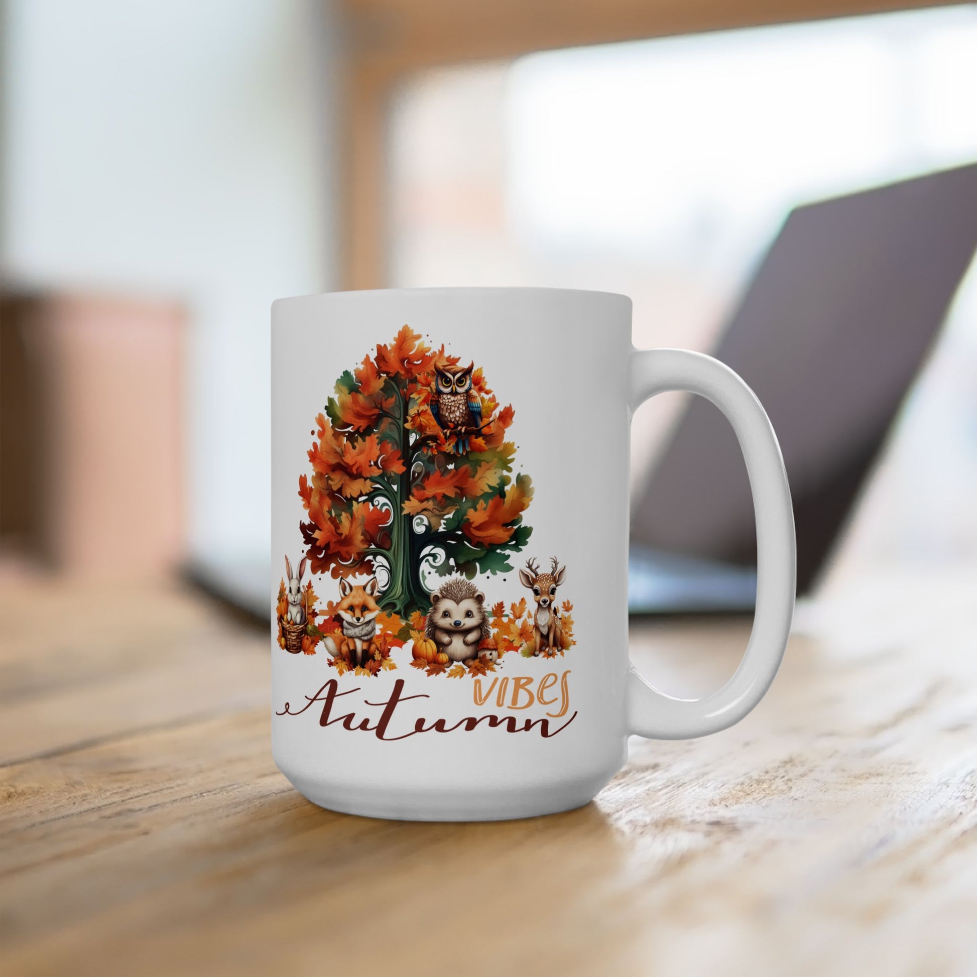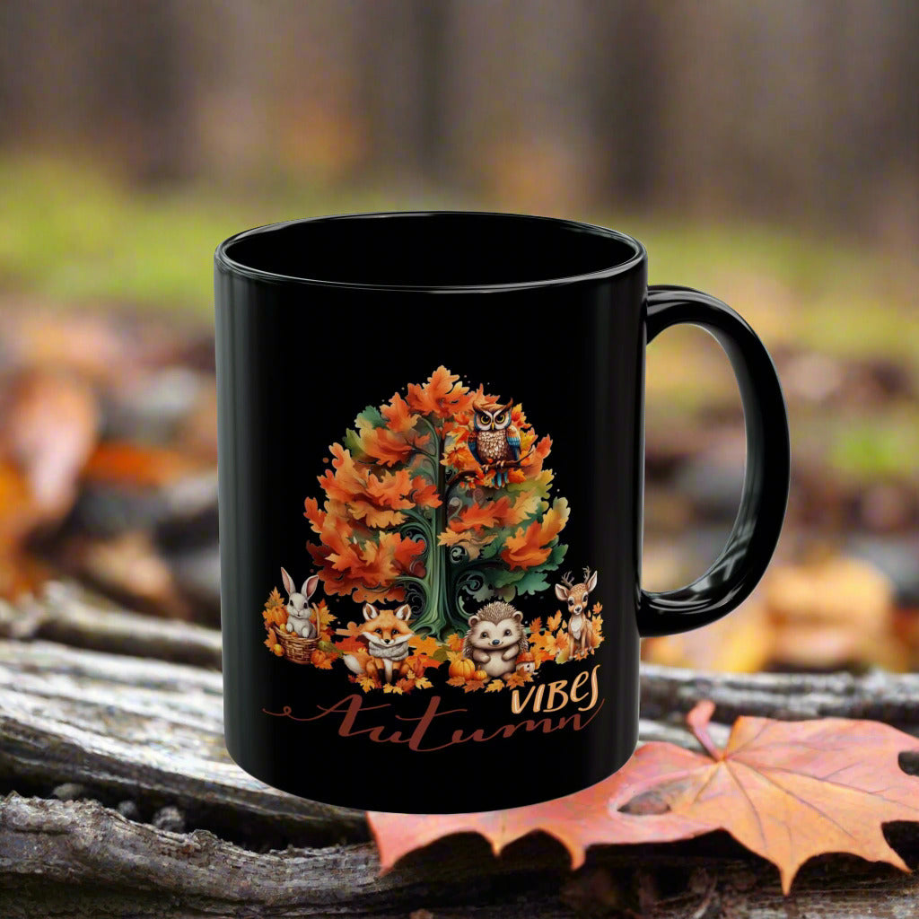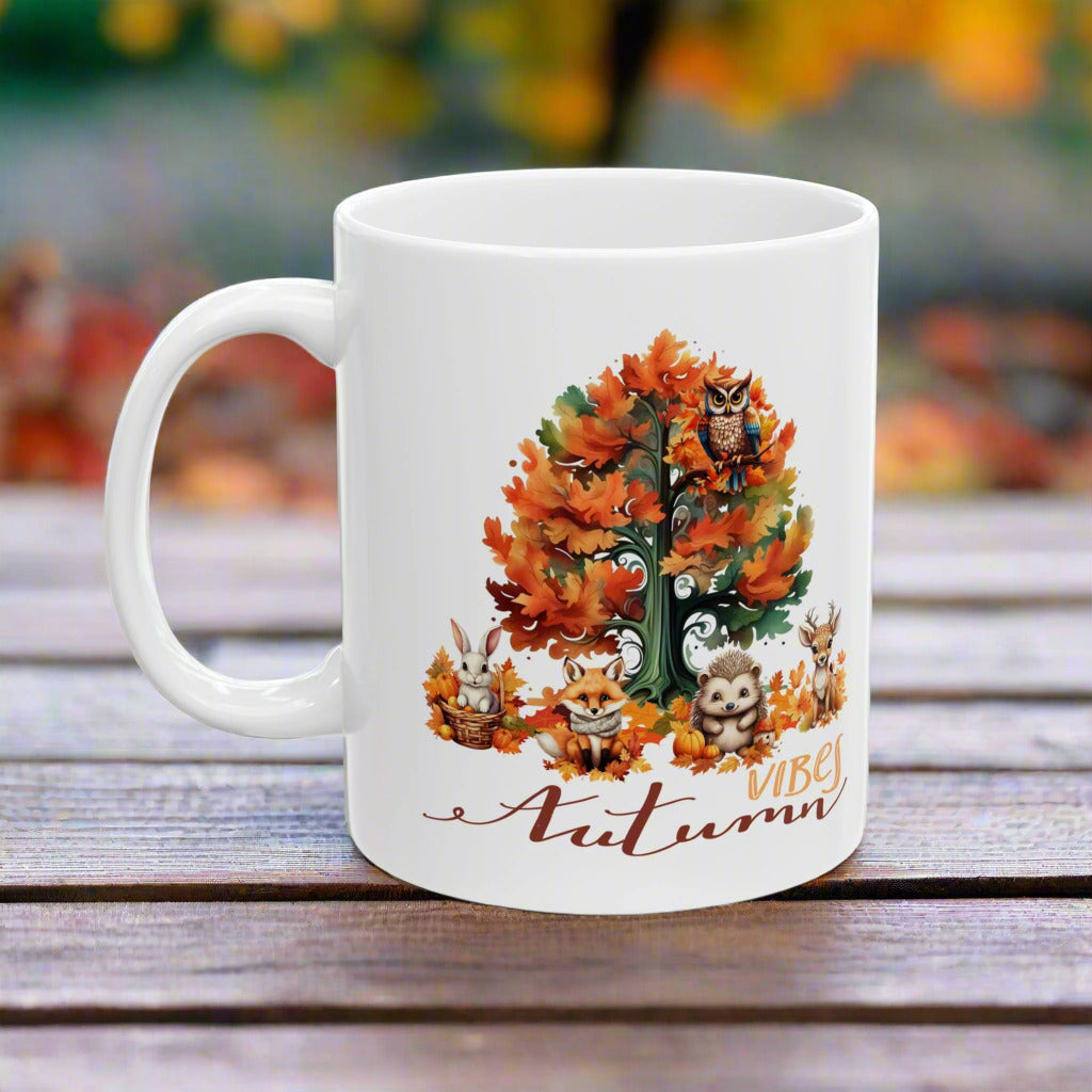 Celebrate the beauty of fall with this charming "Autumn Vibes" mug featuring a vibrant autumn tree and adorable forest animal illustrations, including an owl, fox, hedgehog, rabbit, and deer. Made from high-quality ceramic, this cozy coffee cup is perfect for enjoying your favorite hot beverages during the fall season. Dishwasher safe and an ideal gift for autumn enthusiasts, nature lovers, or anyone who loves the warm, festive spirit of fall. Bring the magic of autumn to your daily routine!
