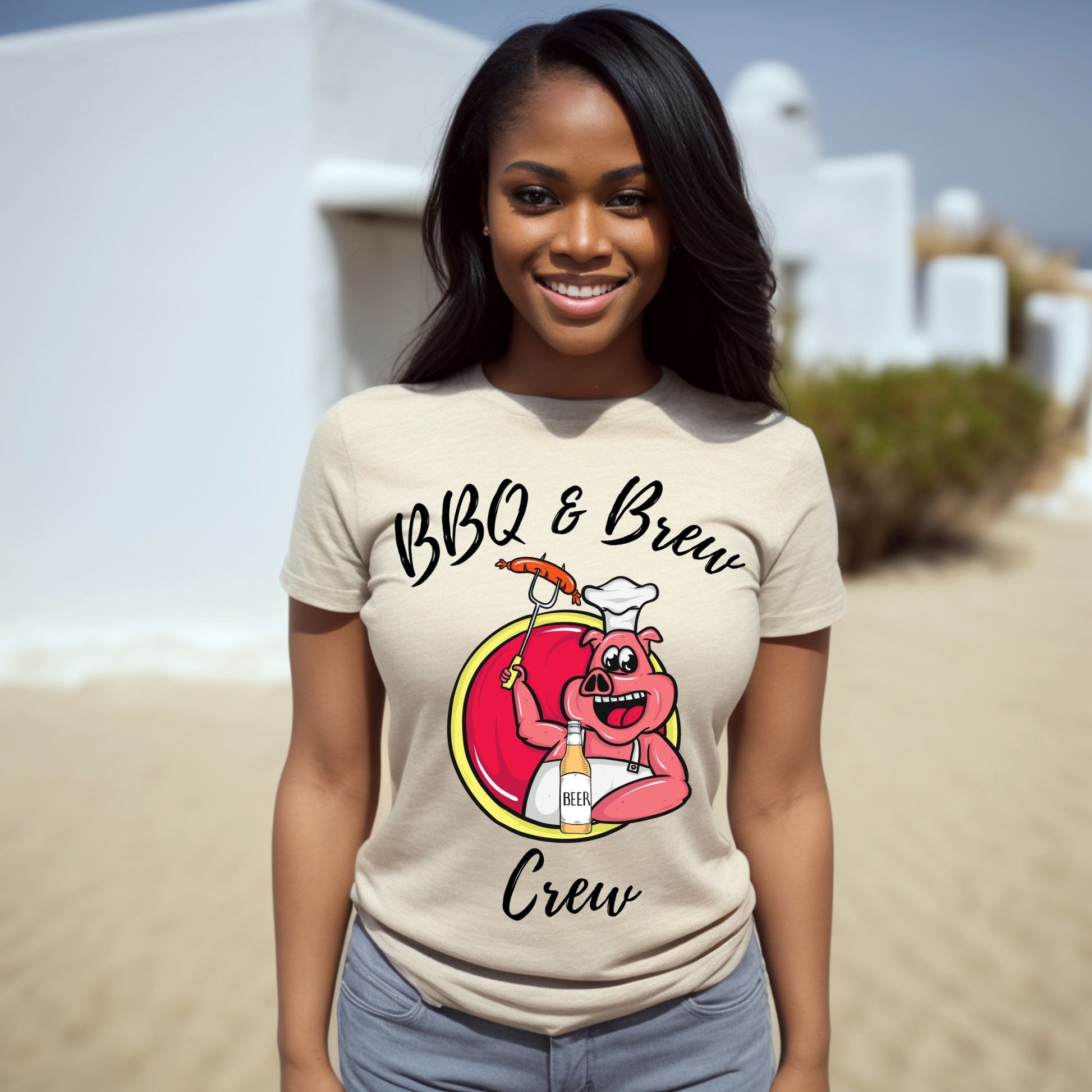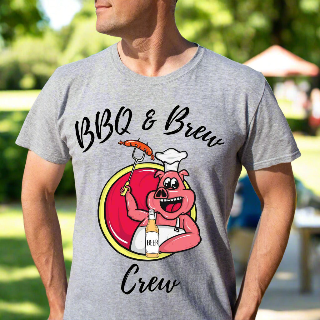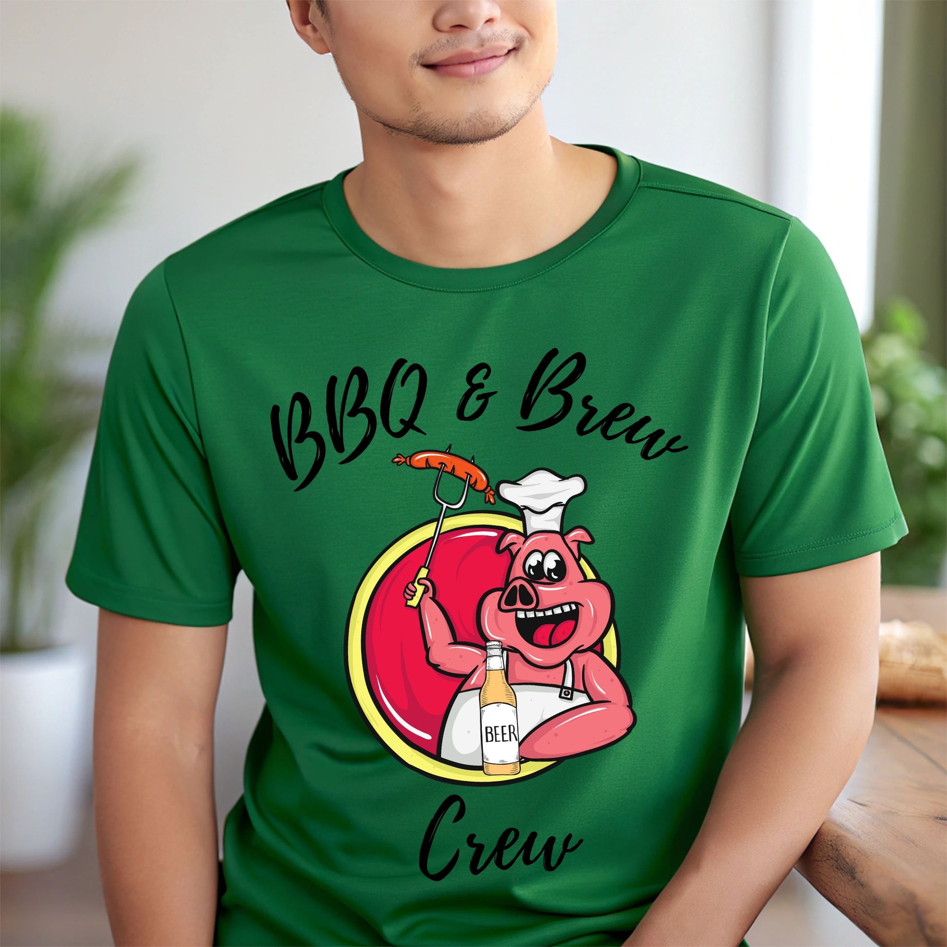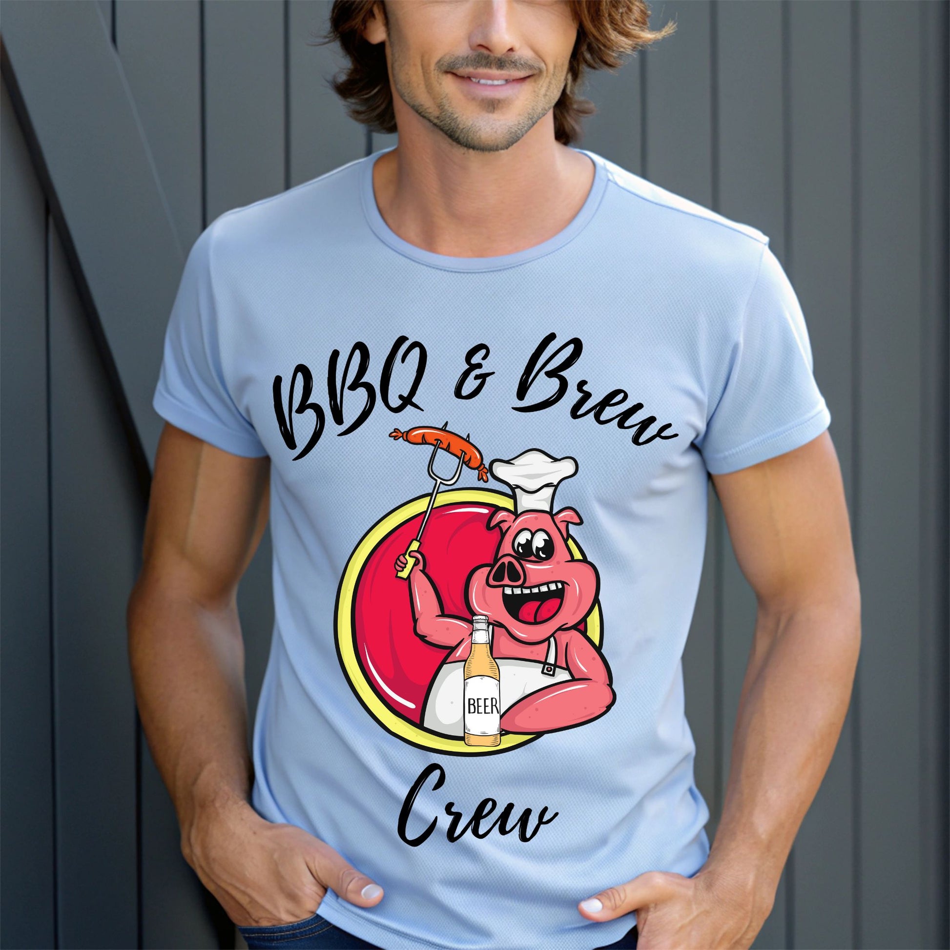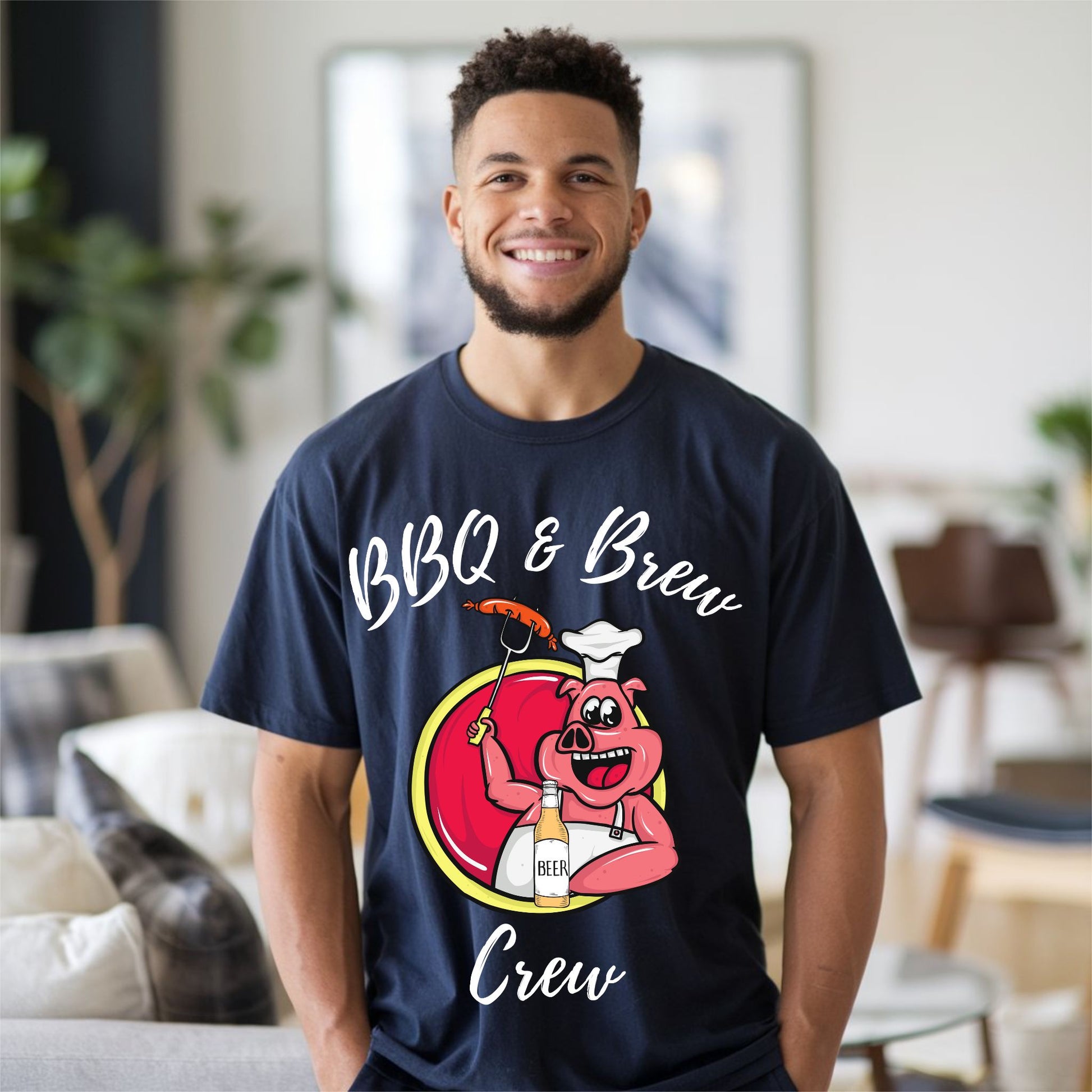A graphic design featuring a cartoon pig holding a sausage and a beer with text BBQ and Brew Crew, giving off a fun and casual vibe perfect for BBQ parties and social gatherings. This T-Shirt is relevant for adults who enjoy BBQing and drinking beer with friends and family, ideal for summer parties, cookouts, tailgates, and casual hangouts.