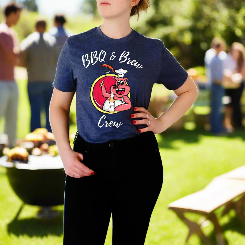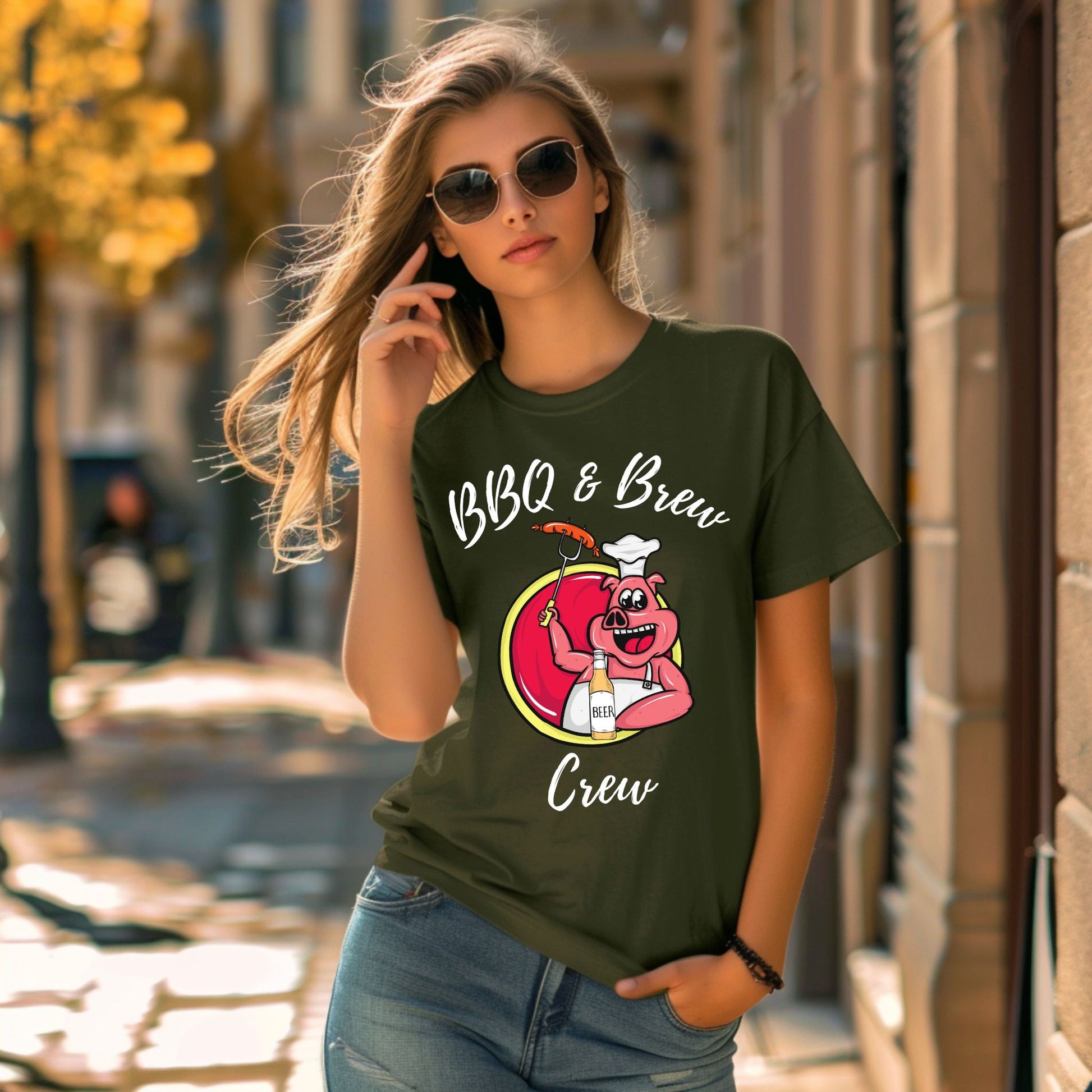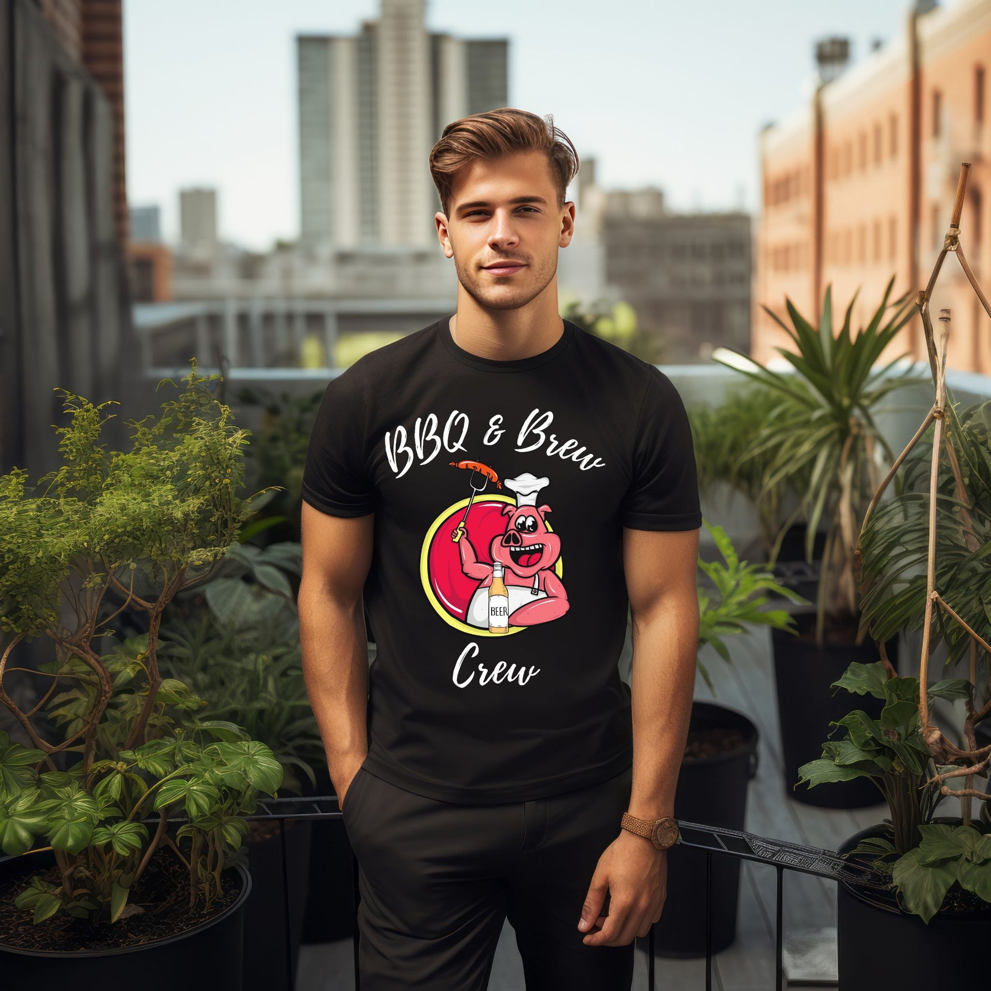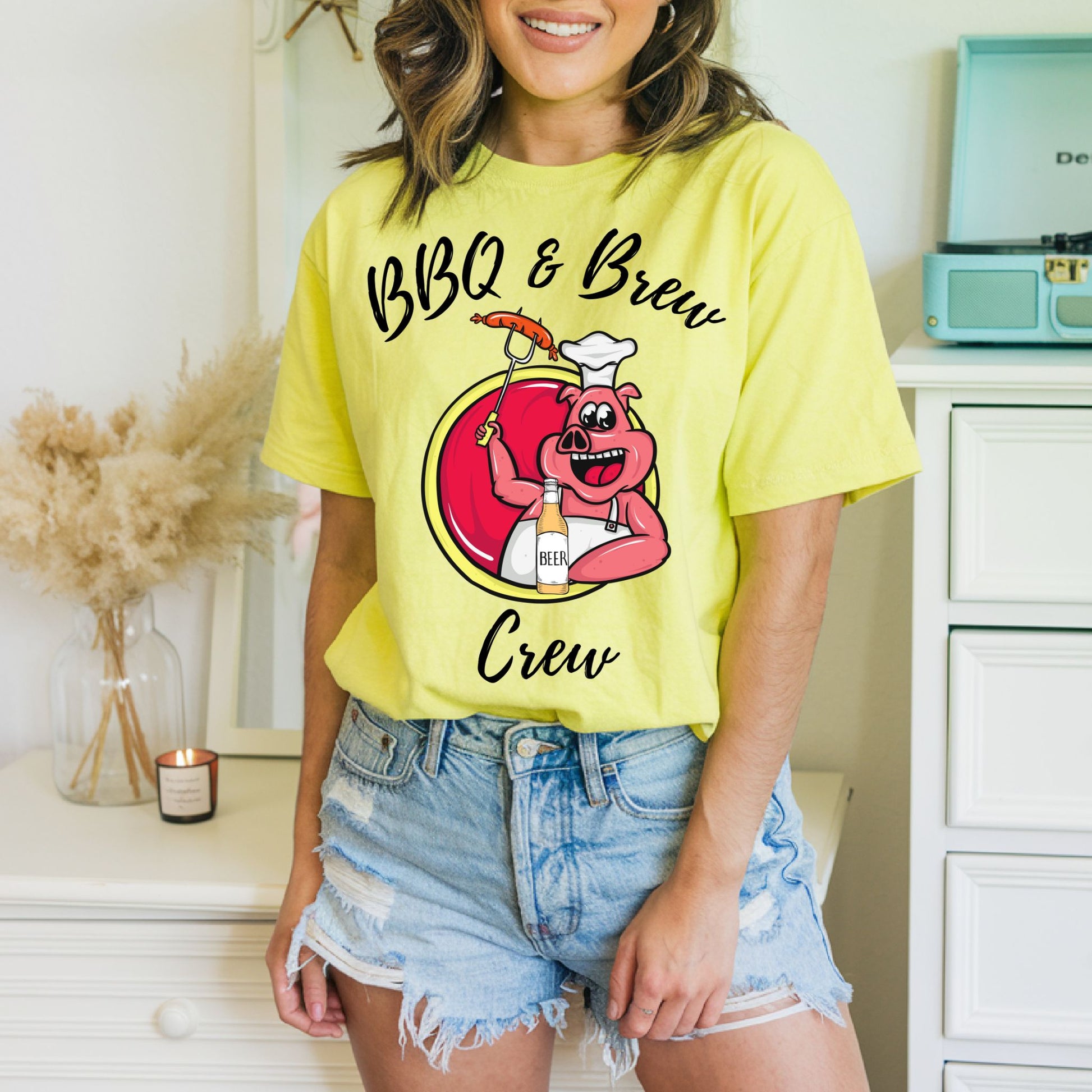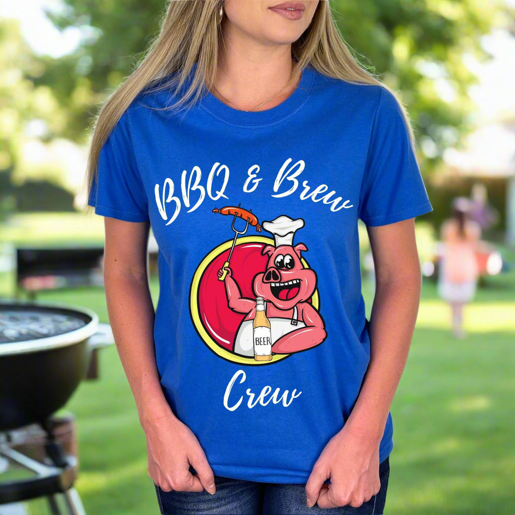 A graphic design featuring a cartoon pig holding a sausage and a beer with text BBQ and Brew Crew, giving off a fun and casual vibe perfect for BBQ parties and social gatherings. This T-Shirt is relevant for adults who enjoy BBQing and drinking beer with friends and family, ideal for summer parties, cookouts, tailgates, and casual hangouts.