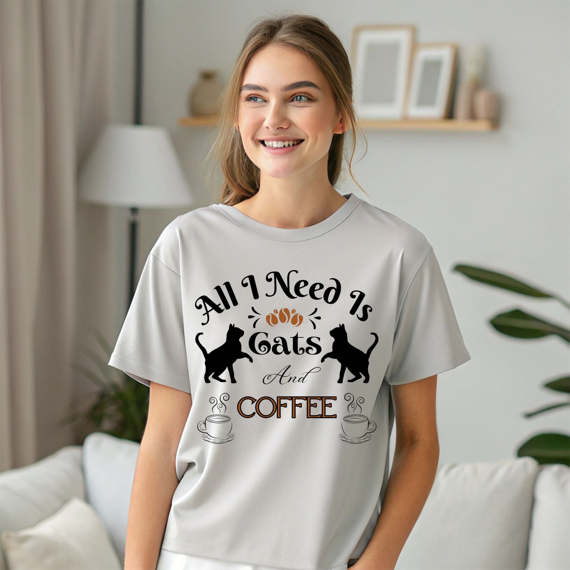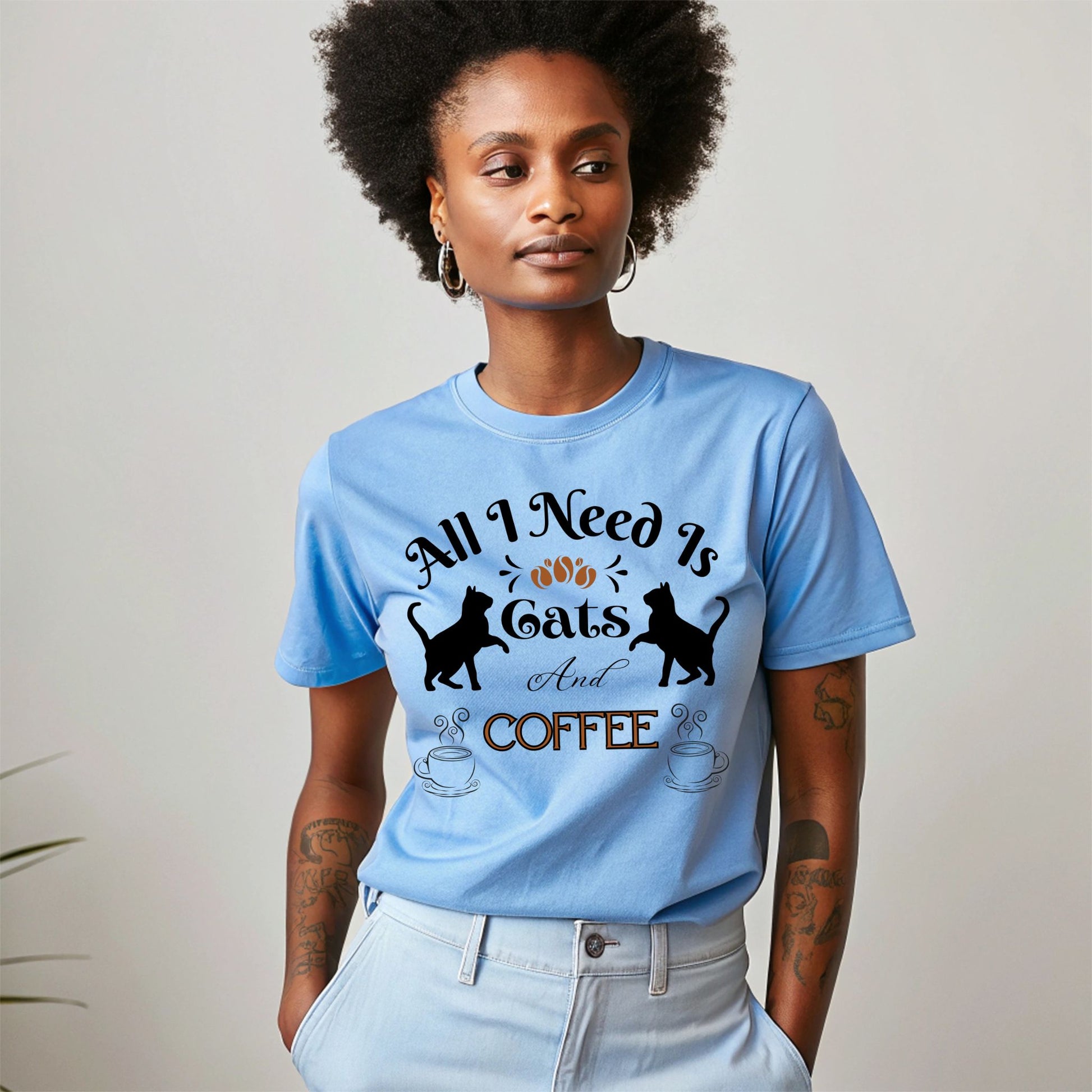 This T-Shirt features a graphic of a pile of coffee beans with two cats on either side holding steaming cups of coffee, along with the text that reads 'All I need is Cats And Coffee'. The design is perfect for cat lovers and coffee enthusiasts, exuding a cozy and laid-back vibe. Ideal for casual everyday wear or as a thoughtful gift for cat lovers or coffee addicts. Perfect for holidays like Christmas, birthdays, or as a fun treat for yourself.