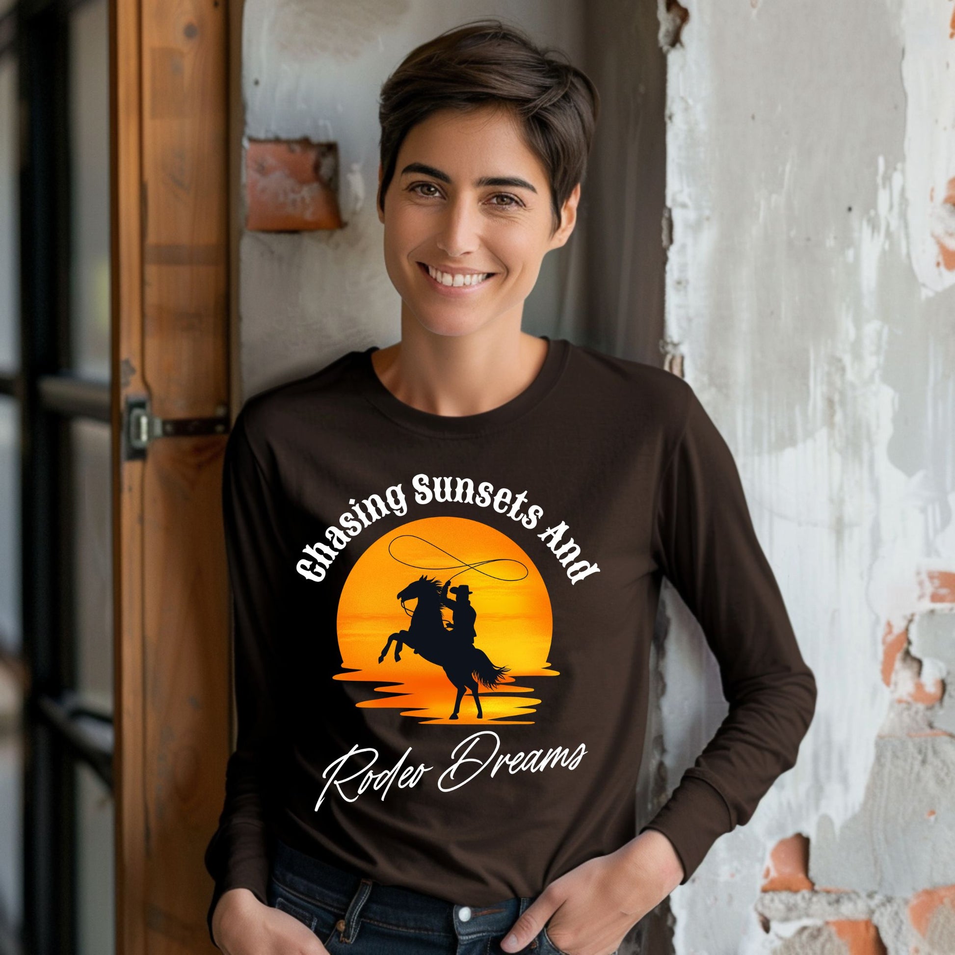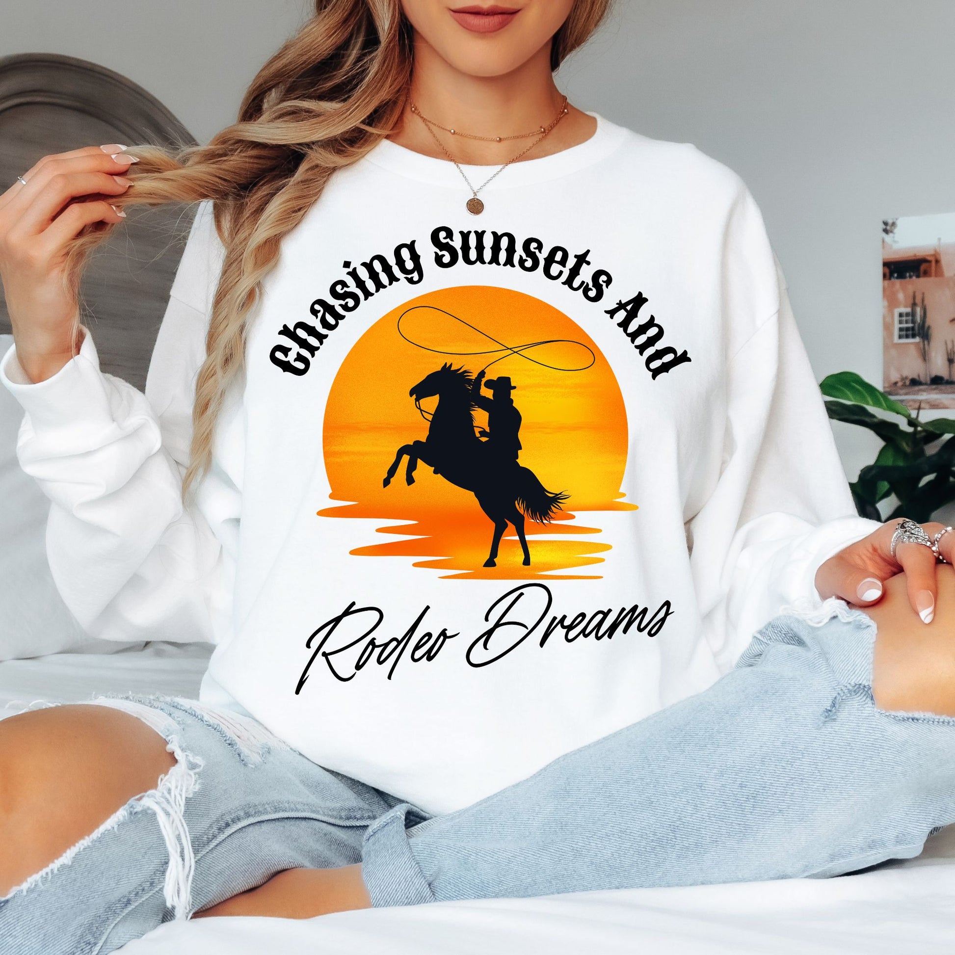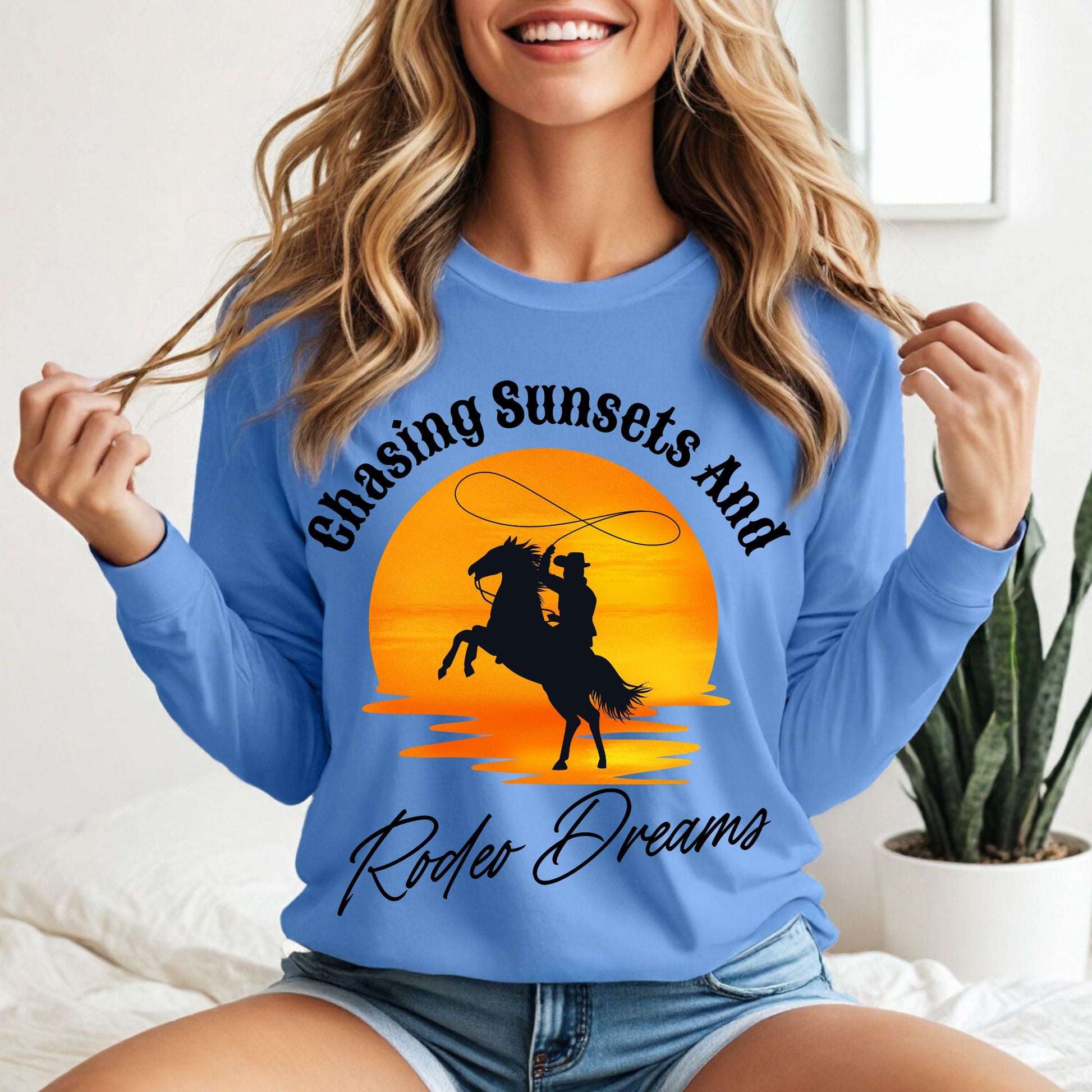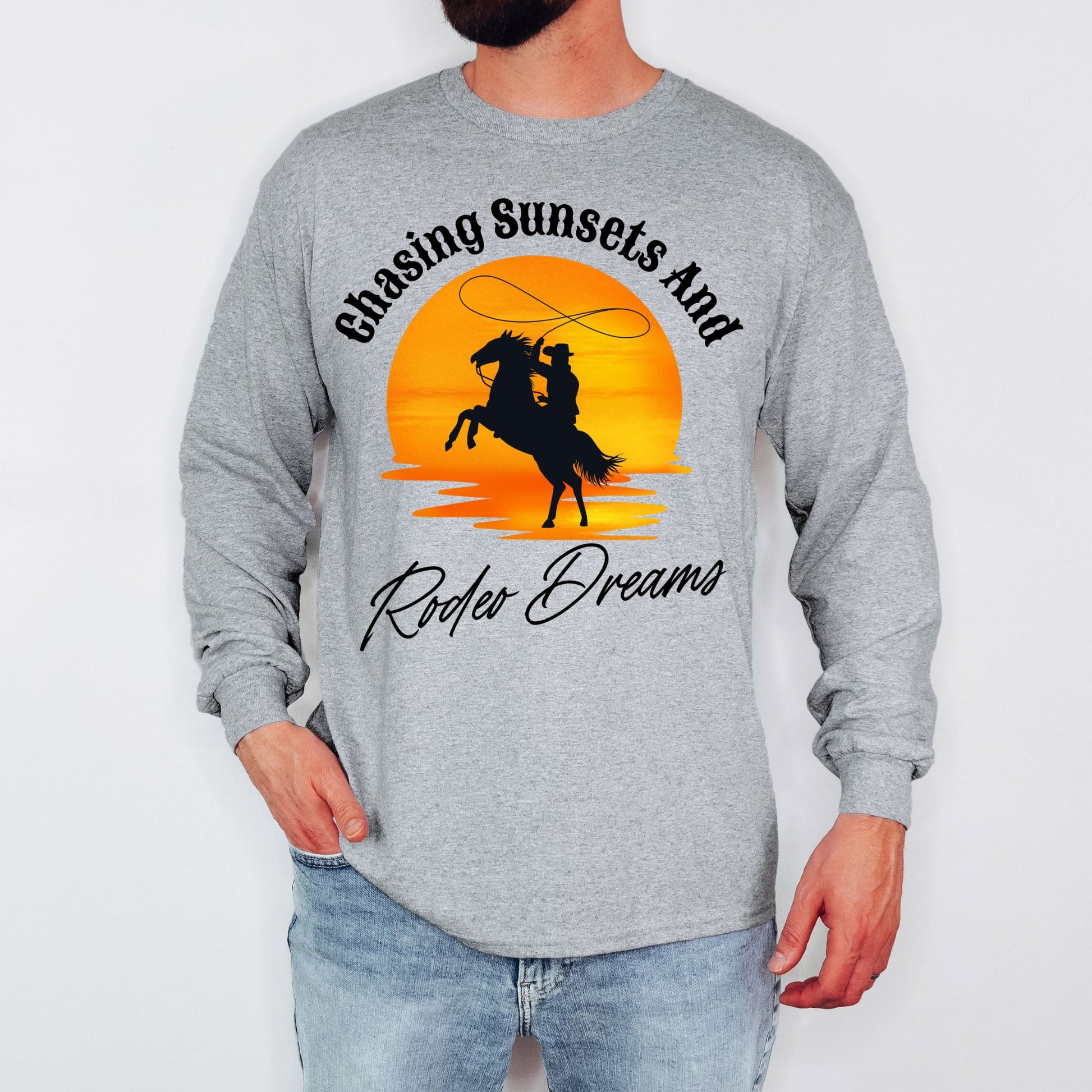 Chasing Sunsets and Rodeo Dreams T-Shirt, Western Apparel, Country Music Shirt, Cowboy Gift, Summer Outfit Long Sleeve Tee
