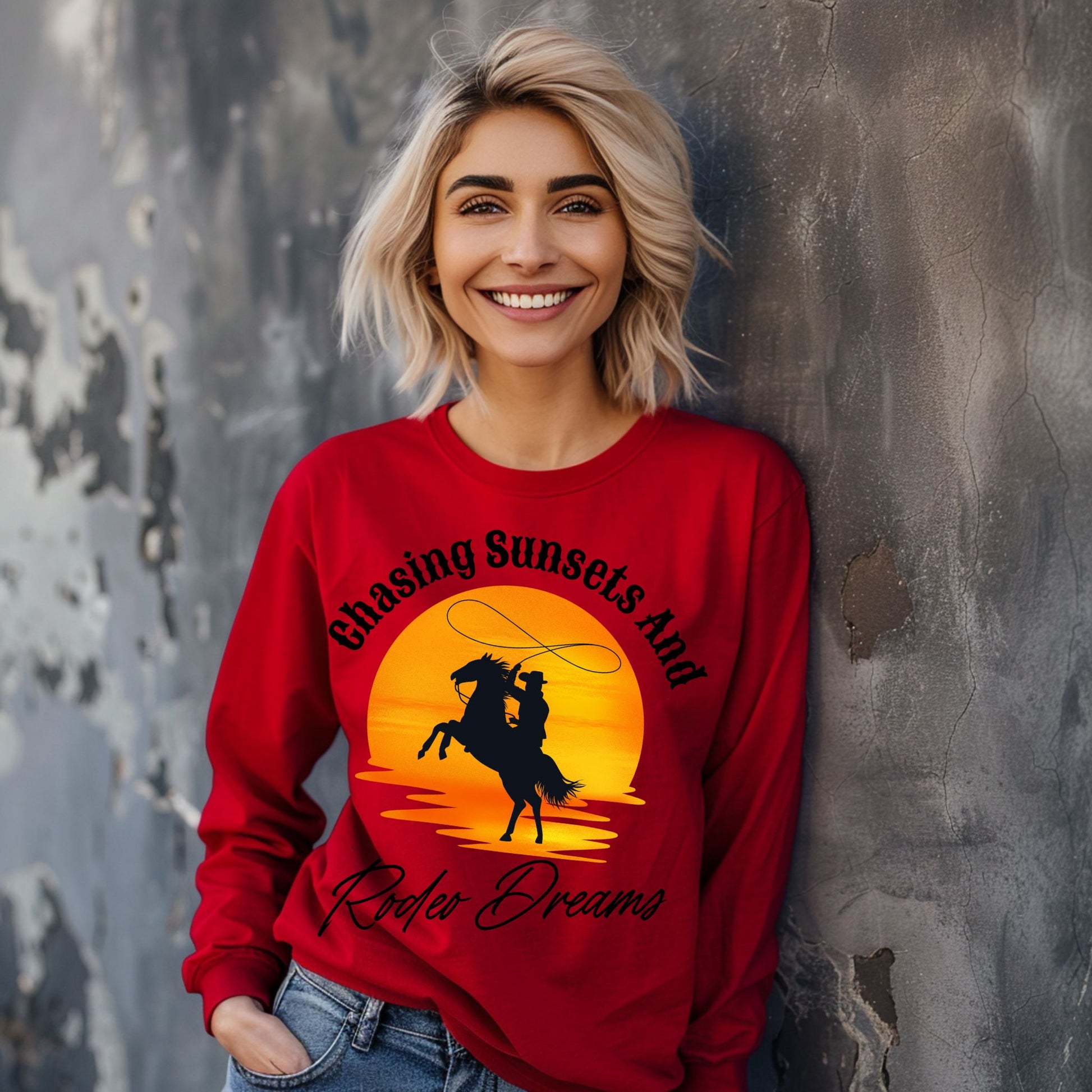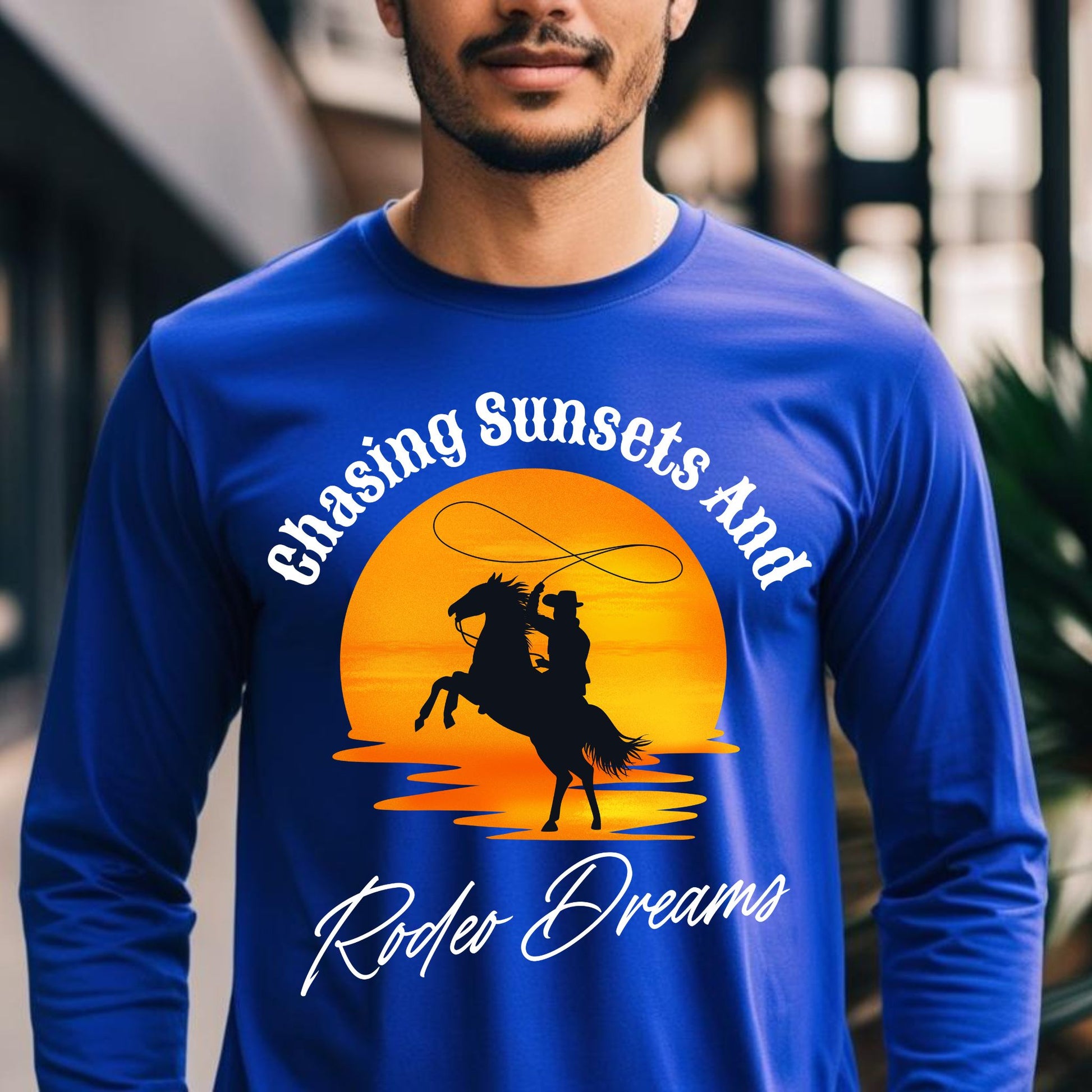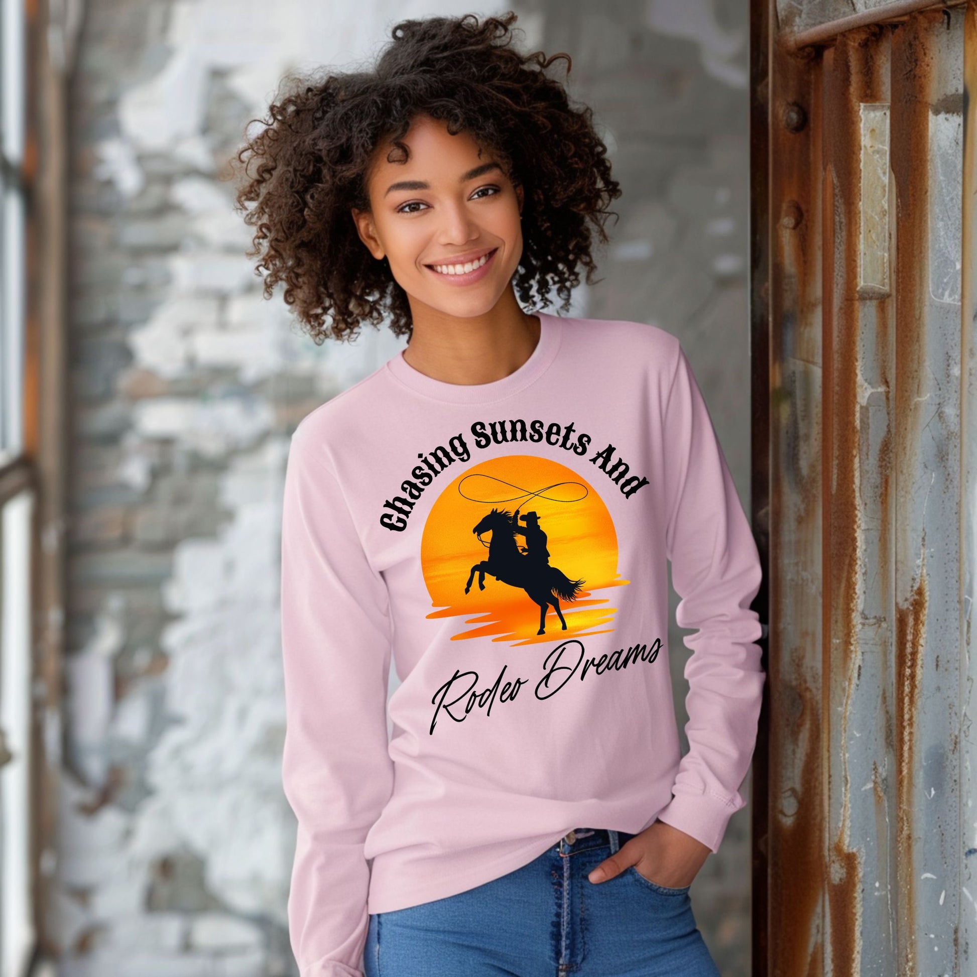 Chasing Sunsets and Rodeo Dreams T-Shirt, Western Apparel, Country Music Shirt, Cowboy Gift, Summer Outfit Long Sleeve Tee