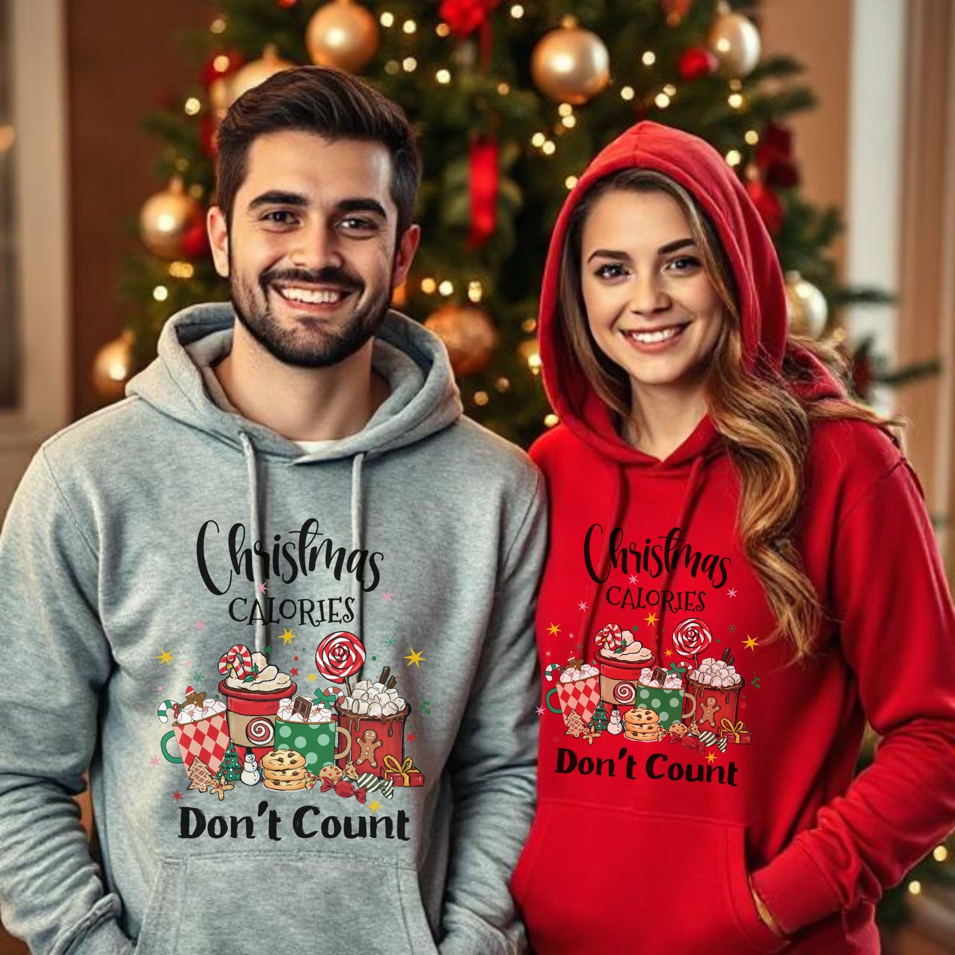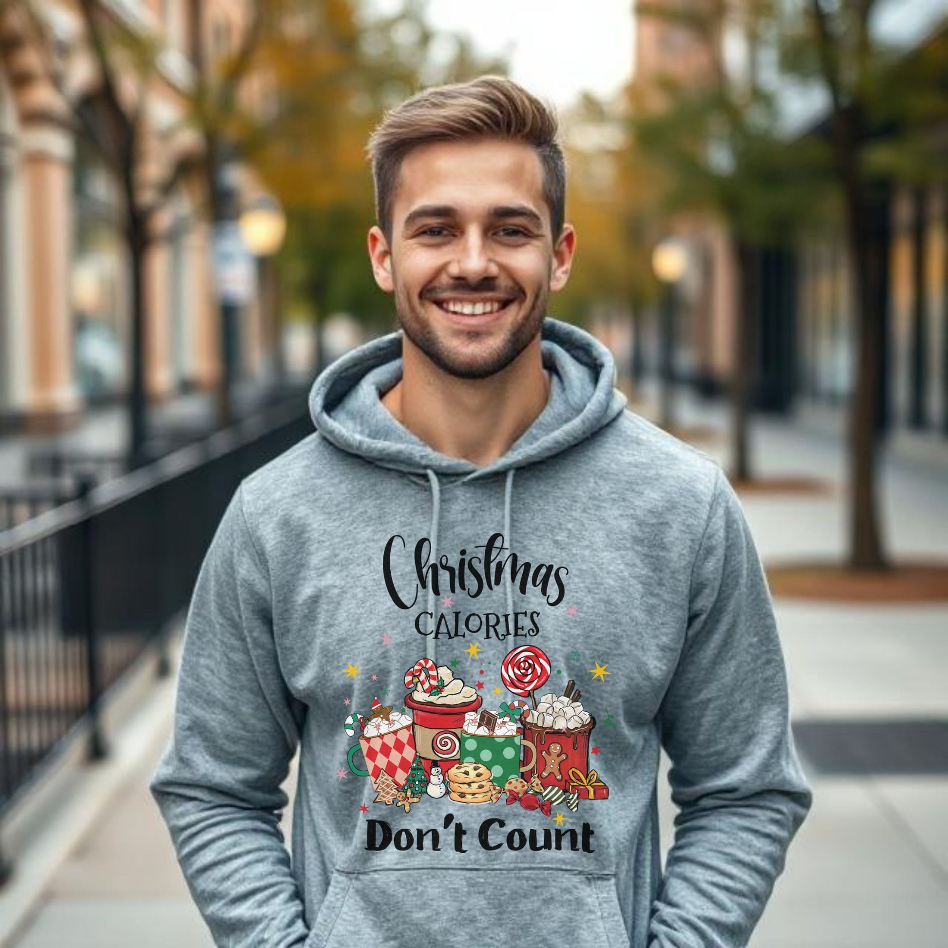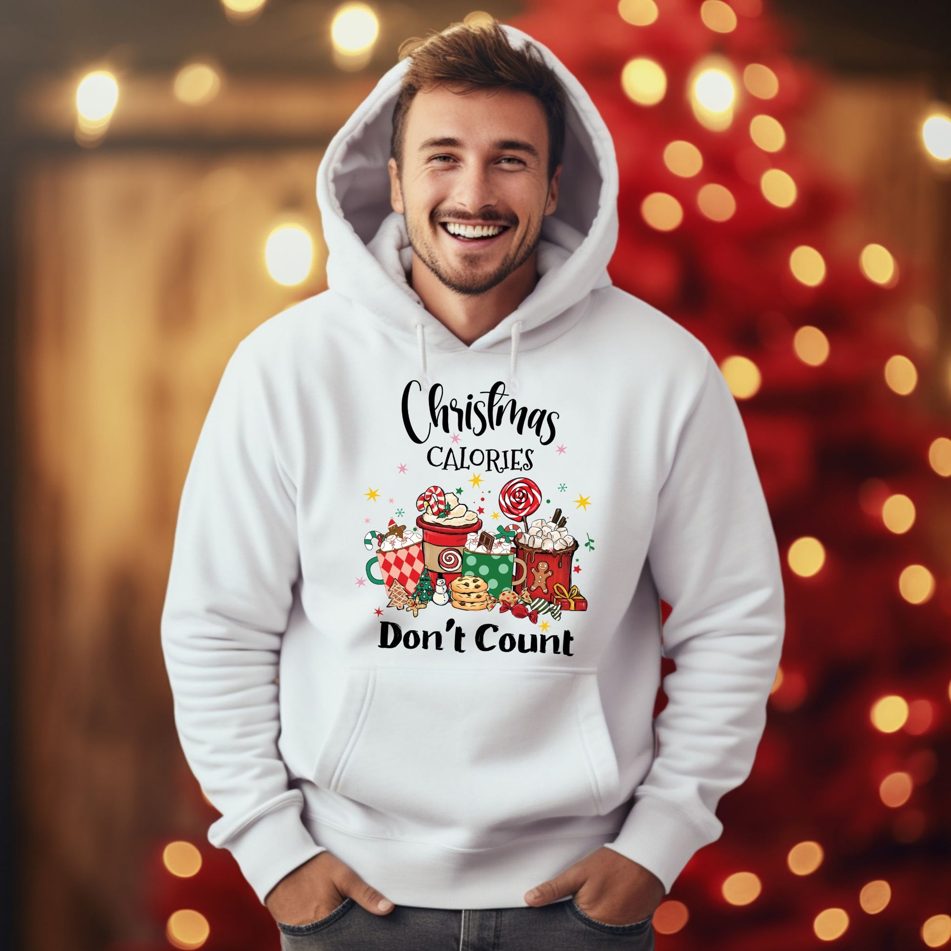 This Hoodie features a graphic of various desserts and the playful text 'Christmas Calories Don't Count'. It exudes a fun and festive vibe, perfect for the holiday season. This sweatshirt is suitable for adults who enjoy a sense of humor and love indulging in holiday treats.