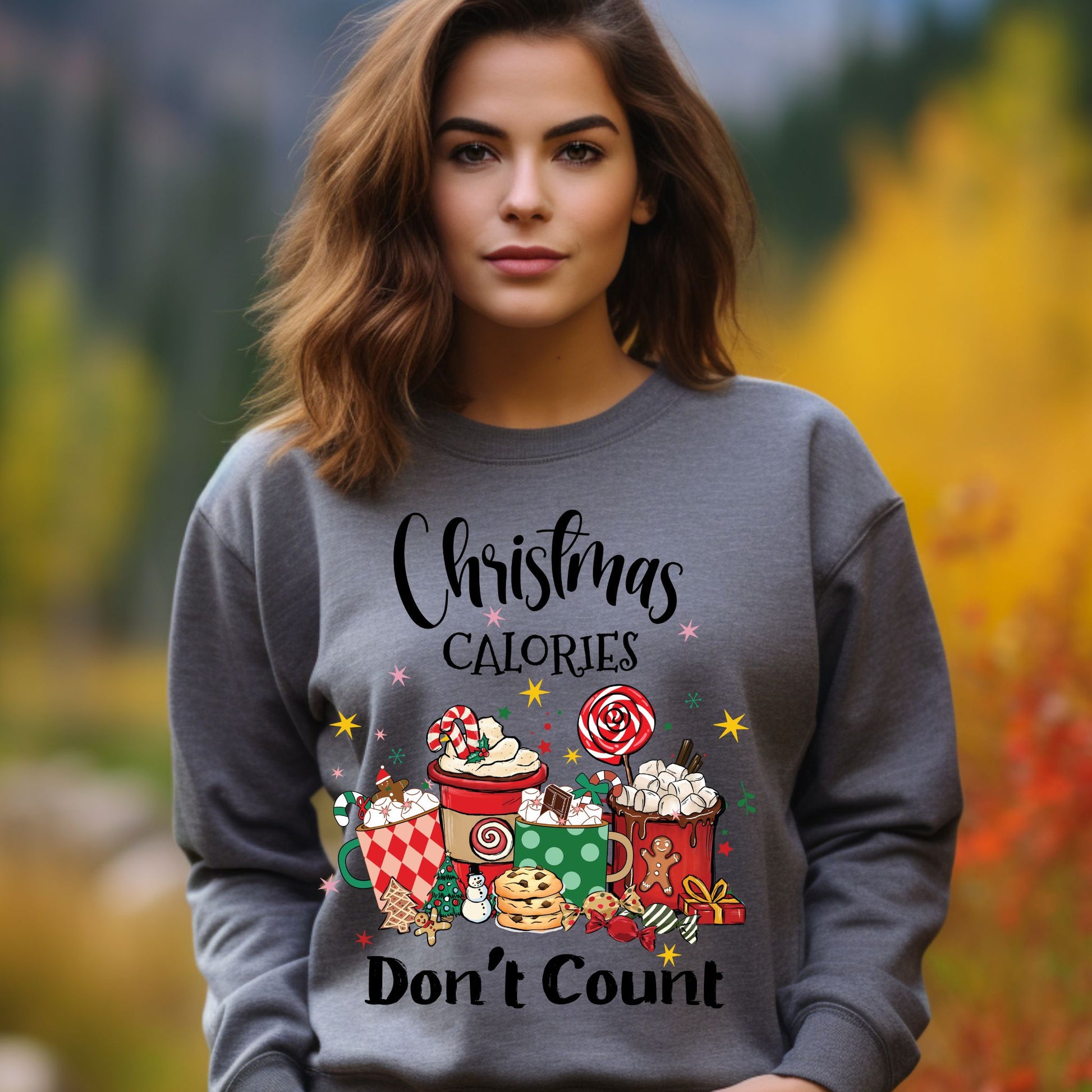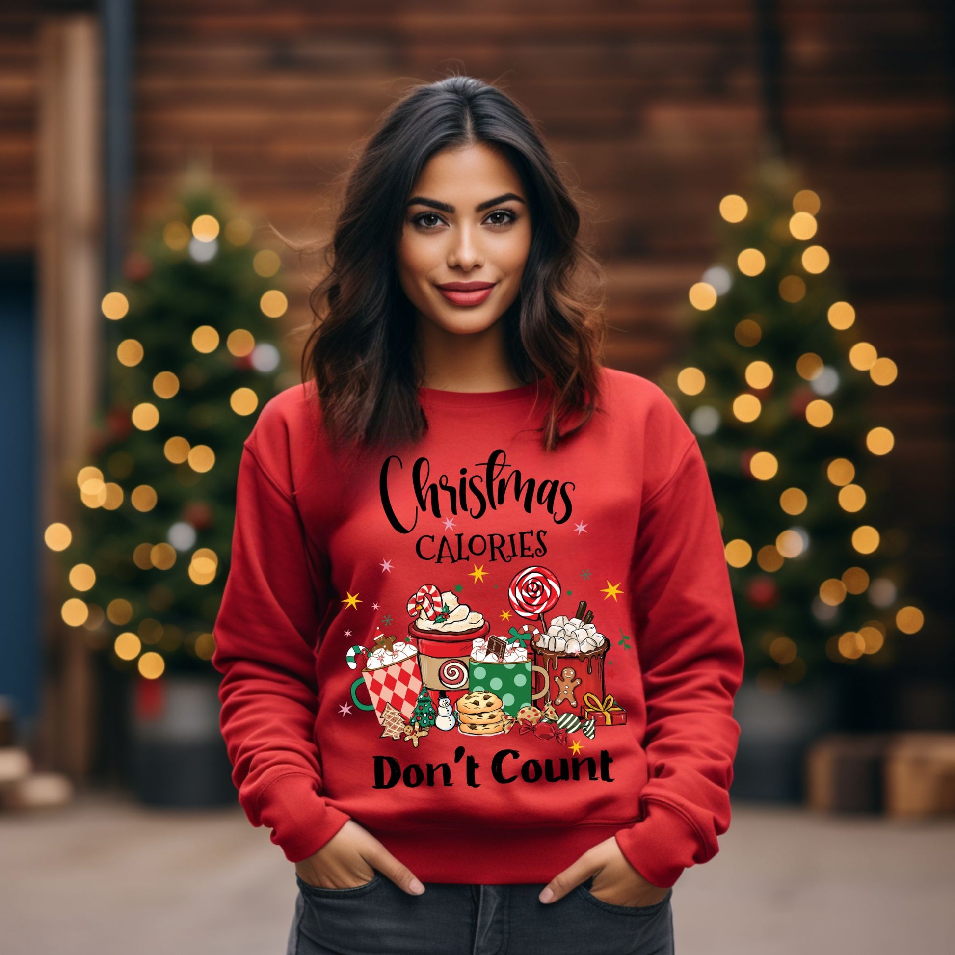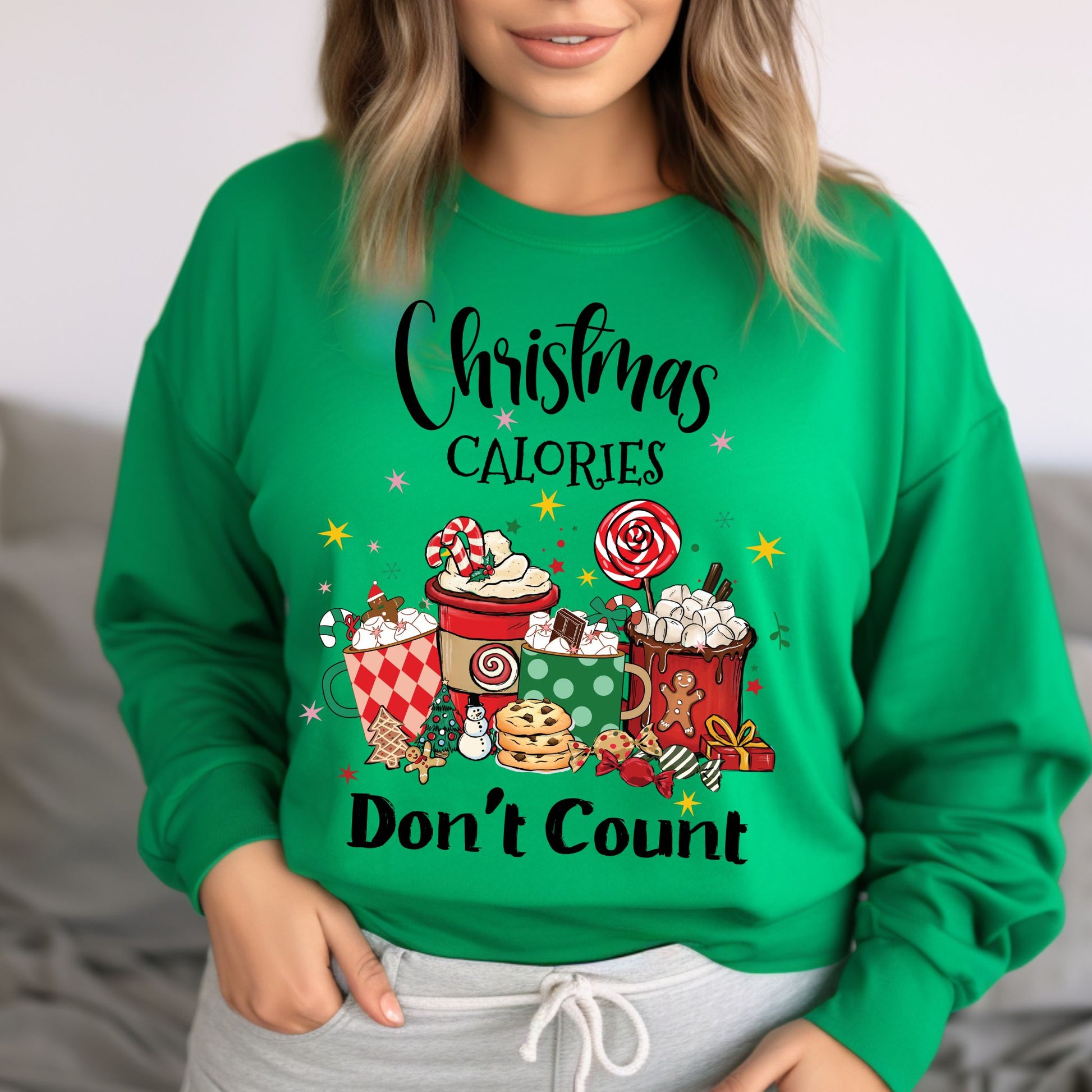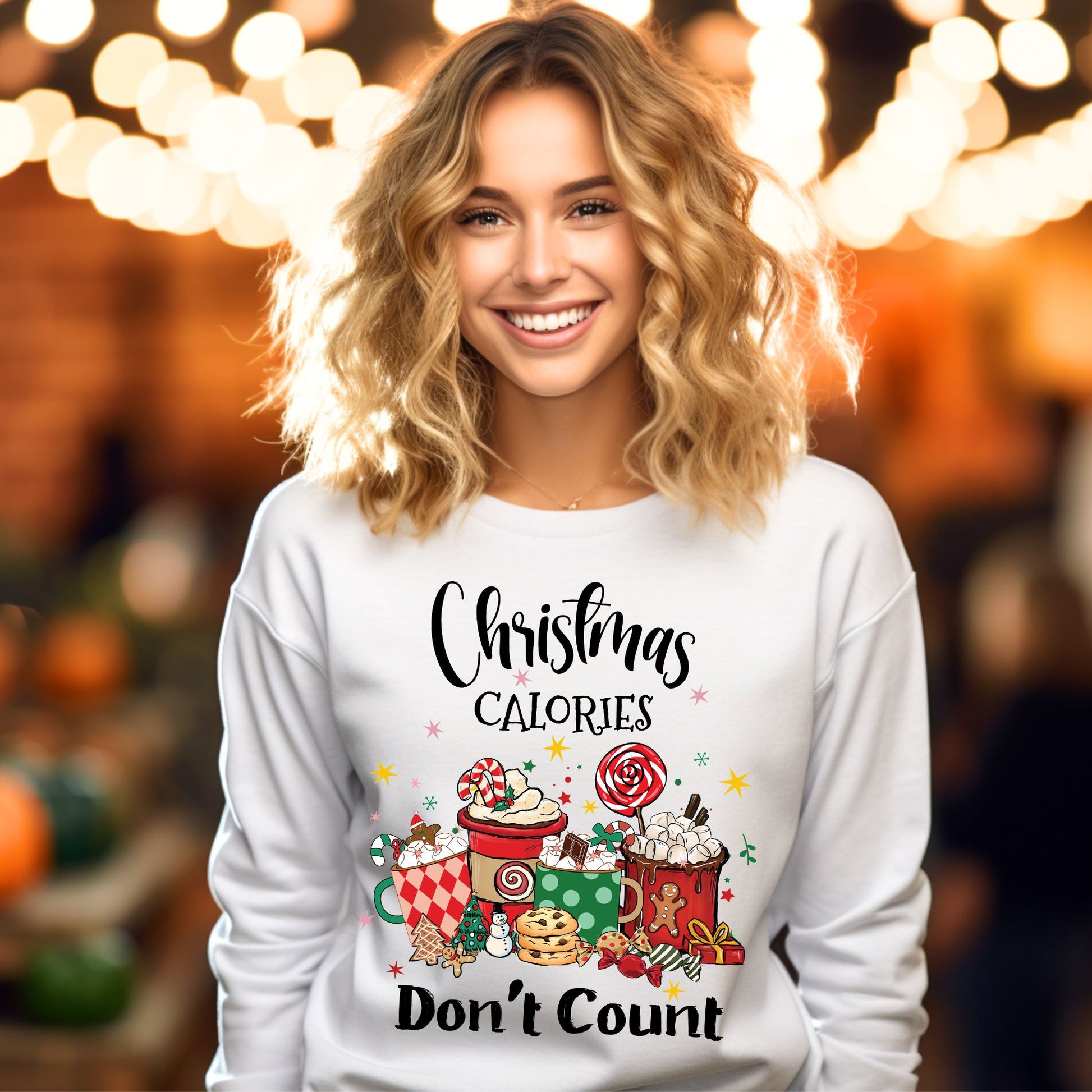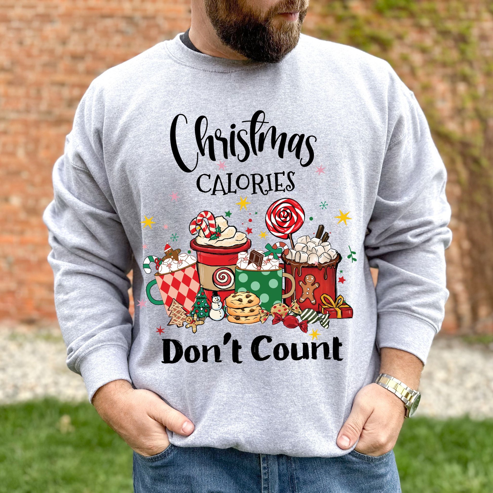 This Sweatshirt features a graphic of various desserts and the playful text 'Christmas Calories Don't Count'. It exudes a fun and festive vibe, perfect for the holiday season. This shirt is suitable for adults who enjoy a sense of humor and love indulging in holiday treats.