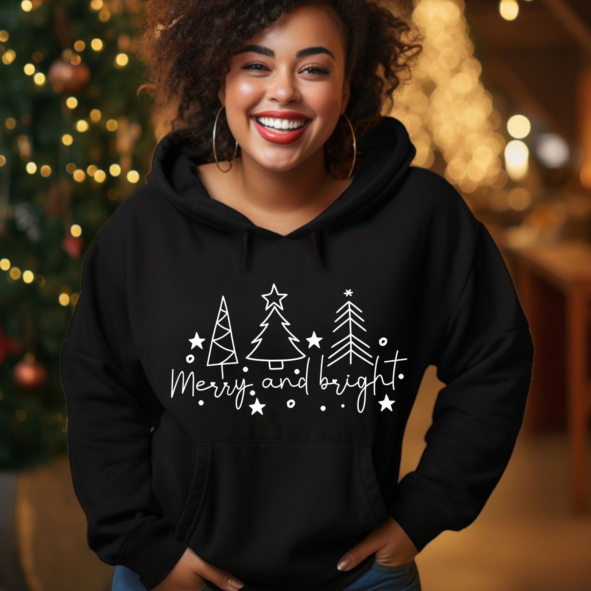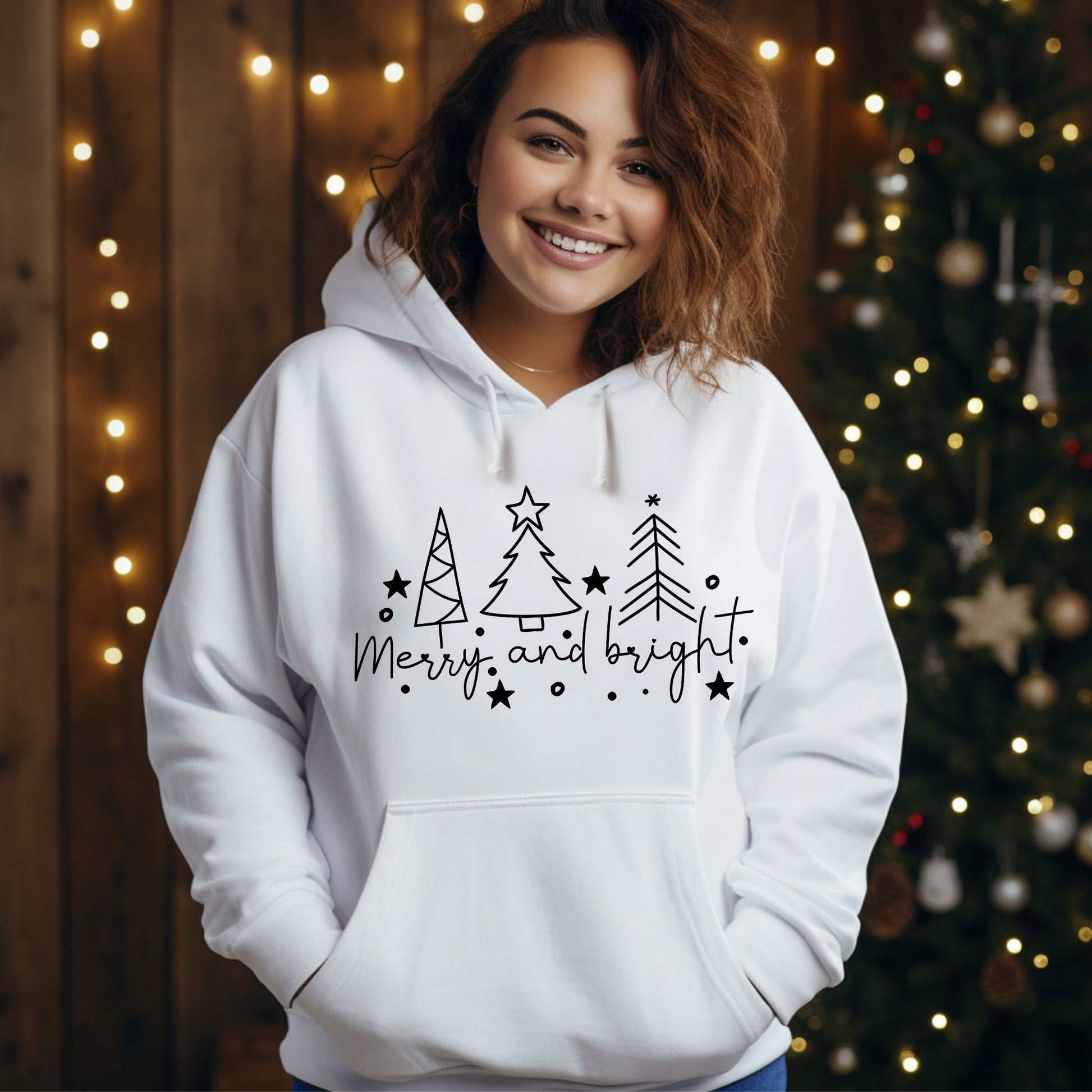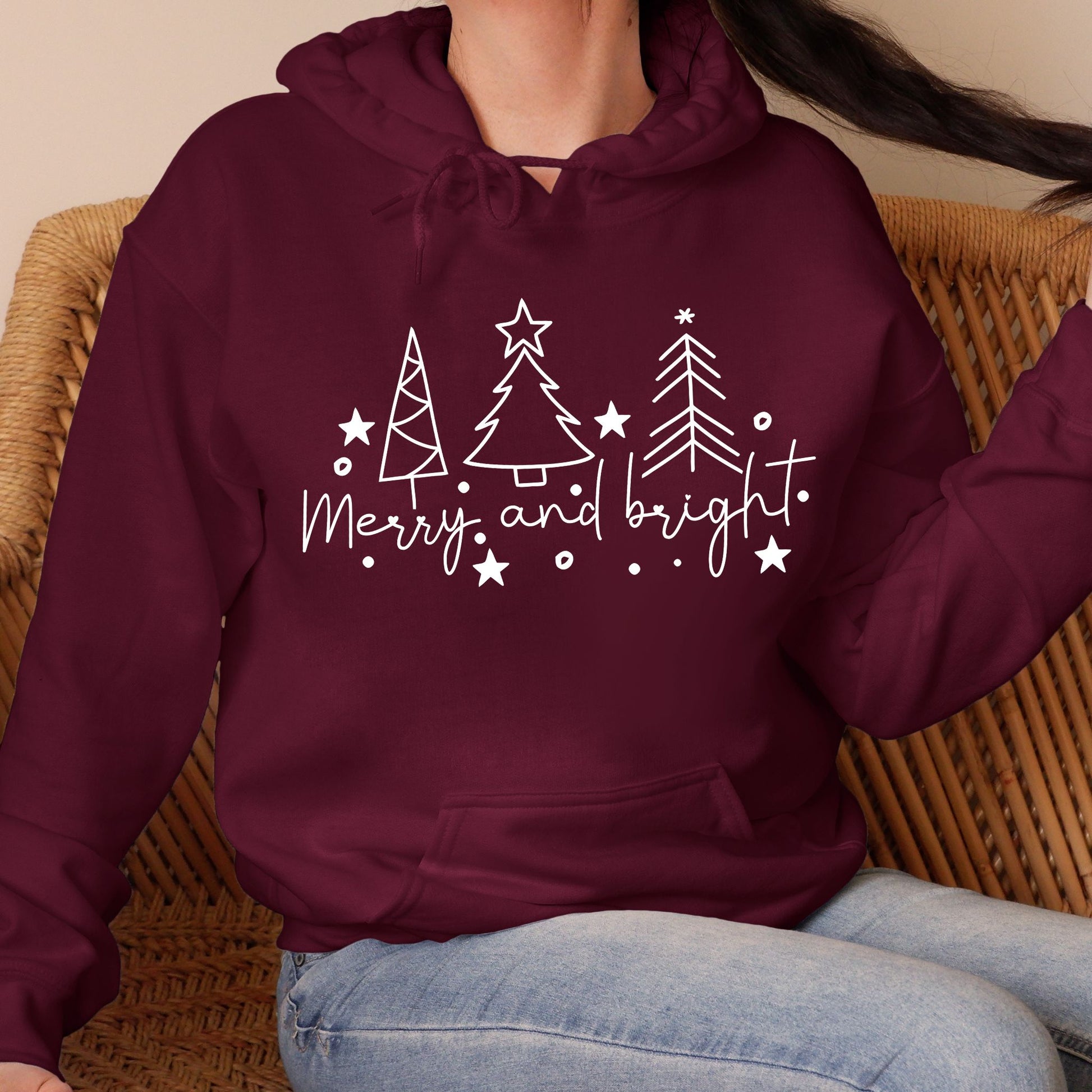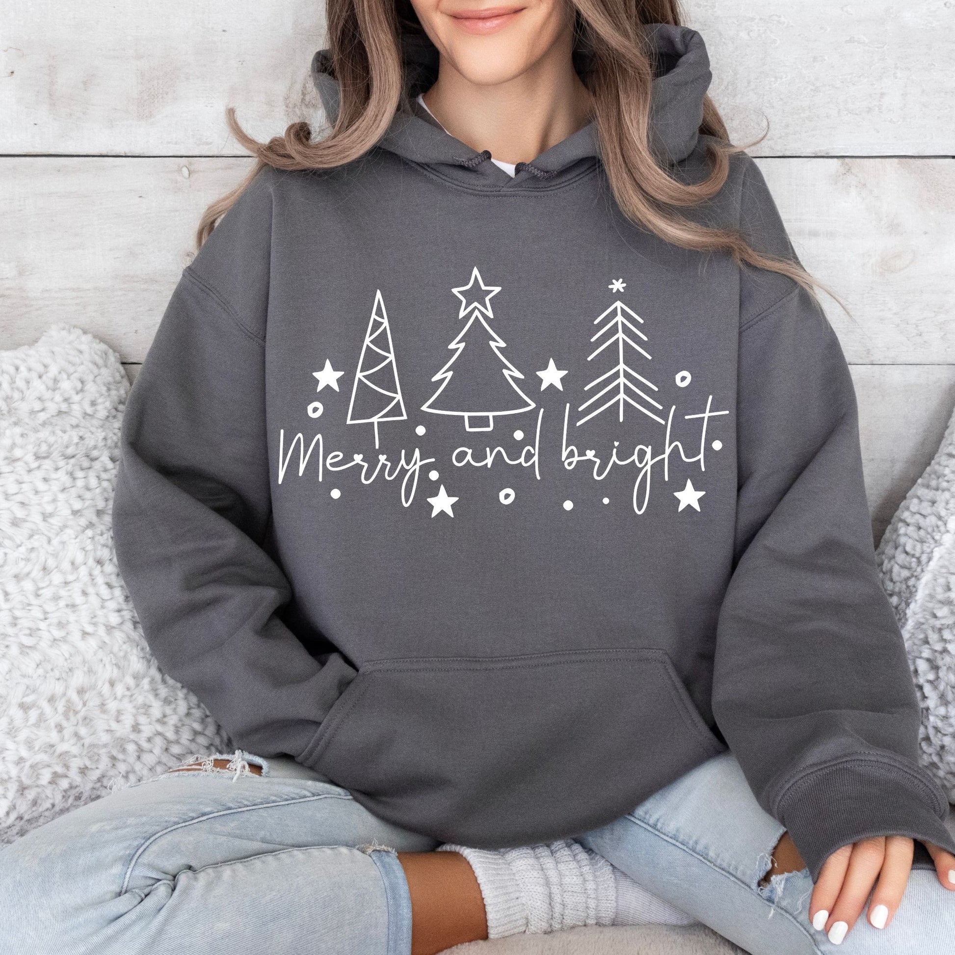 Christmas Tree Line Drawing Hoodie Merry and Bright Sweatshirt Christmas Shirt Festive Holiday Hoodie