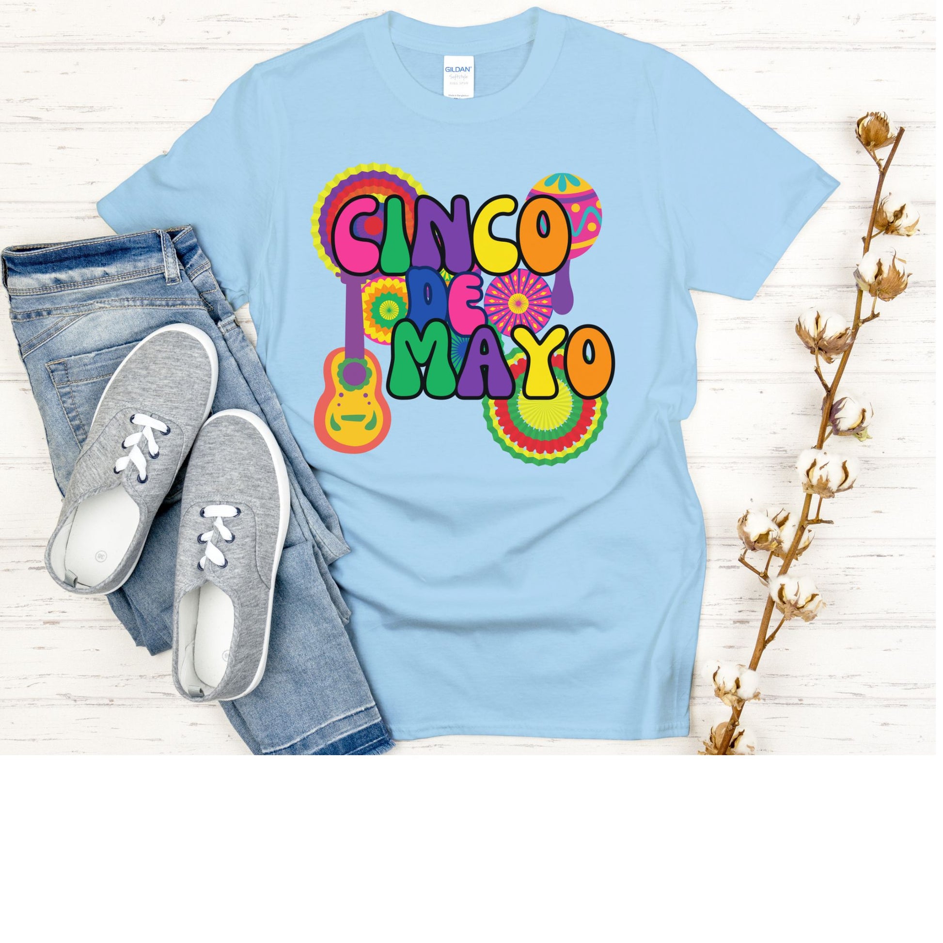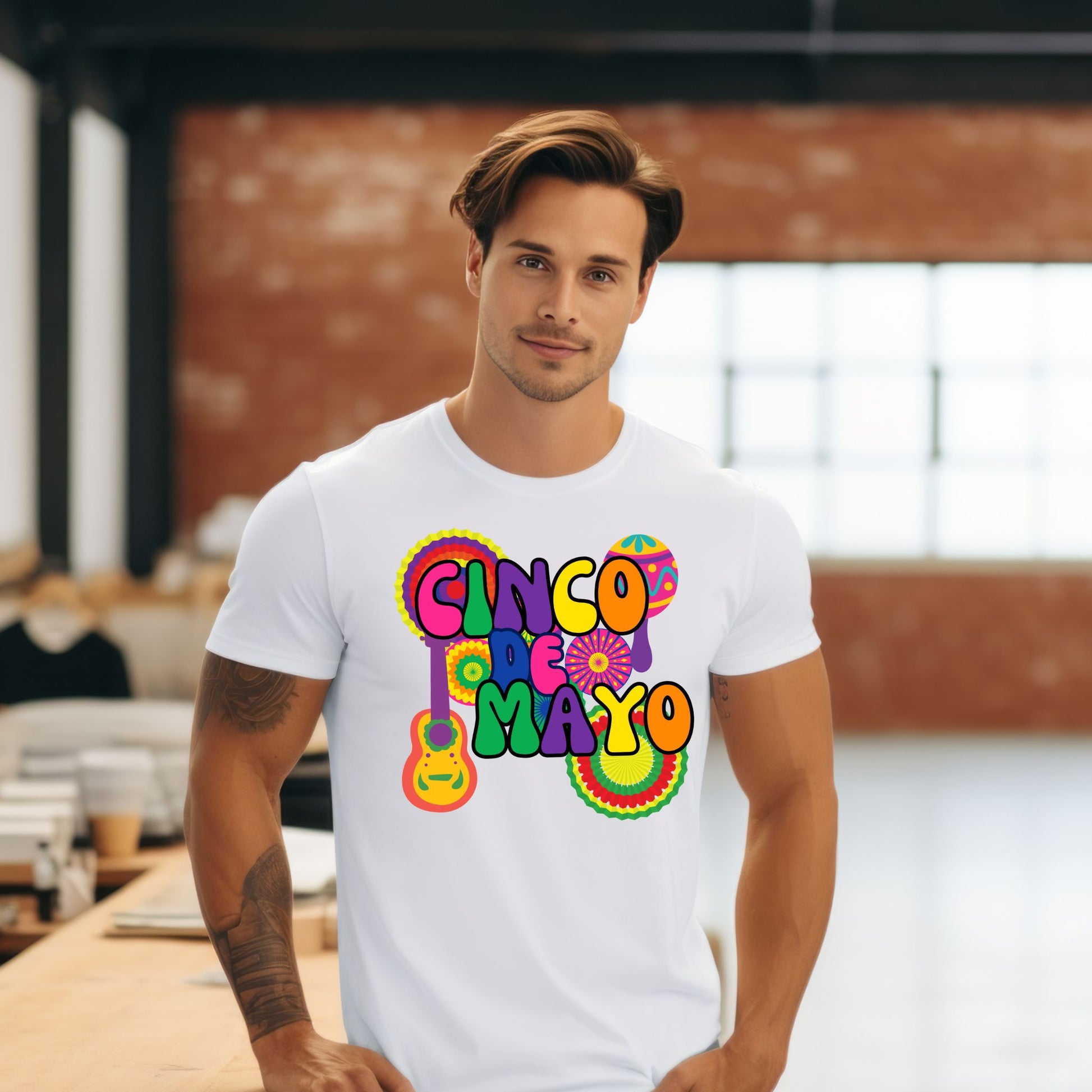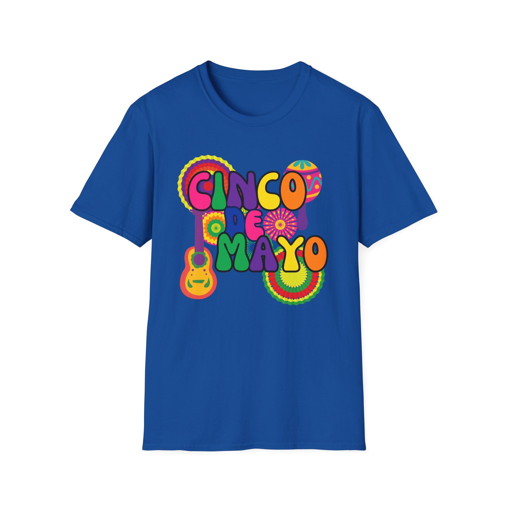 Celebrate Cinco de Mayo in style with this colorful unisex T-Shirt featuring a retro font style with decorations of parasols, a guitar, and maracas. Perfect for anyone looking to add a festive touch to their wardrobe during the Cinco de Mayo celebrations.