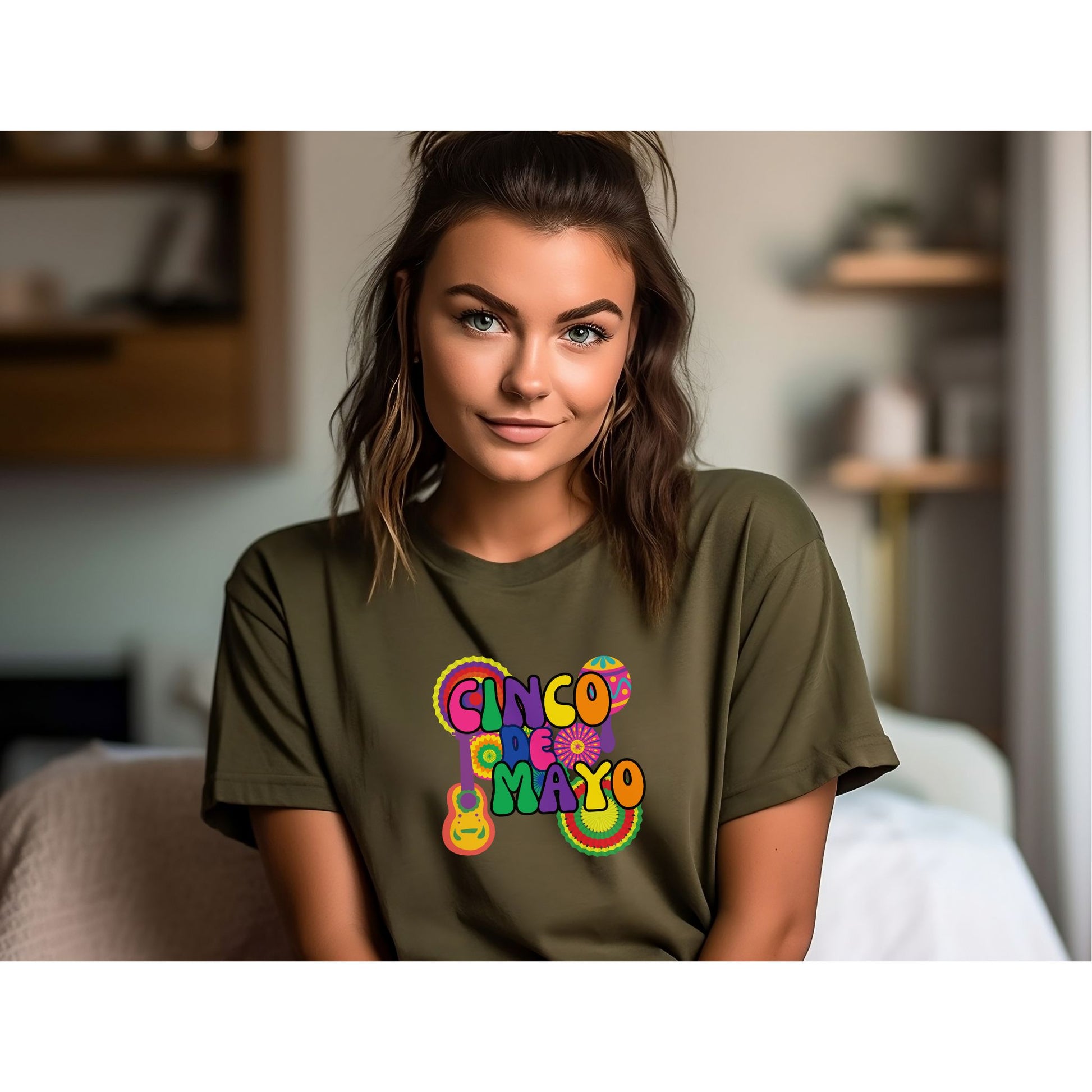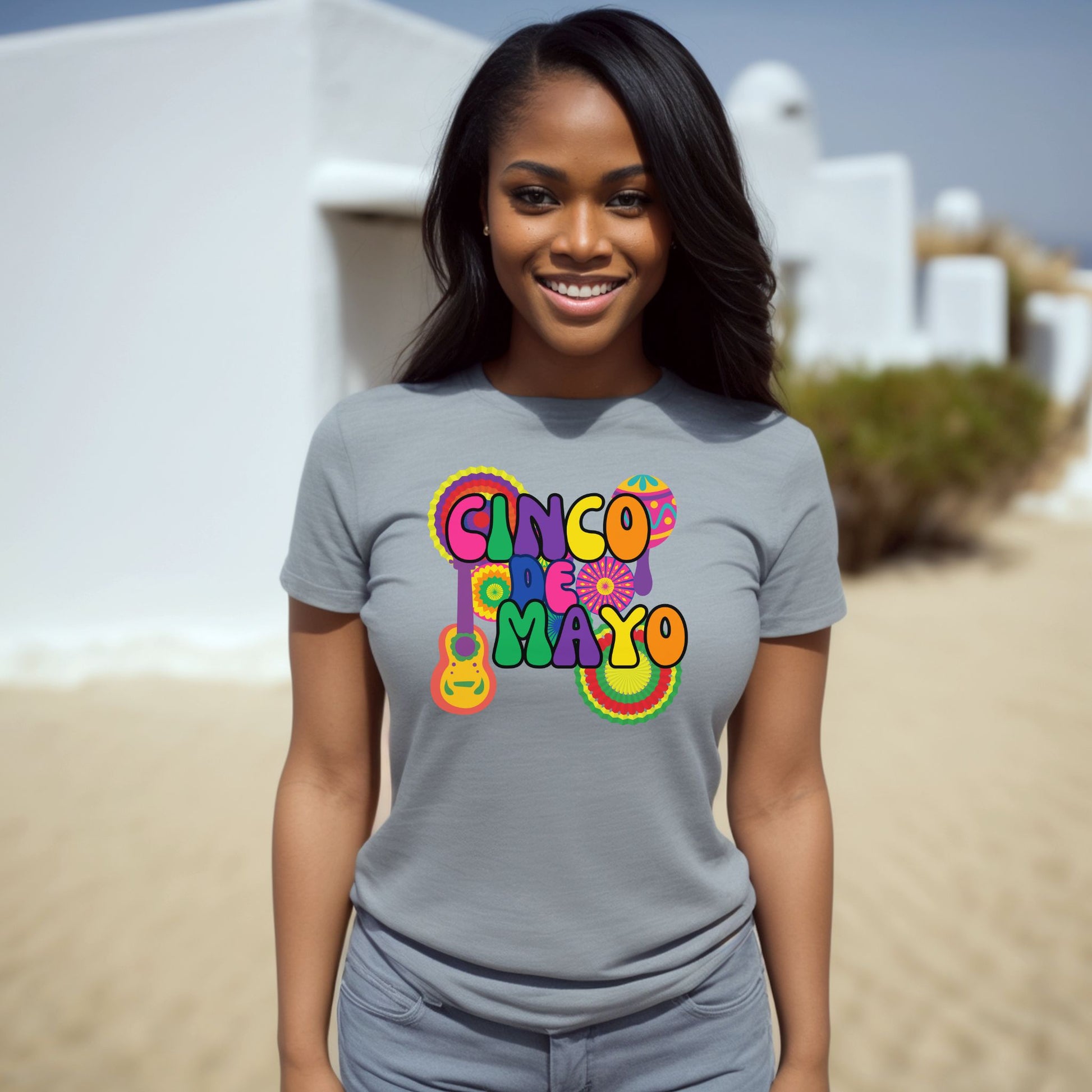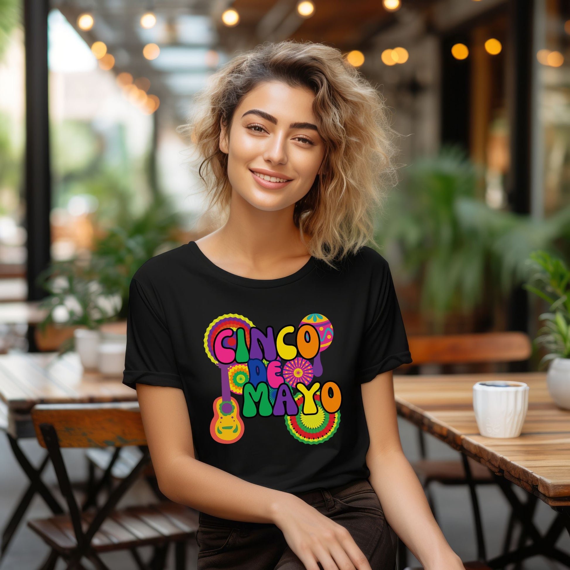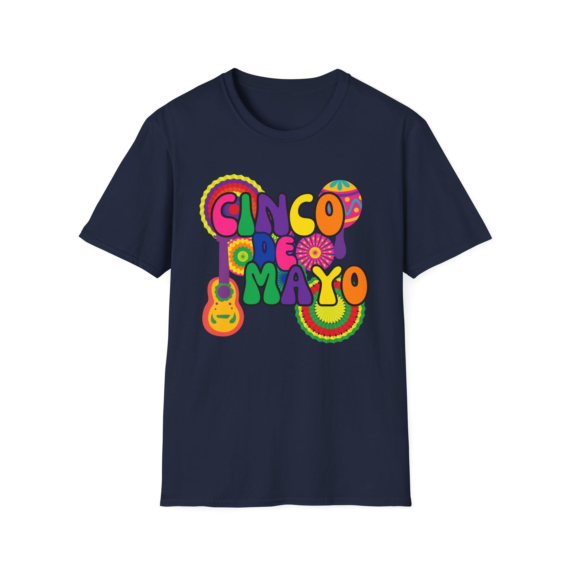 Celebrate Cinco de Mayo in style with this colorful unisex T-Shirt featuring a retro font style with decorations of parasols, a guitar, and maracas. Perfect for anyone looking to add a festive touch to their wardrobe during the Cinco de Mayo celebrations.