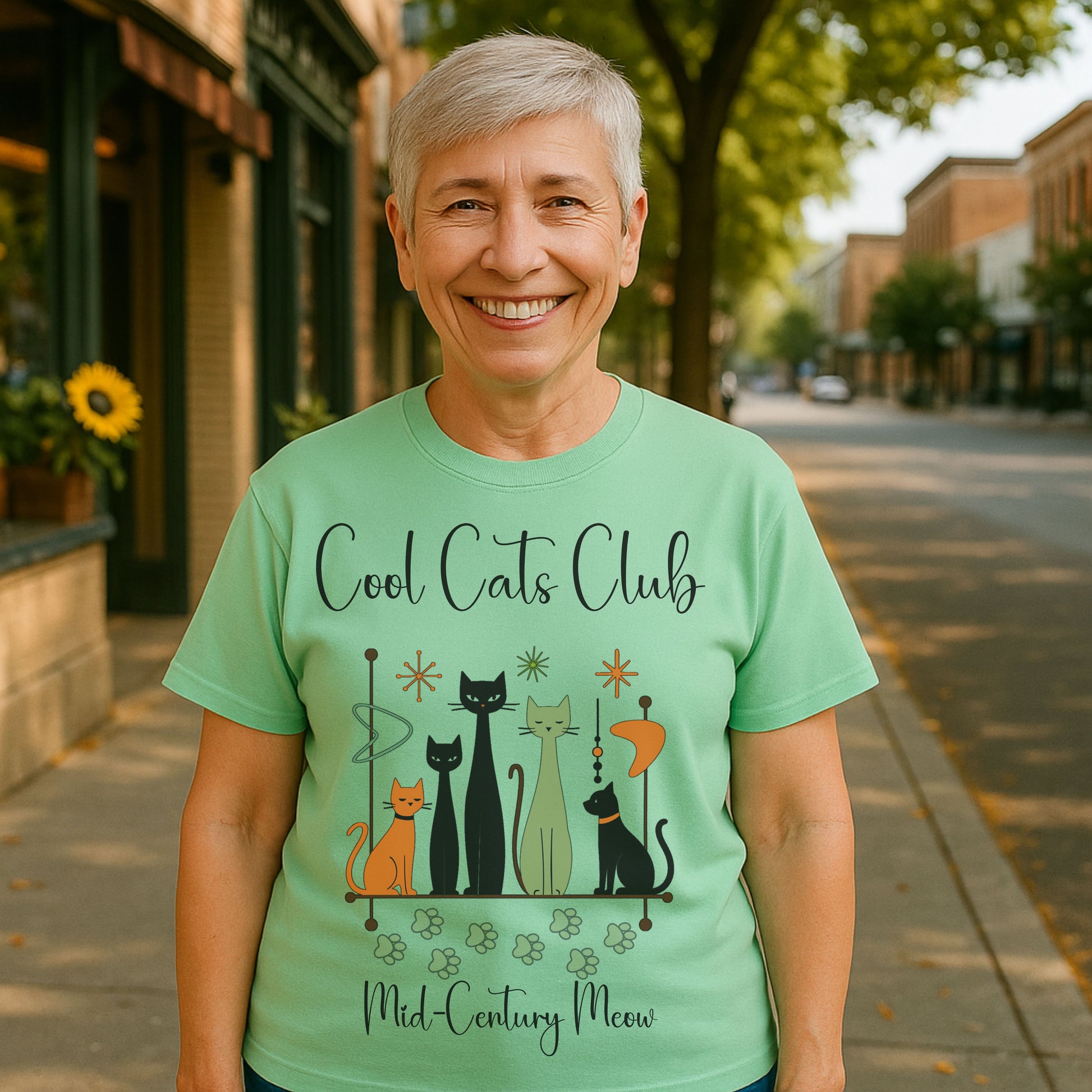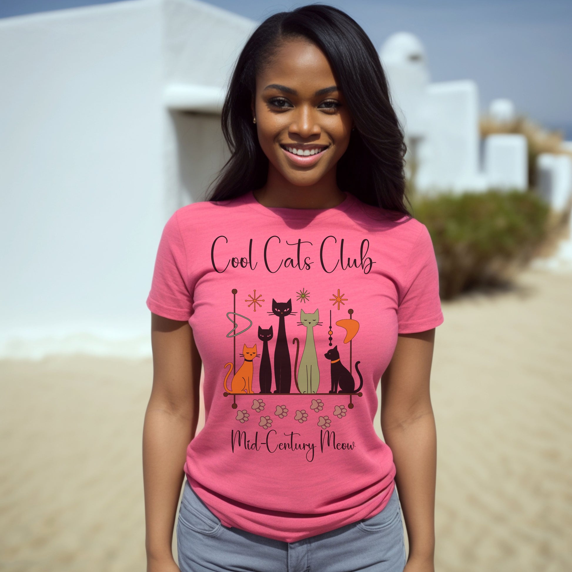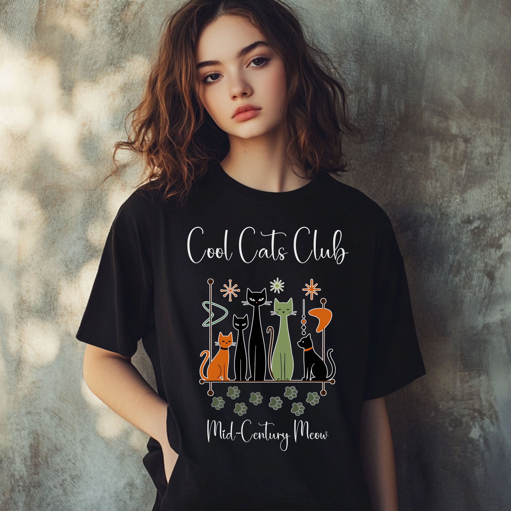 Welcome to the Cool Cats Club — where retro style meets feline sass. This mid-century modern cat t-shirt features a lineup of groovy kitties in atomic-inspired colors and shapes, ready to bring vintage flair to your wardrobe.
