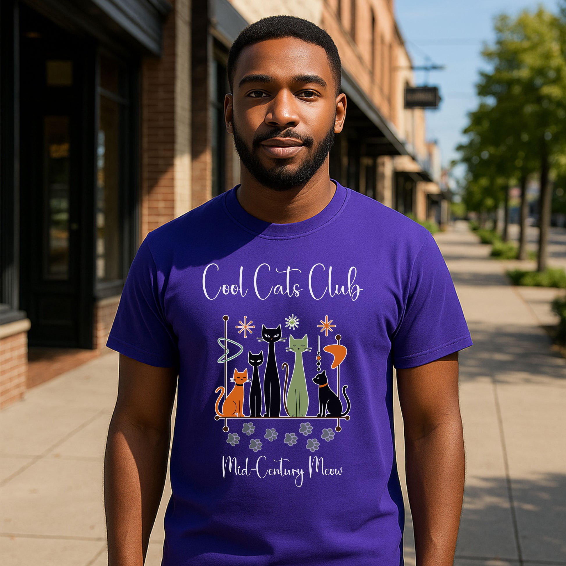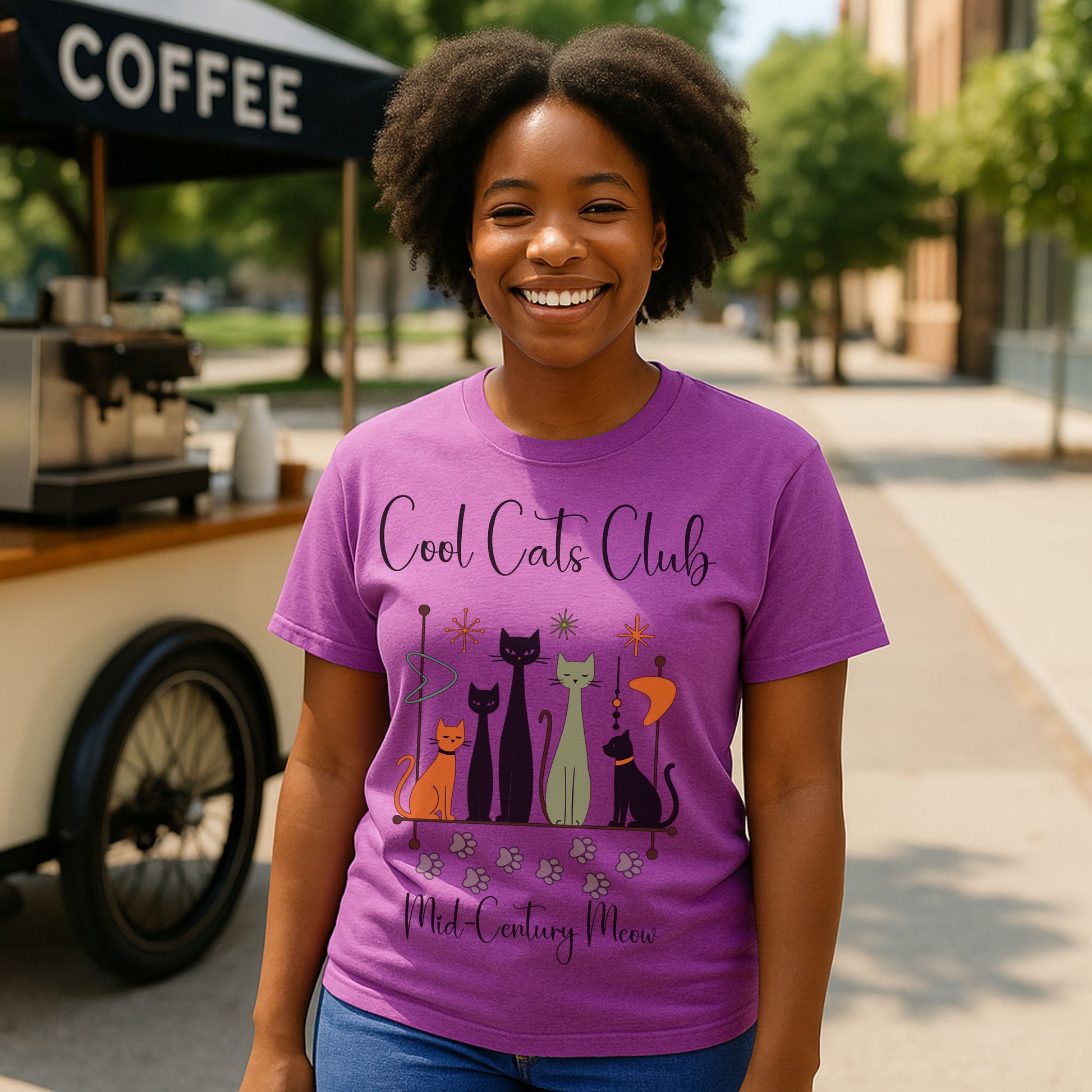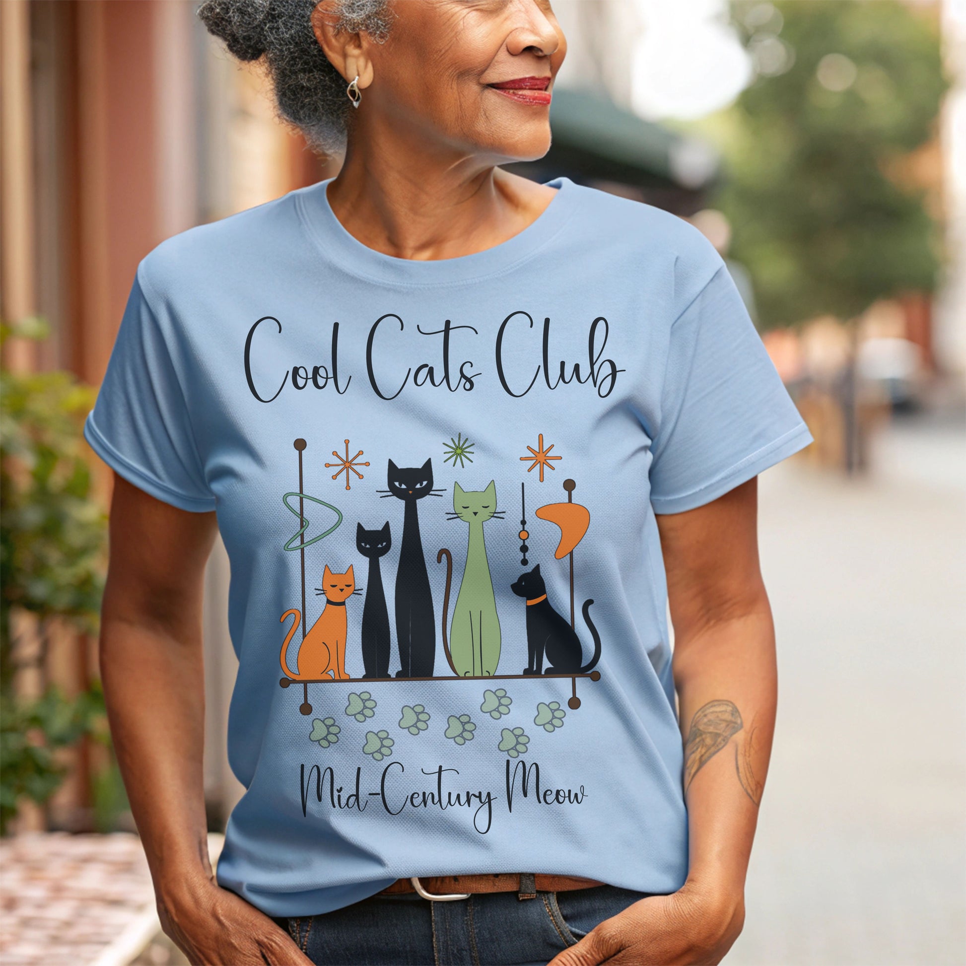 Welcome to the Cool Cats Club — where retro style meets feline sass. This mid-century modern cat t-shirt features a lineup of groovy kitties in atomic-inspired colors and shapes, ready to bring vintage flair to your wardrobe.