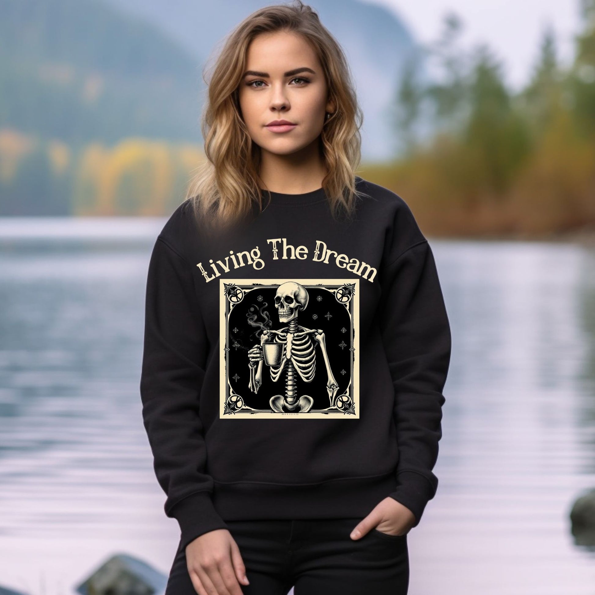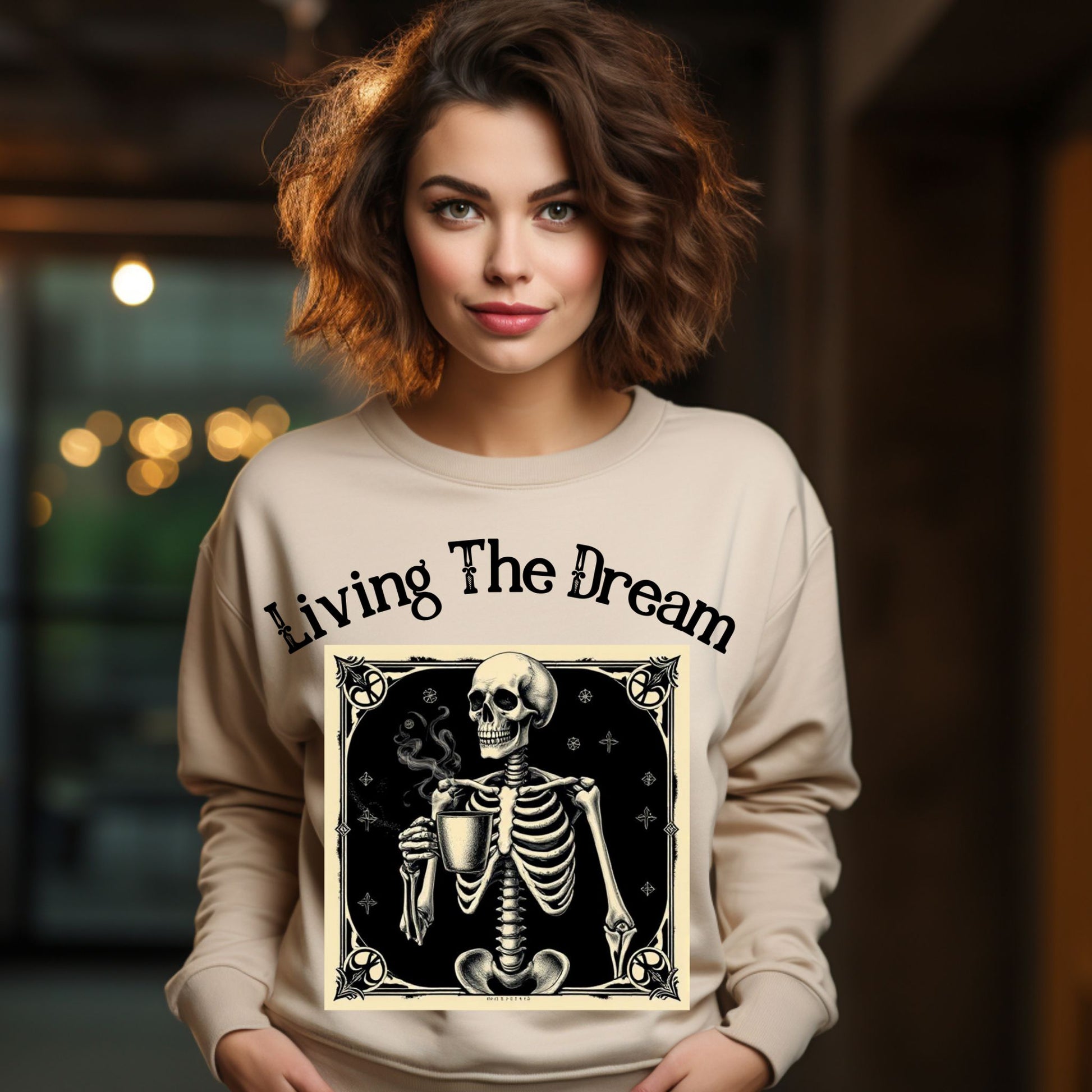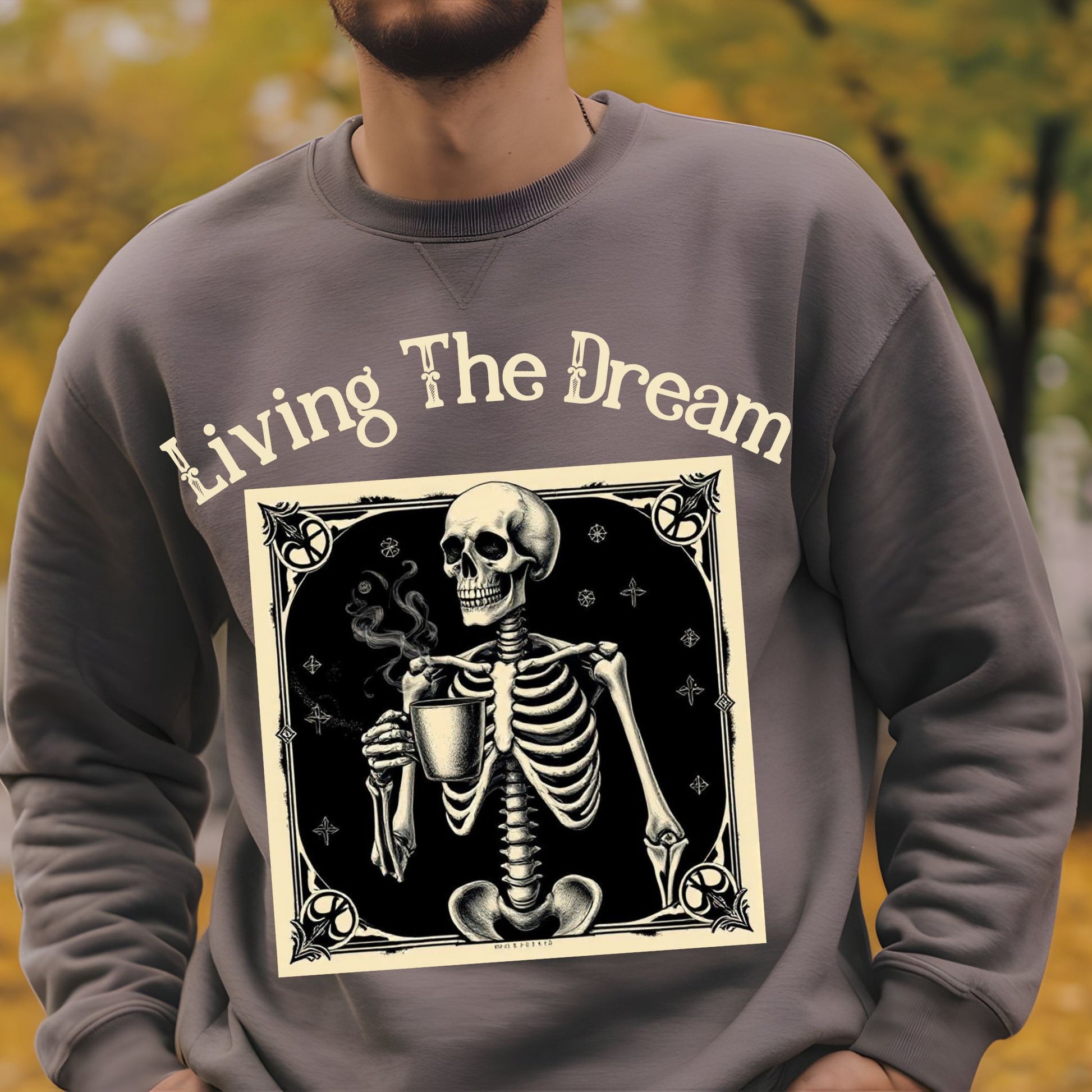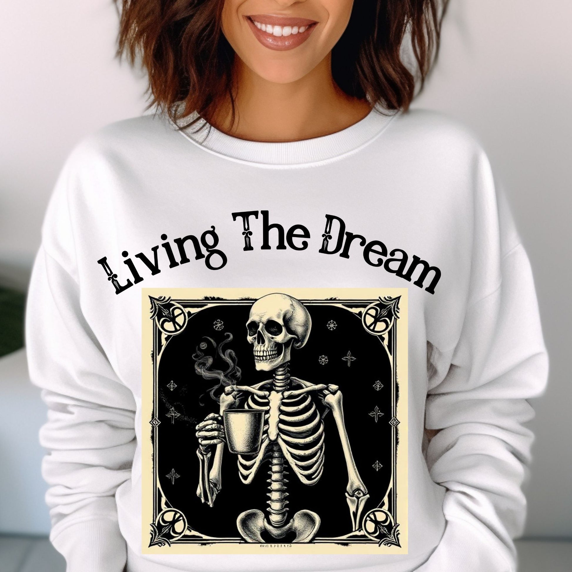 Skeleton Coffee Lover Sweatshirt Vintage Goth Style, “Living The Dream” Shirt