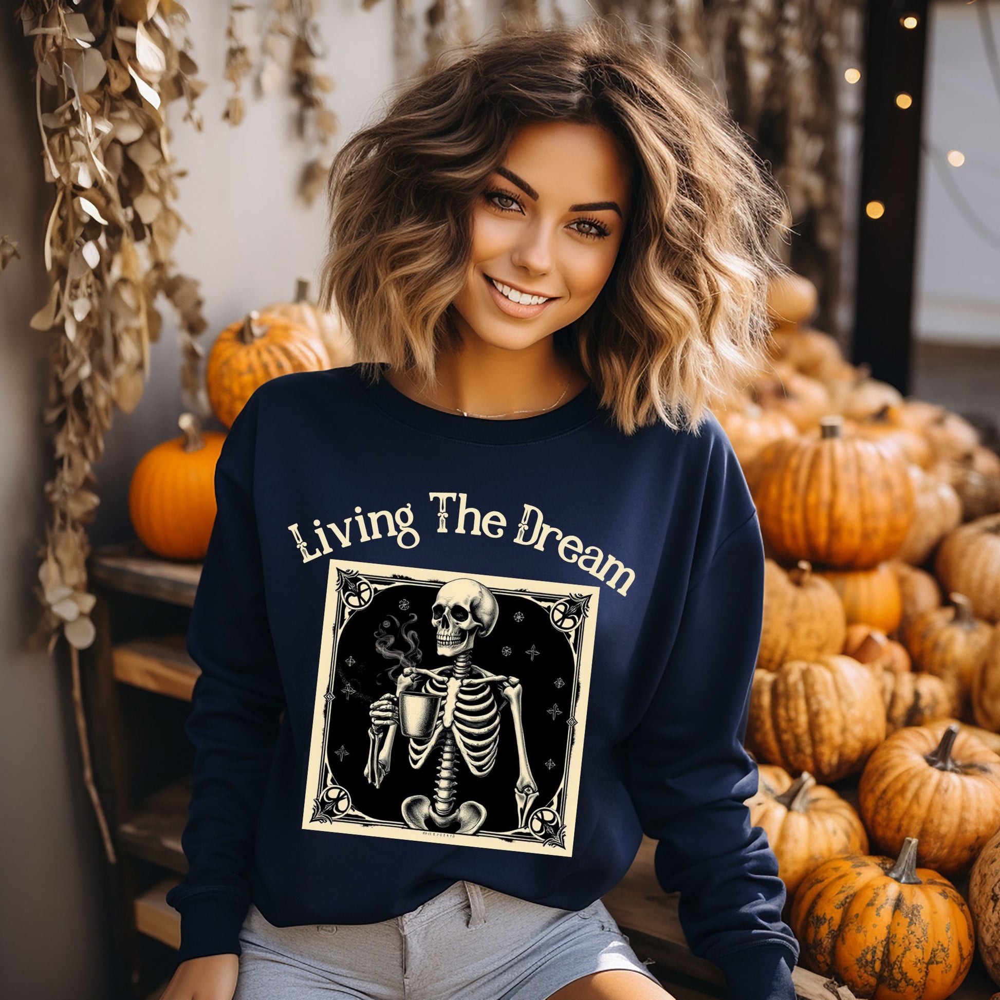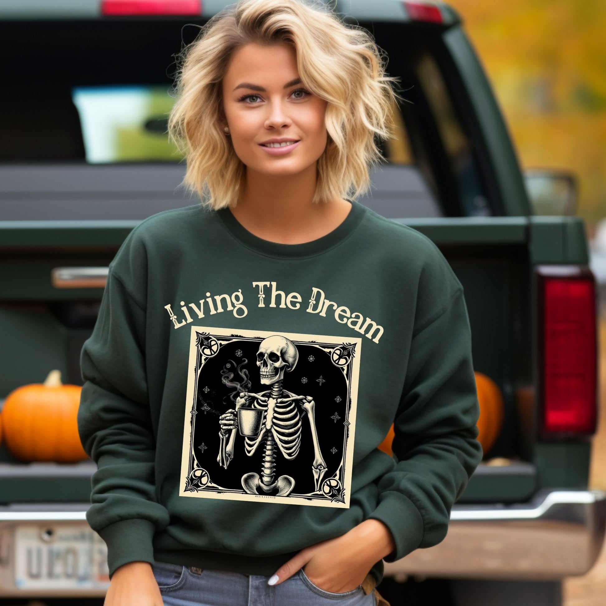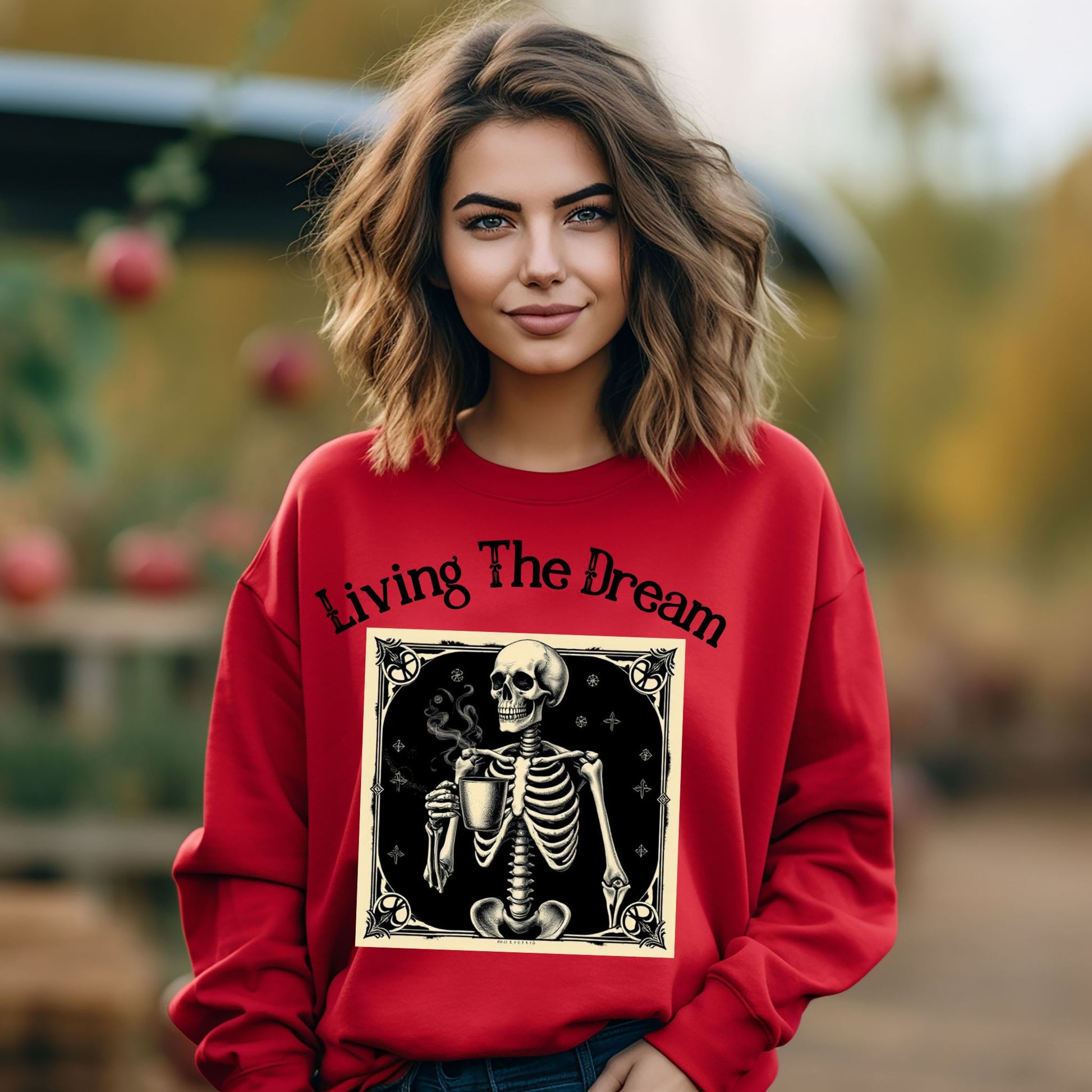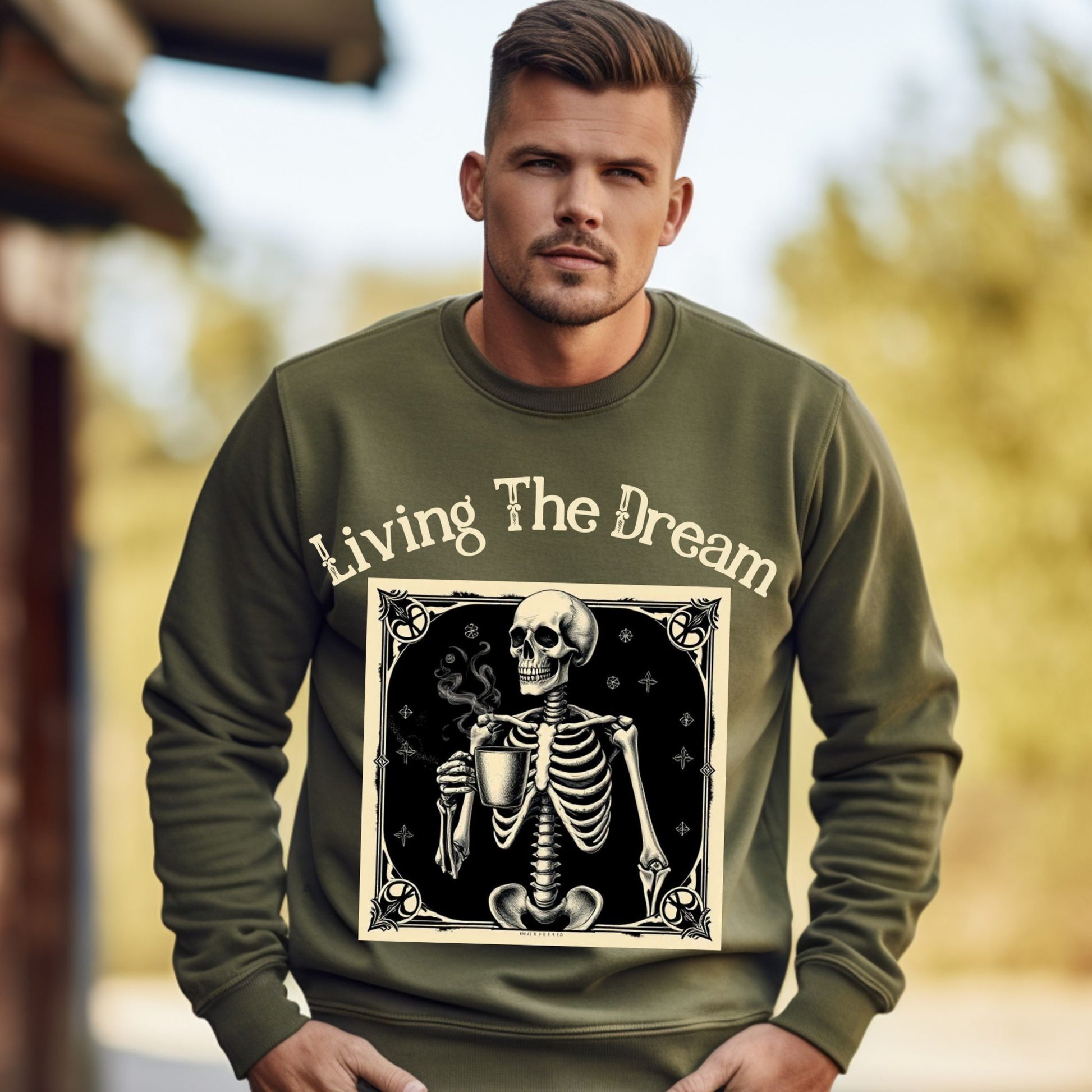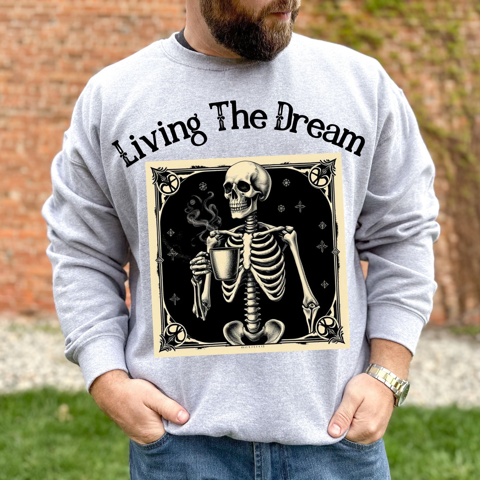 Skeleton Coffee Lover Sweatshirt Vintage Goth Style, “Living The Dream” Shirt