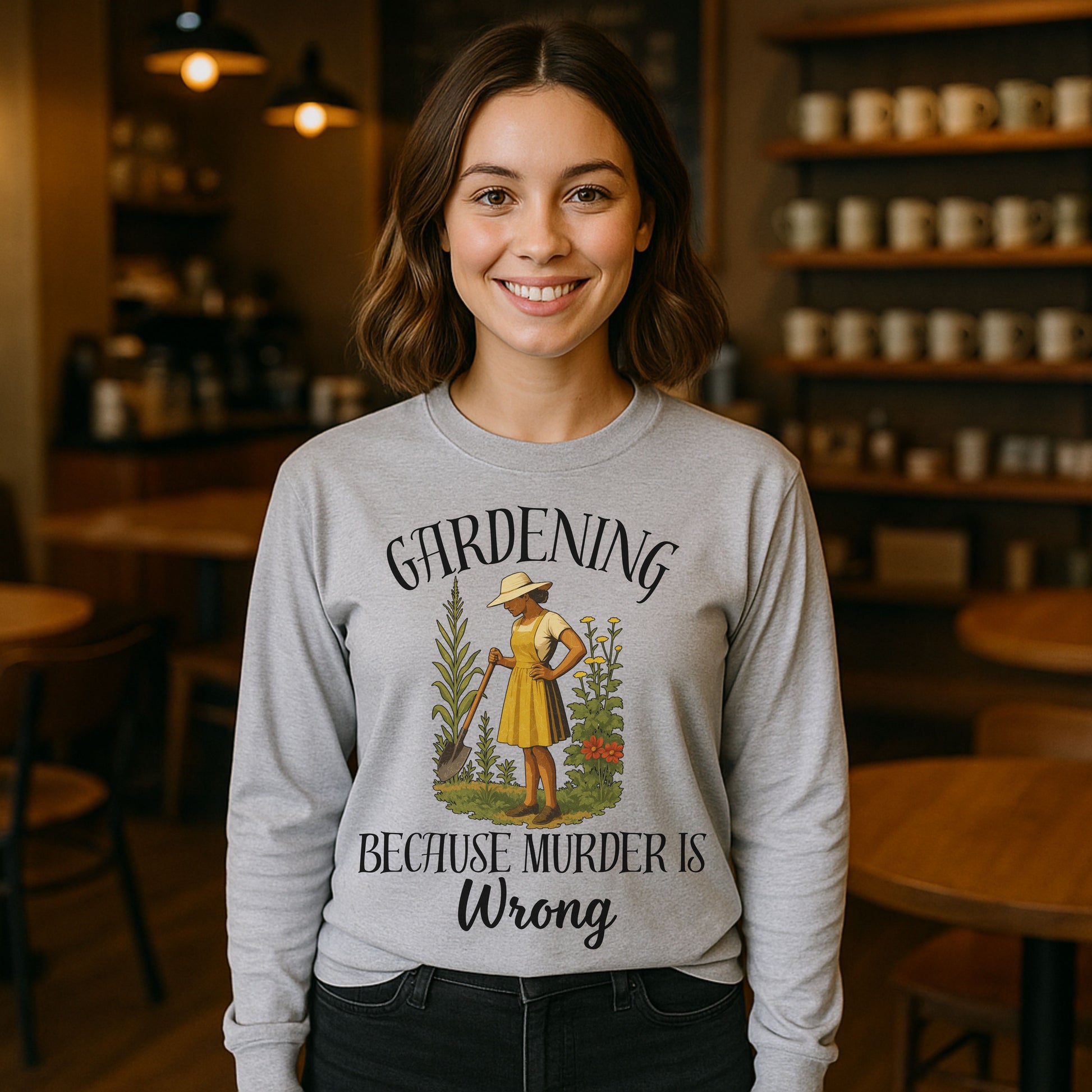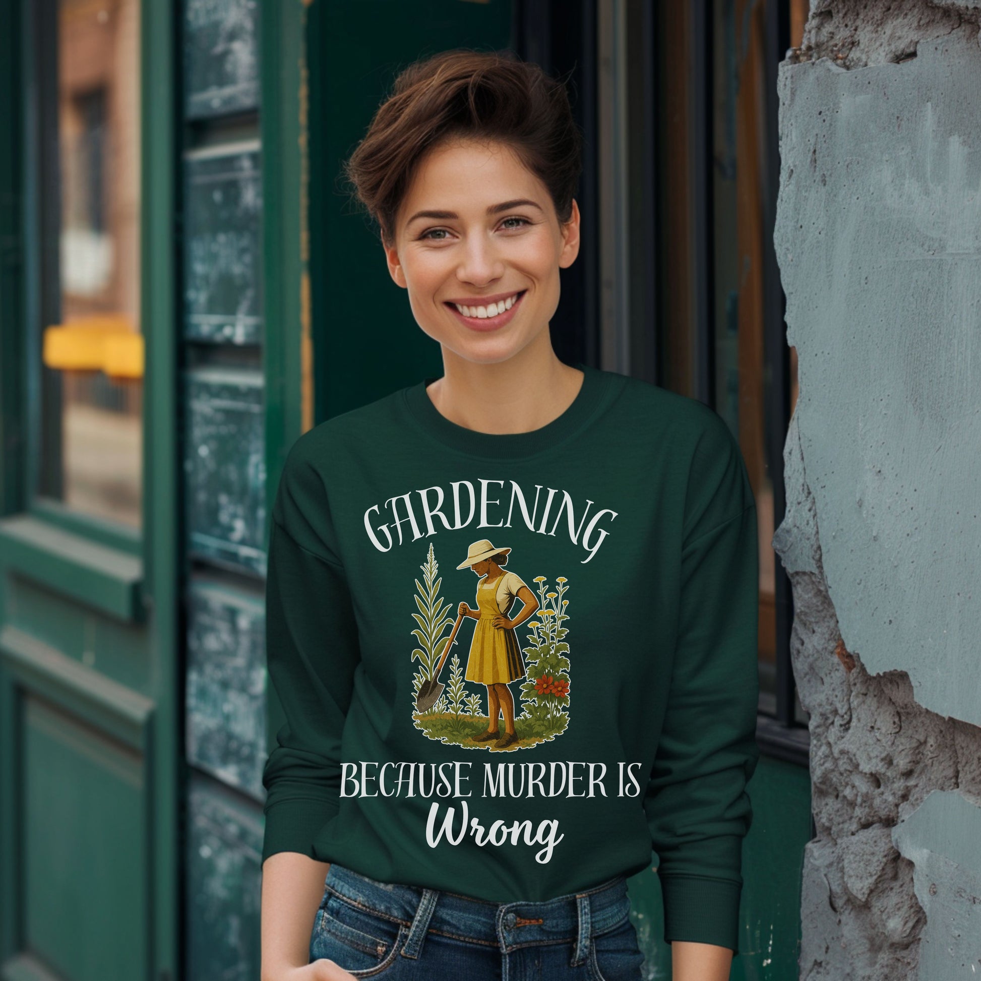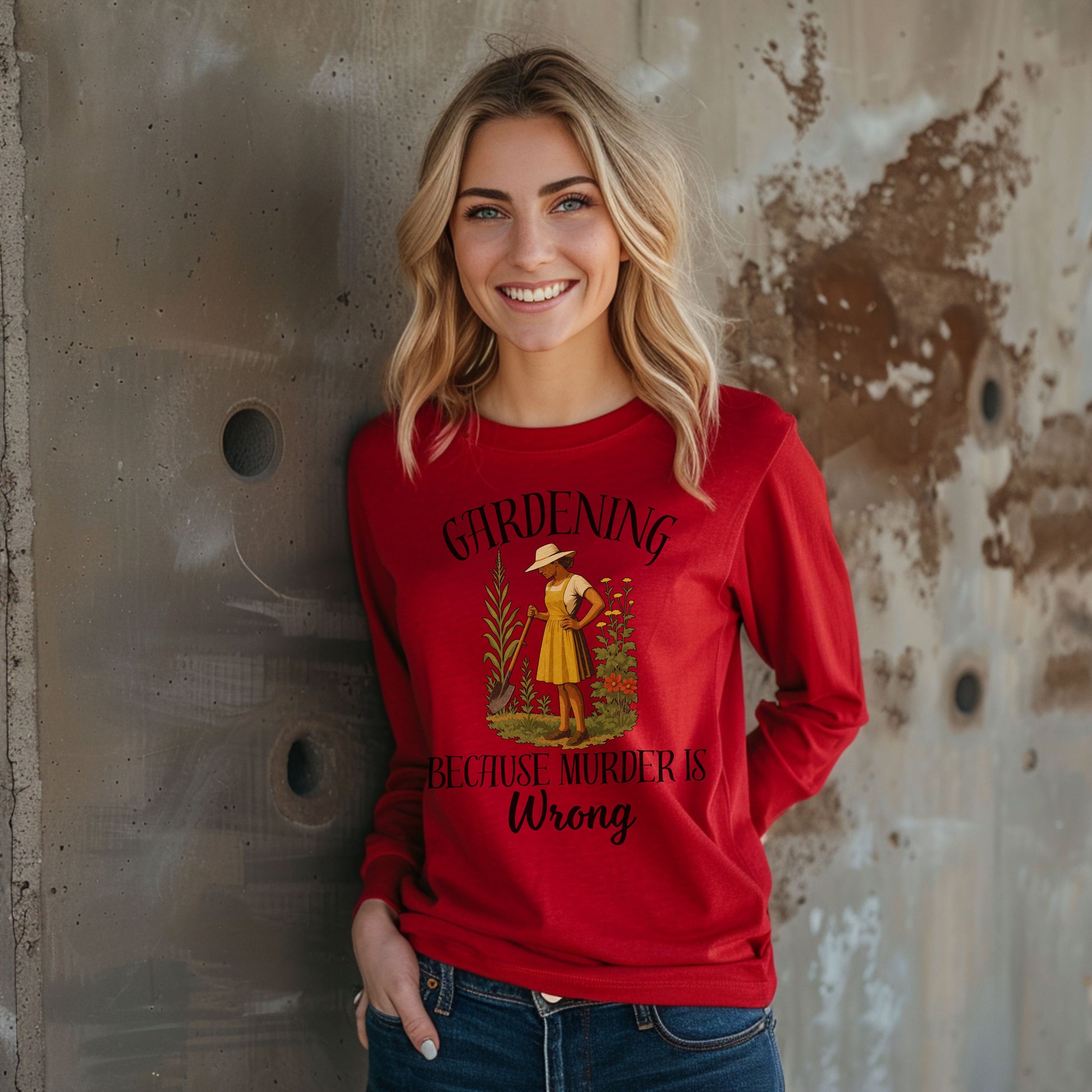 Funny Gardening Lpng Sleeve T-Shirt – "Gardening Because Murder Is Wrong" Tee for Women, Dark Humor Garden Shirt, Gift for Plant Lovers