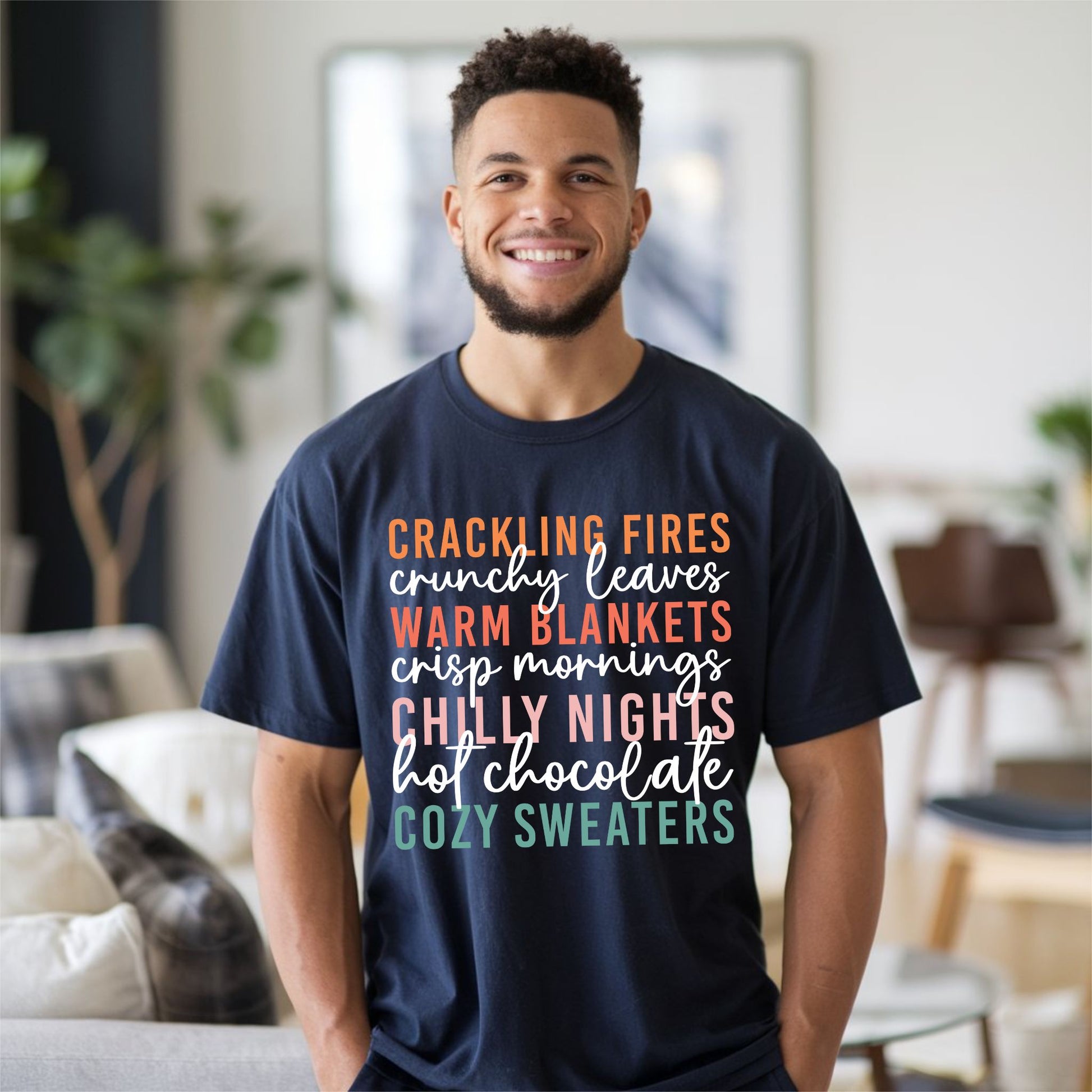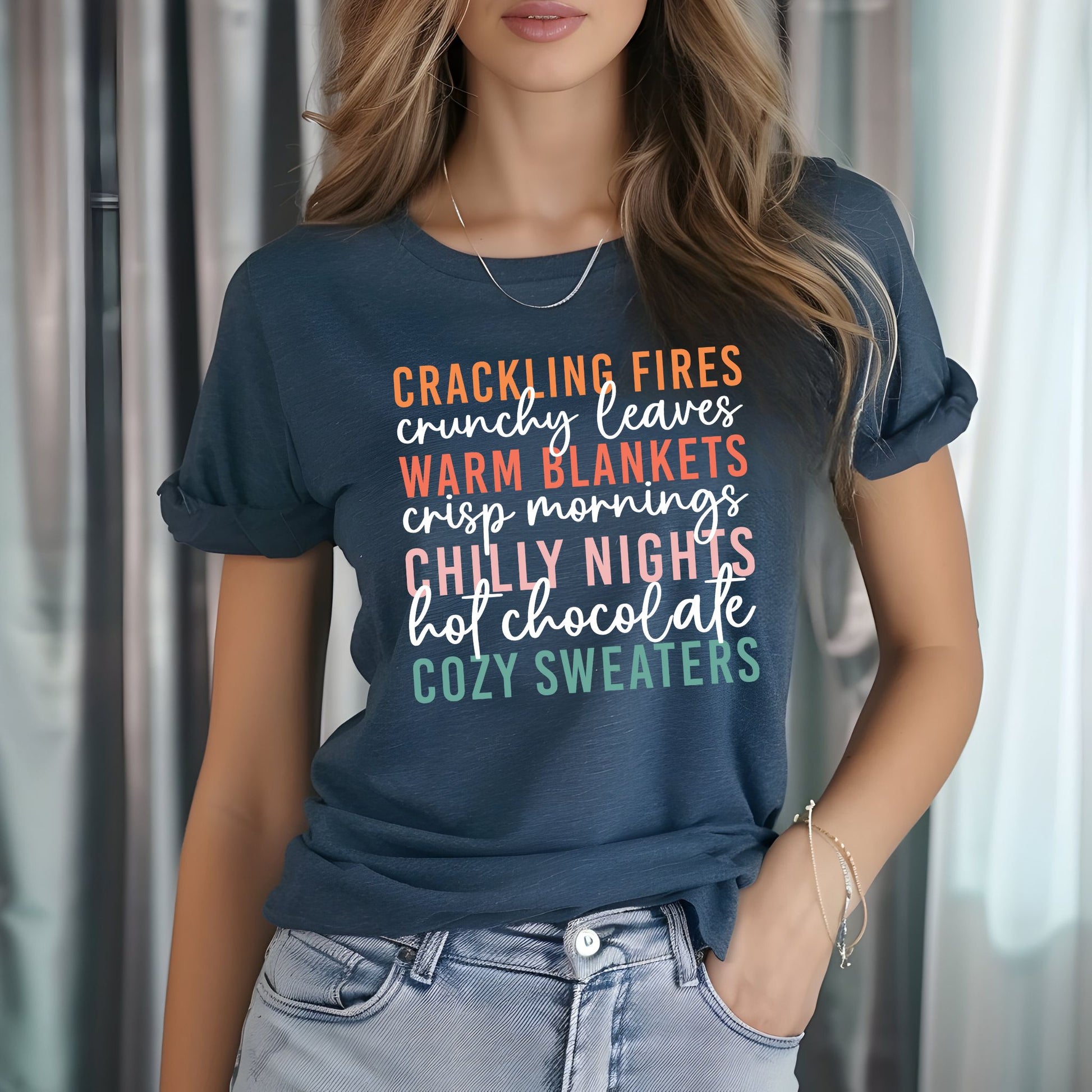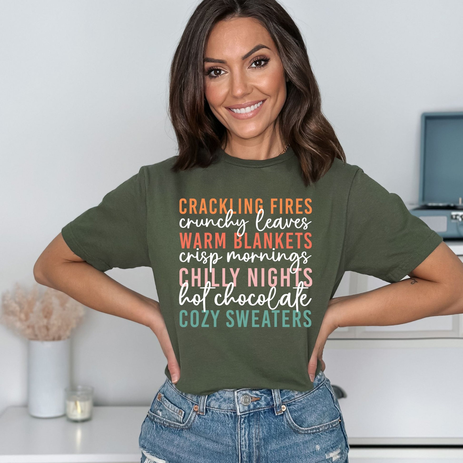 Celebrate the magic of autumn with this charming Cozy Fall Vibes T-Shirt! Featuring colorful stacked text that highlights all the best parts of the season — crackling fires, crunchy leaves, warm blankets, crisp mornings, chilly nights, hot chocolate, and cozy sweaters — this fall-themed graphic tee is perfect for anyone who lives for sweater weather and pumpkin spice. Made from soft, breathable fabric, it’s ideal for cool autumn days, pumpkin patch visits, bonfires, and everything in between. A must-have shirt for fall enthusiasts who love to stay stylish all season long!