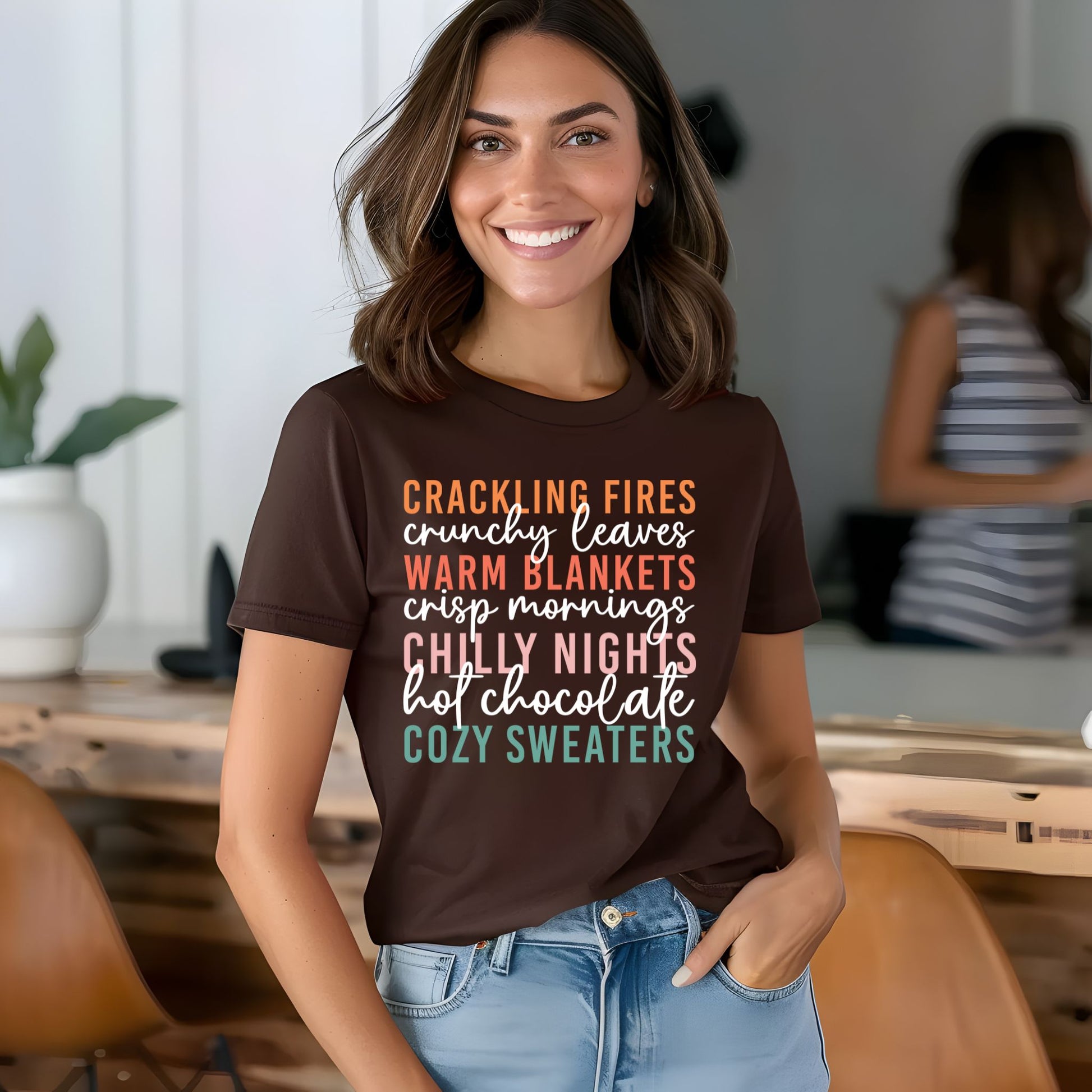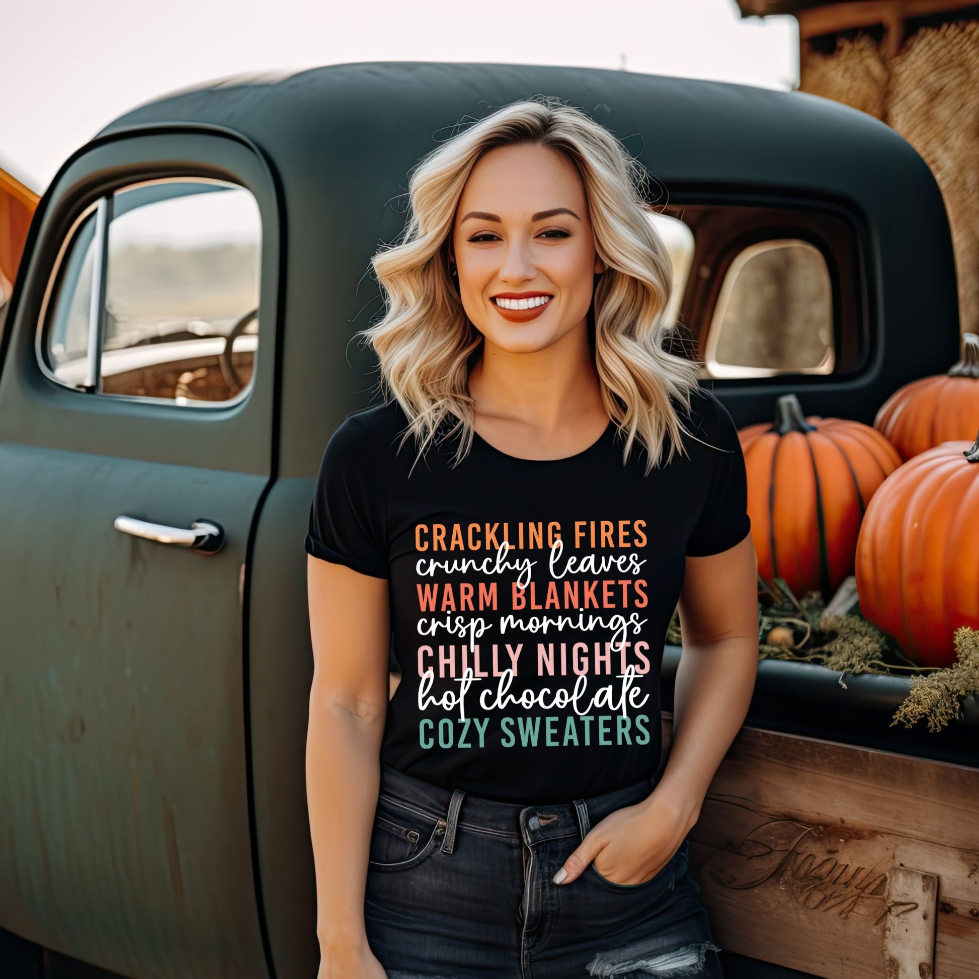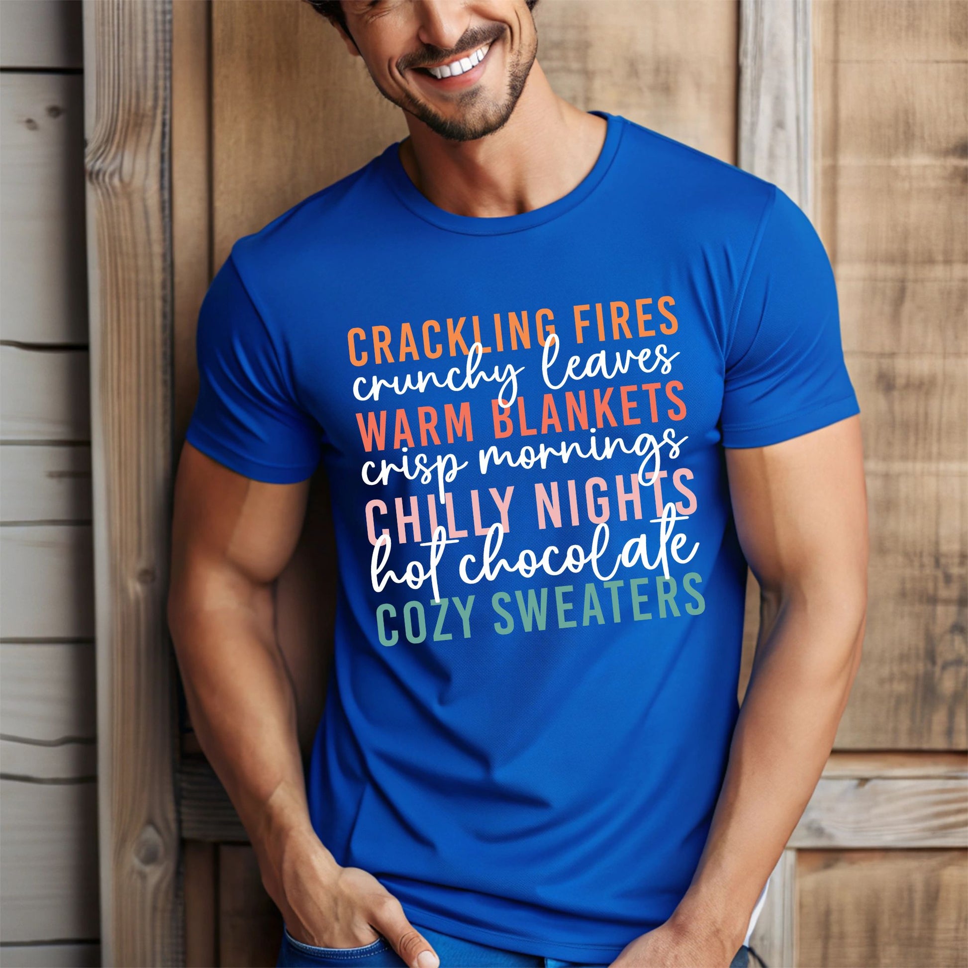 Celebrate the magic of autumn with this charming Cozy Fall Vibes T-Shirt! Featuring colorful stacked text that highlights all the best parts of the season — crackling fires, crunchy leaves, warm blankets, crisp mornings, chilly nights, hot chocolate, and cozy sweaters — this fall-themed graphic tee is perfect for anyone who lives for sweater weather and pumpkin spice. Made from soft, breathable fabric, it’s ideal for cool autumn days, pumpkin patch visits, bonfires, and everything in between. A must-have shirt for fall enthusiasts who love to stay stylish all season long!