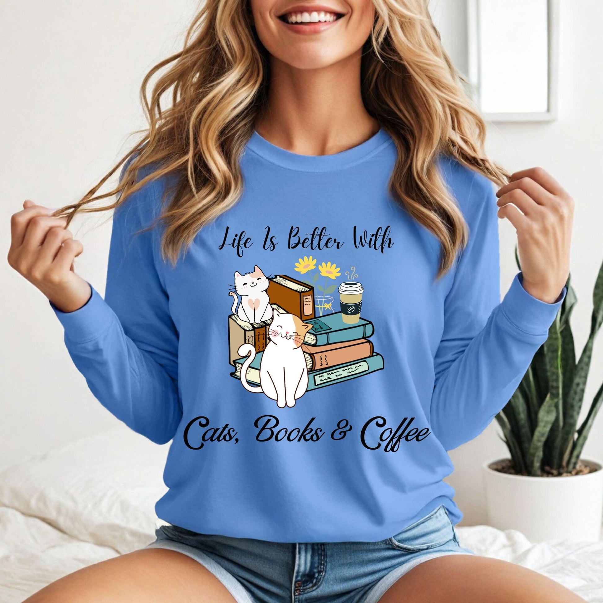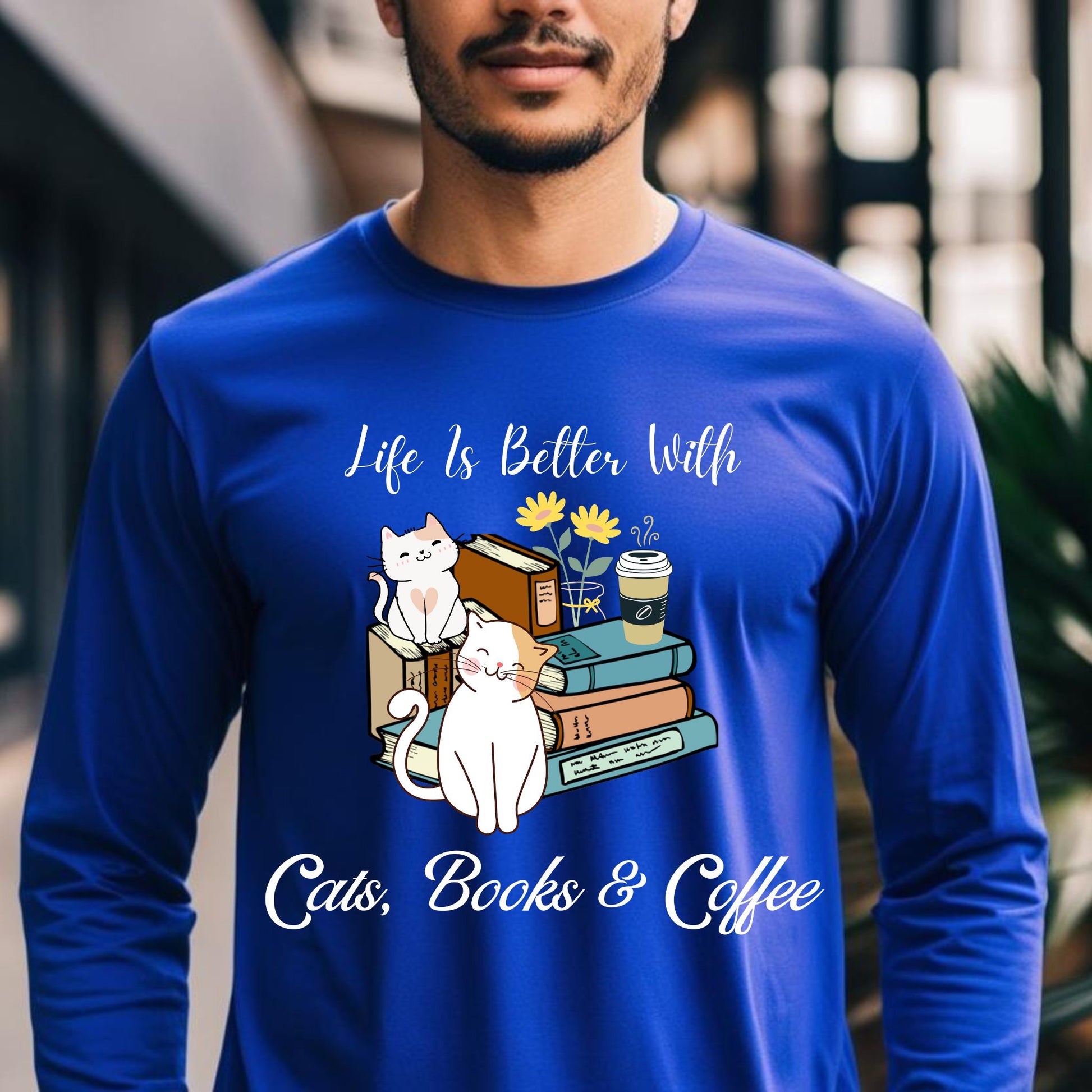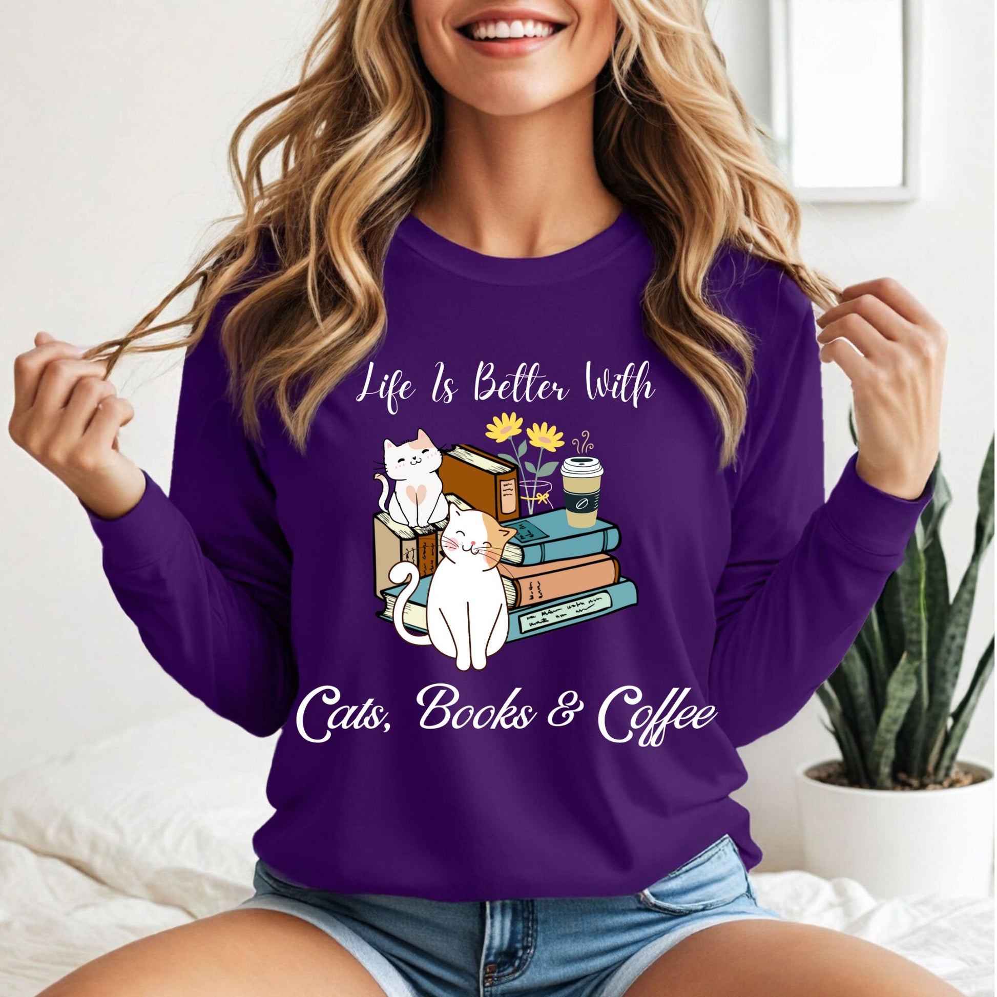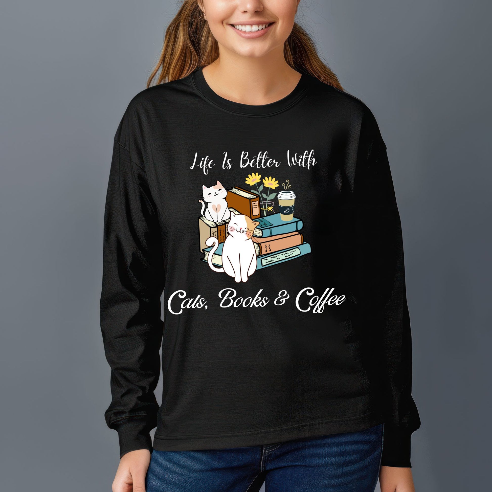 Celebrate your love for cats, books, and coffee with this cozy and charming t-shirt! Featuring two adorable cartoon cats lounging on a stack of books next to a steaming cup of coffee and cheerful flowers, this design is a dream for bookworms and cat lovers alike. Whether you're curled up reading or out for a casual day, this "Life Is Better With Cats, Books, and Coffee' tee blends comfort, cuteness, and cozy vibes into one purr-fect look.