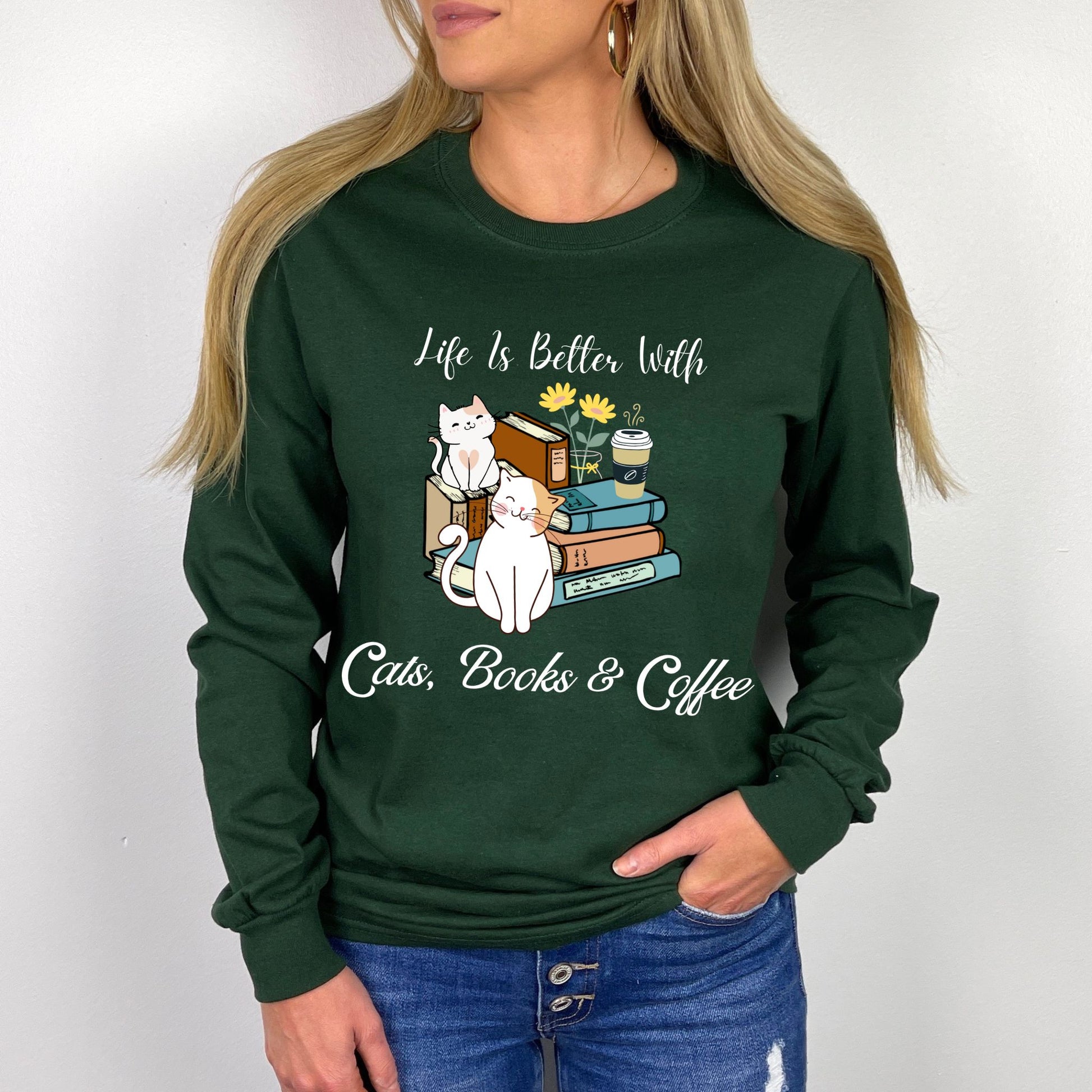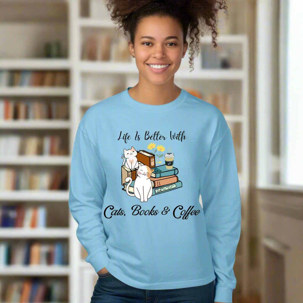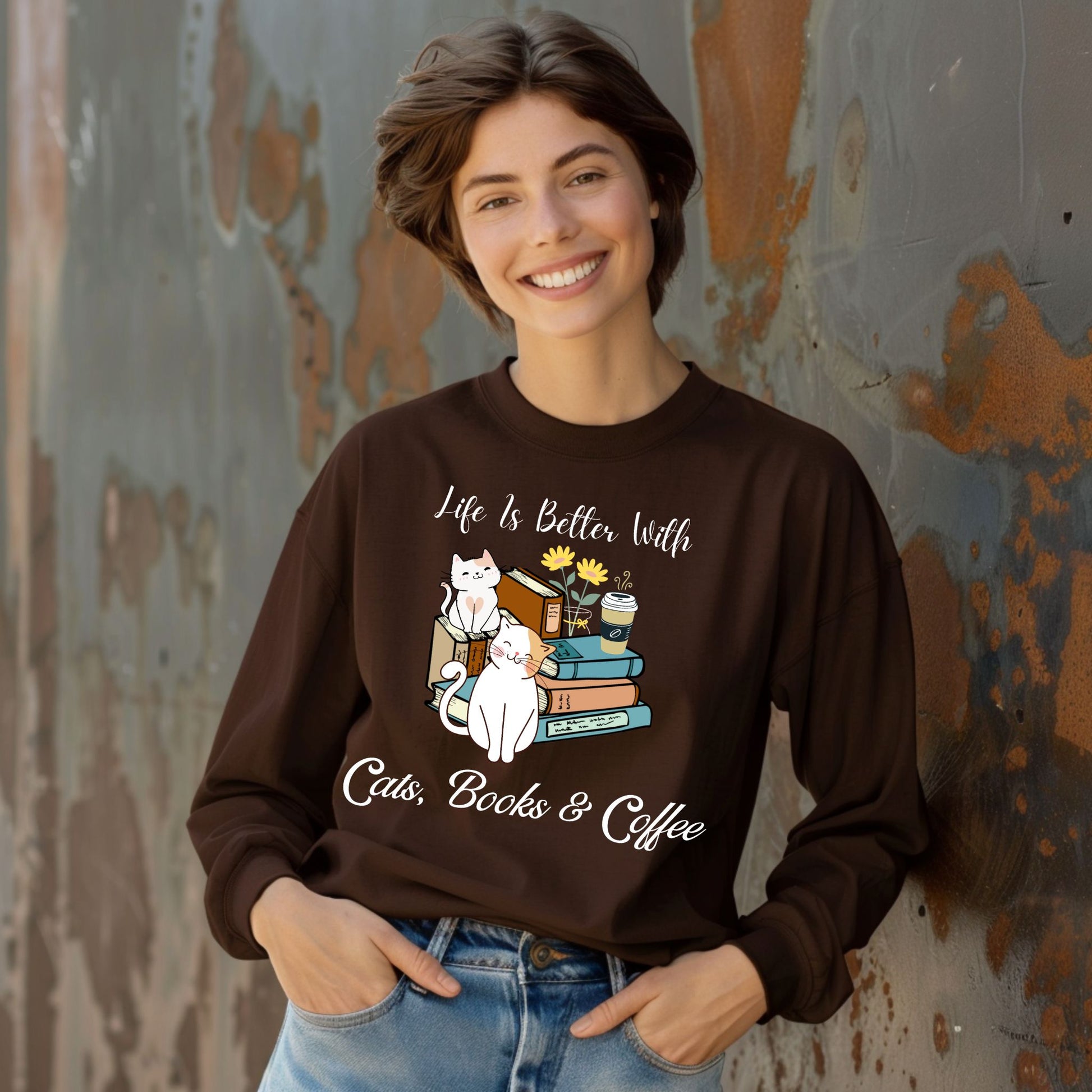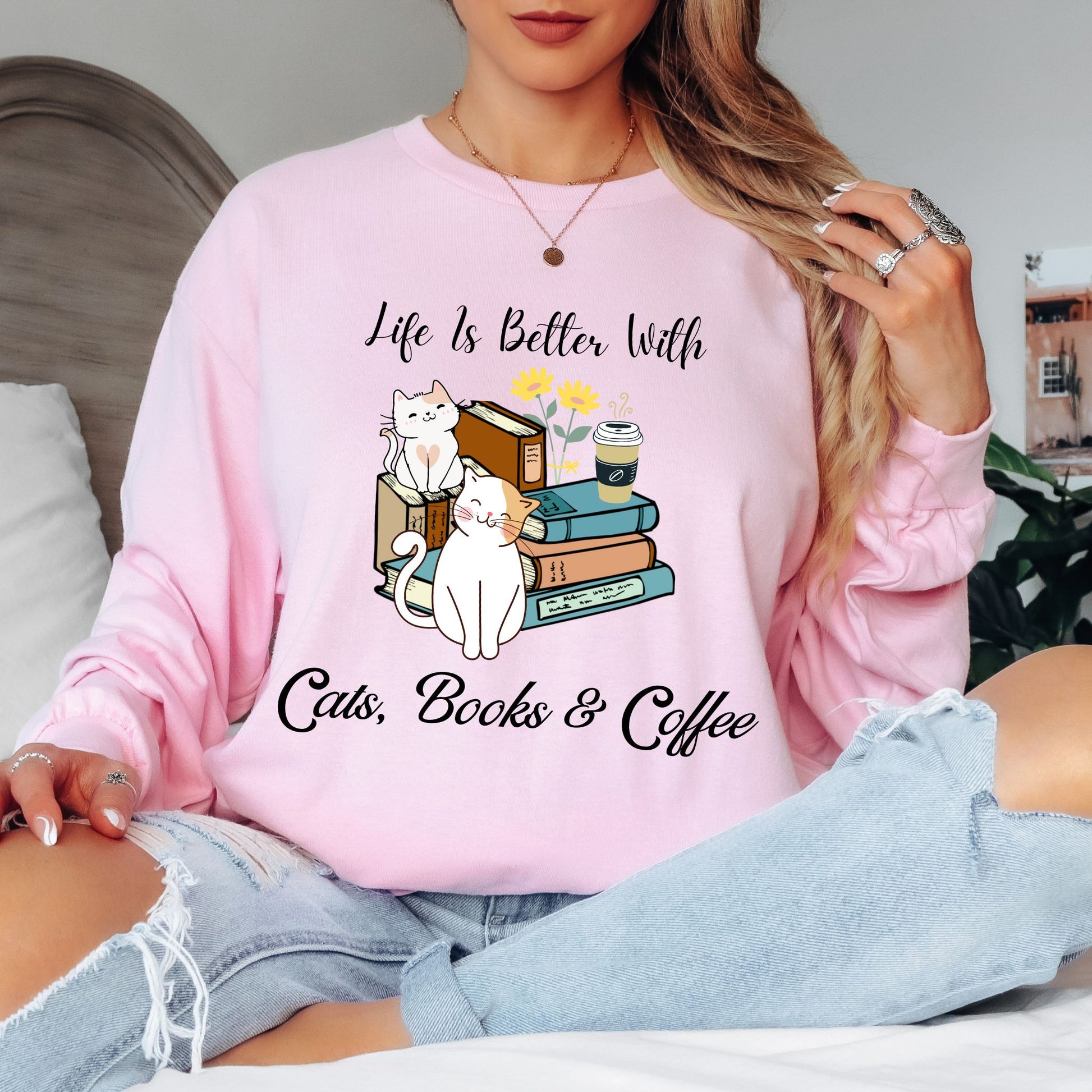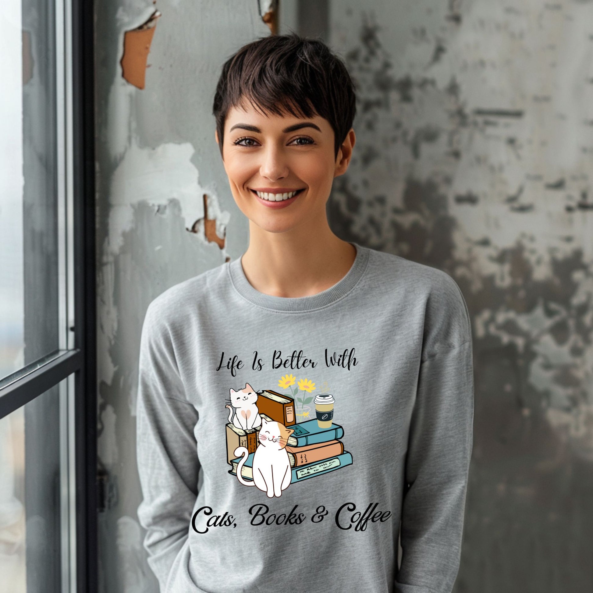 Celebrate your love for cats, books, and coffee with this cozy and charming t-shirt! Featuring two adorable cartoon cats lounging on a stack of books next to a steaming cup of coffee and cheerful flowers, this design is a dream for bookworms and cat lovers alike. Whether you're curled up reading or out for a casual day, this "Life Is Better With Cats, Books, and Coffee' tee blends comfort, cuteness, and cozy vibes into one purr-fect look.