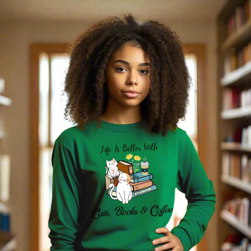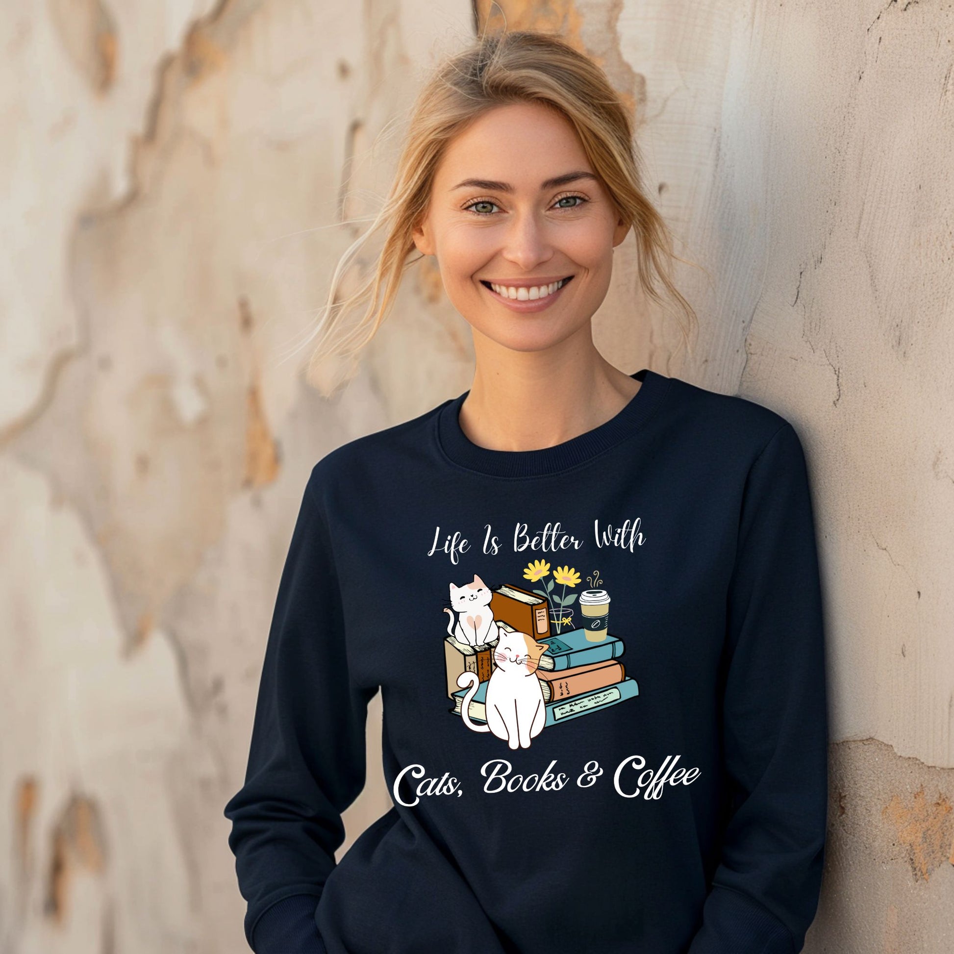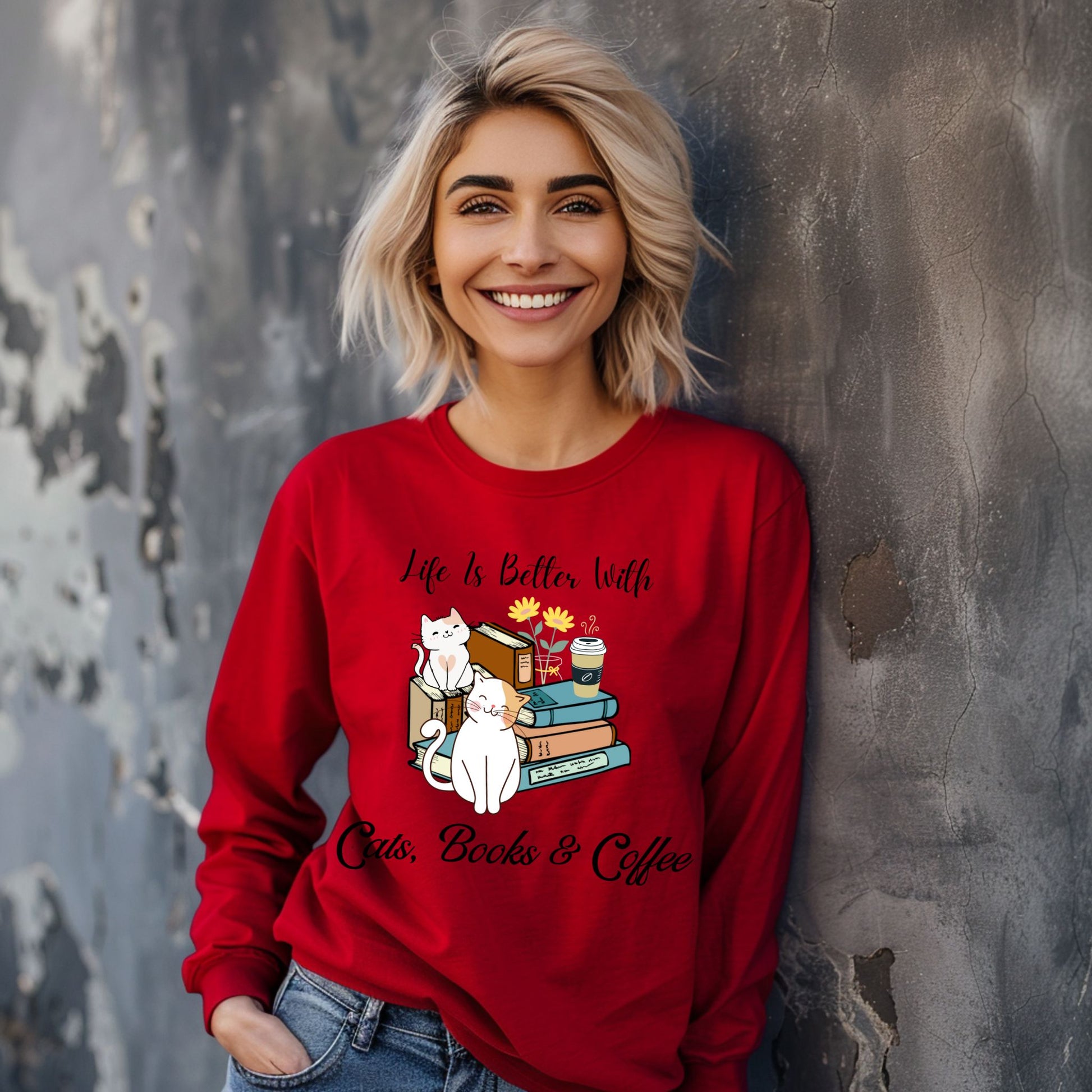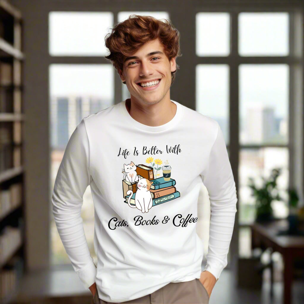Celebrate your love for cats, books, and coffee with this cozy and charming t-shirt! Featuring two adorable cartoon cats lounging on a stack of books next to a steaming cup of coffee and cheerful flowers, this design is a dream for bookworms and cat lovers alike. Whether you're curled up reading or out for a casual day, this "Life Is Better With Cats, Books, and Coffee' tee blends comfort, cuteness, and cozy vibes into one purr-fect look.