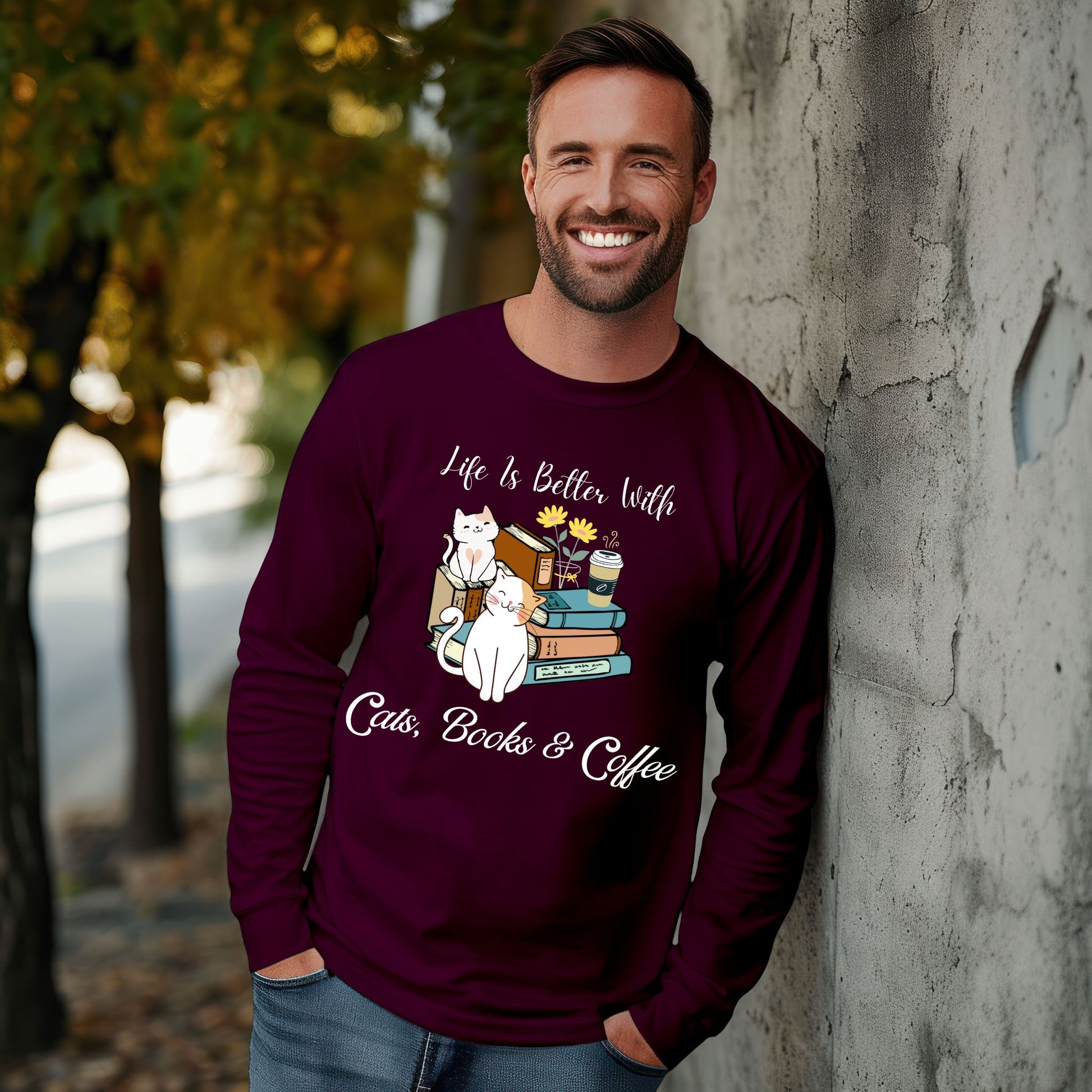 Cute Cat Book Coffee T-Shirt Cozy Literary Cat Lover Tee Long Sleeve Tee