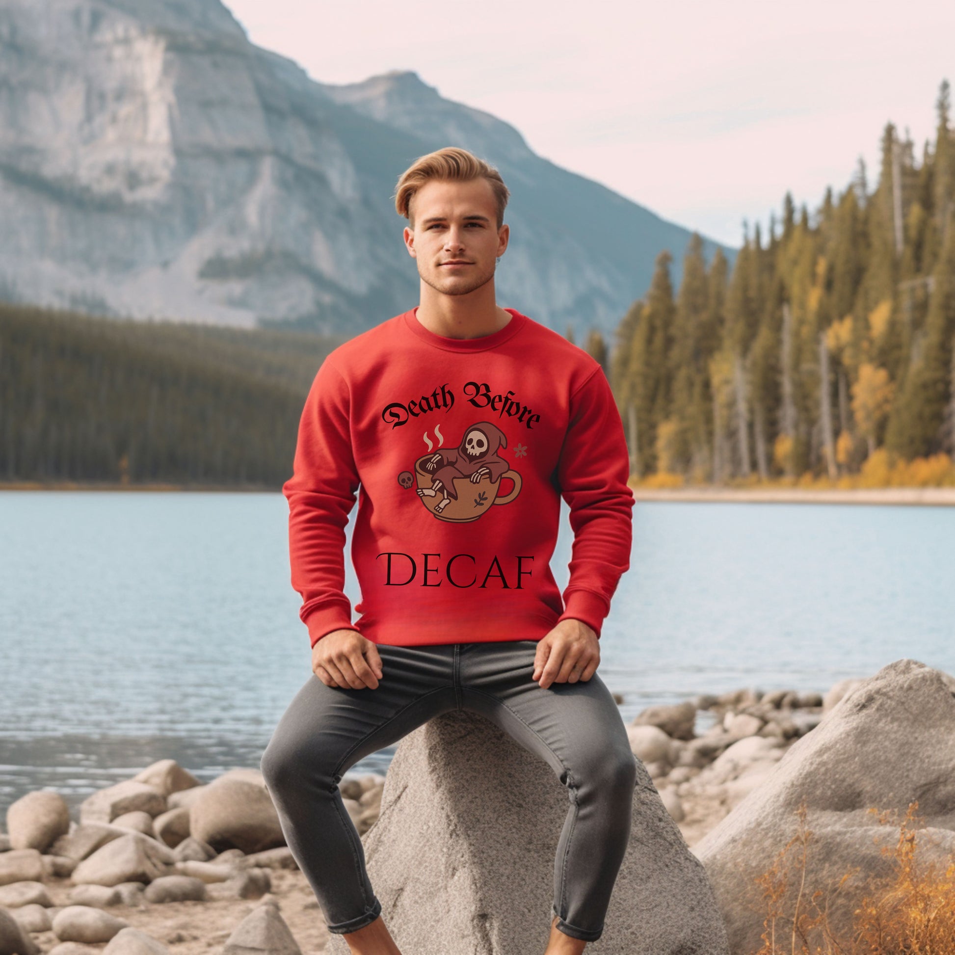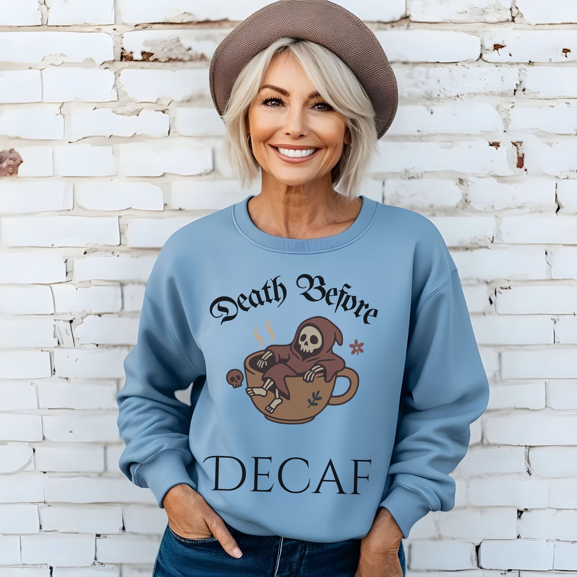 Death Before Decaf Sweatshirt – Funny Grim Reaper Coffee Shirt for Caffeine Lovers