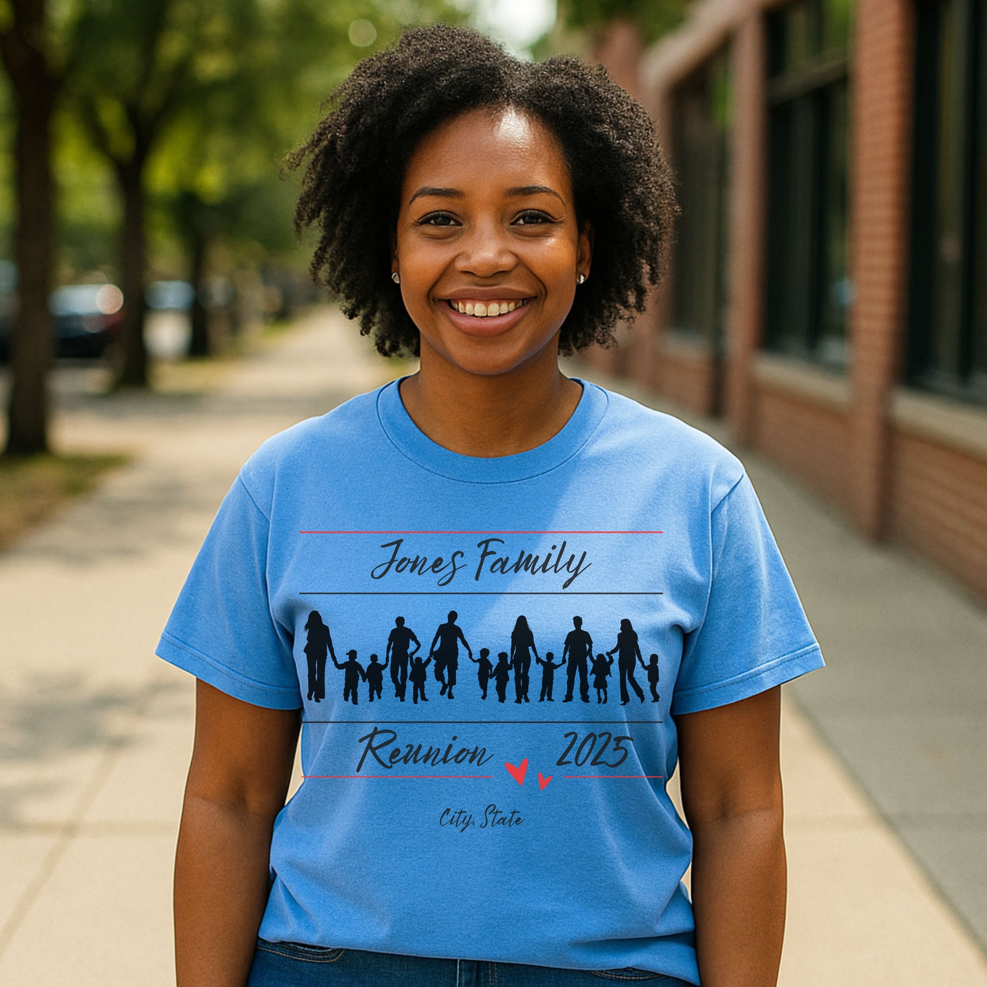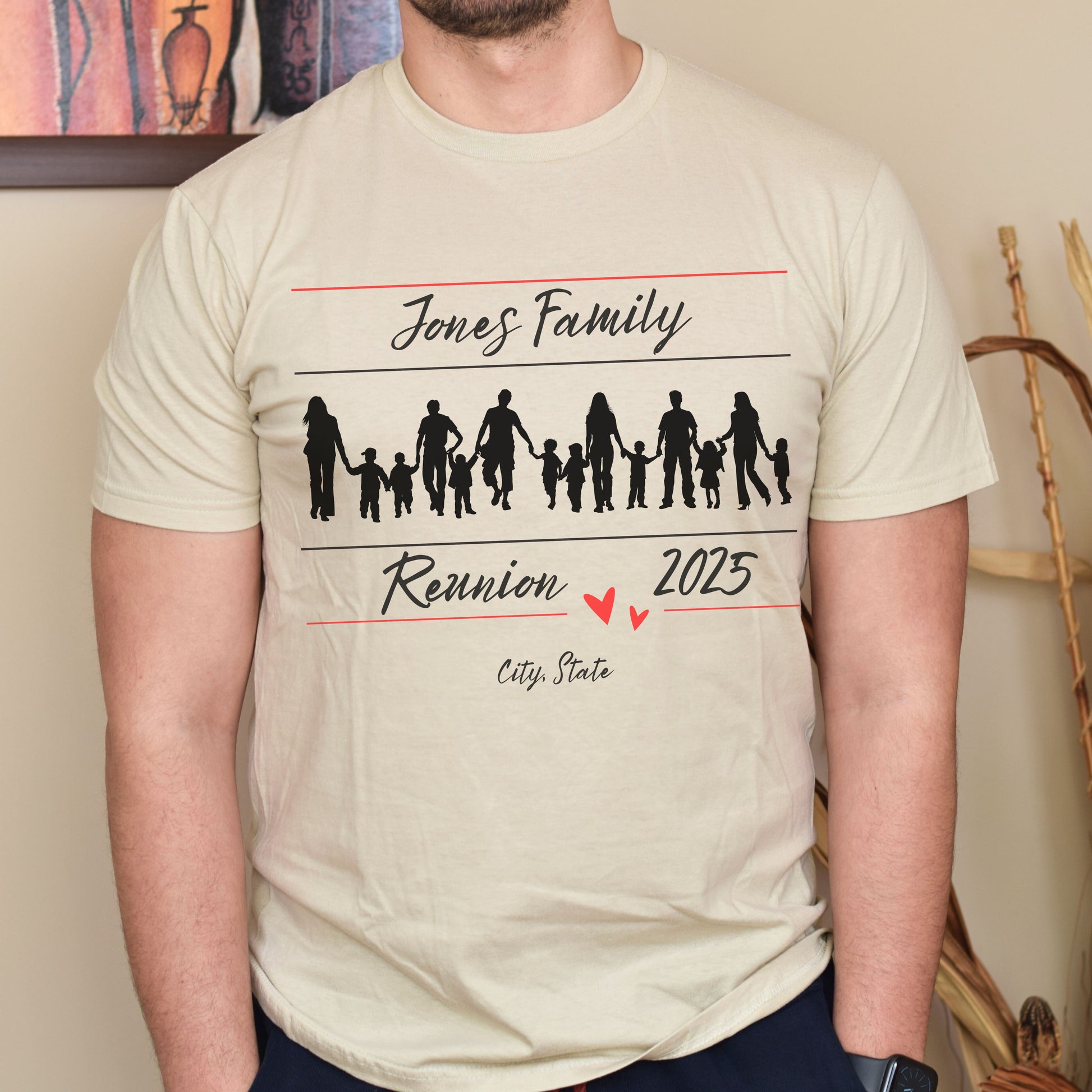 Celebrate family, unity, and togetherness with this Custom “Jones Family Reunion 2025” T-Shirt! Featuring a heartwarming silhouette of a multi-generational family holding hands, this stylish shirt is personalized with your family name, reunion year, and location (city/state).