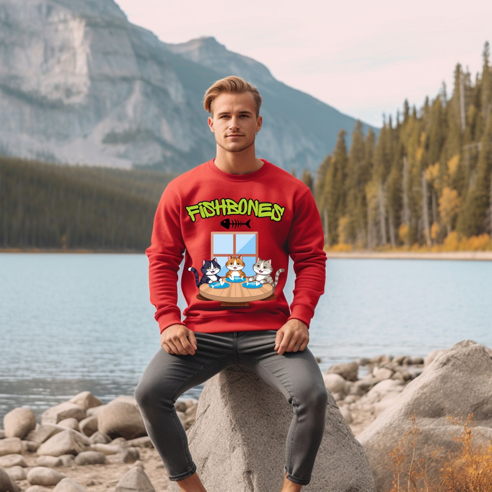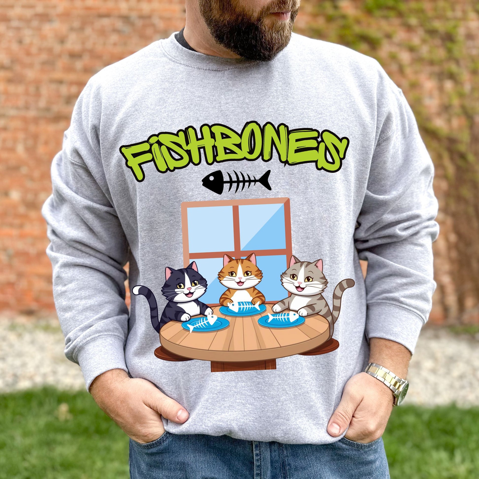Show off your love for feline friends and food with this Fishbones Cat Diner Sweatshirt! Featuring an adorable design of three cartoon cats happily munching on fish at their favorite restaurant, “Fishbones,” this fun graphic shirt is perfect for cat lovers, foodies, and anyone who appreciates a playful, quirky design. Made from soft, breathable fabric, it’s great for casual outings, cozy days at home, or as a unique gift for the cat enthusiast in your life.Celebrate your love for cats and creativity with this stylish and comfortable sweatshirt. Available in various sizes and colors to suit your style.