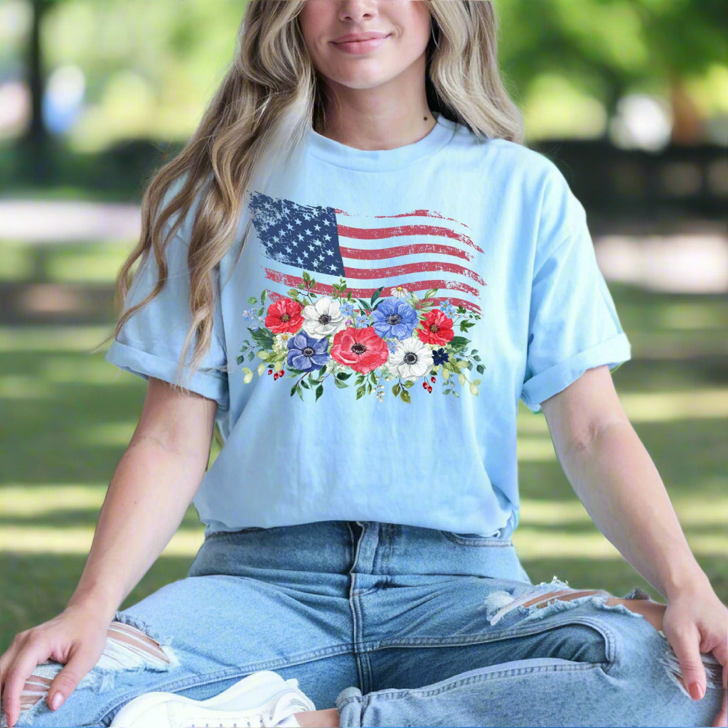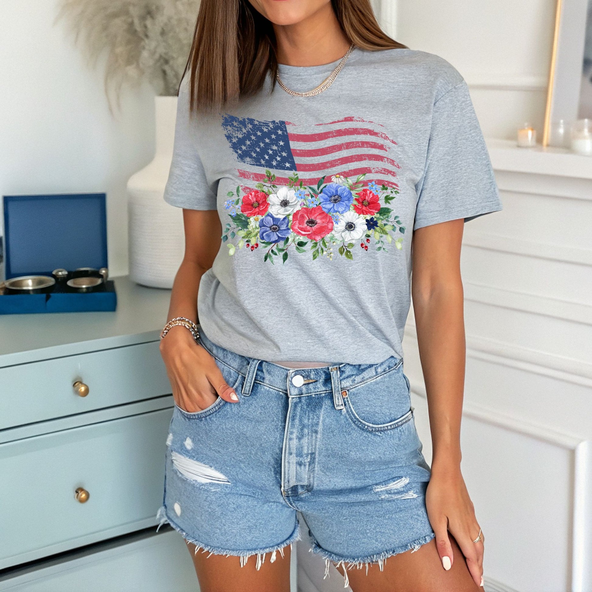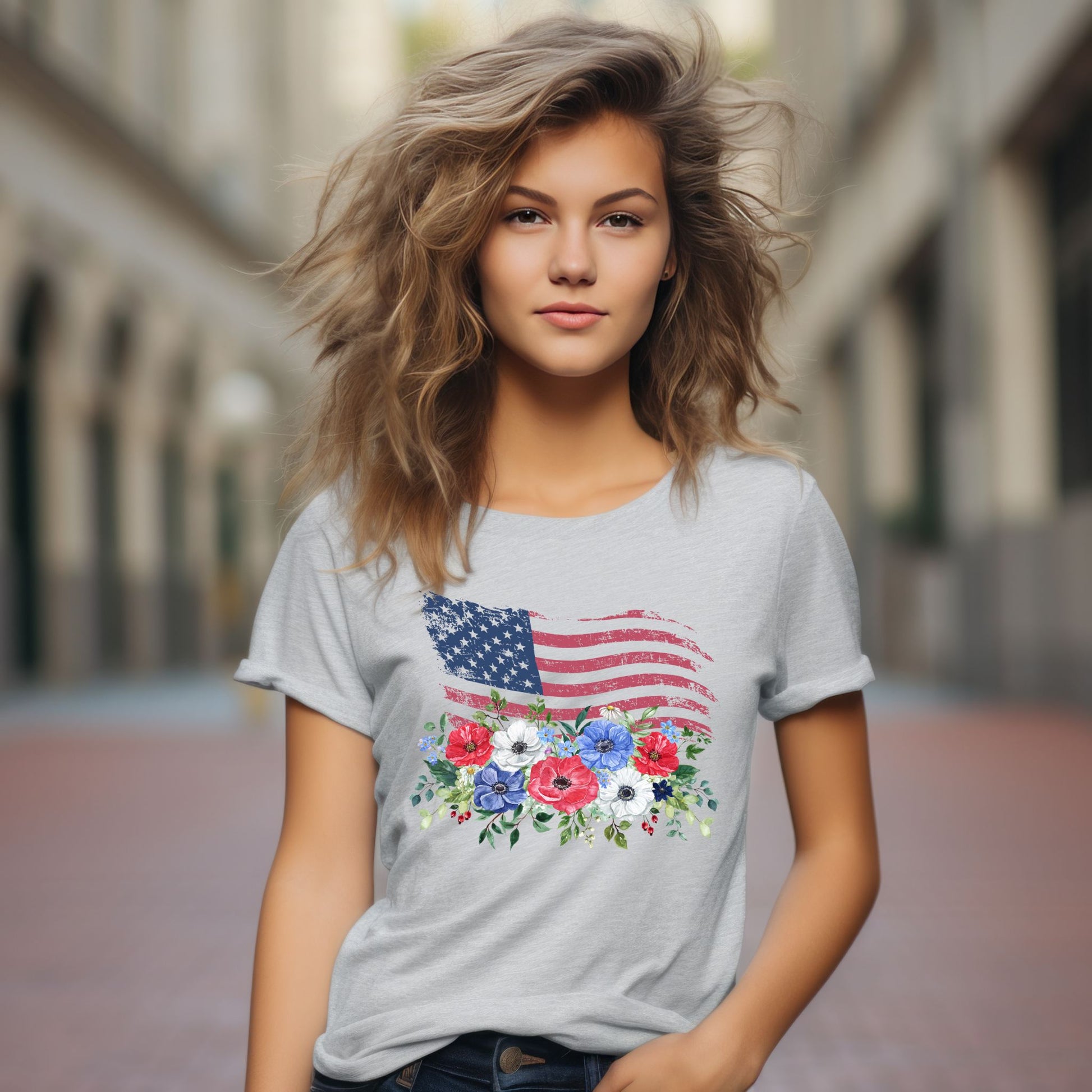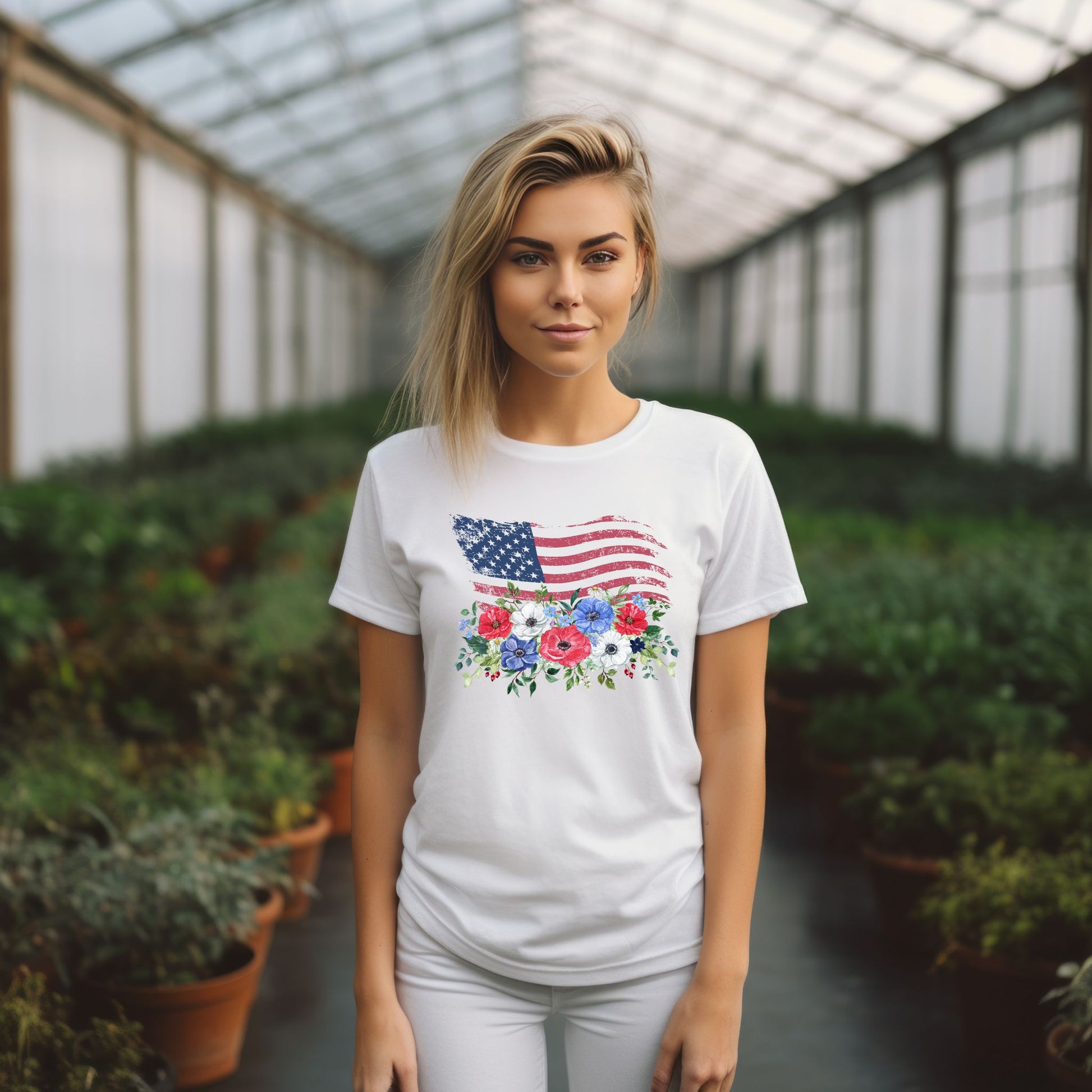 Floral American Flag T-Shirt USA Flag with Flowers Patriotic Graphic Tee Flag Graphic T-Shirt Independence Day Shirt USA Flag T Shirt 4th of July Shirt