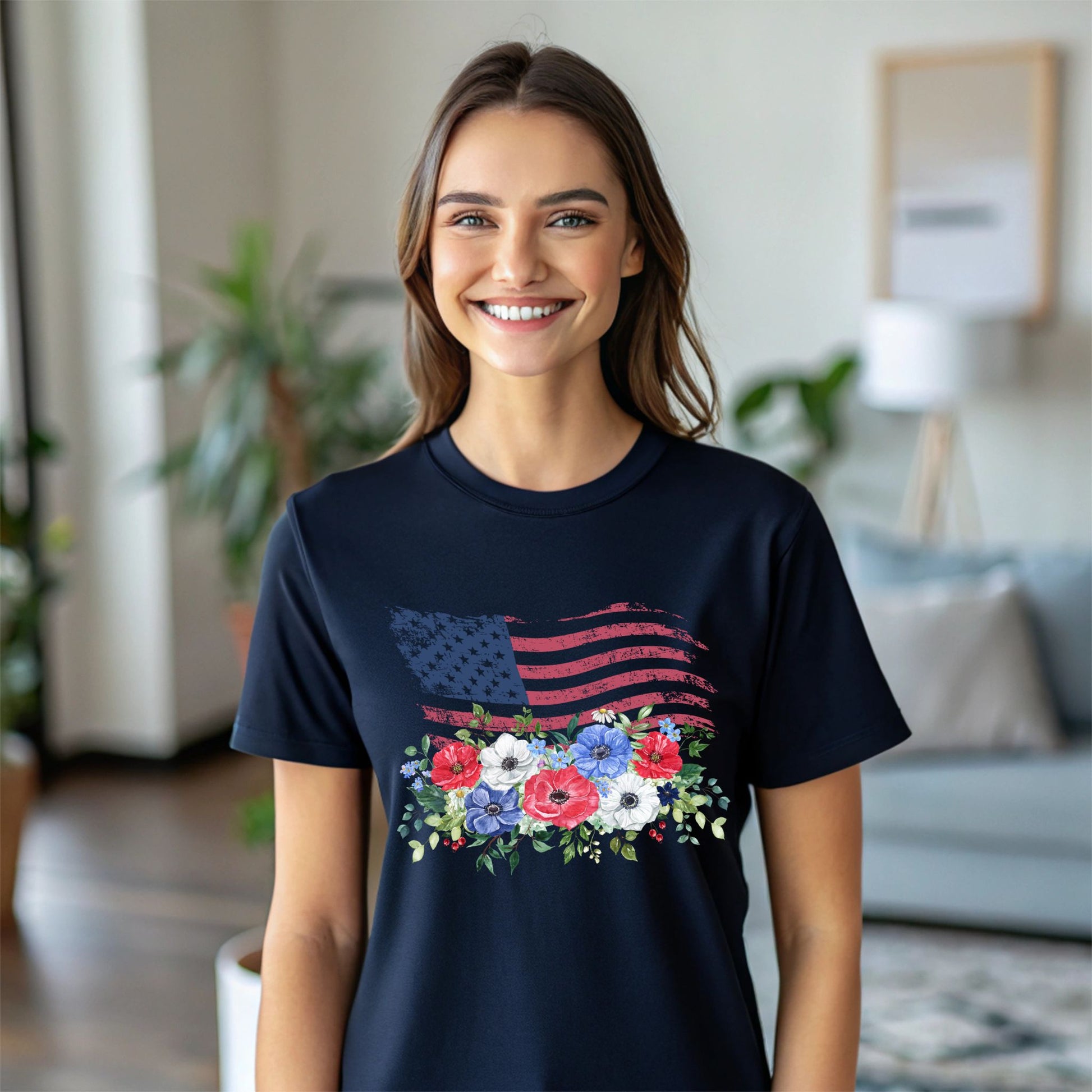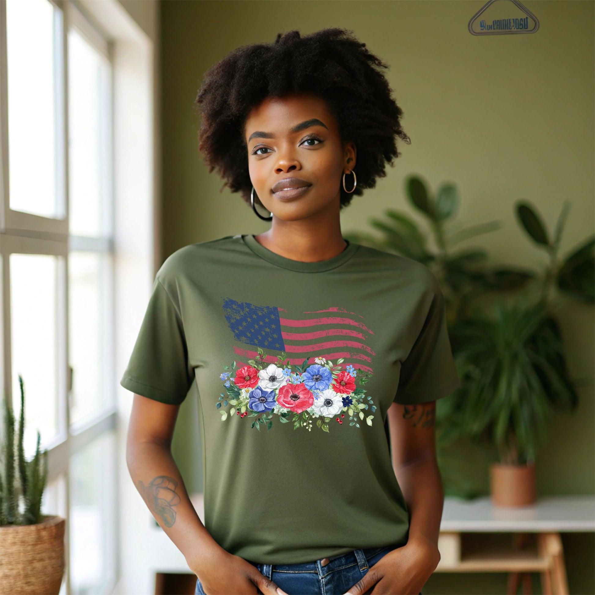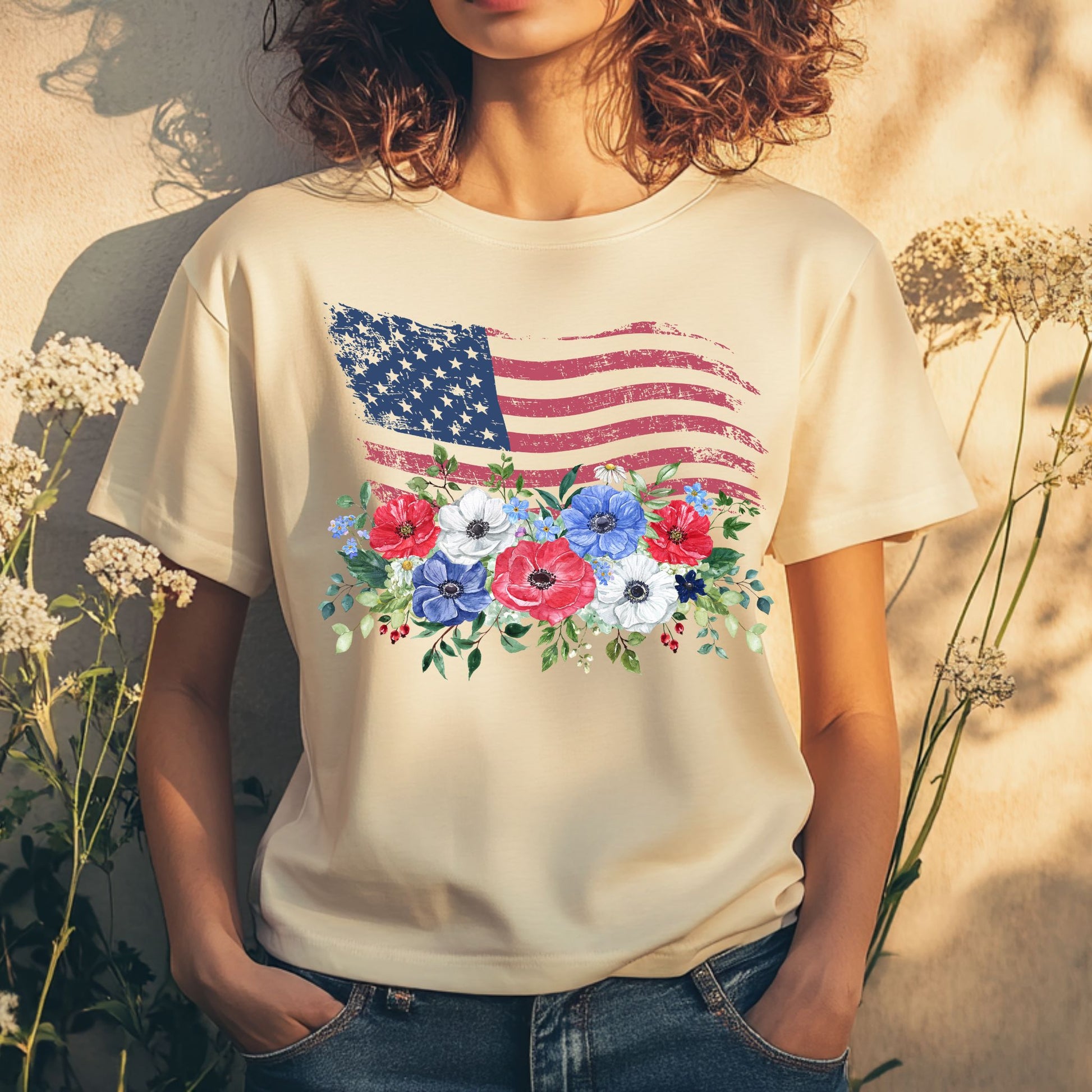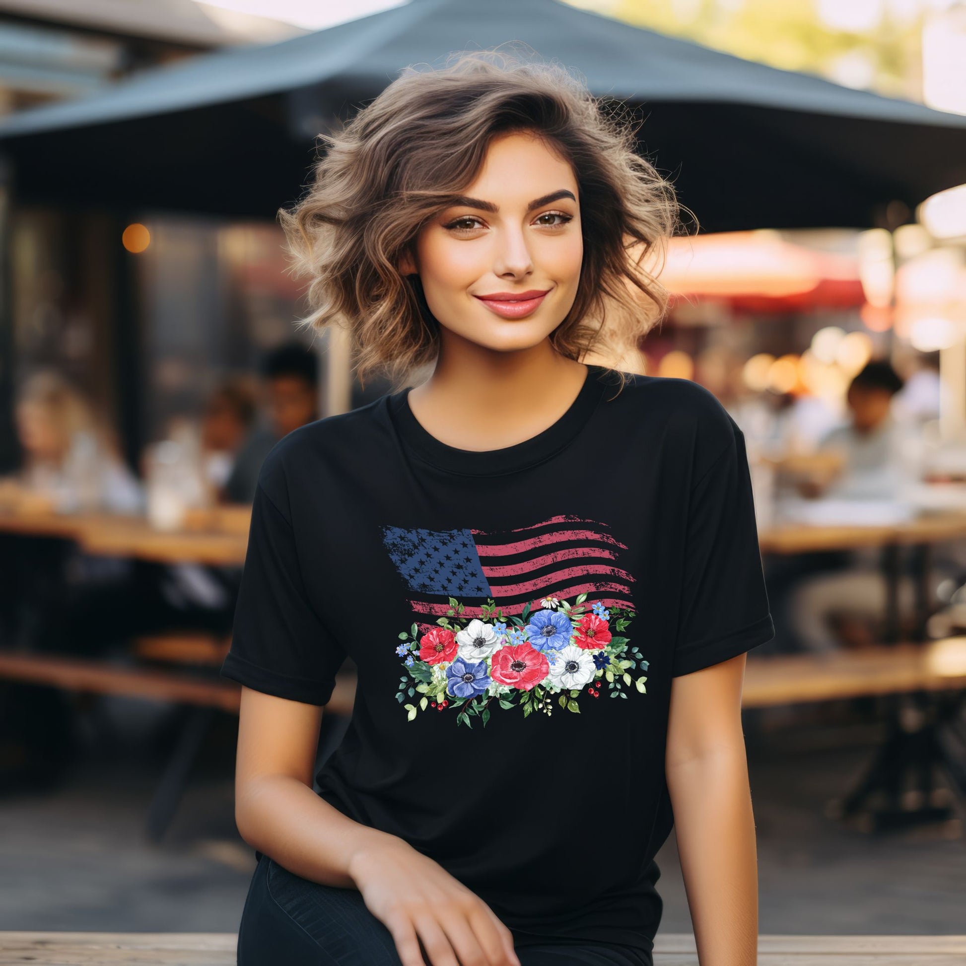 Show your love for the USA with a fresh and stylish twist in this Floral American Flag T-Shirt! This unique design features a classic American flag accented with beautiful flowers along the bottom, blending patriotic pride with a soft, artistic touch. Perfect for 4th of July parties, Memorial Day events, Veterans Day, or simply expressing your American spirit year-round. Crafted from soft, breathable fabric for a comfortable fit, this floral flag tee is great for women, men, and anyone who loves mixing patriotic vibes with floral beauty. Makes a thoughtful gift for proud Americans, flower lovers, and free spirits alike!