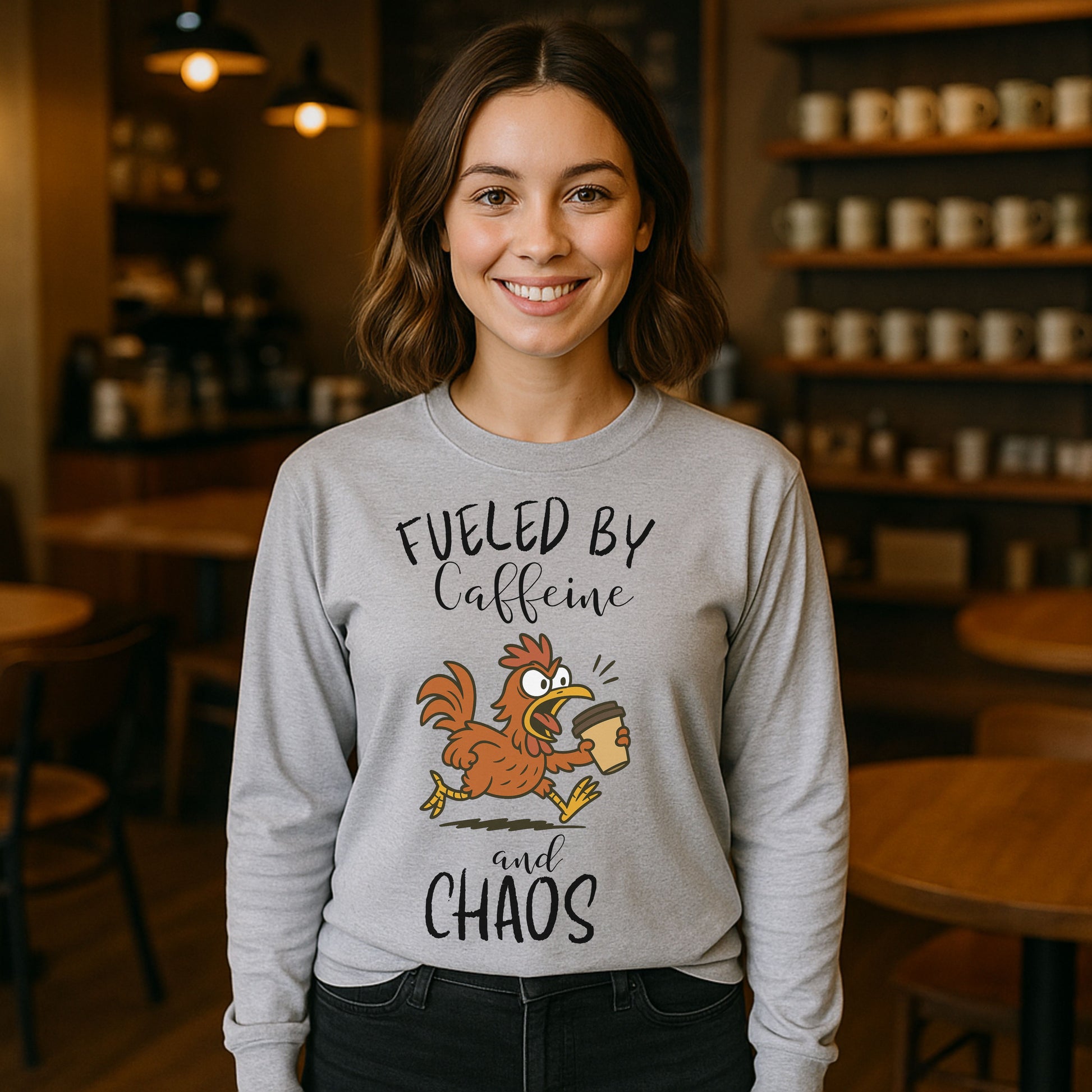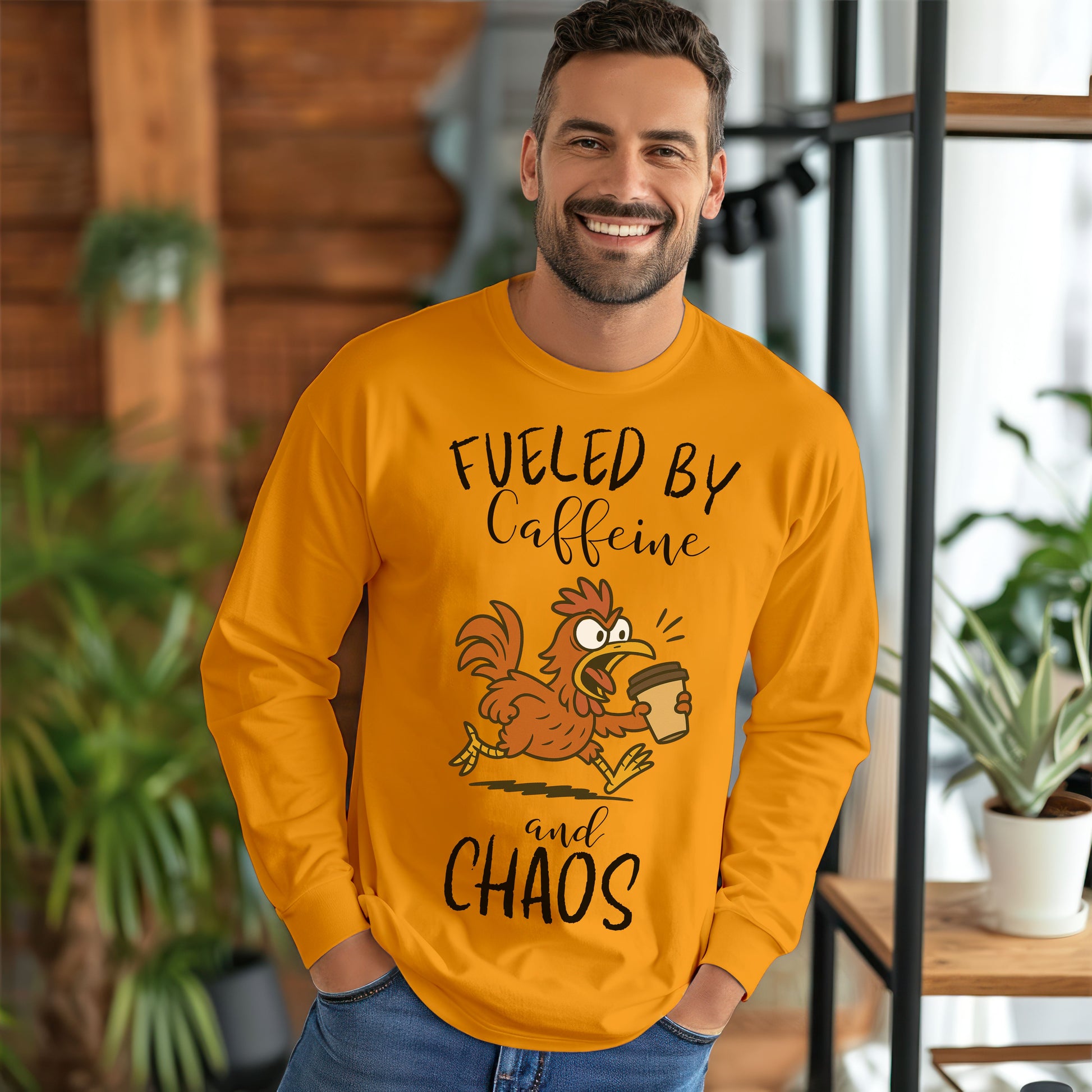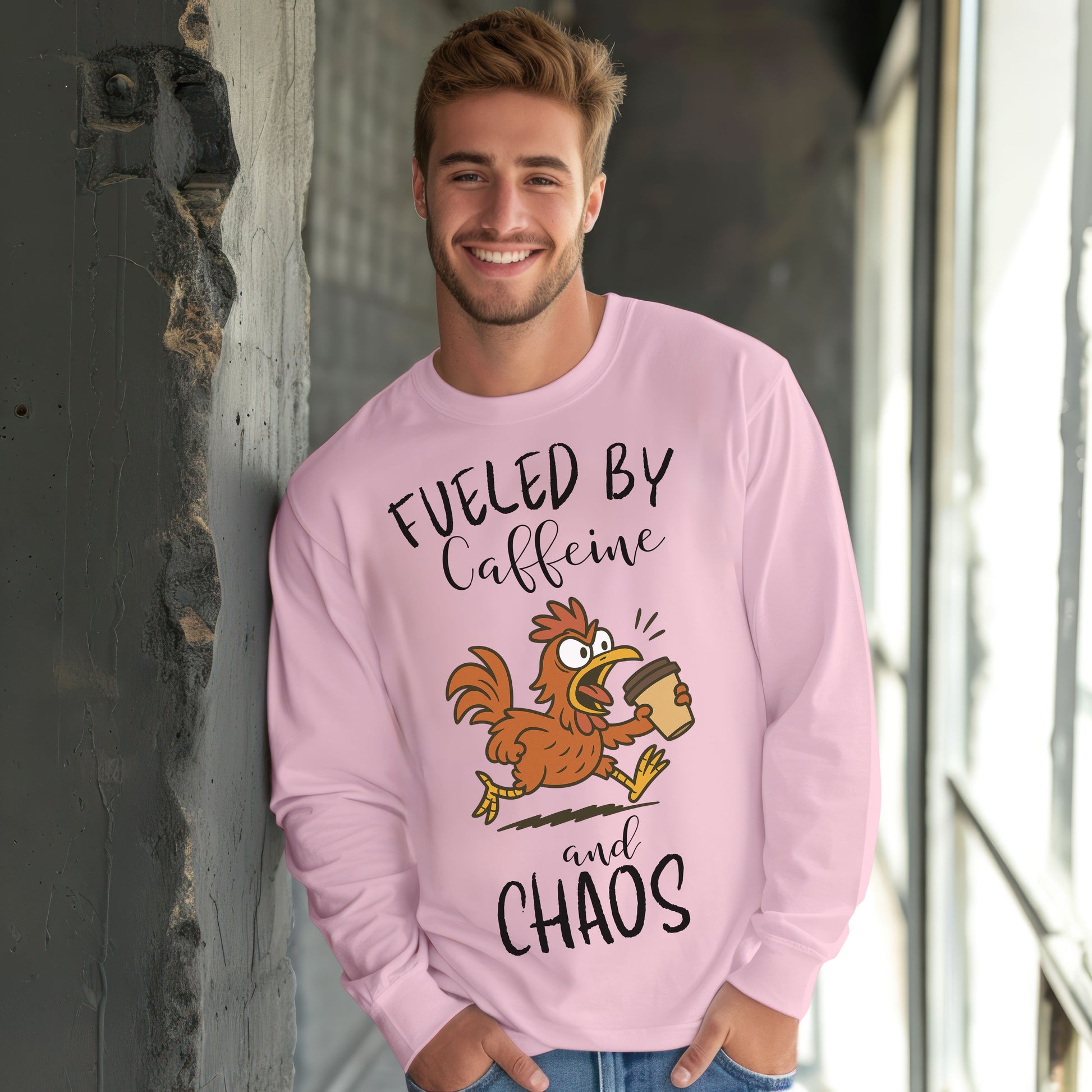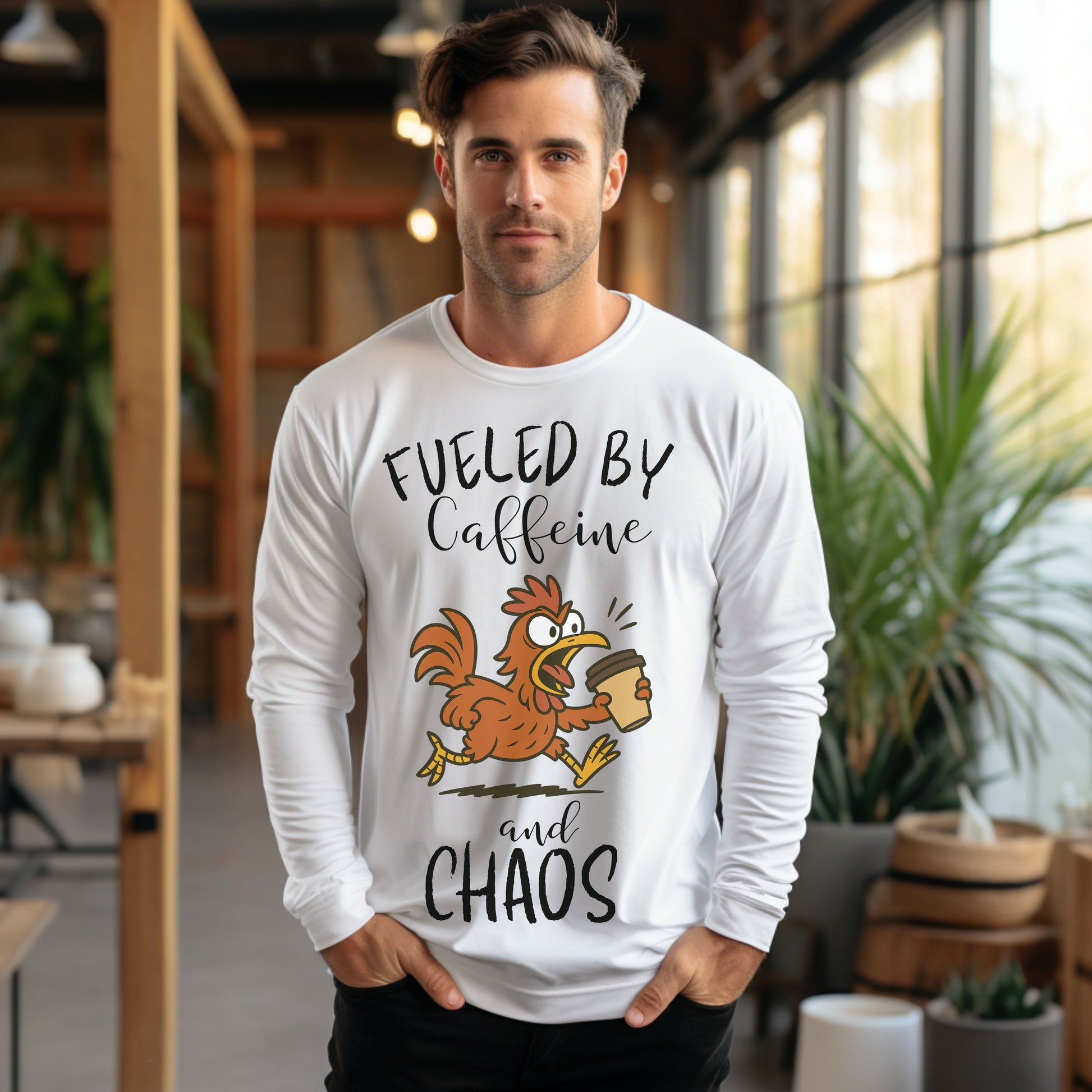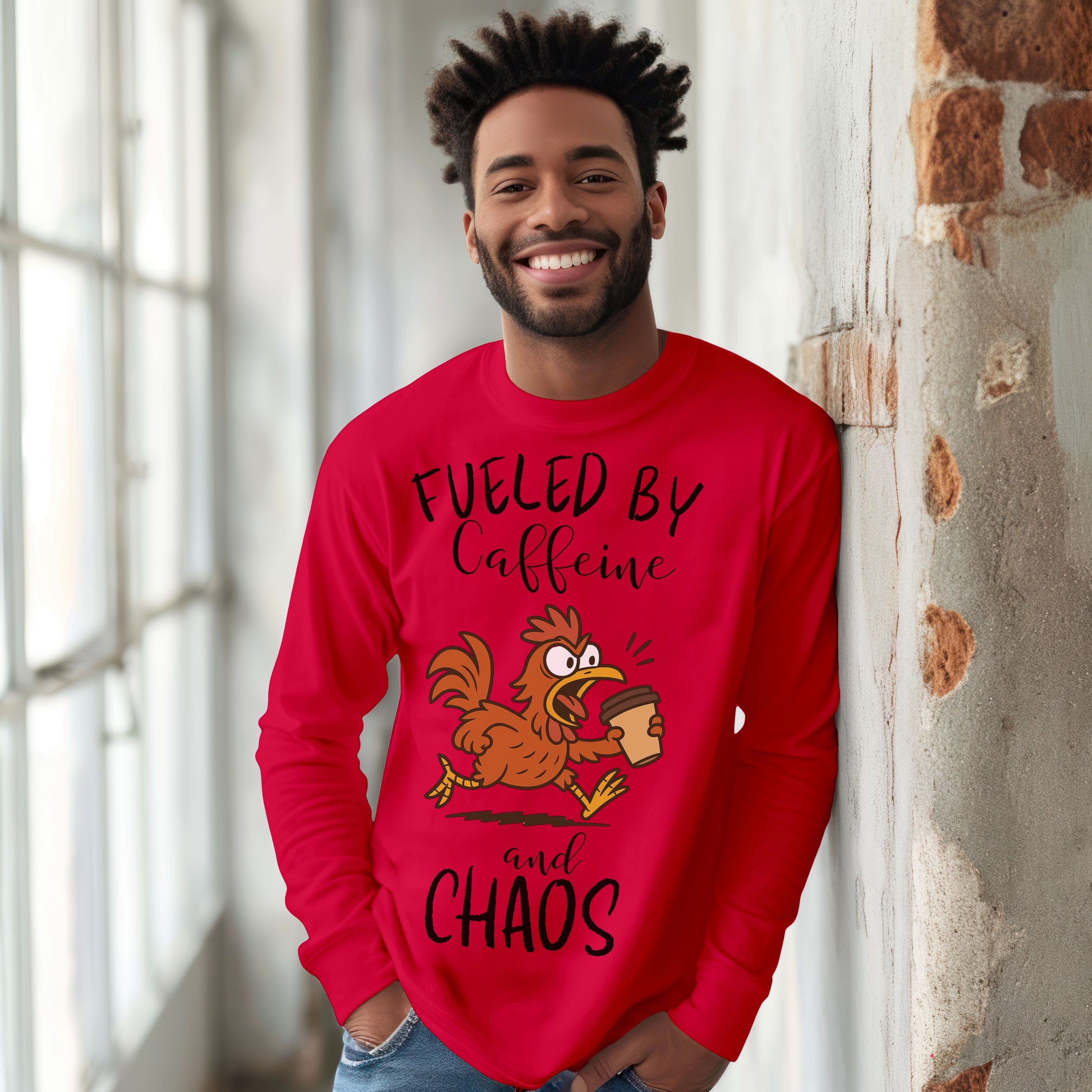 Fueled by Caffeine and Chaos Chicken Long Sleeve T-Shirt – Funny Coffee Hen Tee for Animal Lovers
