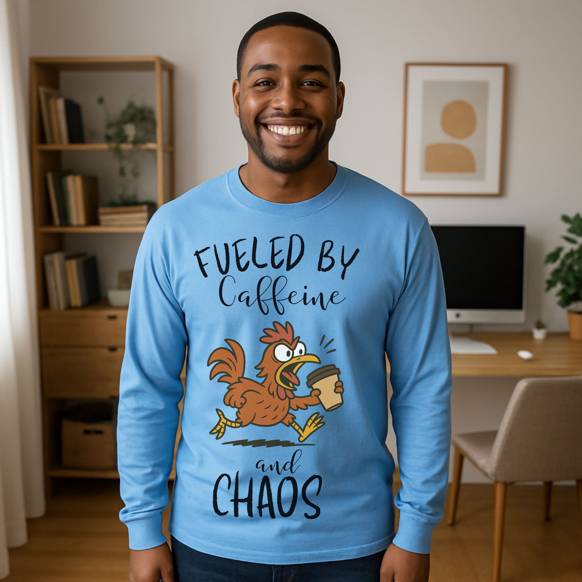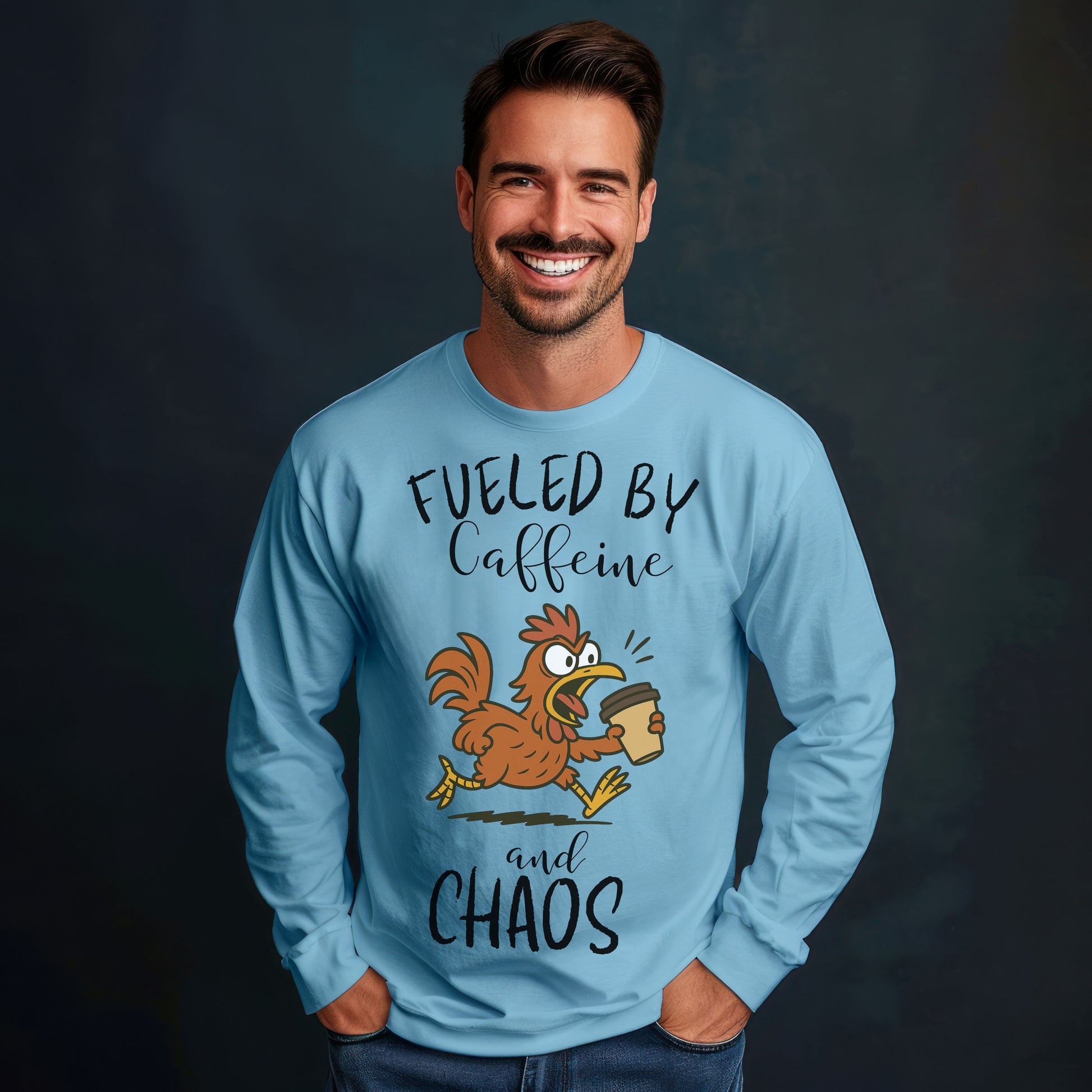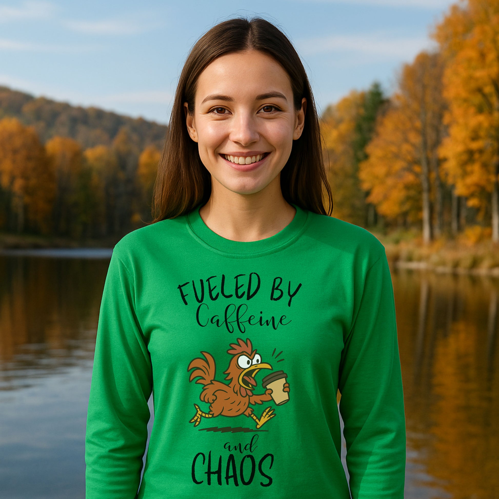 Start your mornings in full strut with our “Fueled by Caffeine and Chaos” chicken long sleeve t-shirt! Featuring a frazzled cartoon hen sprinting with a to-go coffee cup, this quirky design perfectly captures that frantic, first-cup energy. Printed on a soft green cotton tee, it's a must-have for anyone who lives life on the edge of espresso and poultry panic.