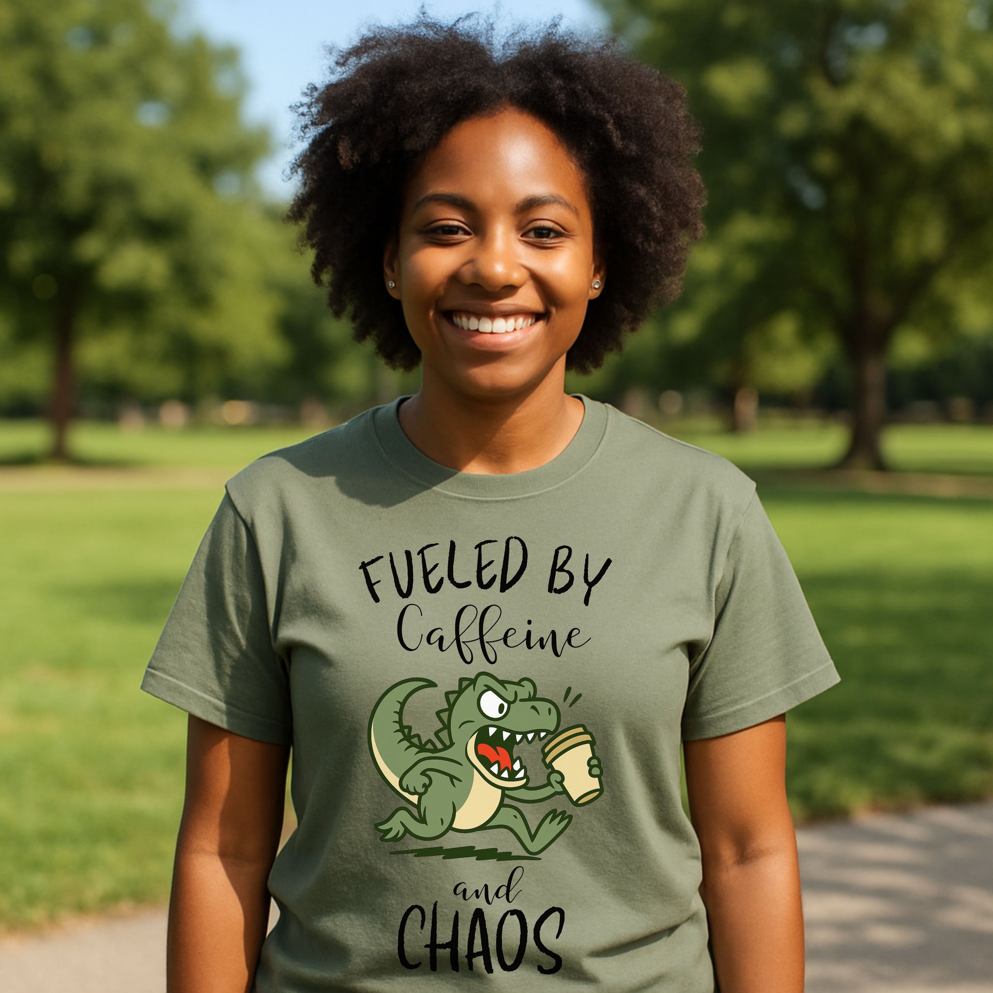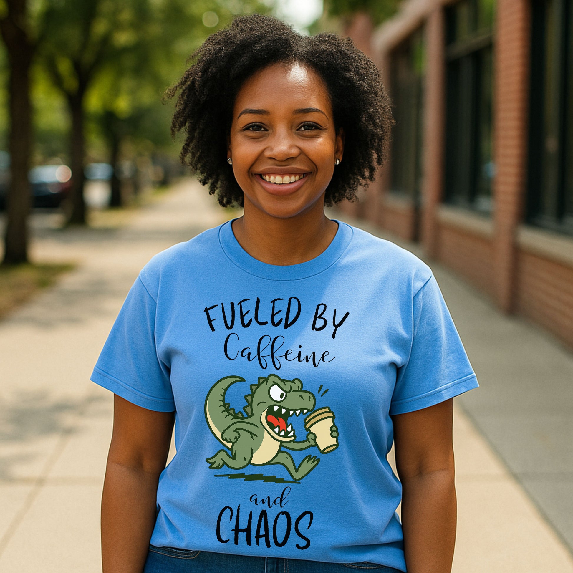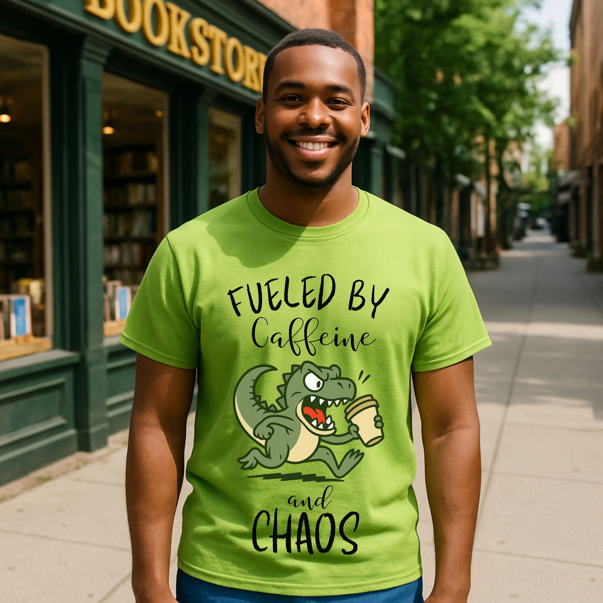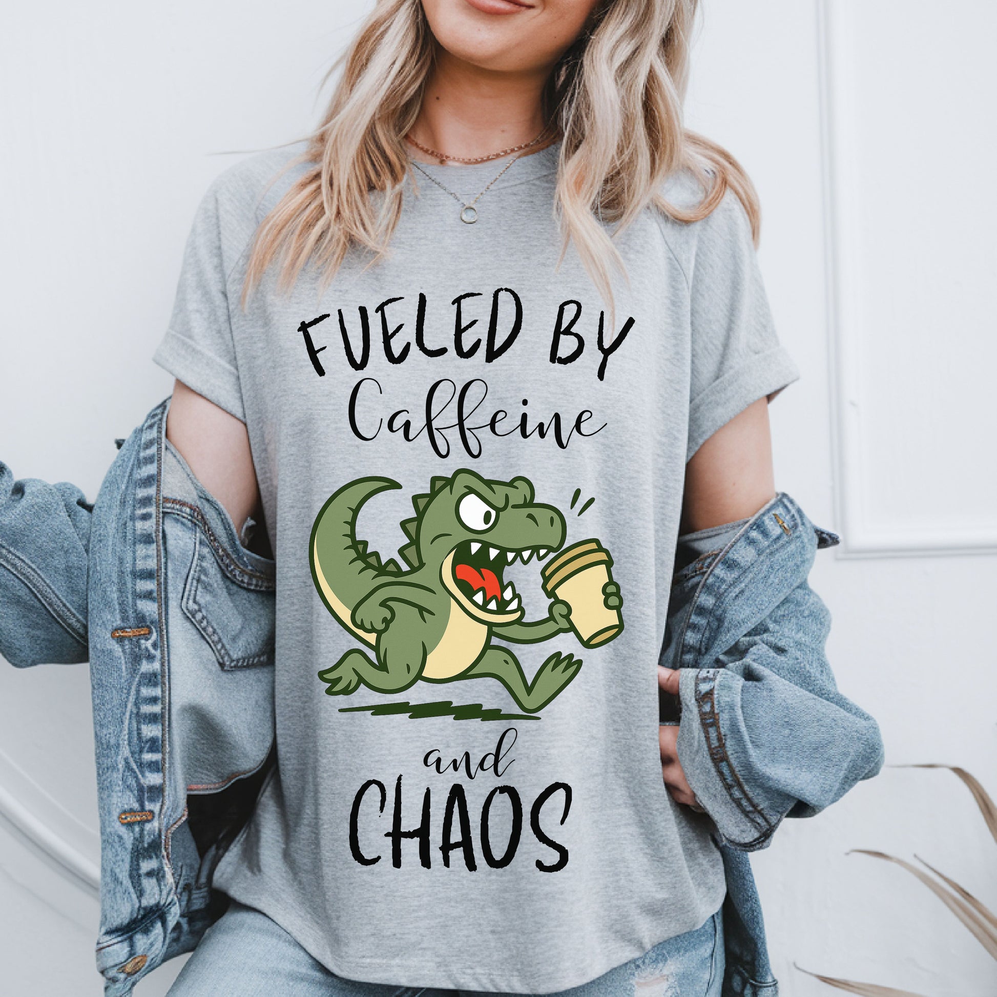 Fueled by Caffeine and Chaos Dinosaur T-Shirt – Funny Coffee T-Rex Tee for Caffeine Addicts