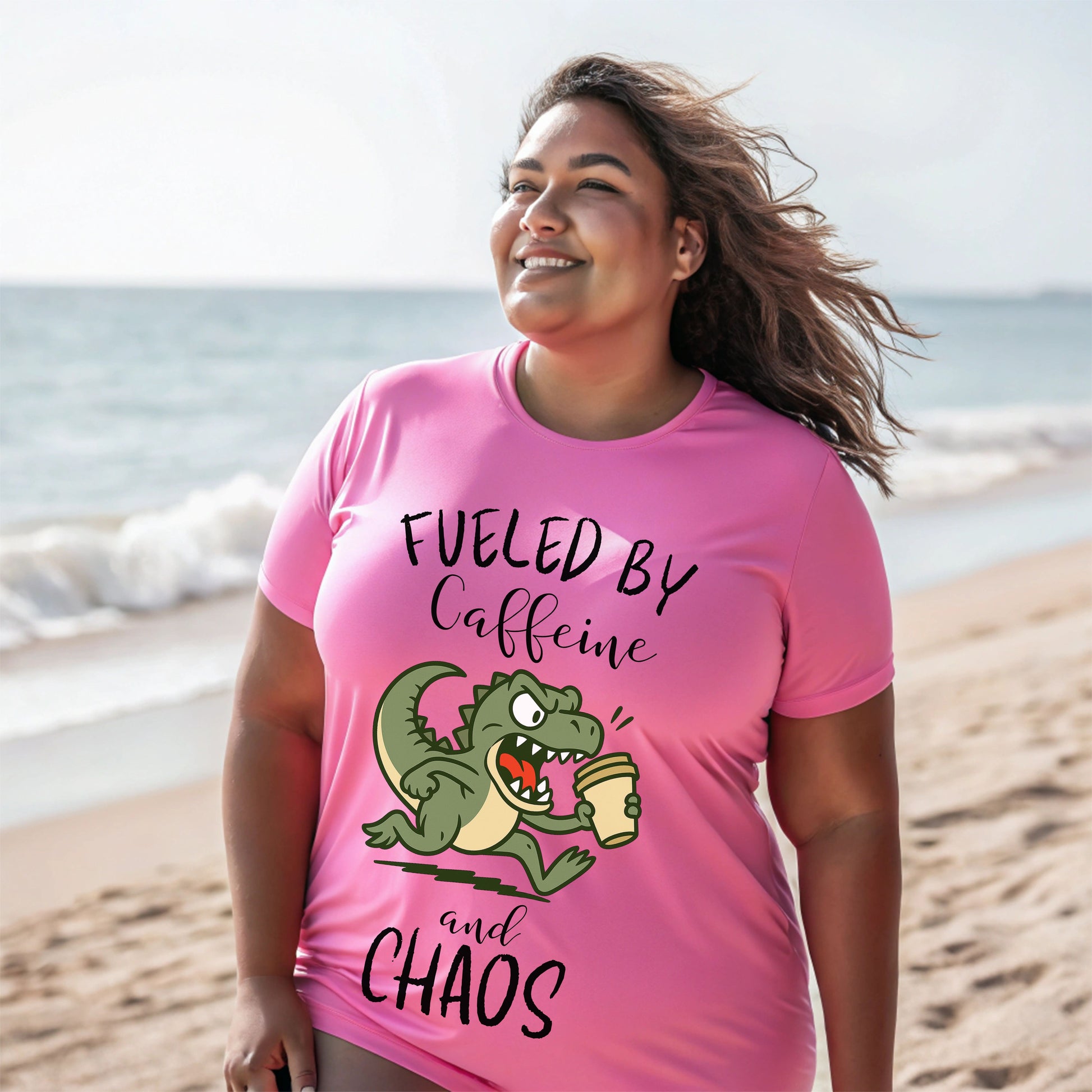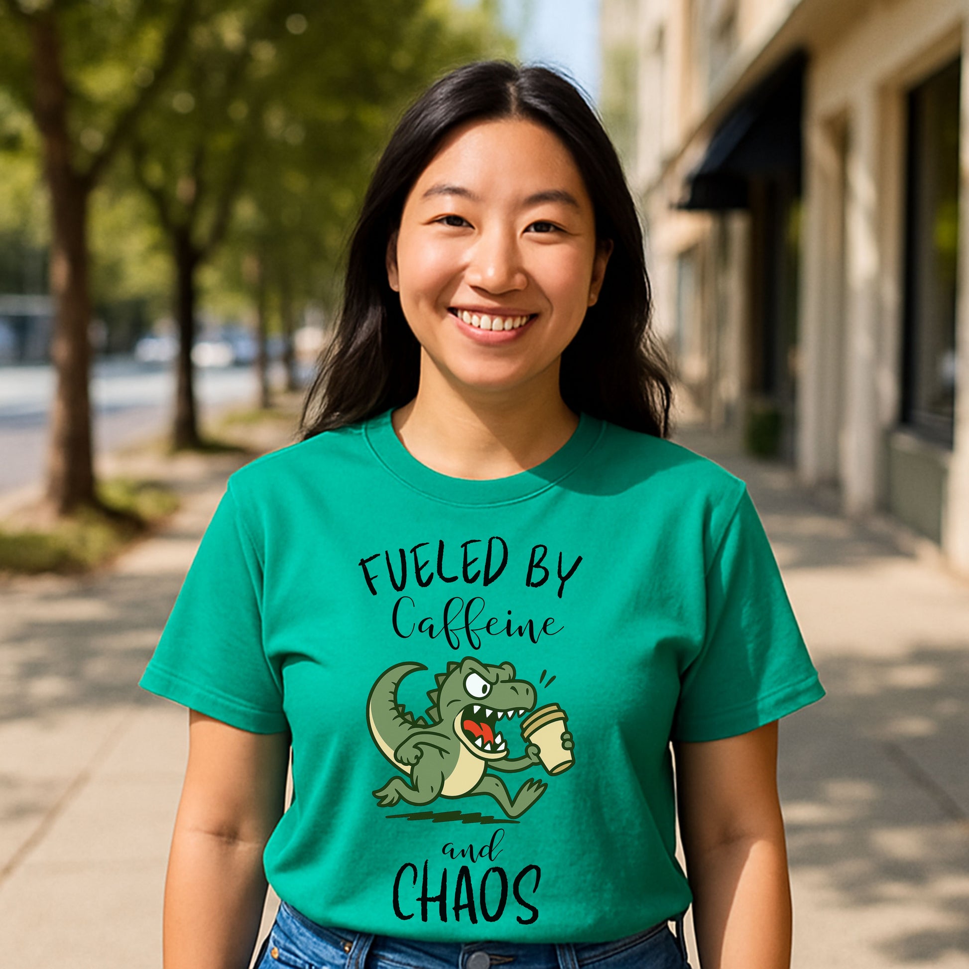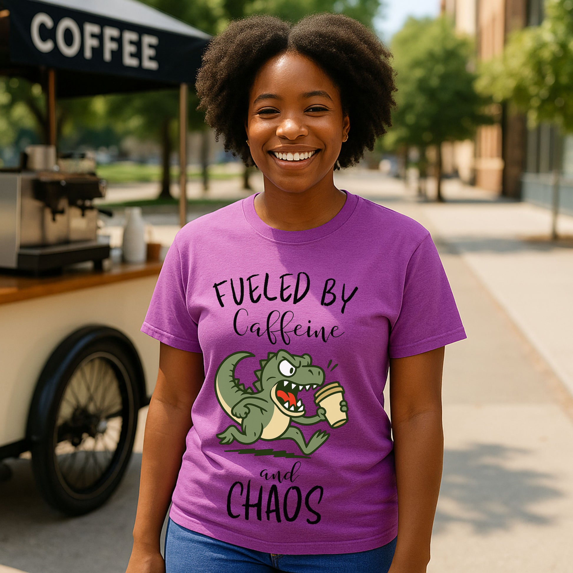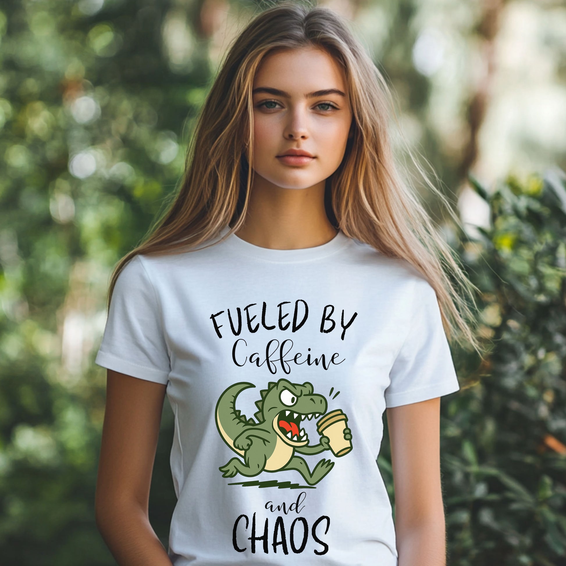 Fueled by Caffeine and Chaos Dinosaur T-Shirt – Funny Coffee T-Rex Tee for Caffeine Addicts