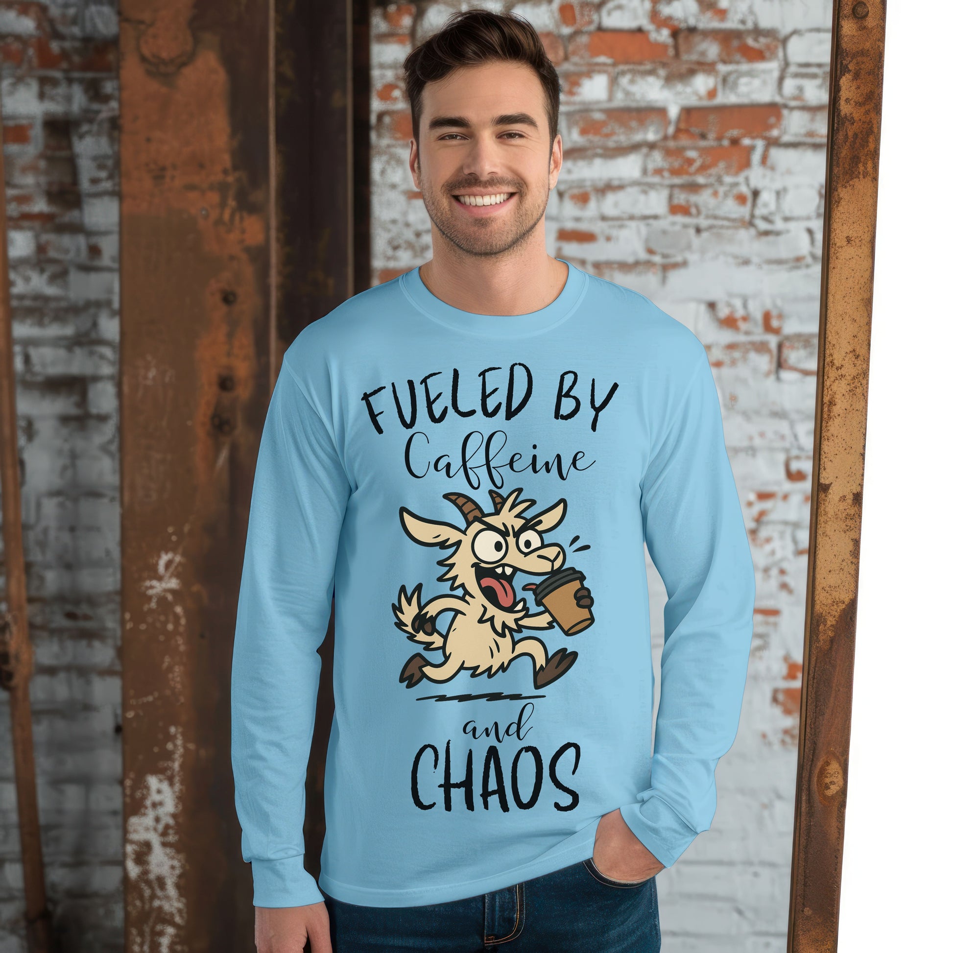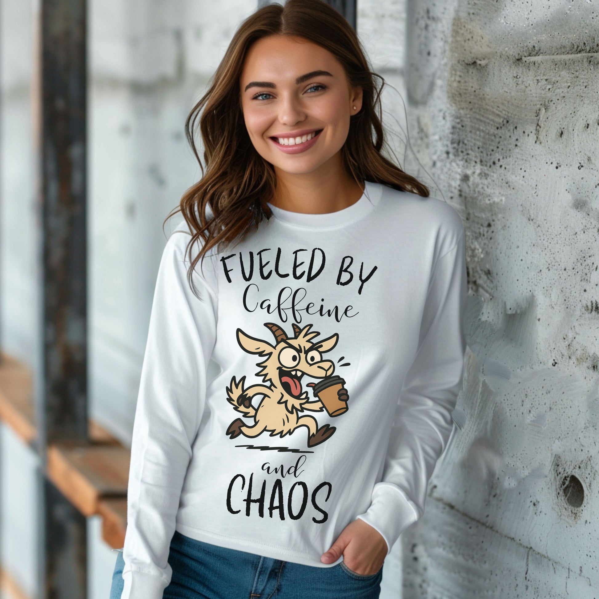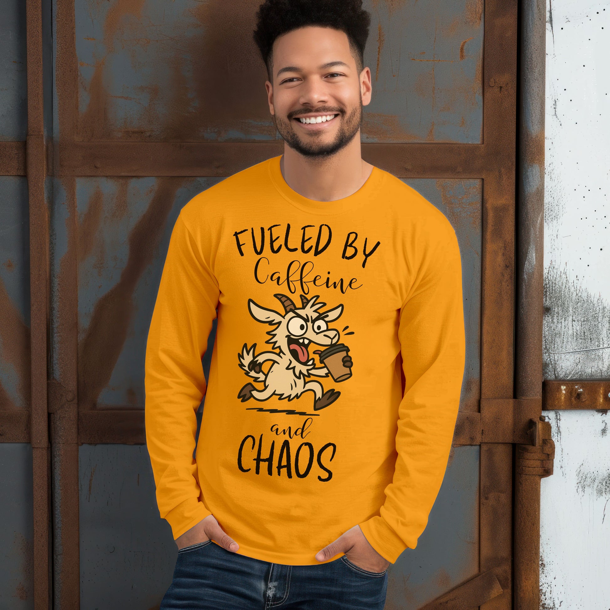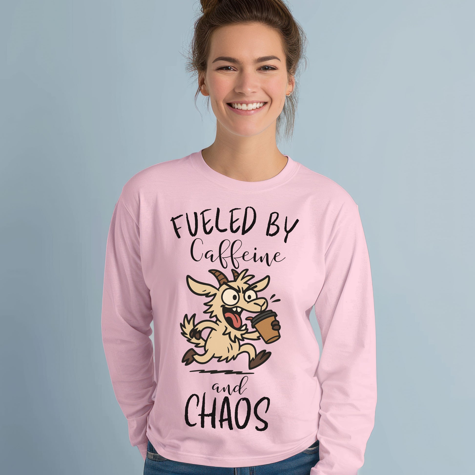 Fueled by Caffeine and Chaos Goat Long Sleeve T-Shirt – Funny Coffee Farm Animal Tee for Goat Lovers