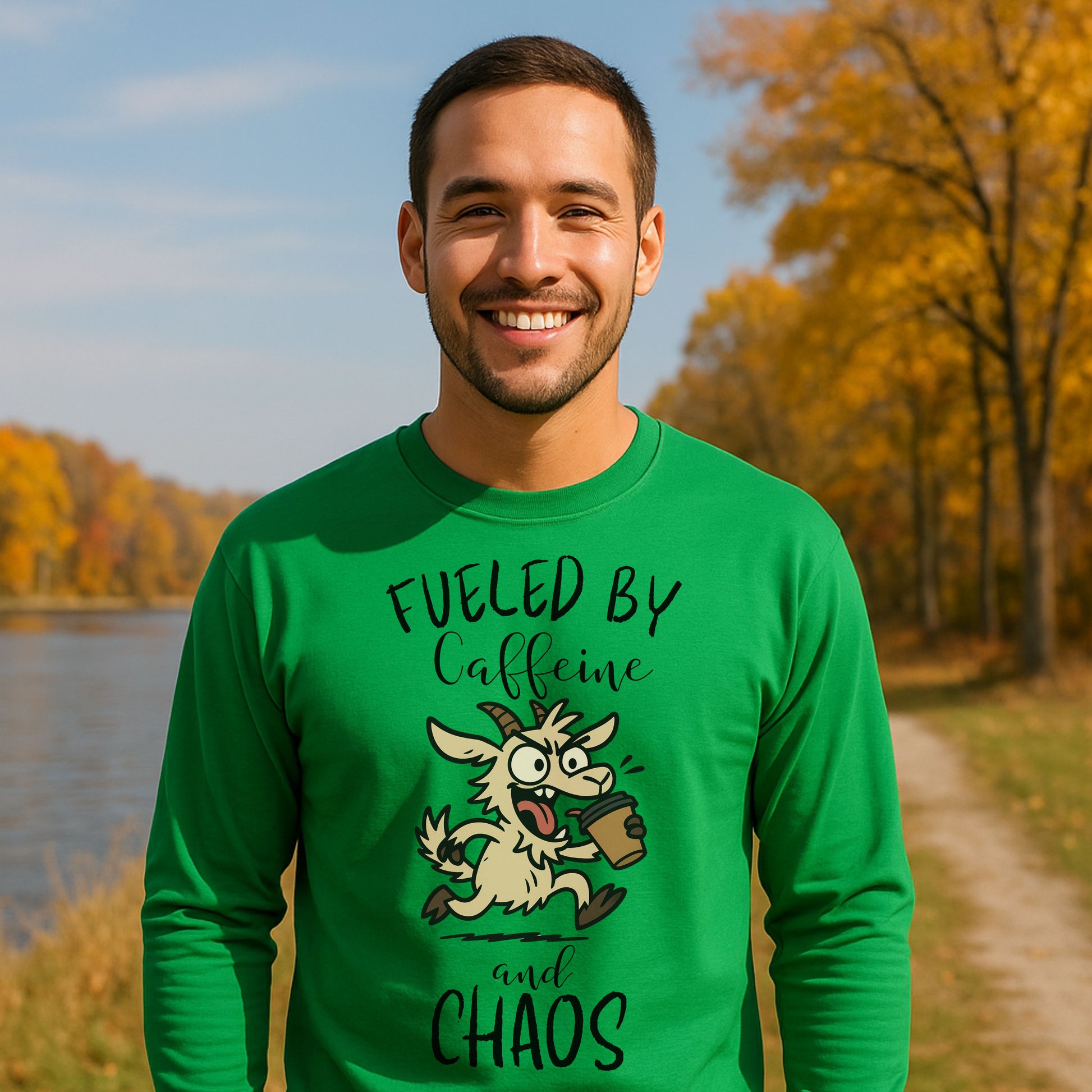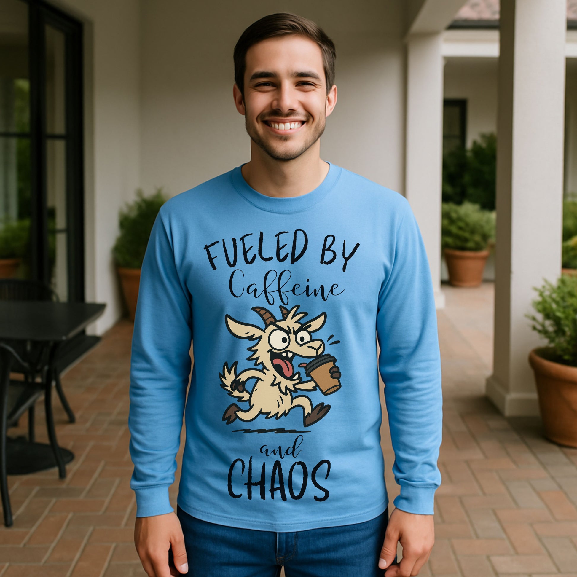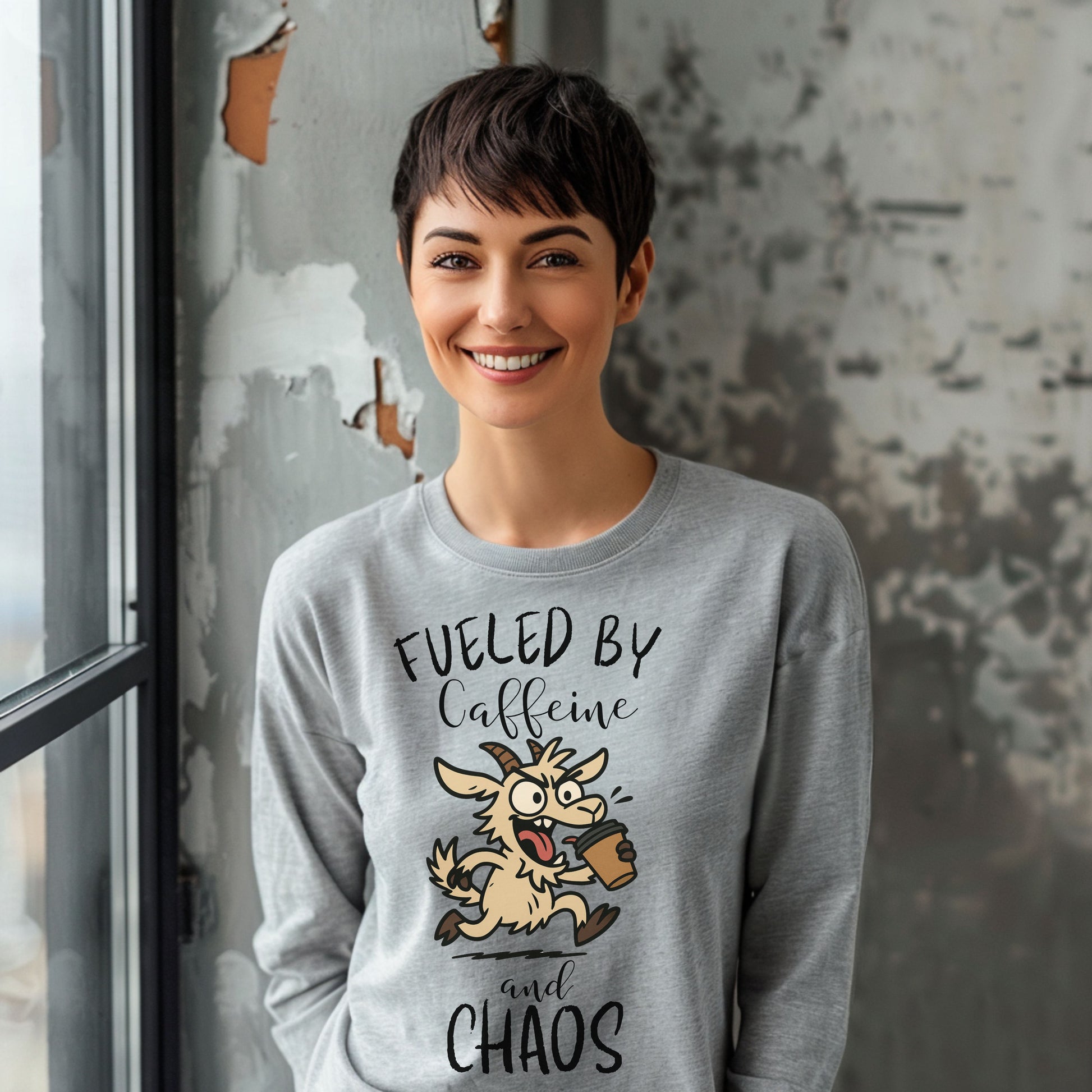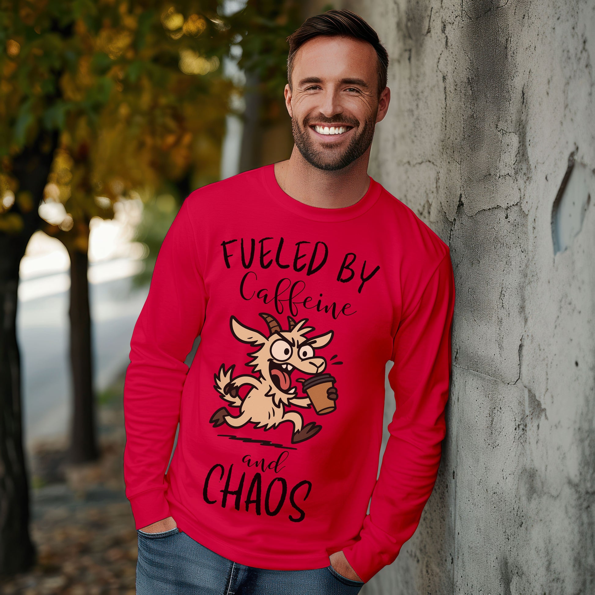 Fueled by Caffeine and Chaos Goat Long Sleeve T-Shirt – Funny Coffee Farm Animal Tee for Goat Lovers