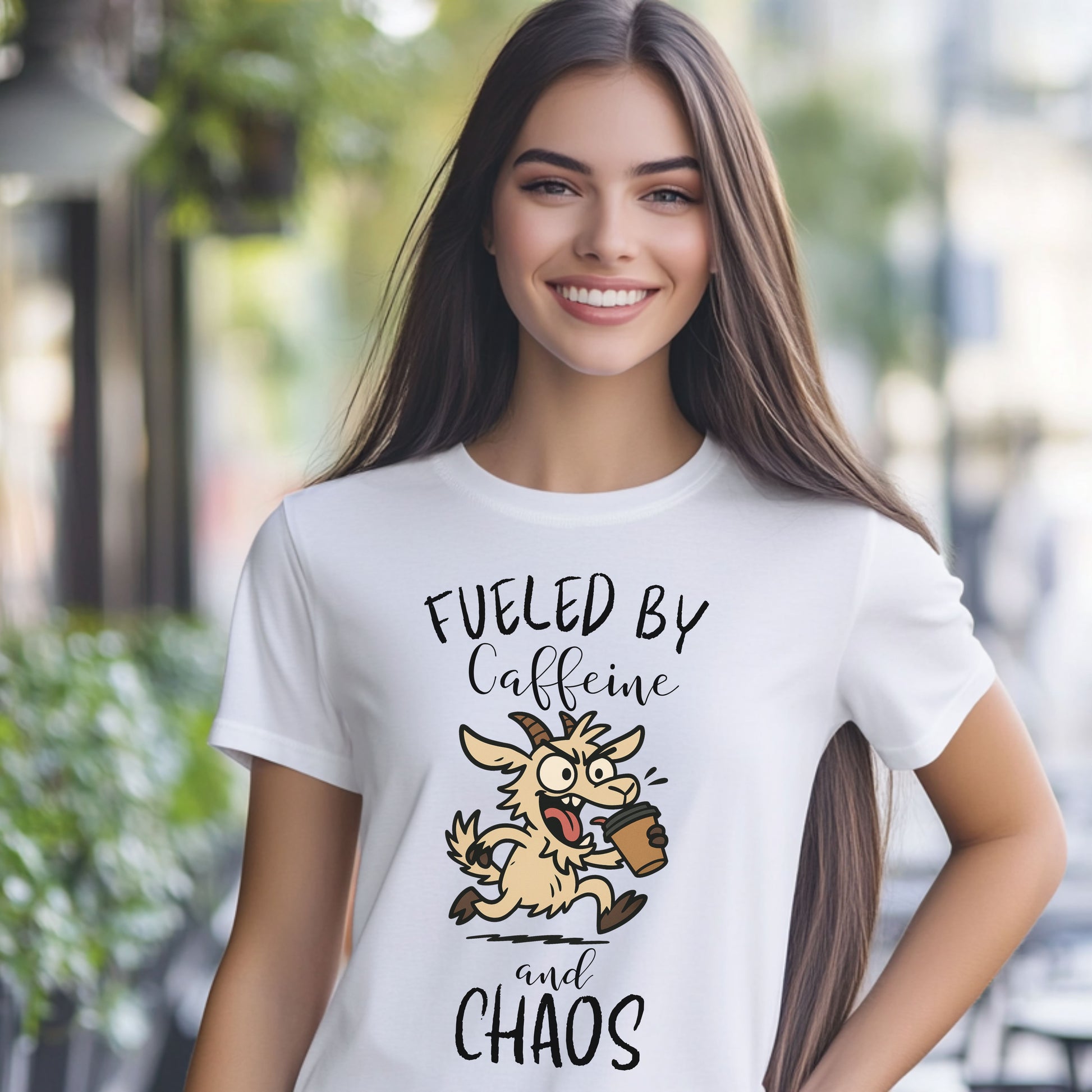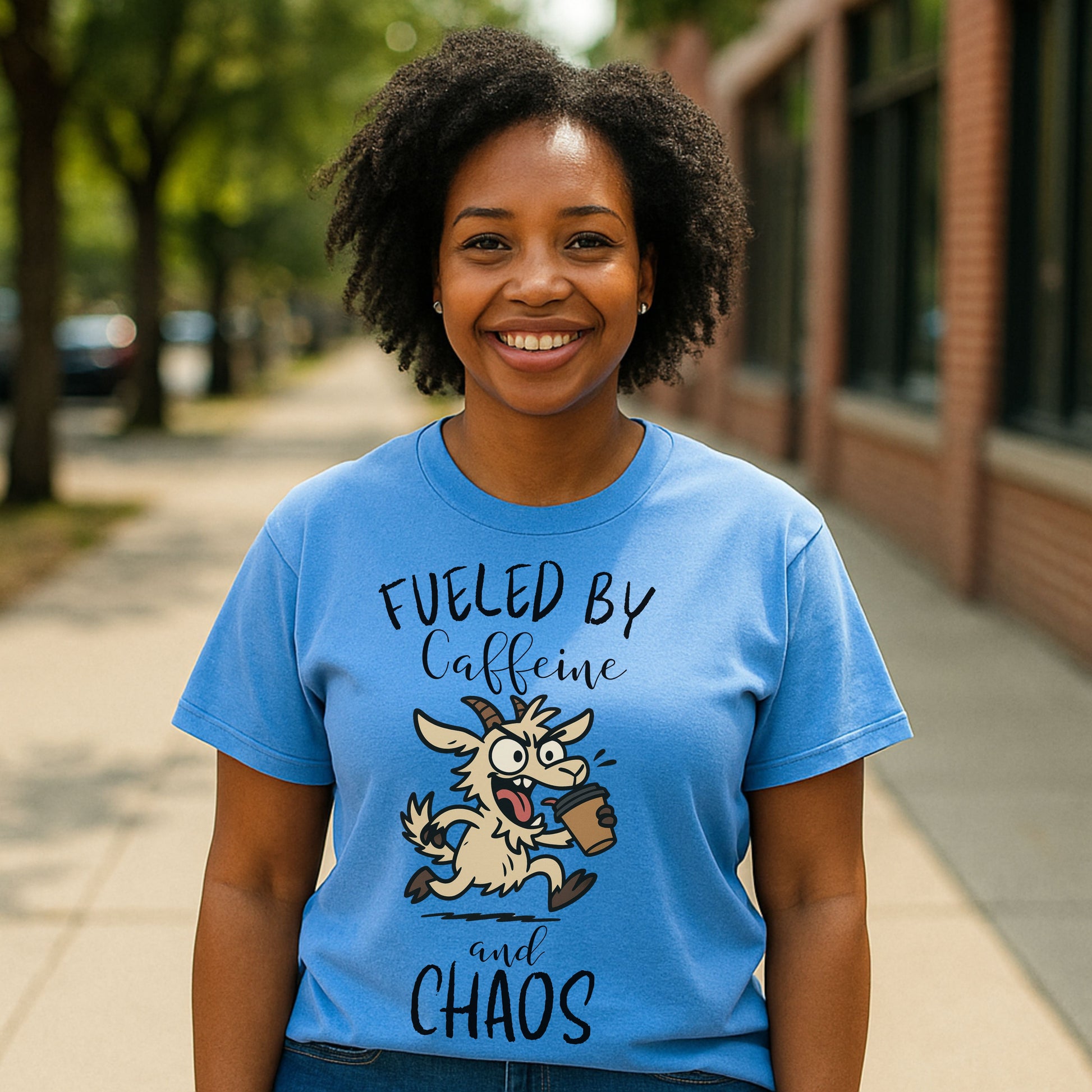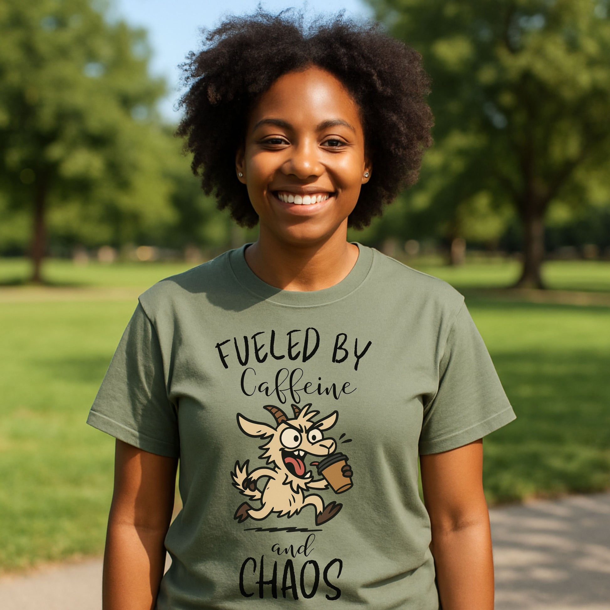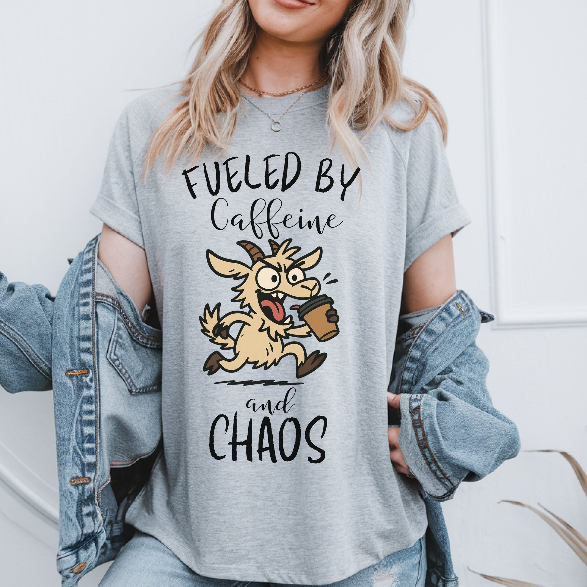Fueled by Caffeine and Chaos Goat T-Shirt – Funny Coffee Farm Animal Tee for Goat Lovers