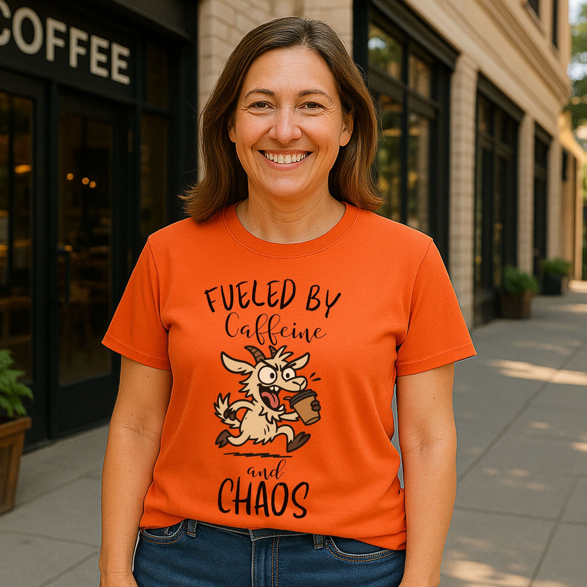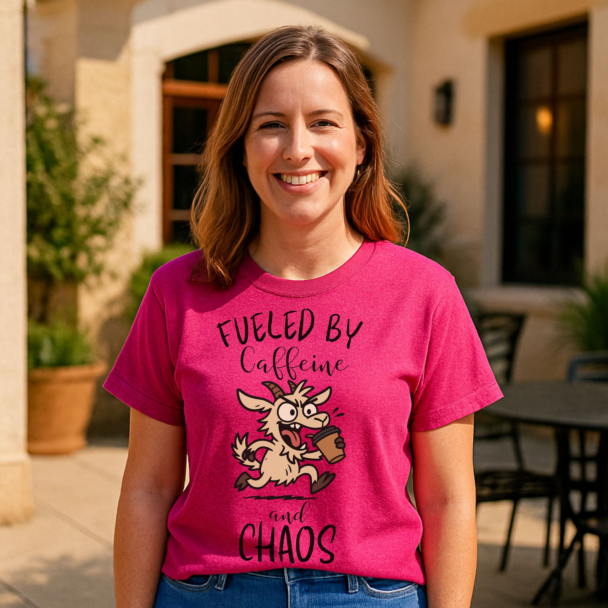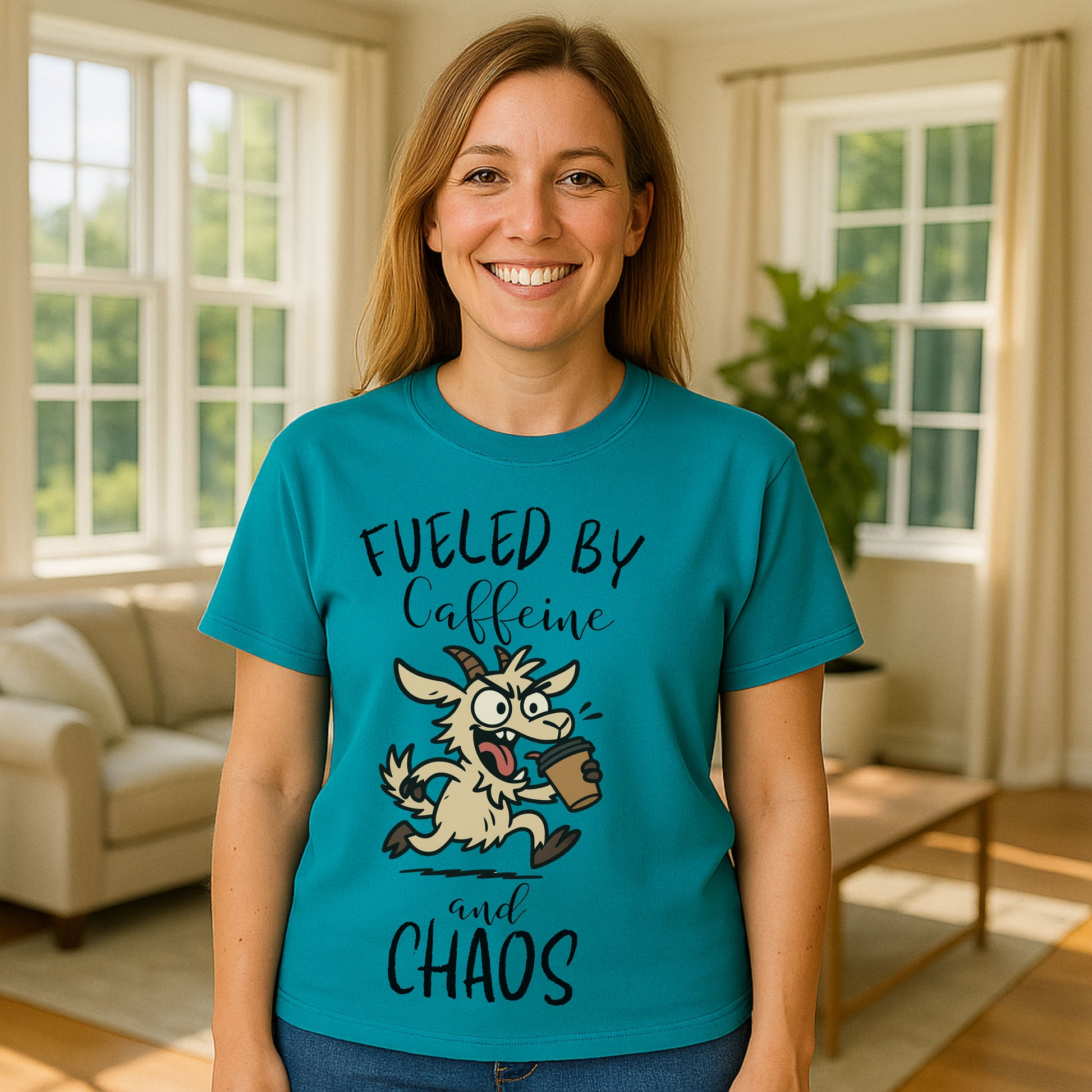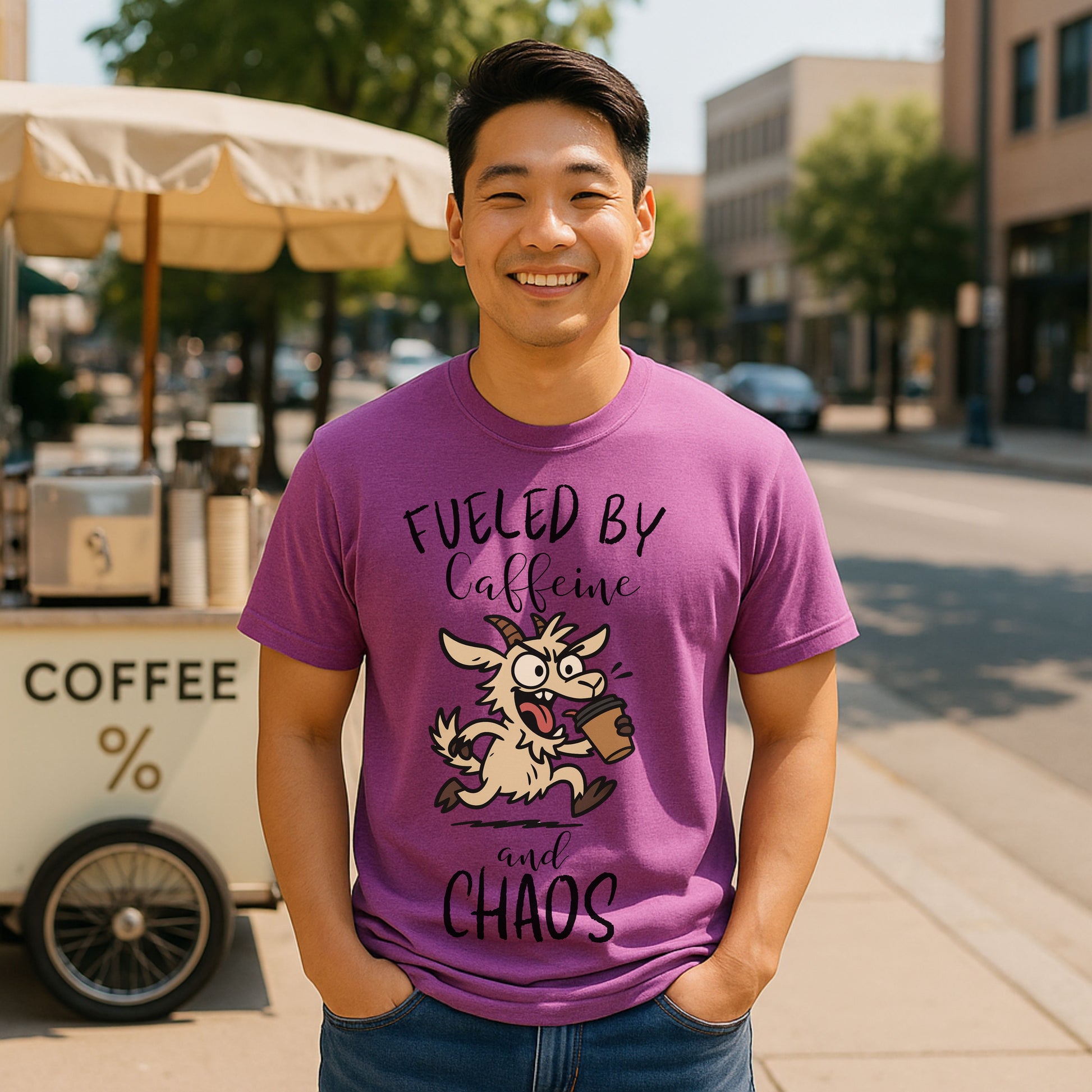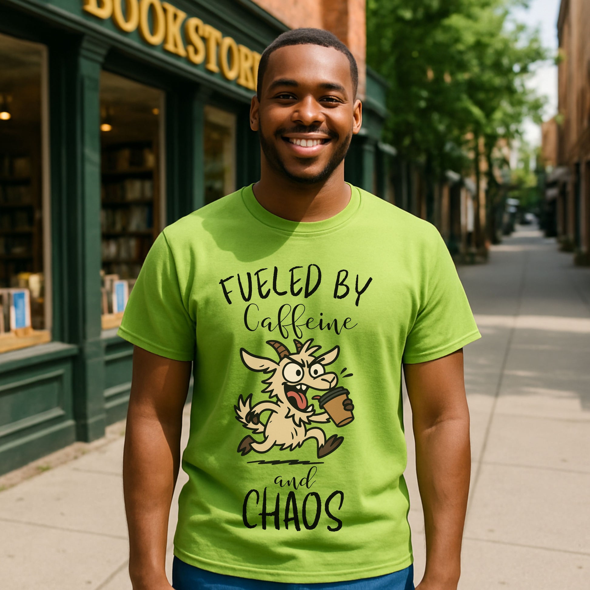 Fueled by Caffeine and Chaos Goat T-Shirt – Funny Coffee Farm Animal Tee for Goat Lovers
