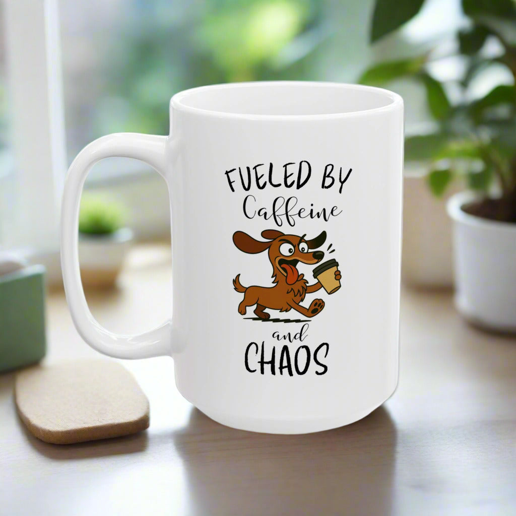 Fueled by Caffeine and Chaos Mug – Funny Dachshund Coffee Cup for Dog Lovers