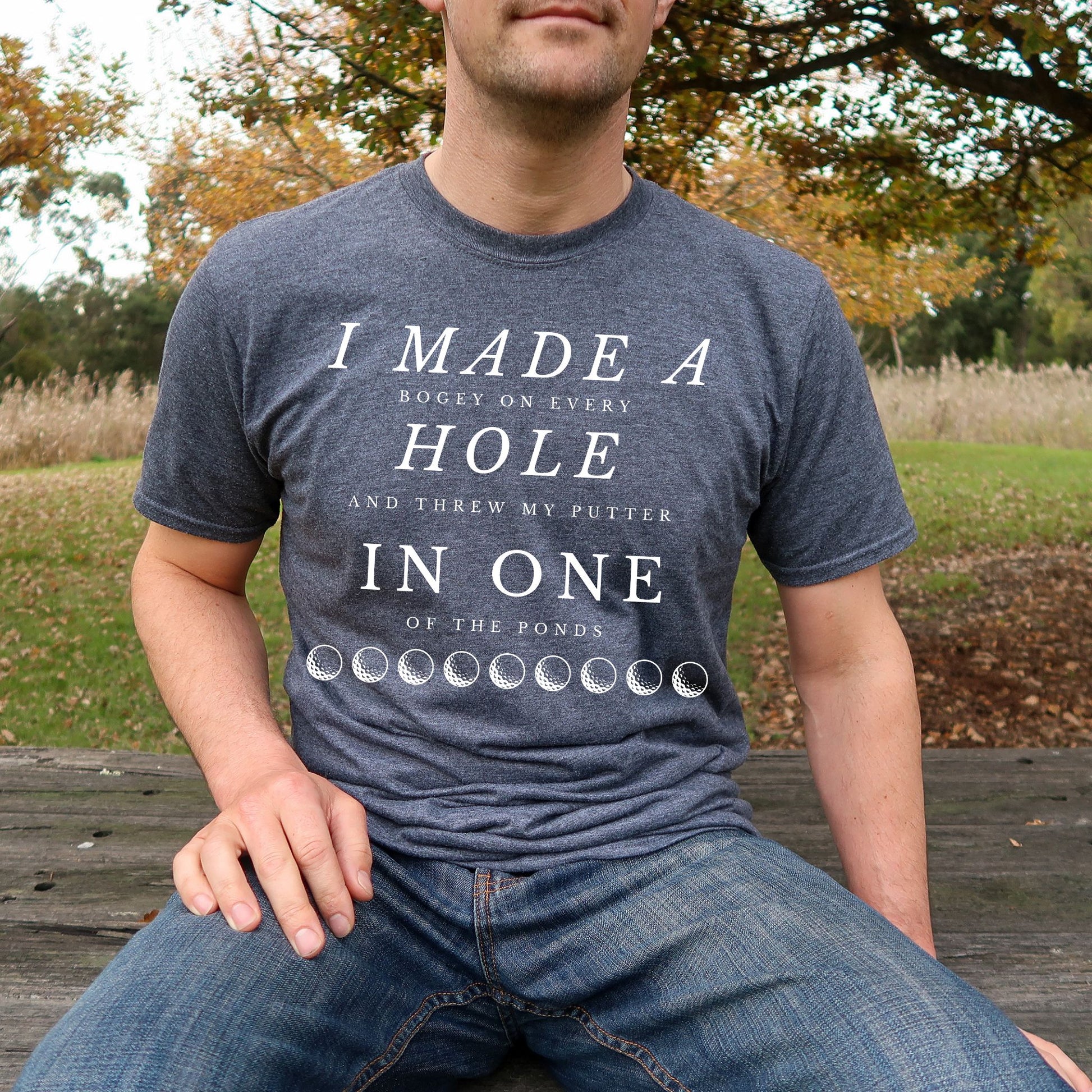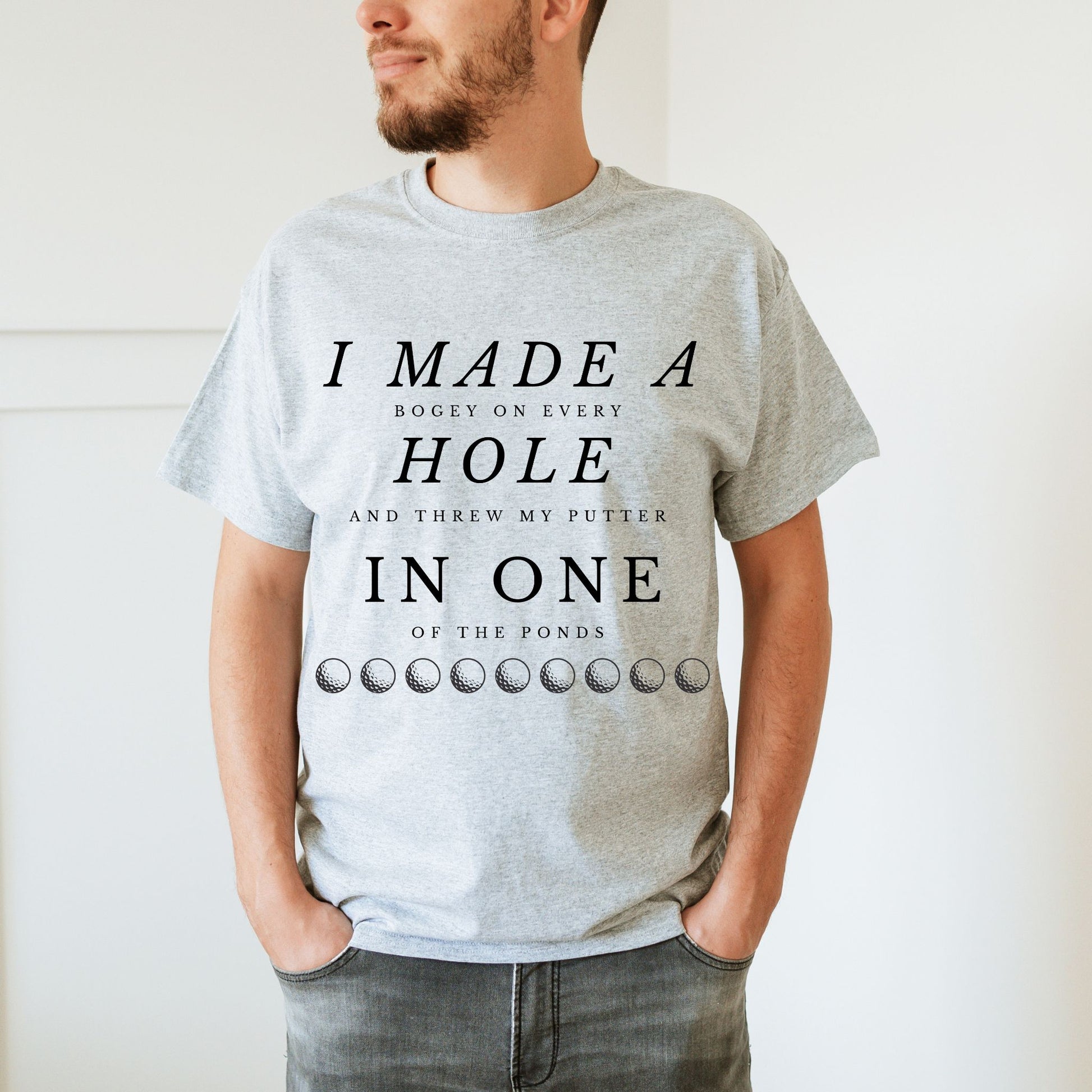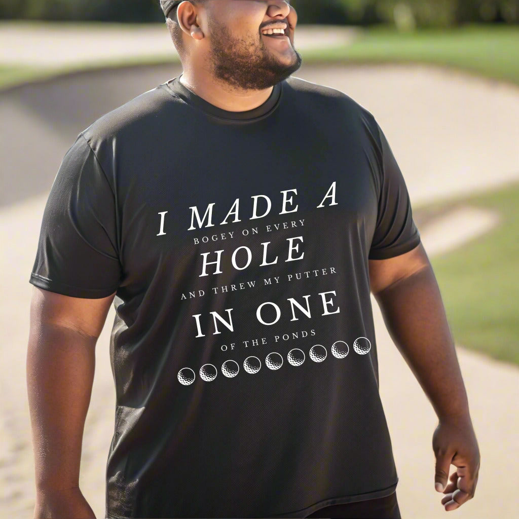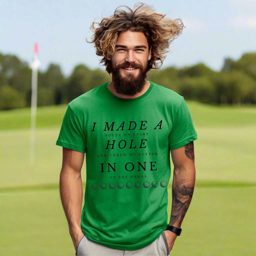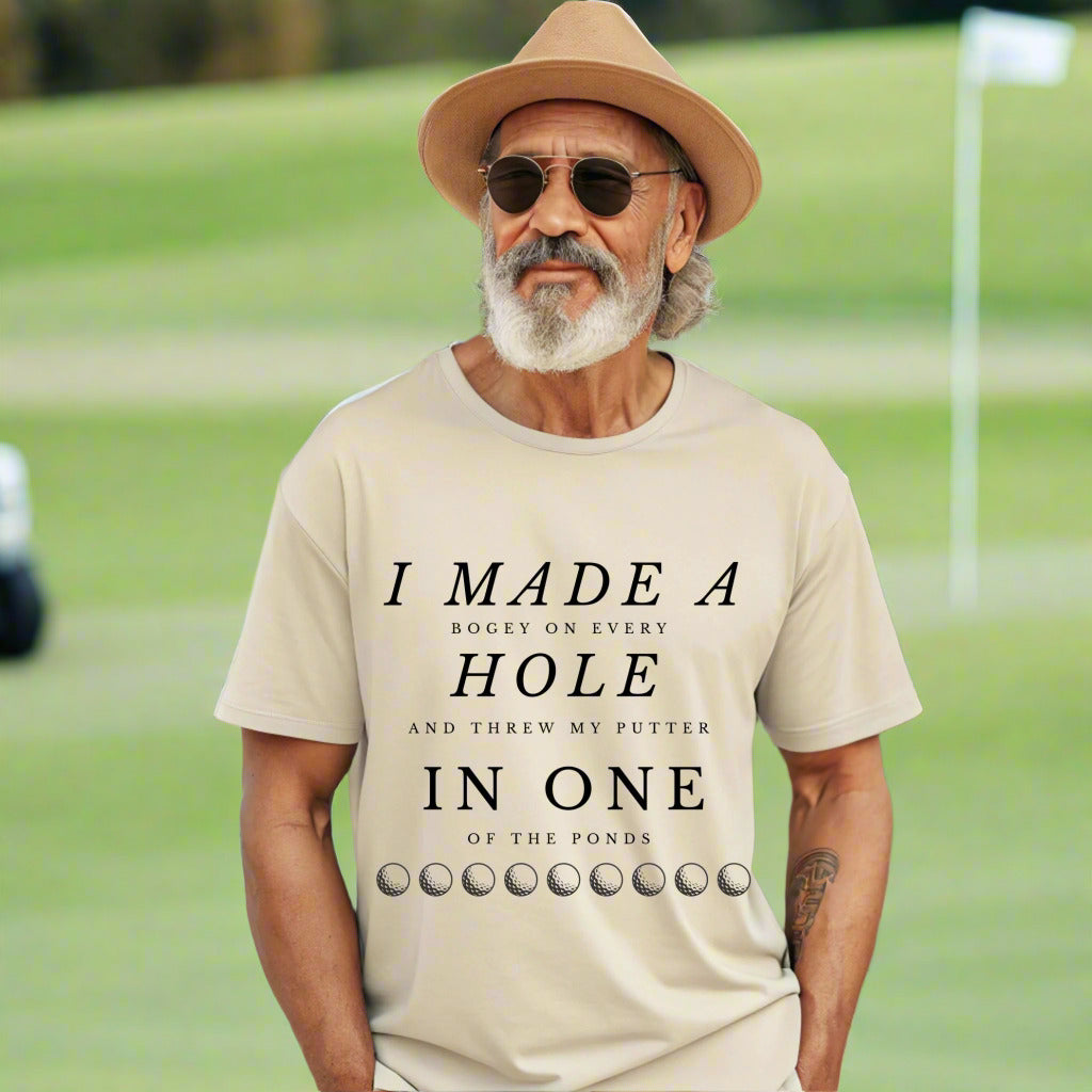 Tee off with a laugh in this hilarious golf t-shirt that reads: "I Made a Bogey on Every Hole and Threw My Putter in One of the Ponds." Whether you're a weekend warrior or a seasoned slicer, this tee is perfect for golfers who know the struggle all too well. Ideal for casual rounds, clubhouse laughs, or as a funny gift for golf dads, buddies, or tournament prizes.