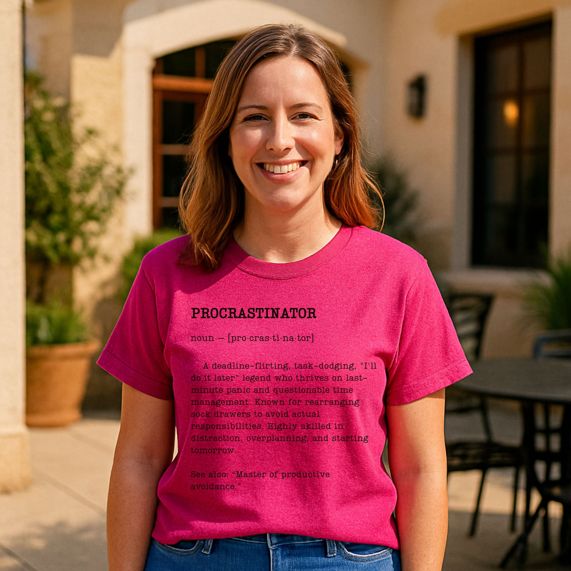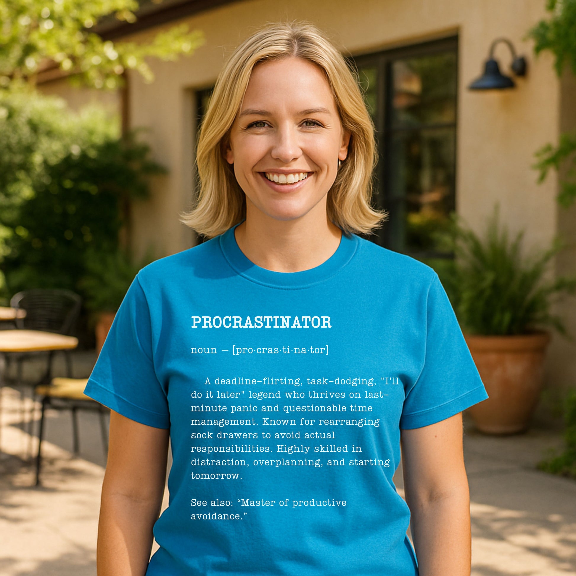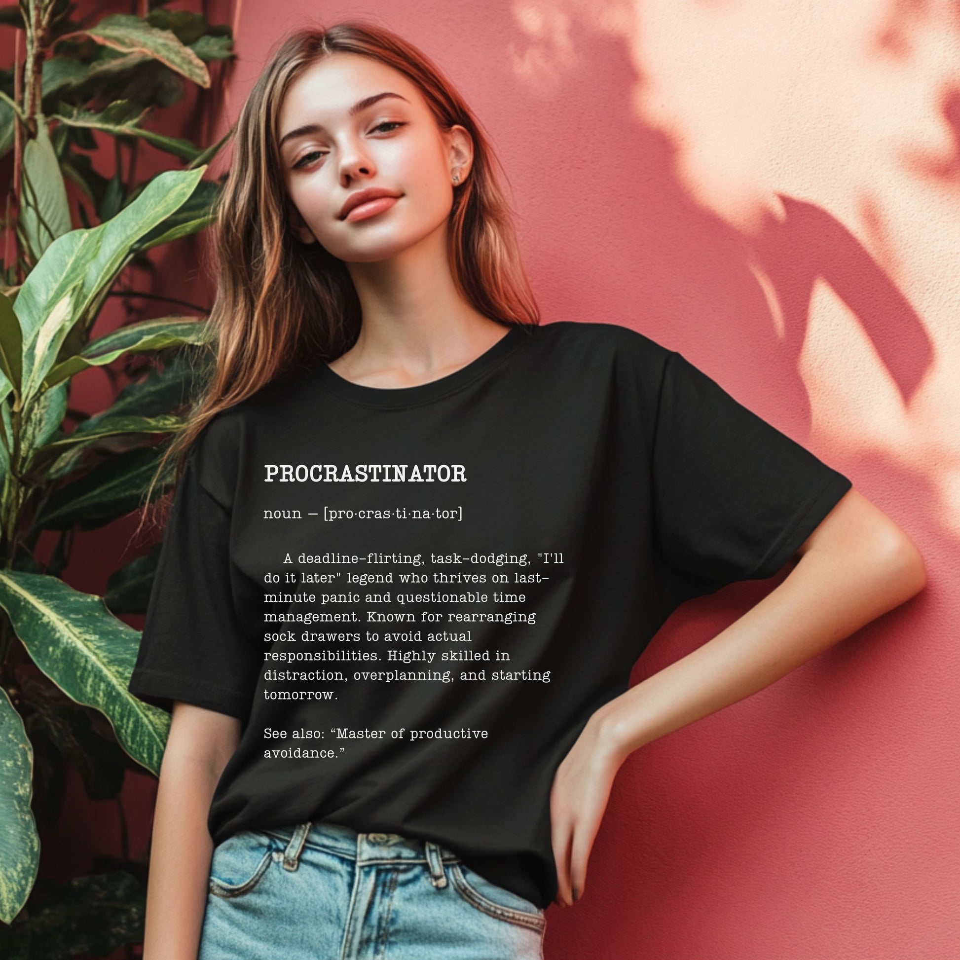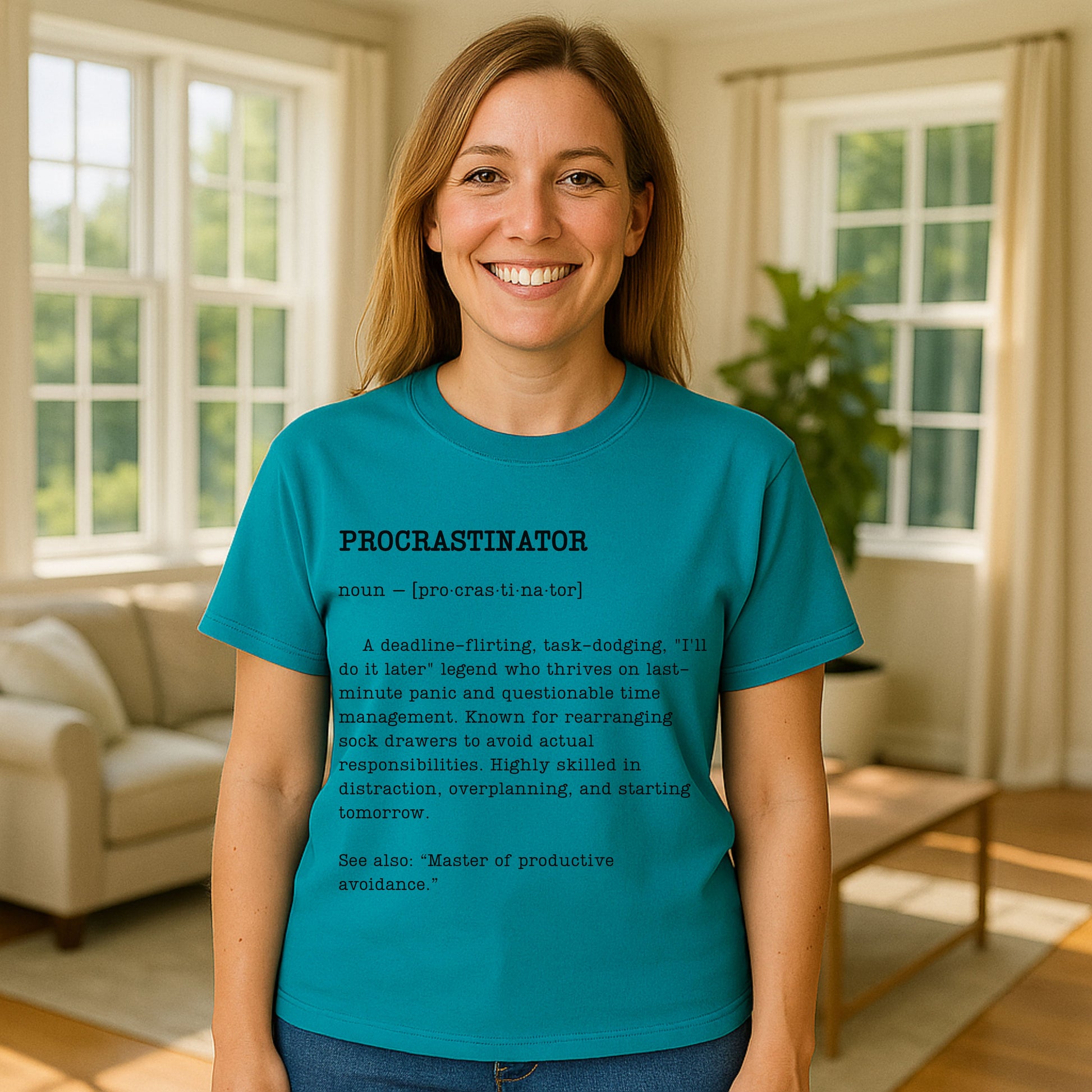 Celebrate the art of last-minute brilliance with this Procrastinator Definition T-Shirt. Featuring a witty faux-dictionary design, this unisex tee is perfect for overthinkers, deadline dancers, and anyone who thrives under pressure (or claims to). Made from soft, comfortable cotton and printed with crisp, high-contrast text, it’s an ideal gift for students, creatives, coworkers, and introverts alike.