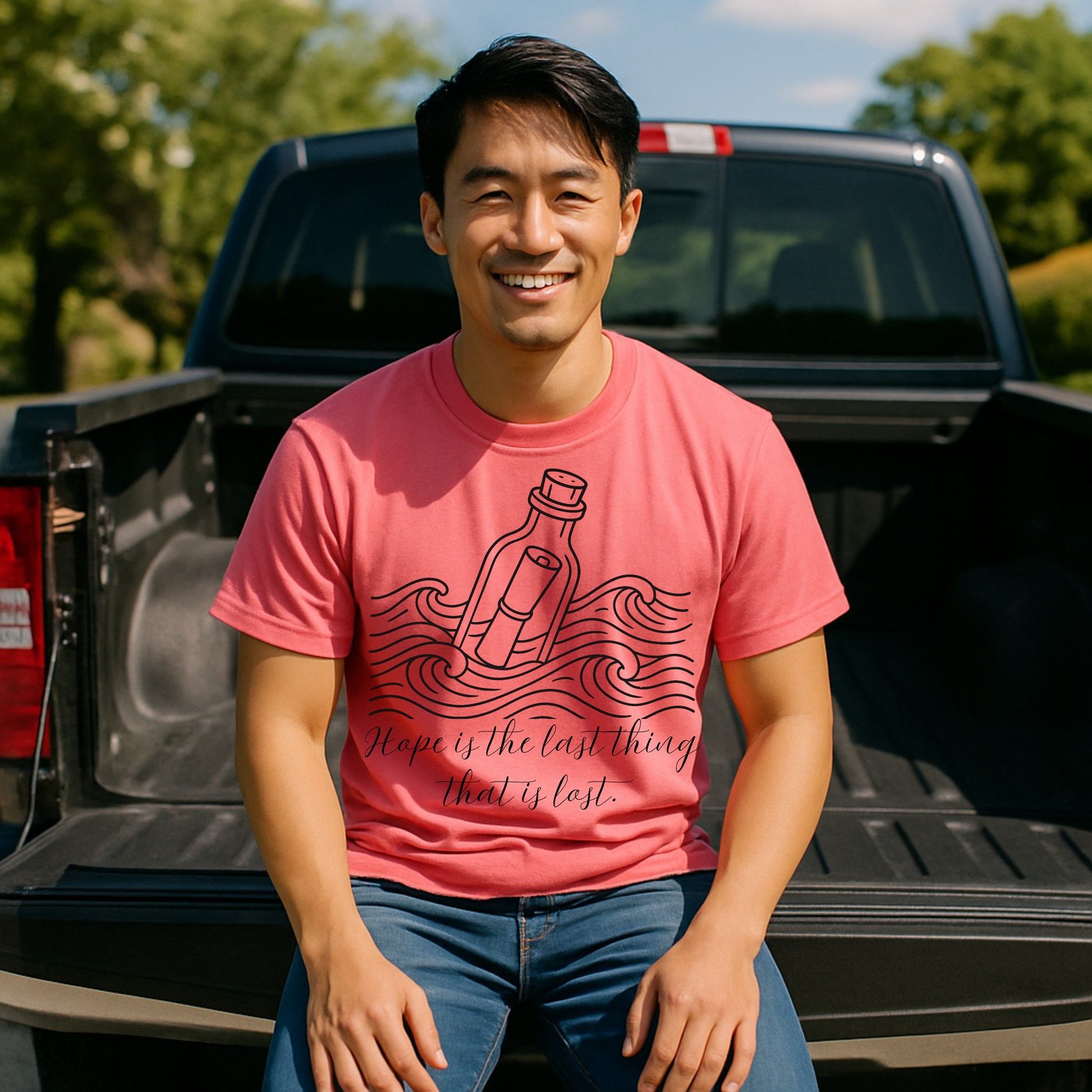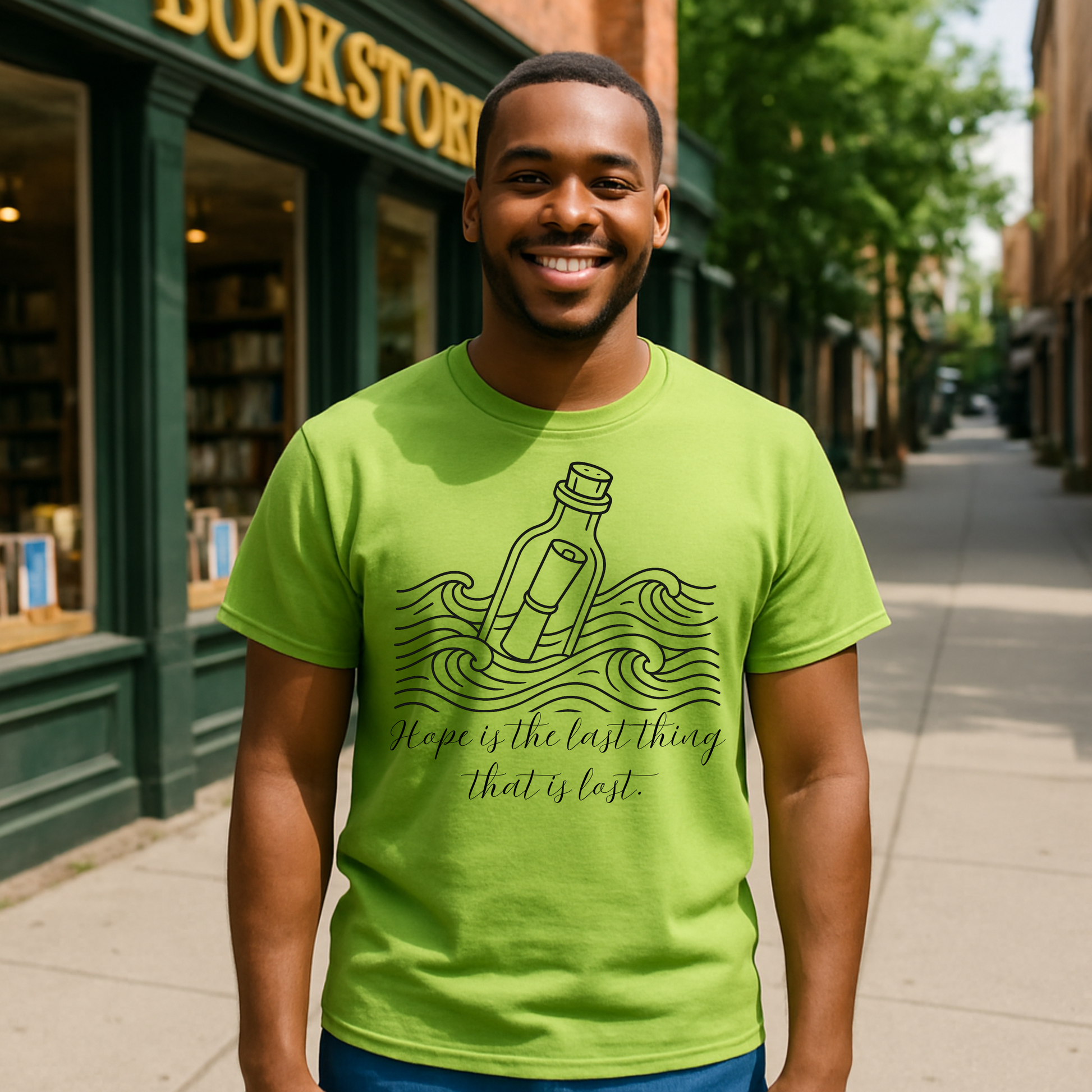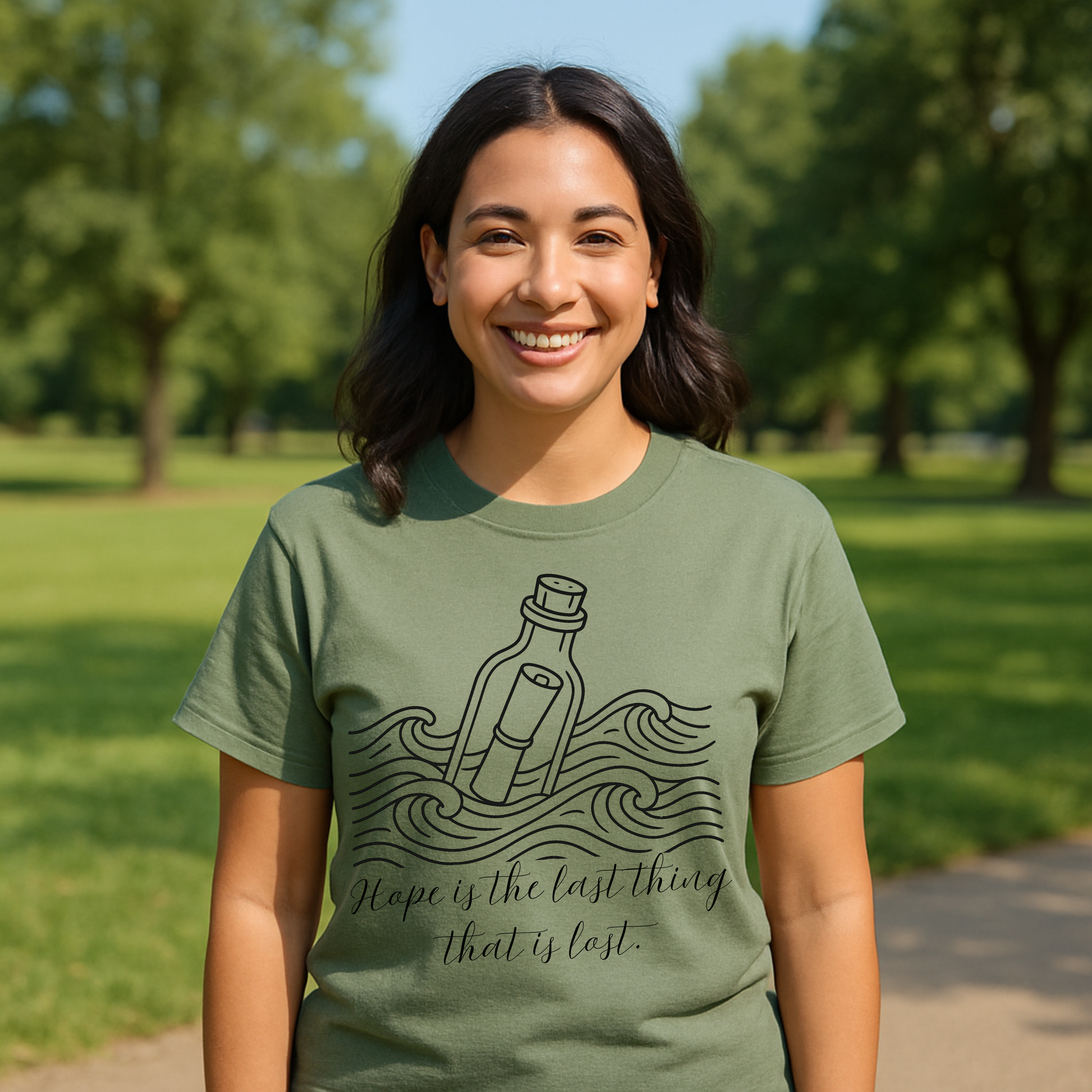 Send a powerful message with our “Hope is the last thing that is lost” t-shirt, featuring a beautifully hand-drawn message-in-a-bottle illustration riding ocean waves. This inspirational tee is perfect for anyone who believes in resilience, optimism, and the strength of the human spirit.