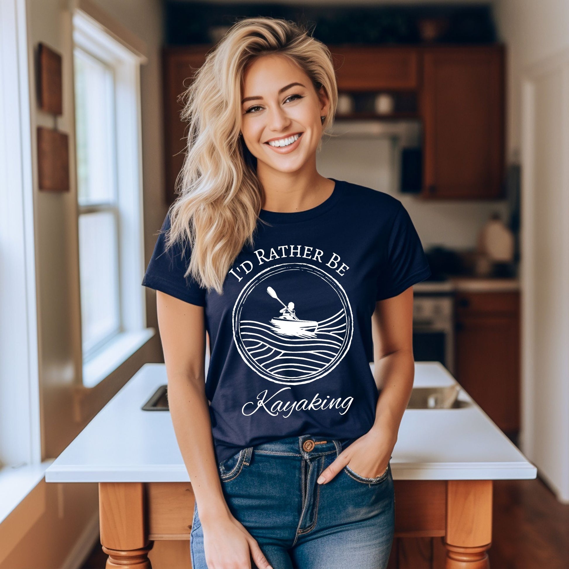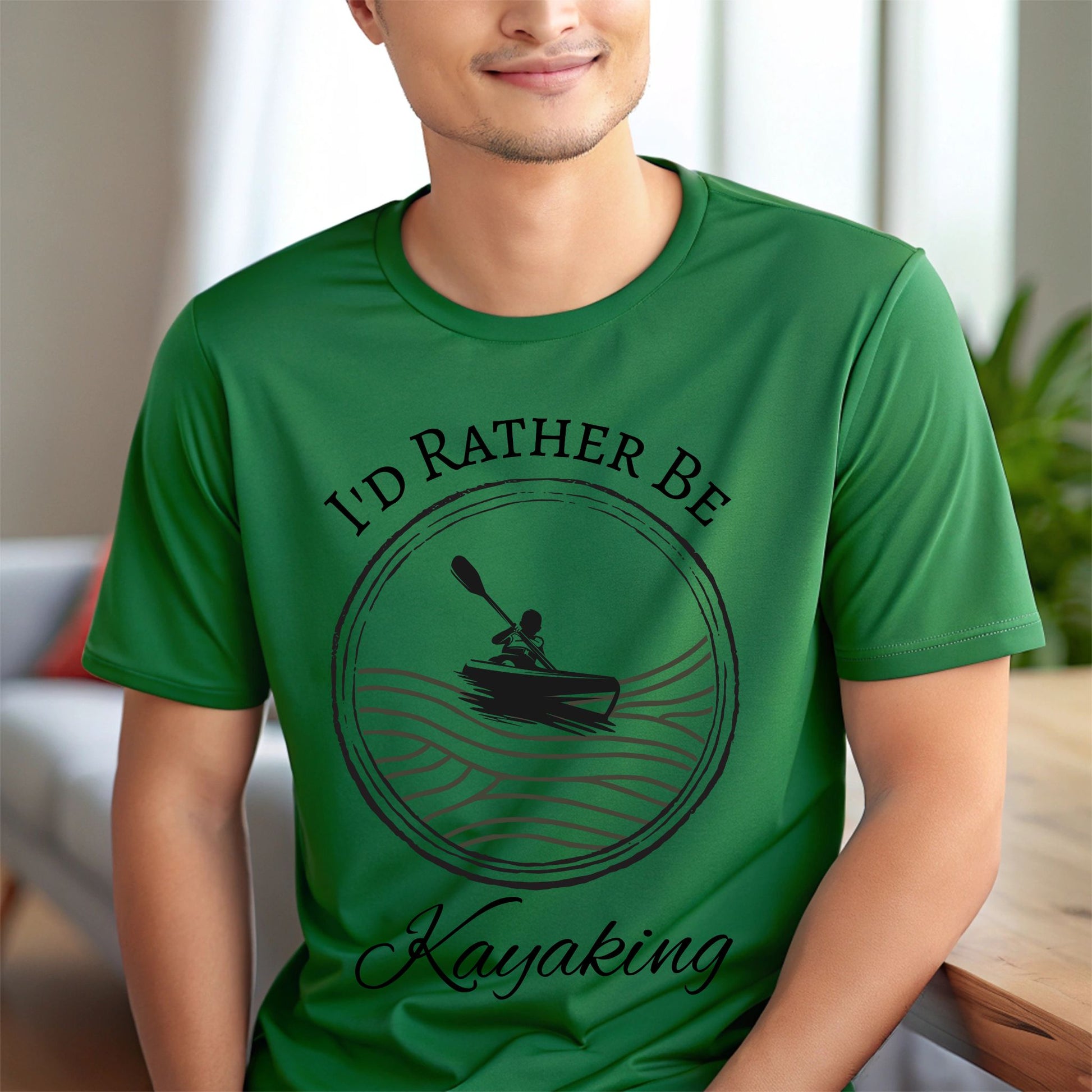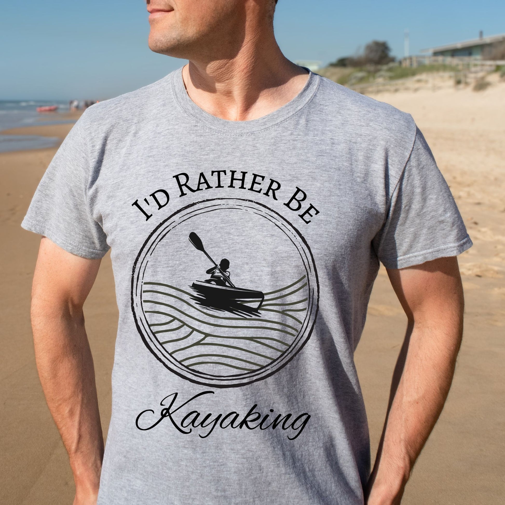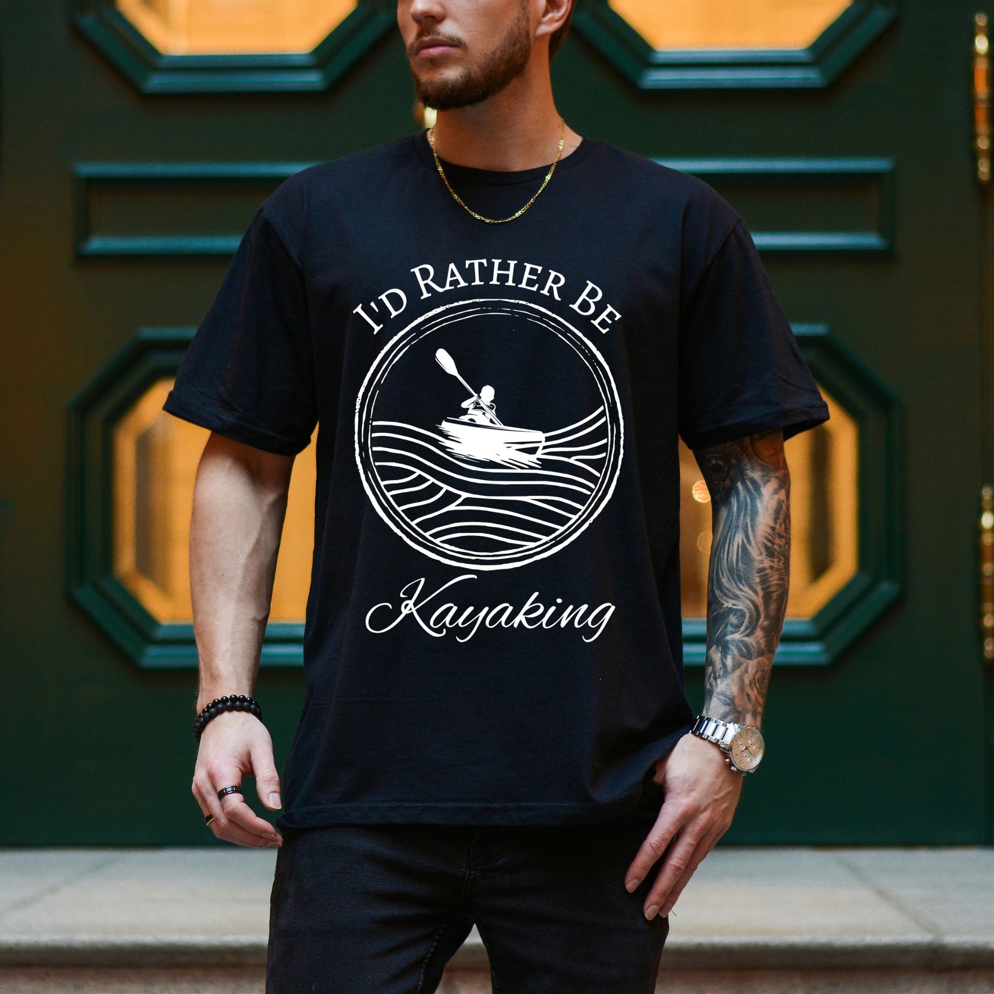 This T-Shirt features a graphic of water and a kayak within a circle with text that reads 'i'd rather be kayaking'. It gives off a relaxed and adventurous vibe, perfect for those who enjoy kayaking and outdoor activities. Ideal for outdoor enthusiasts, adventurers, and nature lovers. Relevant for holidays like summer vacations and outdoor adventures.