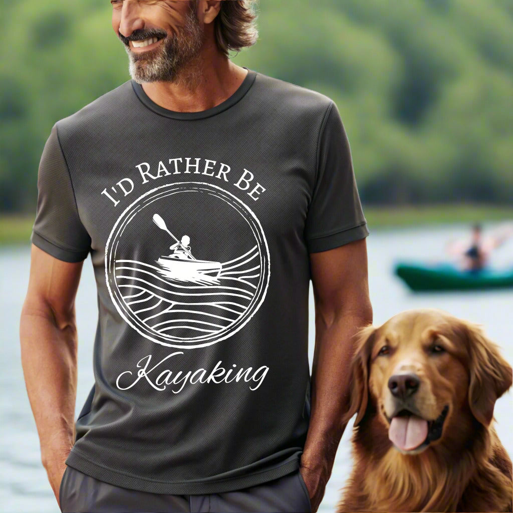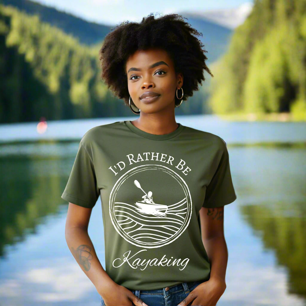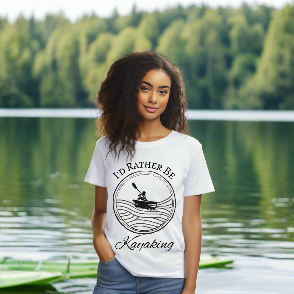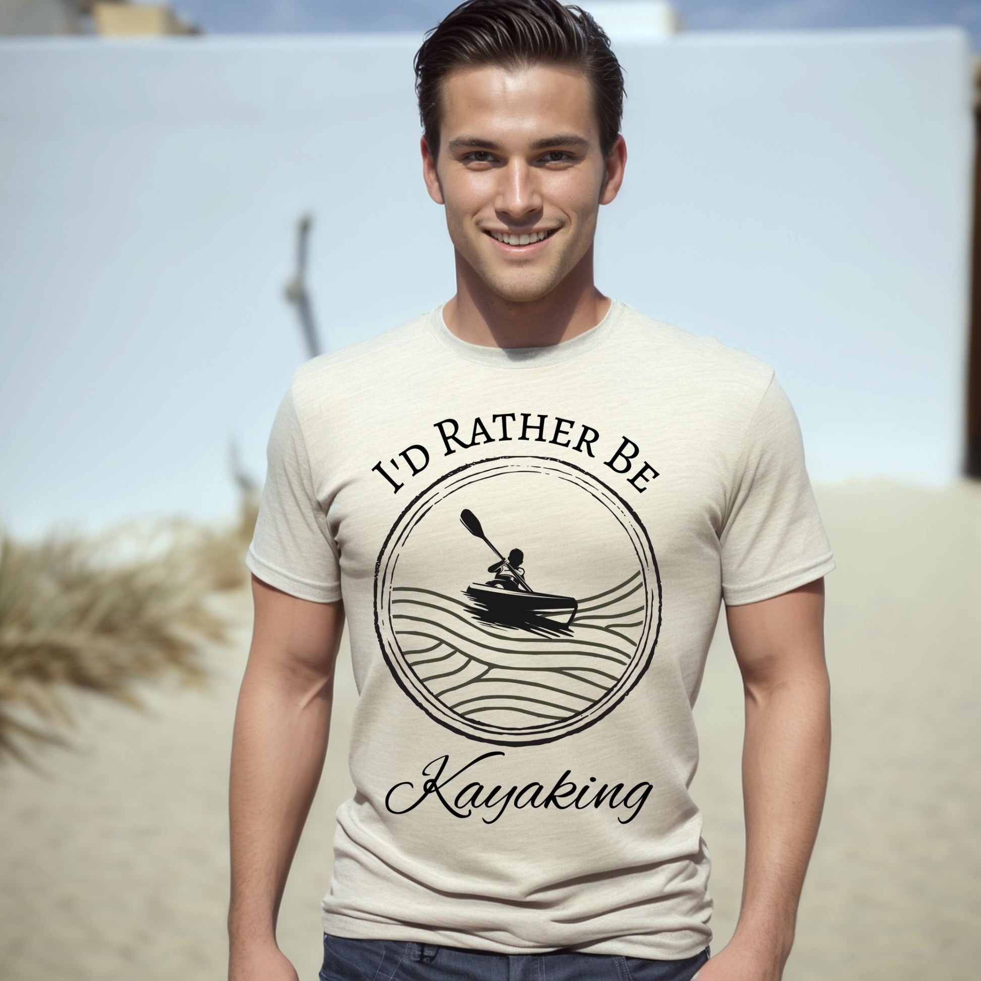 This T-Shirt features a graphic of water and a kayak within a circle with text that reads 'i'd rather be kayaking'. It gives off a relaxed and adventurous vibe, perfect for those who enjoy kayaking and outdoor activities. Ideal for outdoor enthusiasts, adventurers, and nature lovers. Relevant for holidays like summer vacations and outdoor adventures.