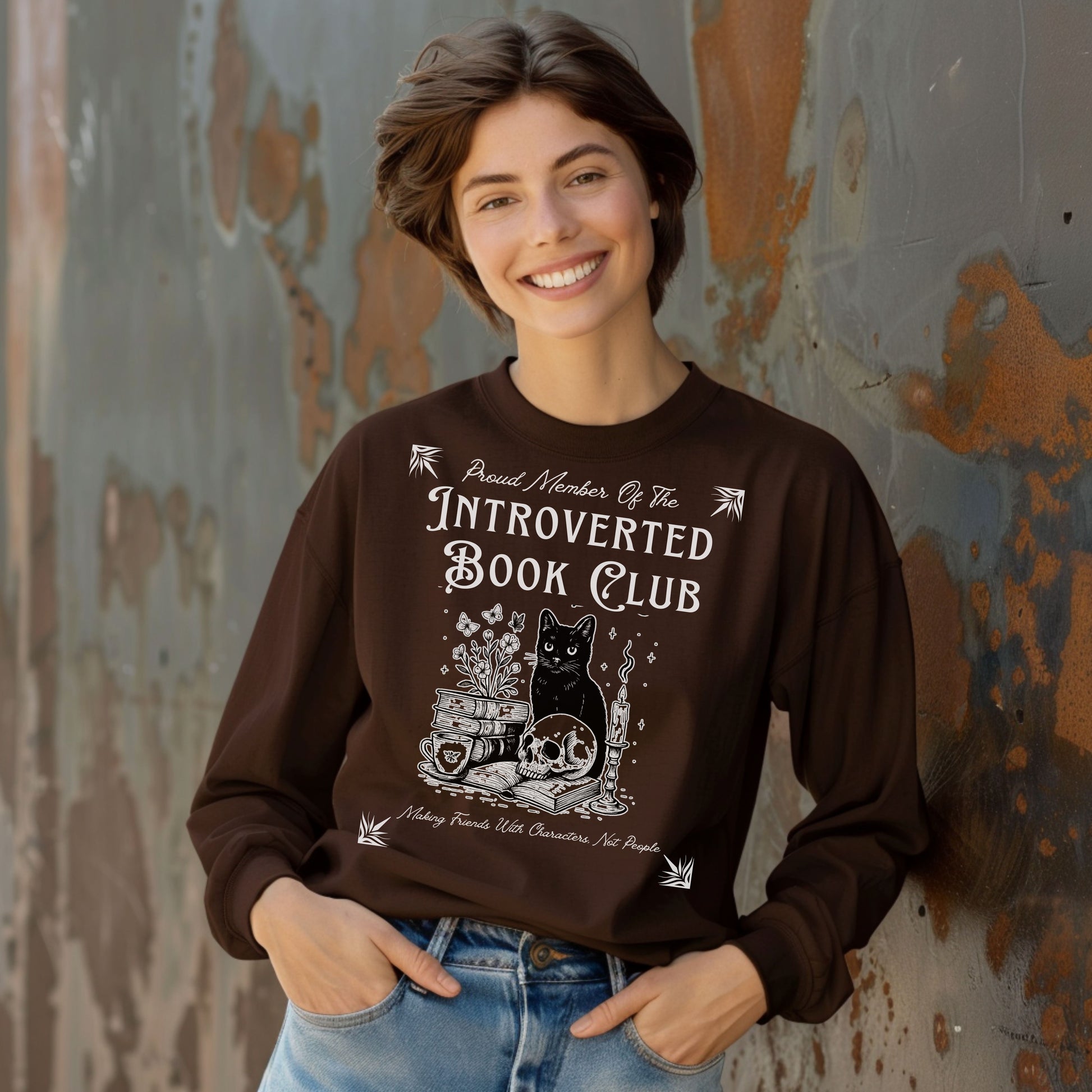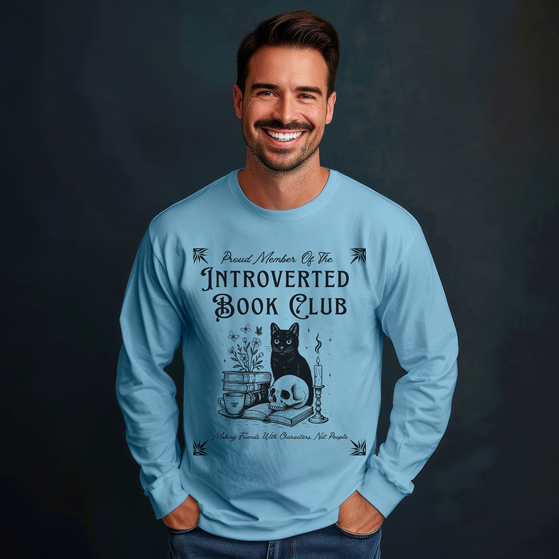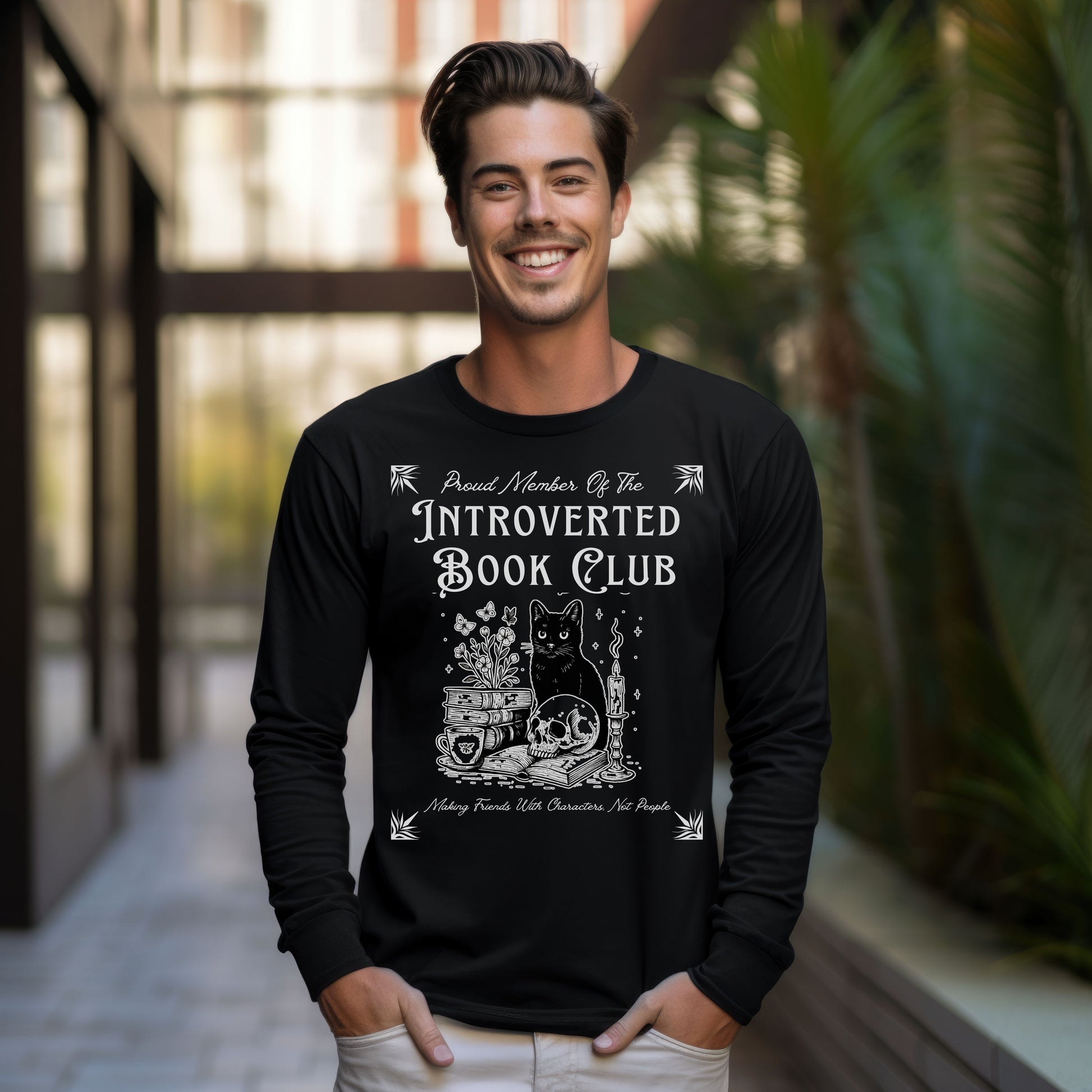 Introverted Book Club Long Sleeve T-Shirt – Black Cat Reading Shirt, Funny Bookish Gift for Introverts & Cat Lovers