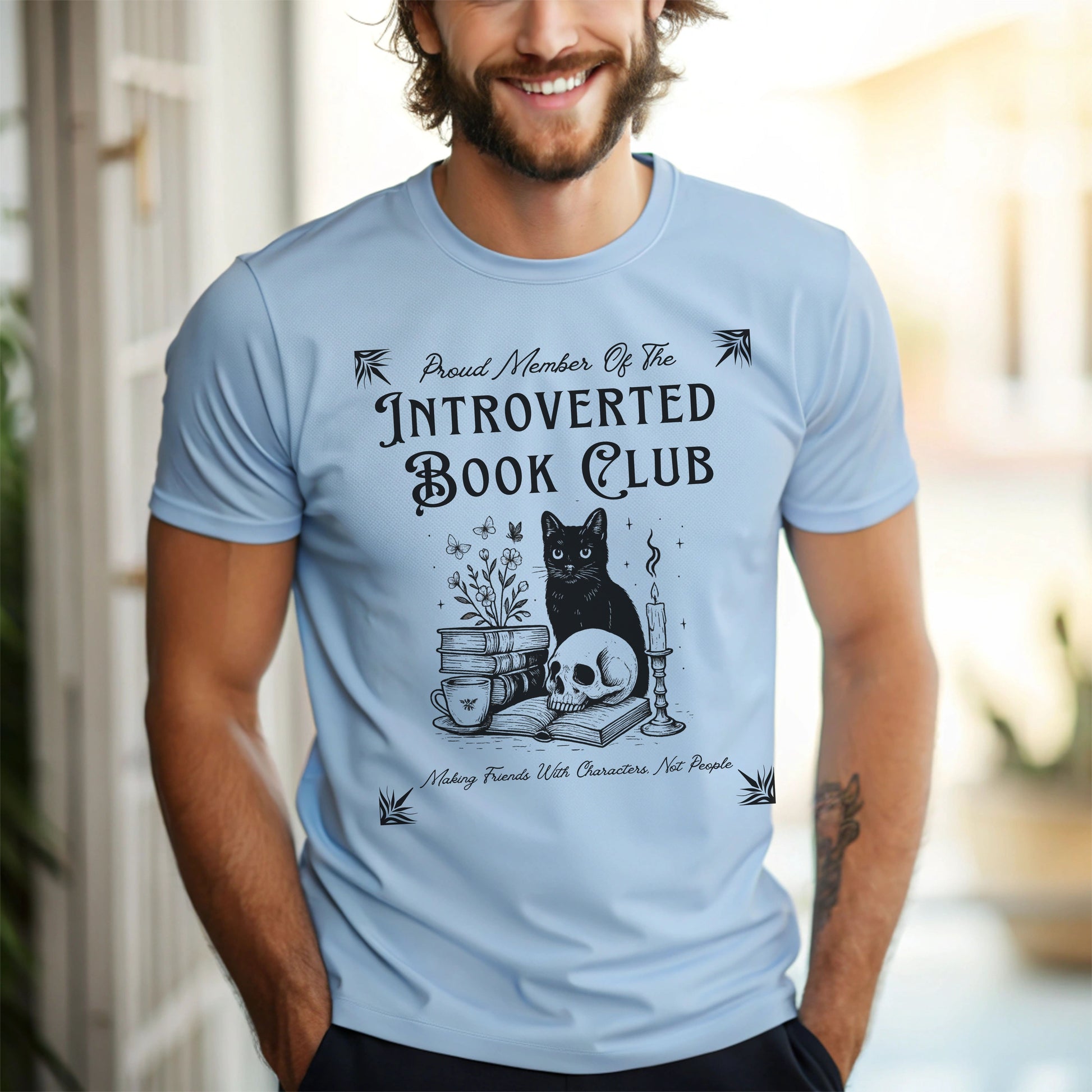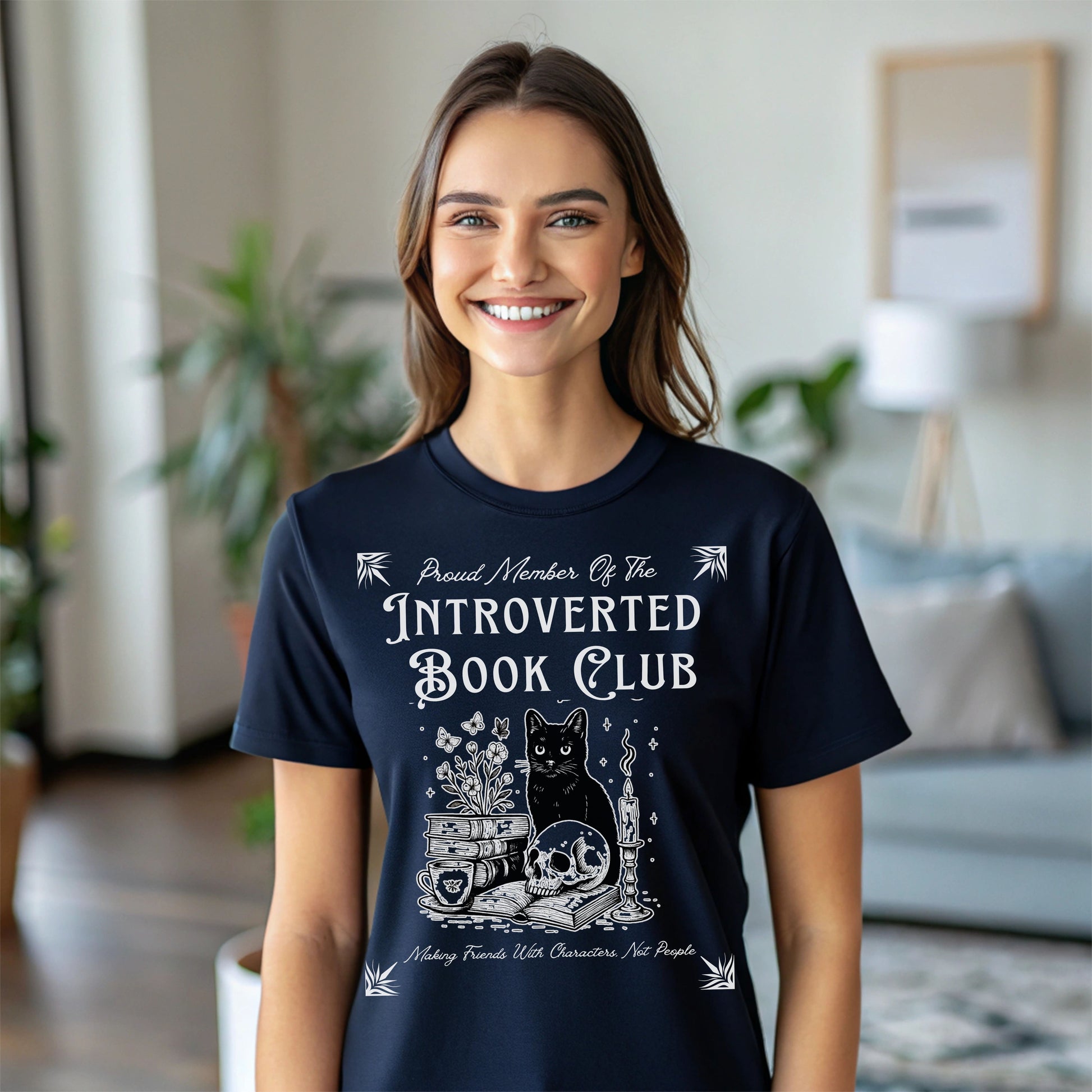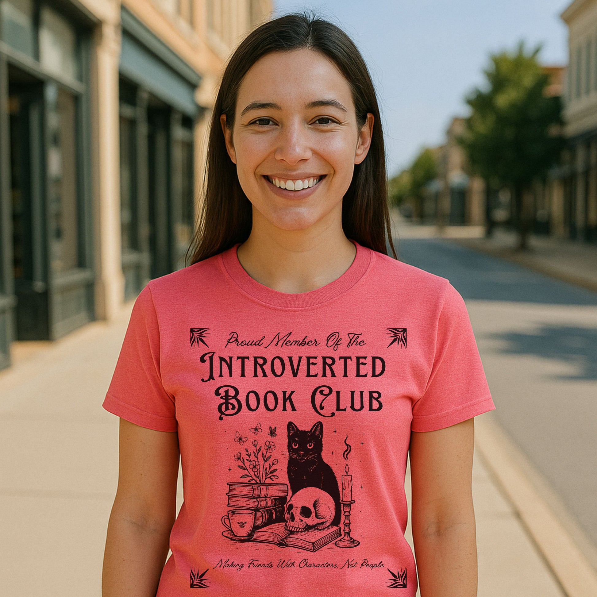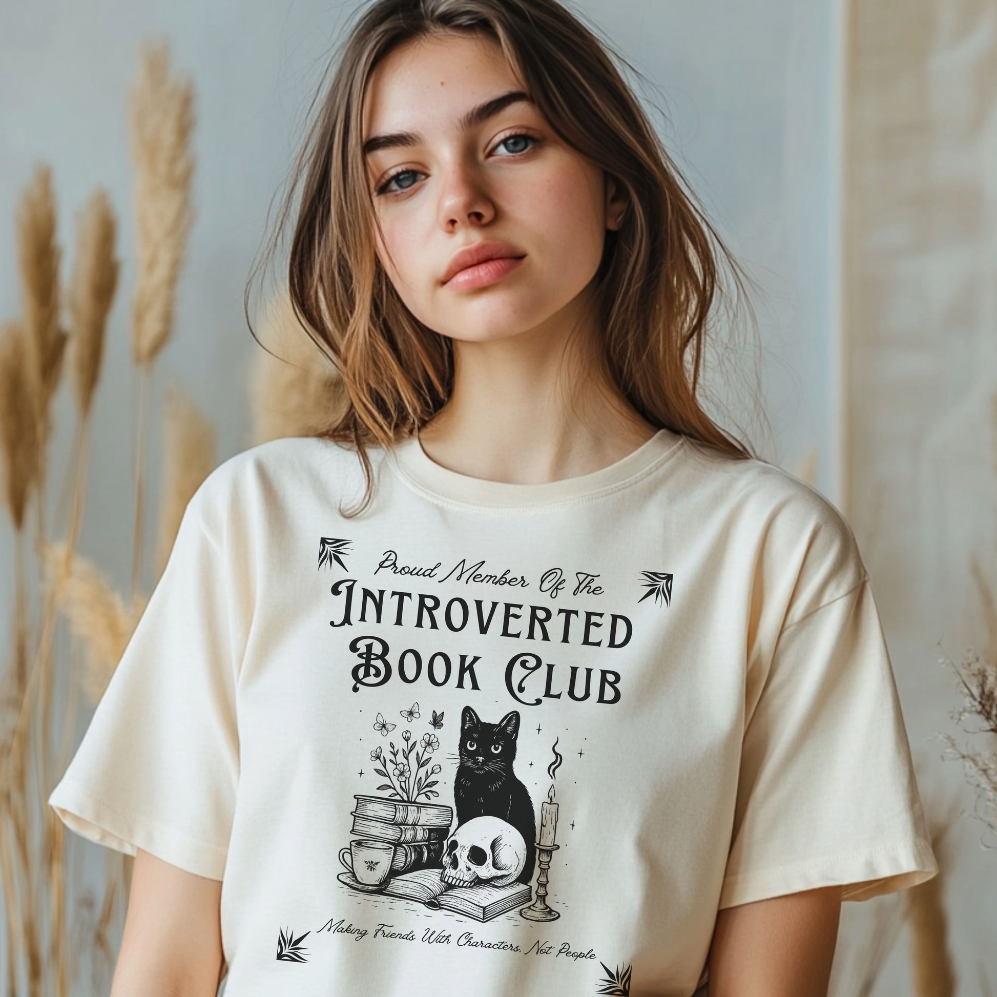 Calling all cozy introverts, bookworms, and feline fanatics — this one's for you. Our "Introverted Book Club" t-shirt features a mystical black cat surrounded by books, tea, a candle, and a skull — because who needs people when fictional characters are better company?