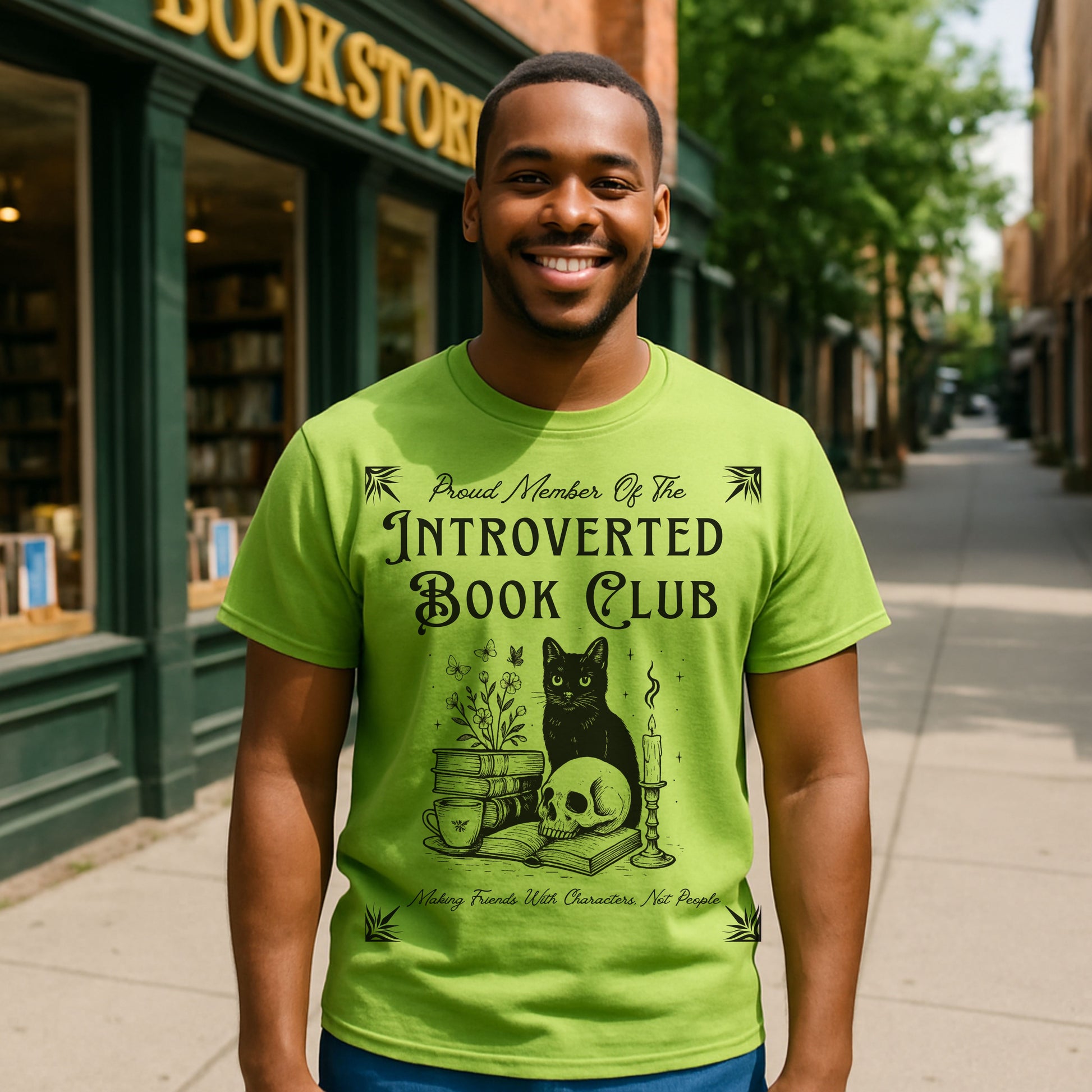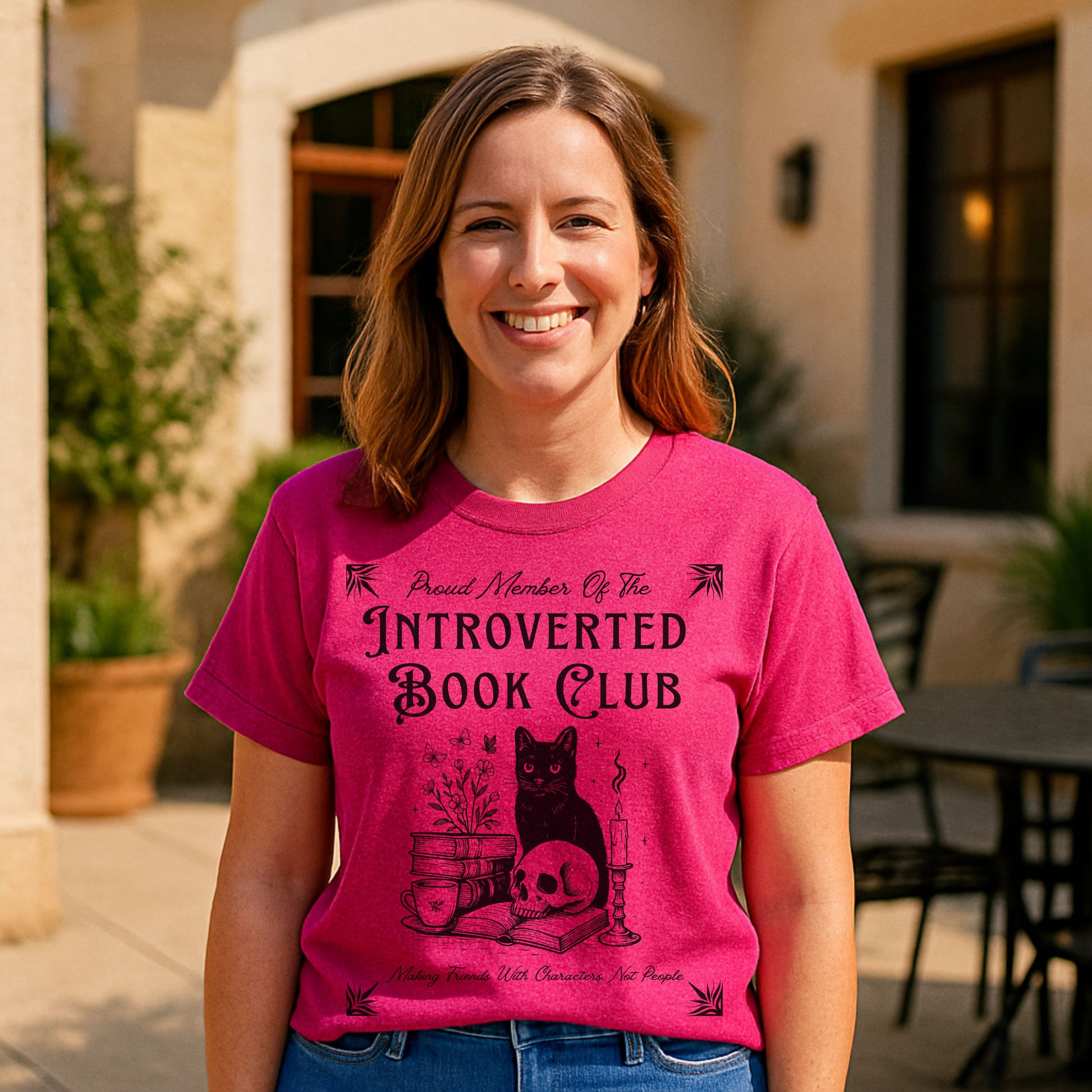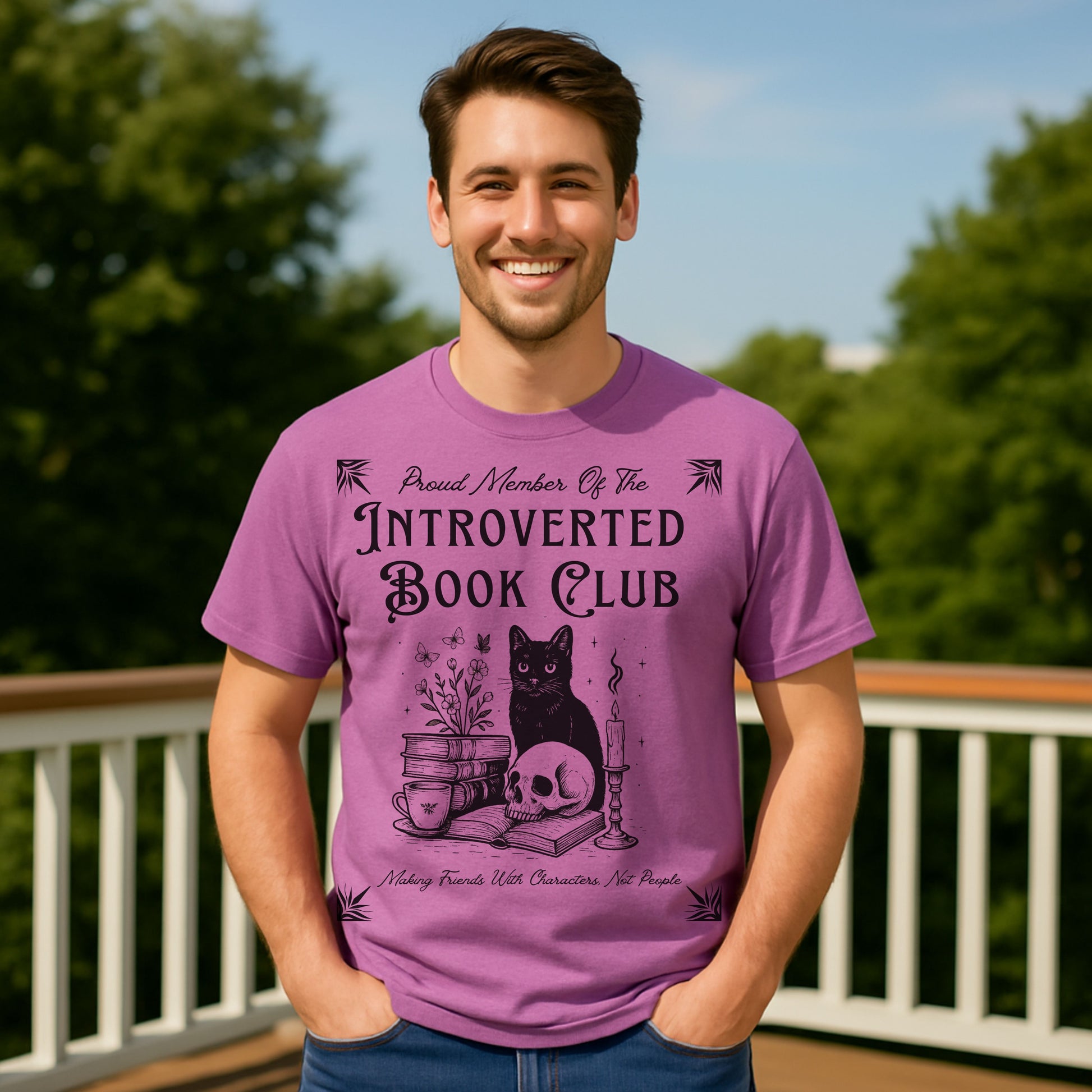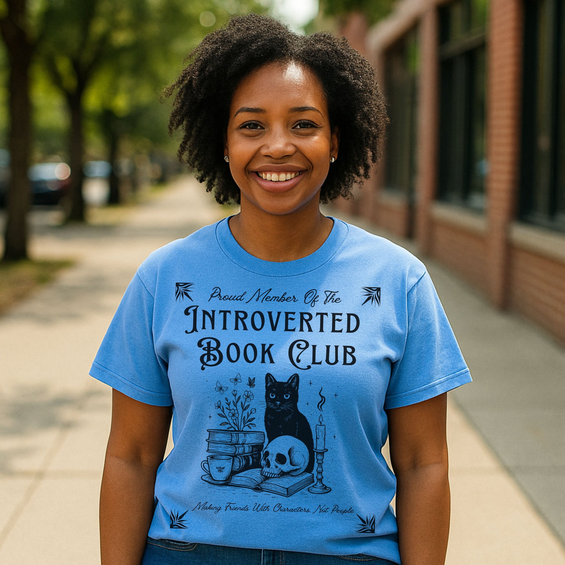 Calling all cozy introverts, bookworms, and feline fanatics — this one's for you. Our "Introverted Book Club" t-shirt features a mystical black cat surrounded by books, tea, a candle, and a skull — because who needs people when fictional characters are better company?