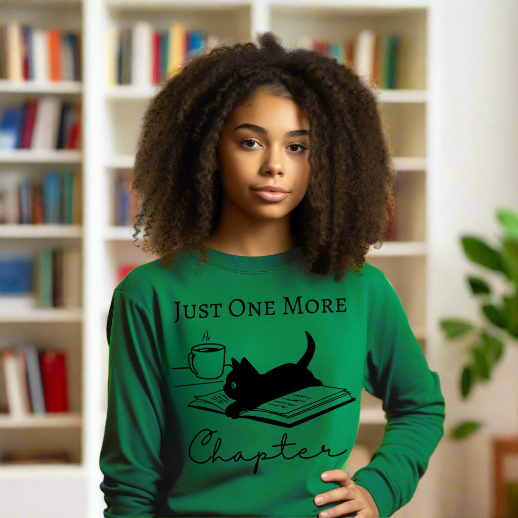 Introducing the purrfect addition to your wardrobe: our adorable black cat reading shirt! This unique and charming design features a graphic of a black cat stretched across an open book, accompanied by the text "just one more chapter." As a delightful combination of your love for cats and books, this shirt is sure to become your new favorite go-to piece. Our reading shirt makes an excellent bookish gift for cat lovers, bibliophiles, and reading teachers alike. It's also a fantastic way to treat yourself or share your interests with the world. Available in a wide range of sizes, this bookish shirt is designed to flatter all body types and provide a comfortable fit. Our bibliophile gift truly showcases creativity, authenticity, and quality. As a cute cat shirt that speaks to your passions, it's a wonderful conversation starter and a stylish way to express your love for books and feline friends. Whether you're shopping for bookish gifts, a reading teacher shirt, black cat gifts or simply looking to add some literary flair to your wardrobe, our black cat reading shirt is the cat's meow. Don't miss out on this charming and unique piece – order yours today and let the reading adventures begin!