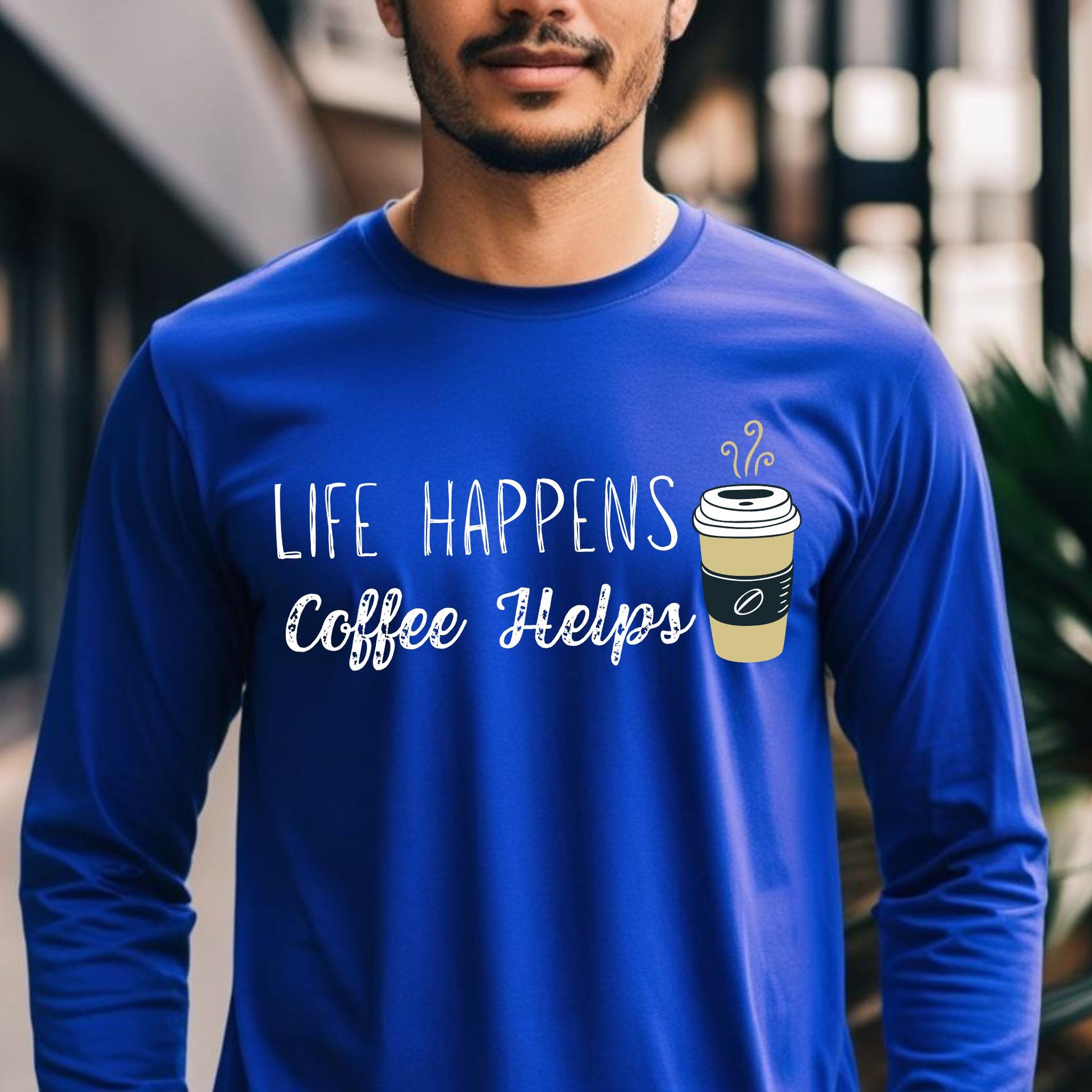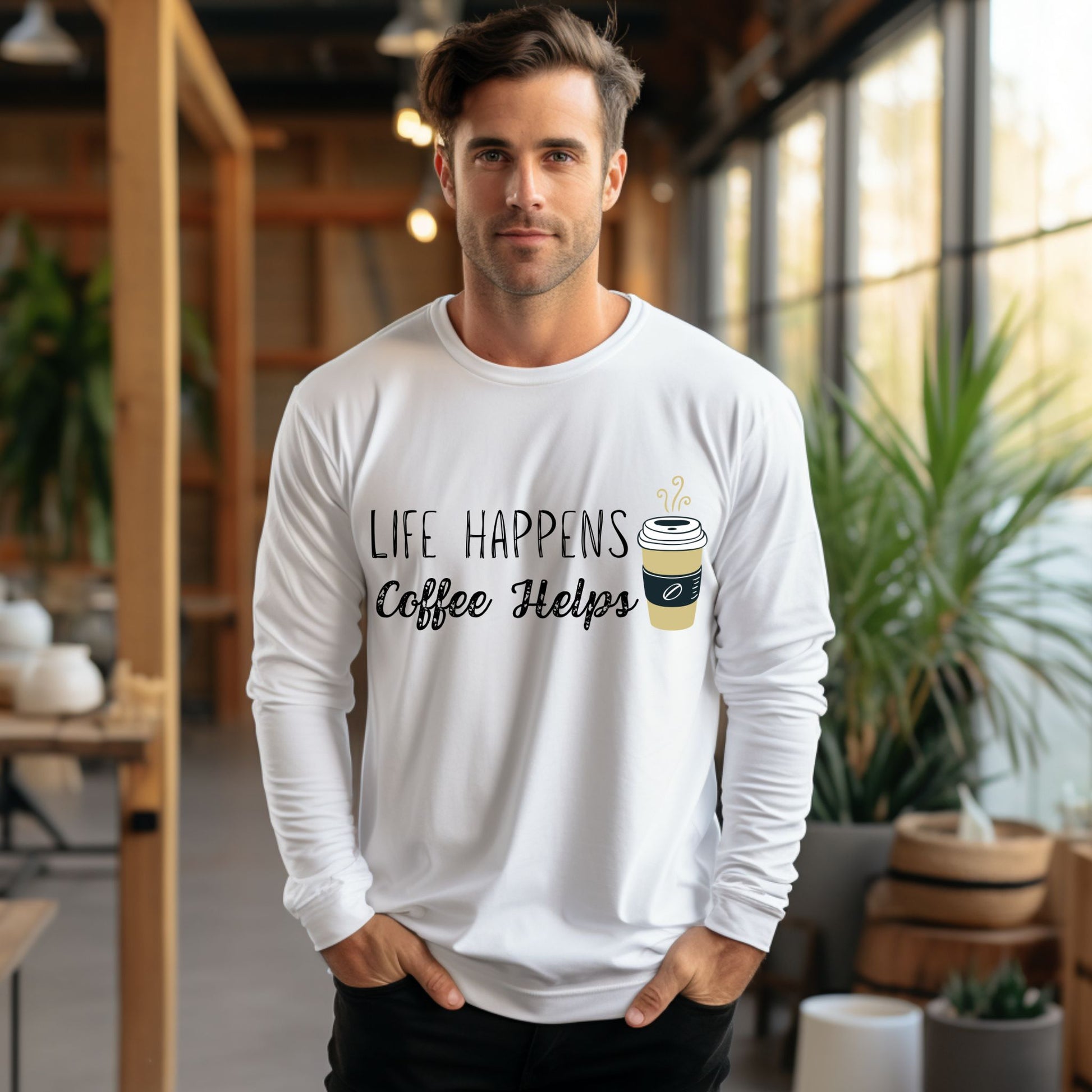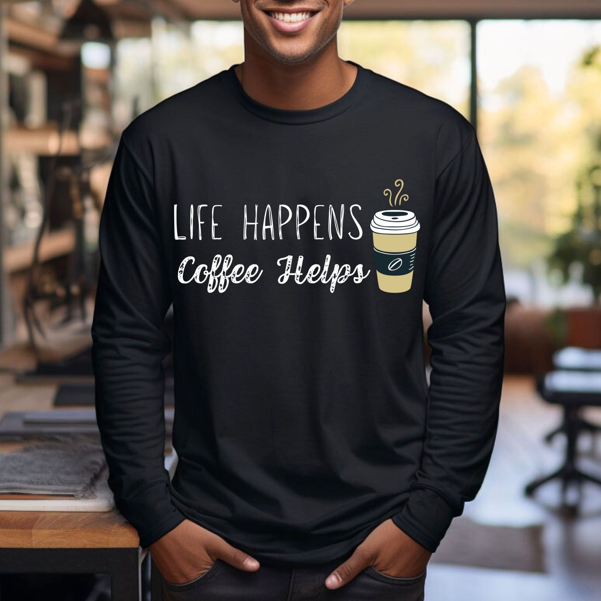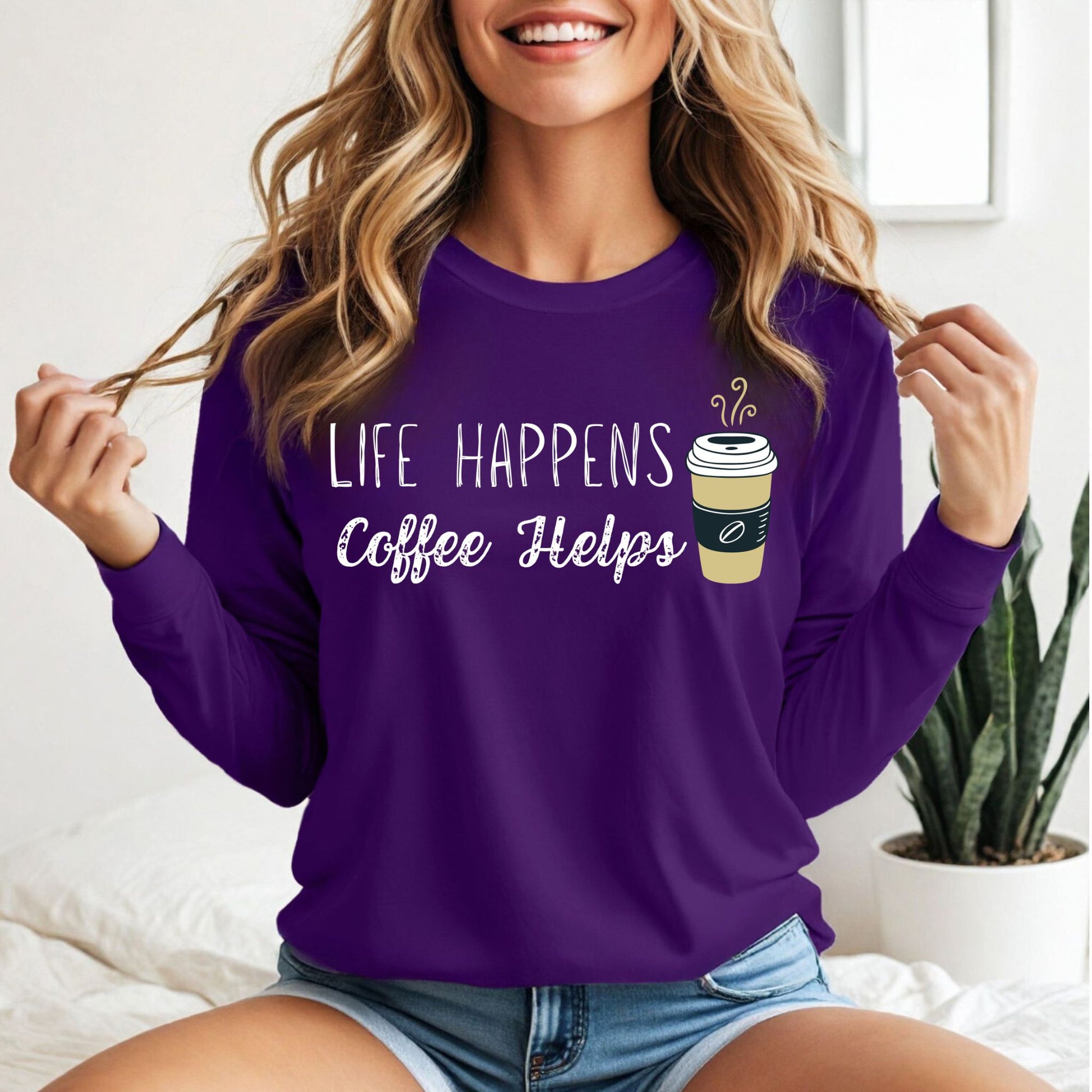 Life Happens Coffee Helps T-Shirt Funny Coffee Graphic Tee for Caffeine Lovers Long Sleeve Tee
