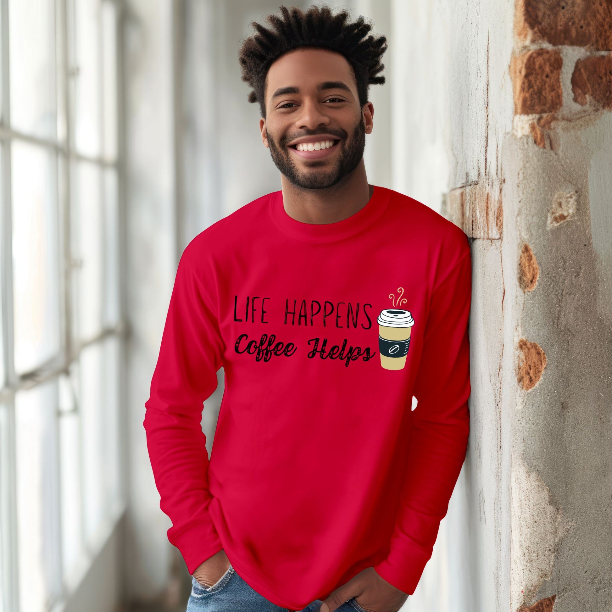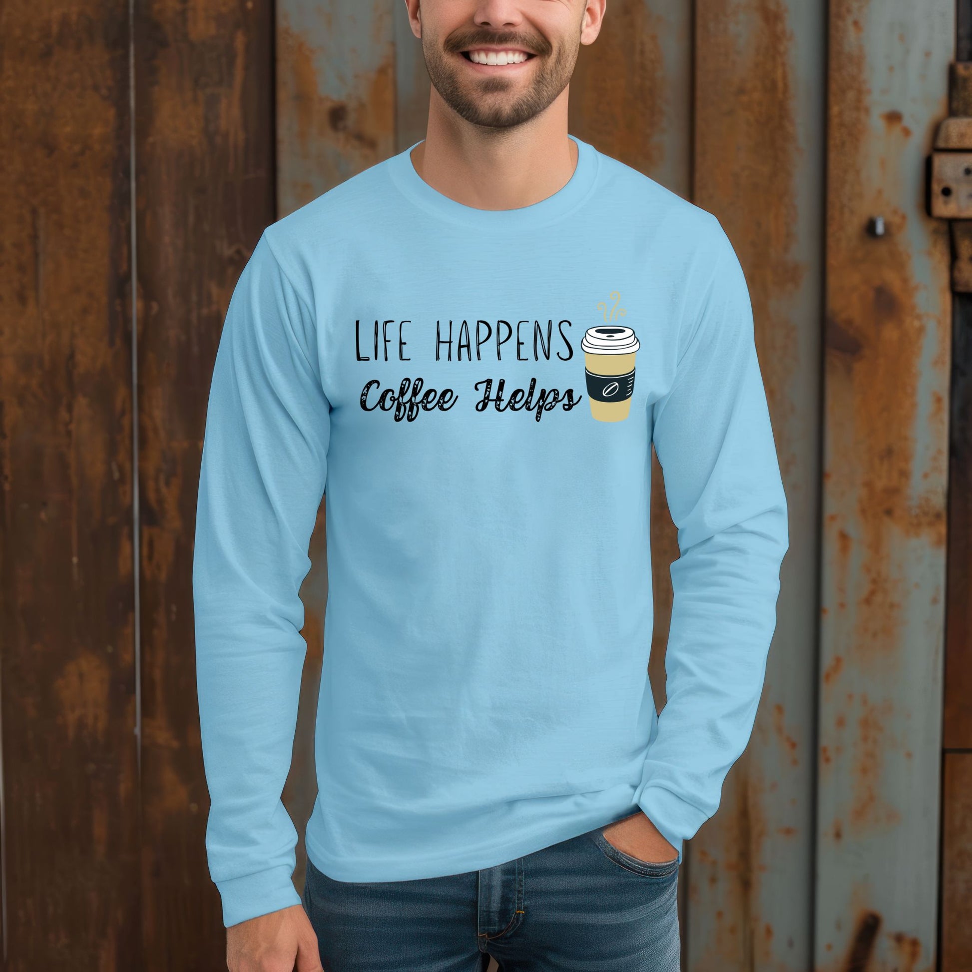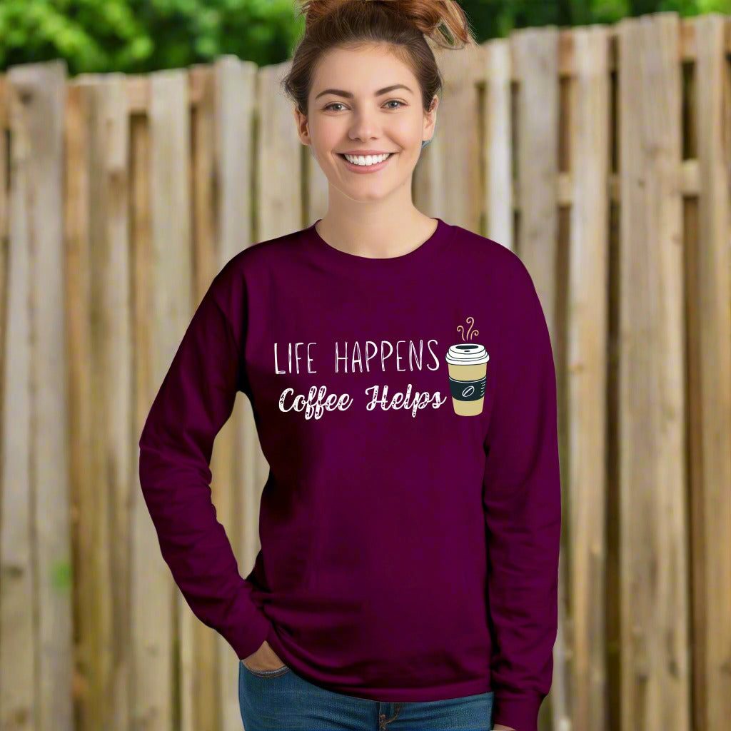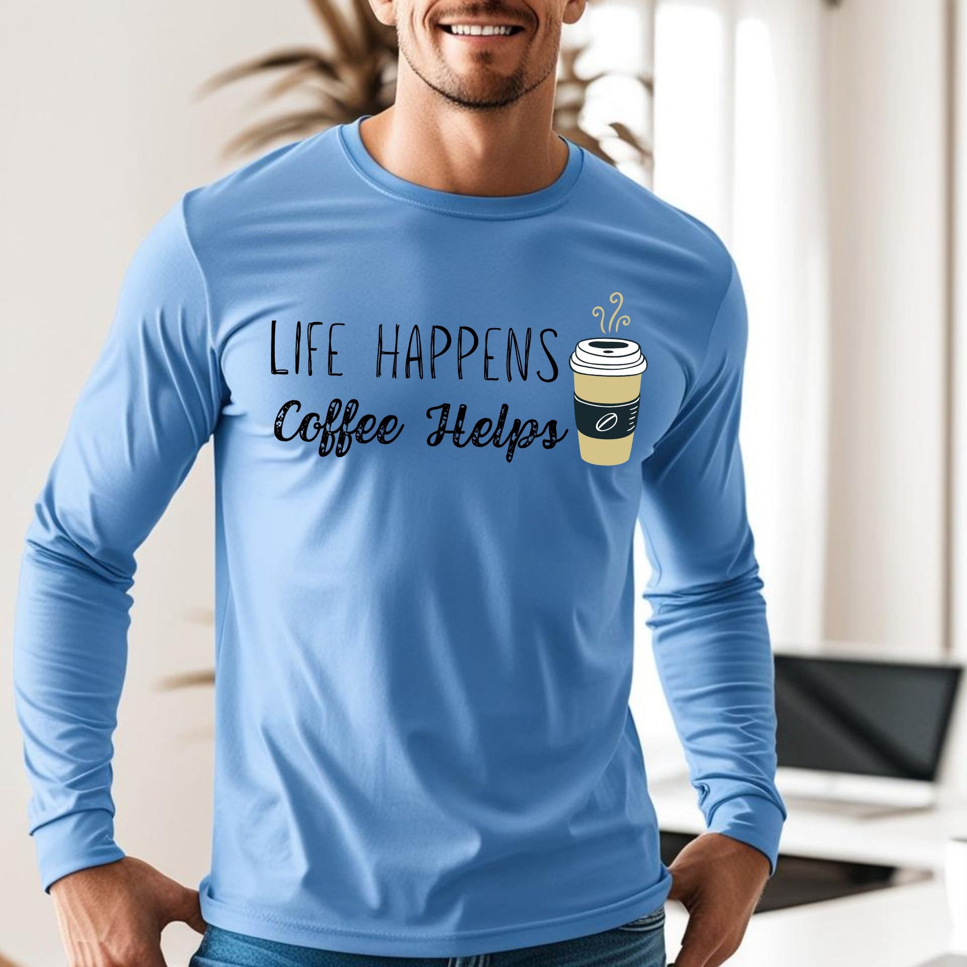 Life Happens Coffee Helps T-Shirt Funny Coffee Graphic Tee for Caffeine Lovers Long Sleeve Tee