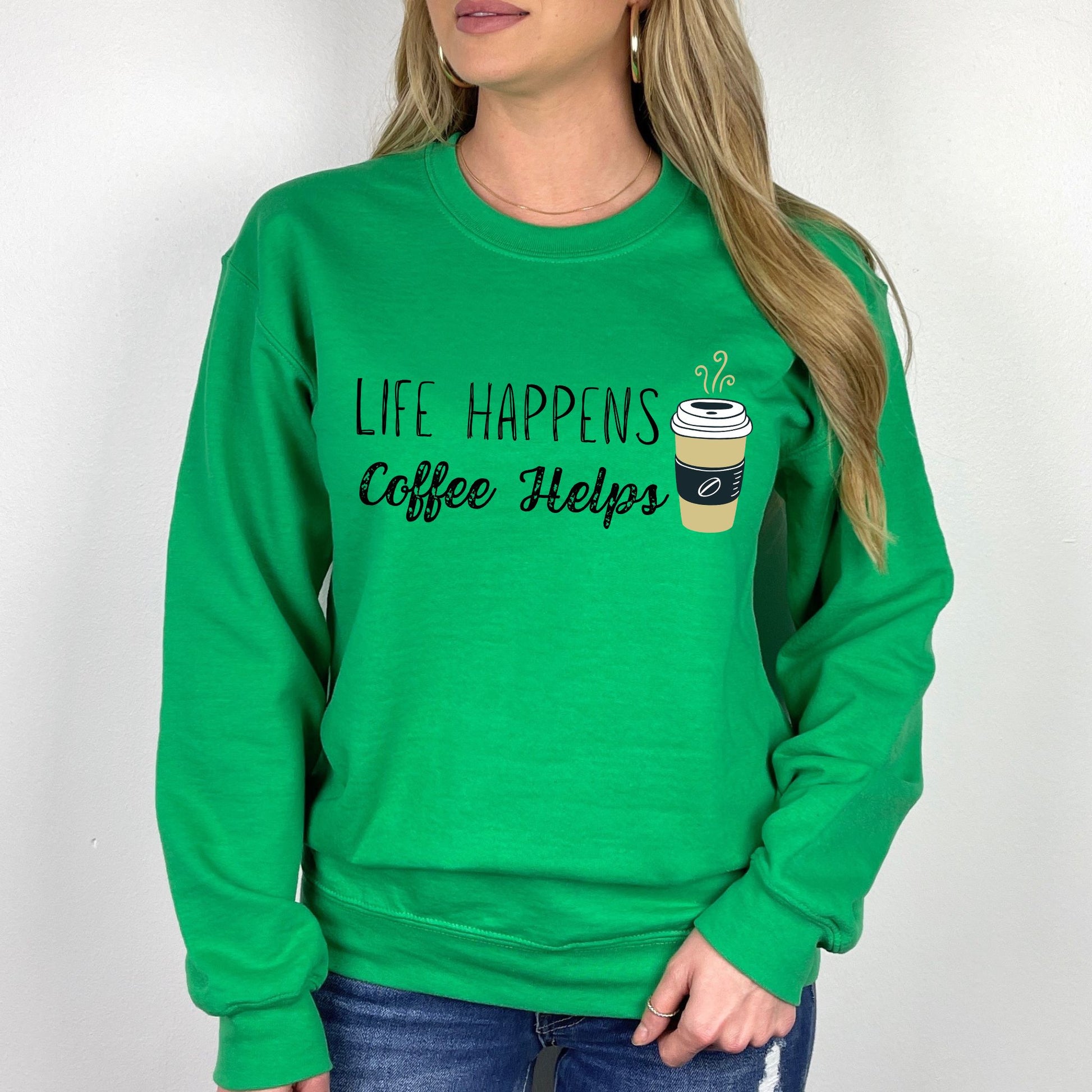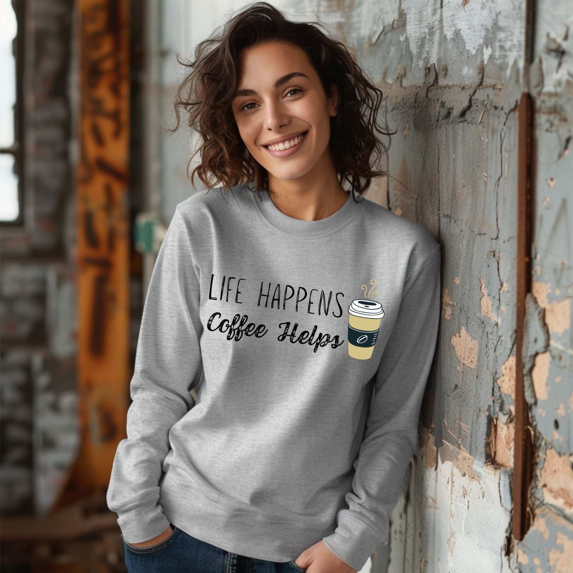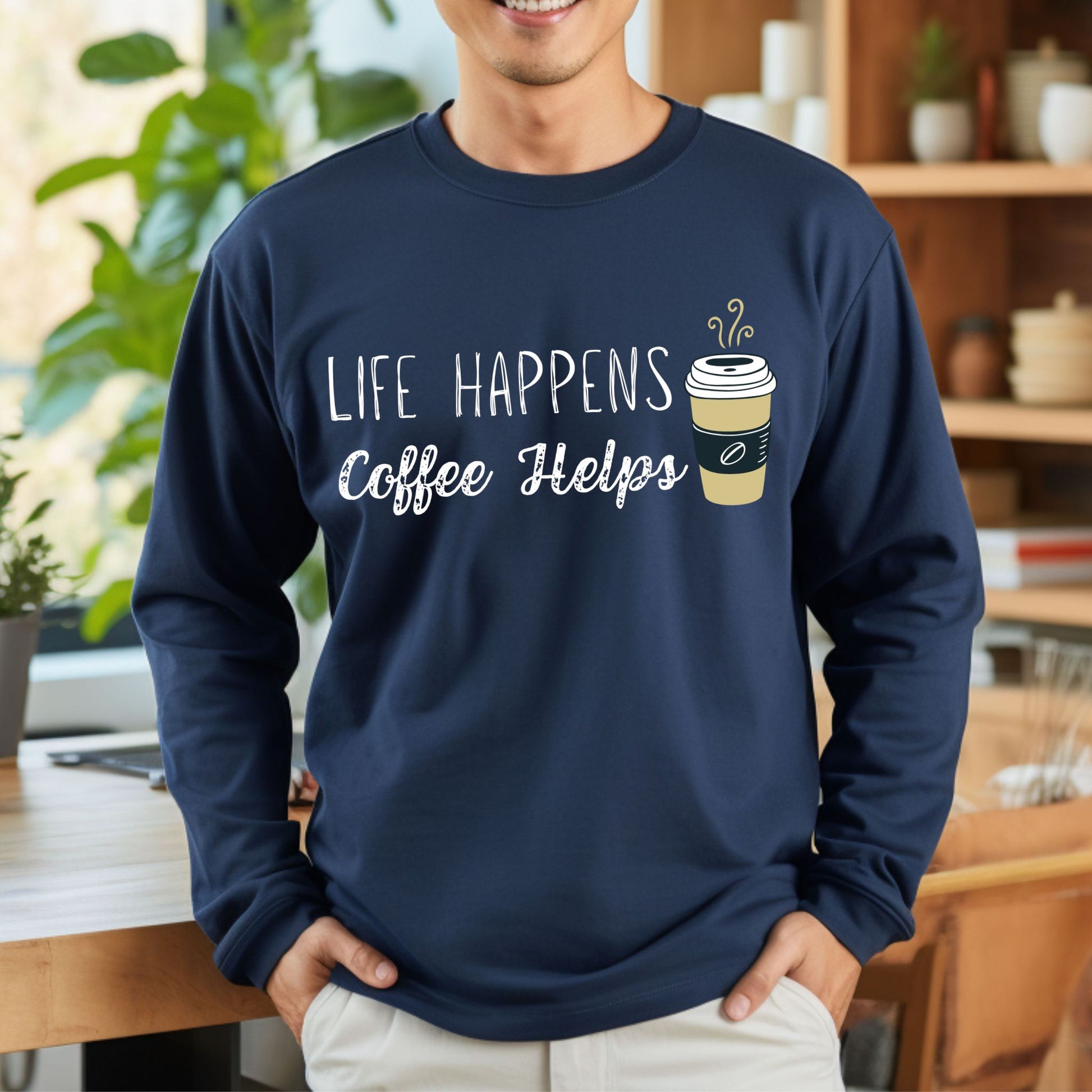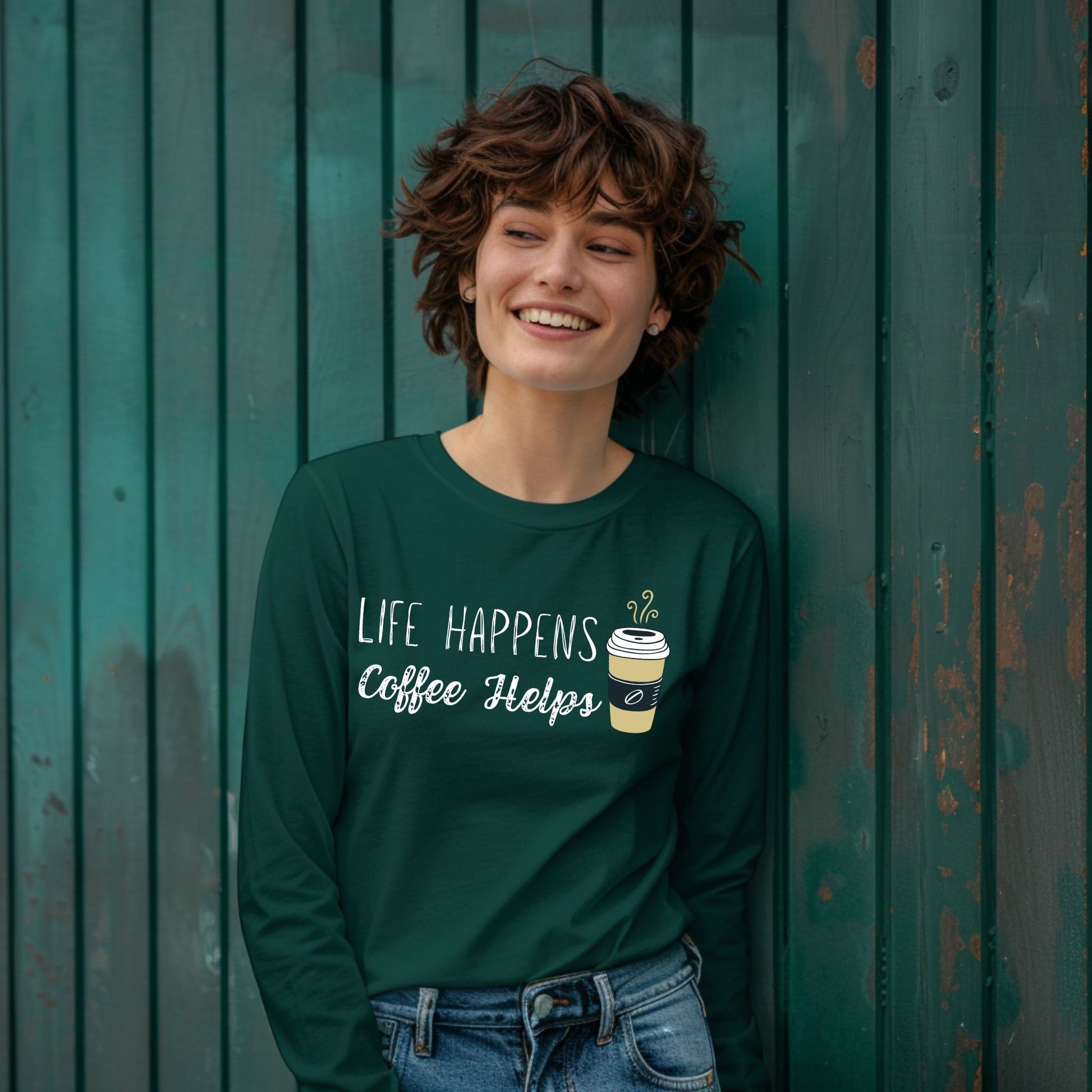 Life Happens Coffee Helps T-Shirt Funny Coffee Graphic Tee for Caffeine Lovers Long Sleeve Tee