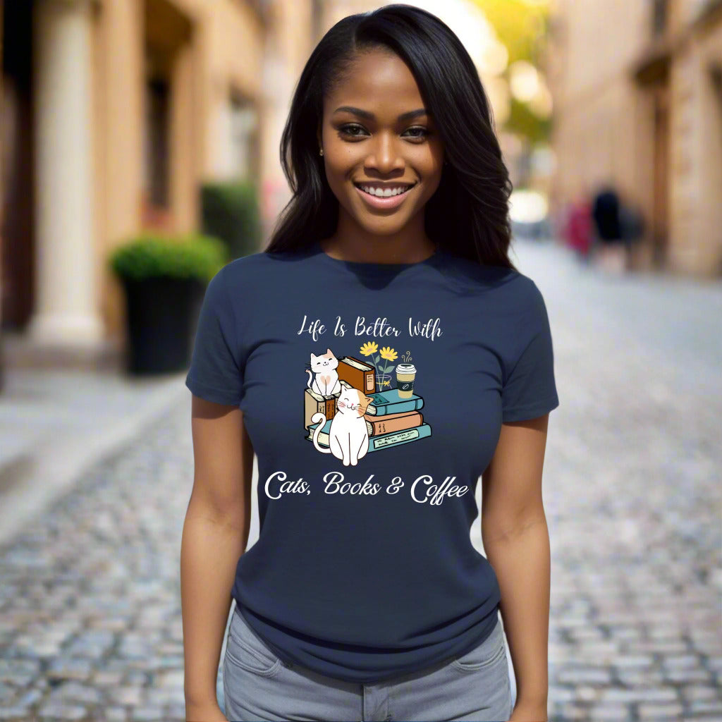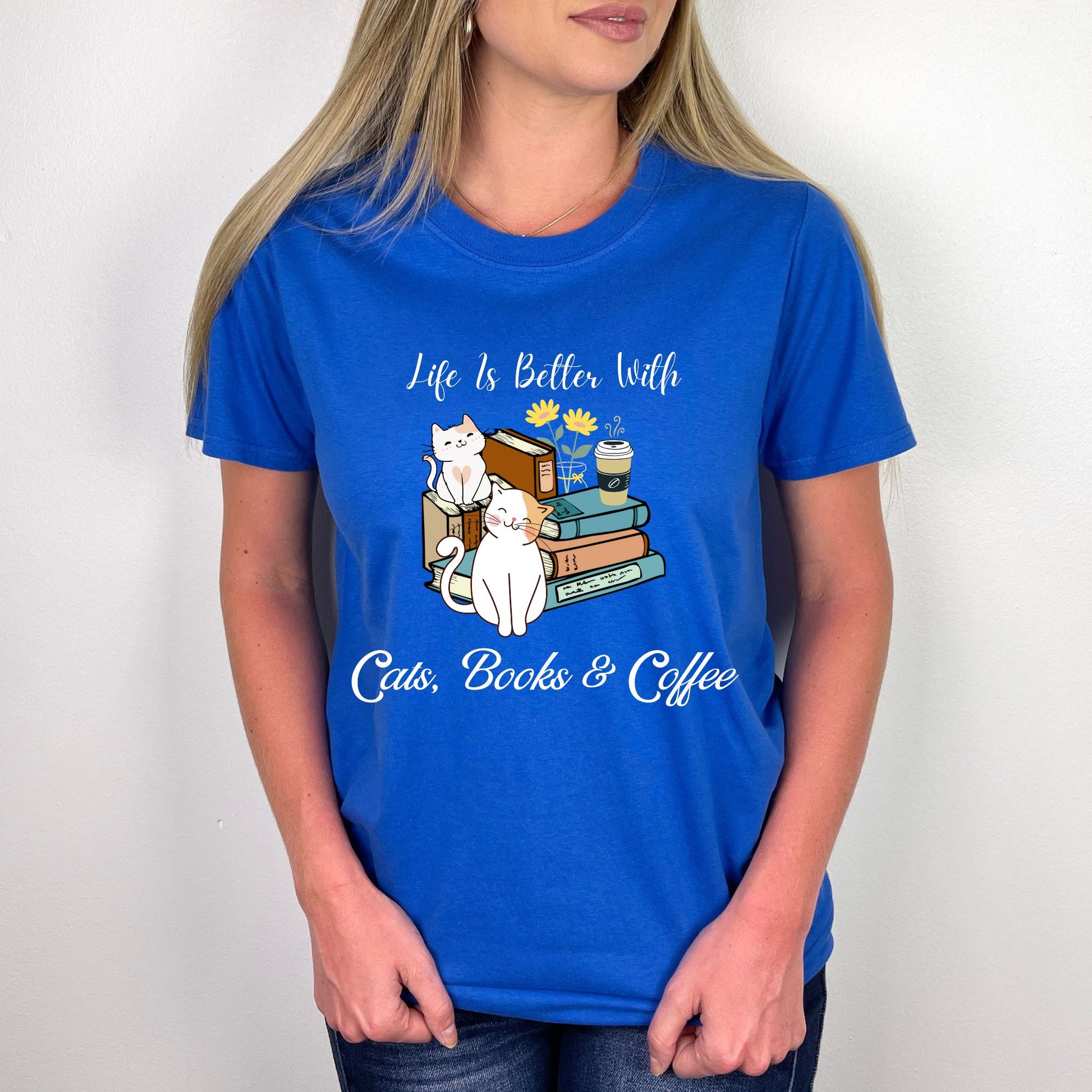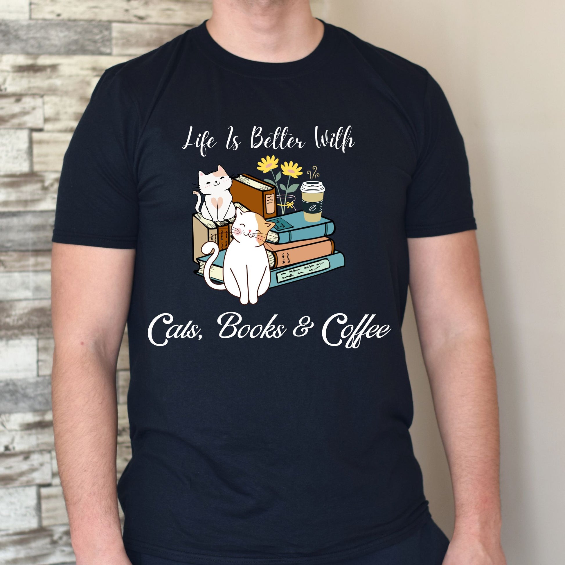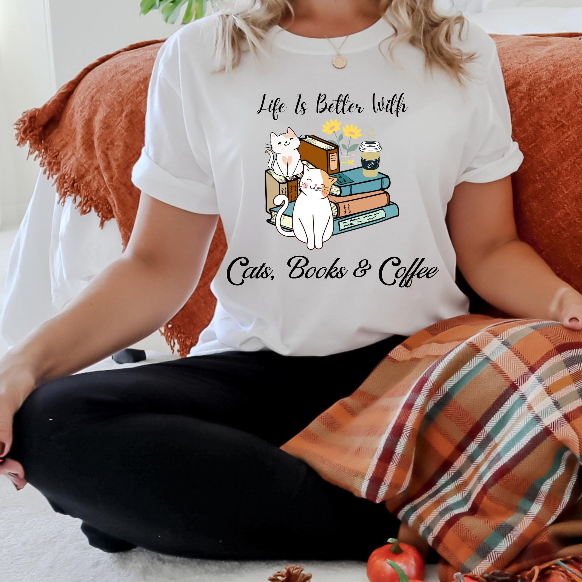 If you're looking for a special way to commemorate your love for animals, reading and caffeinated beverages, then look no further than this cute cat shirt! This is a must-have for all cat lovers, book lovers, and coffee lovers! Let them express their love for cats, books and coffee in style! The mix of playful charm and comfort make it a must-have item. Whether you’re treating yourself or giving it as a gift, this fun and upbeat tshirt is sure to put a smile on everyone’s face! This adorable "Life is Better with Cats, Books, and Coffee" shirt is the perfect statement piece!