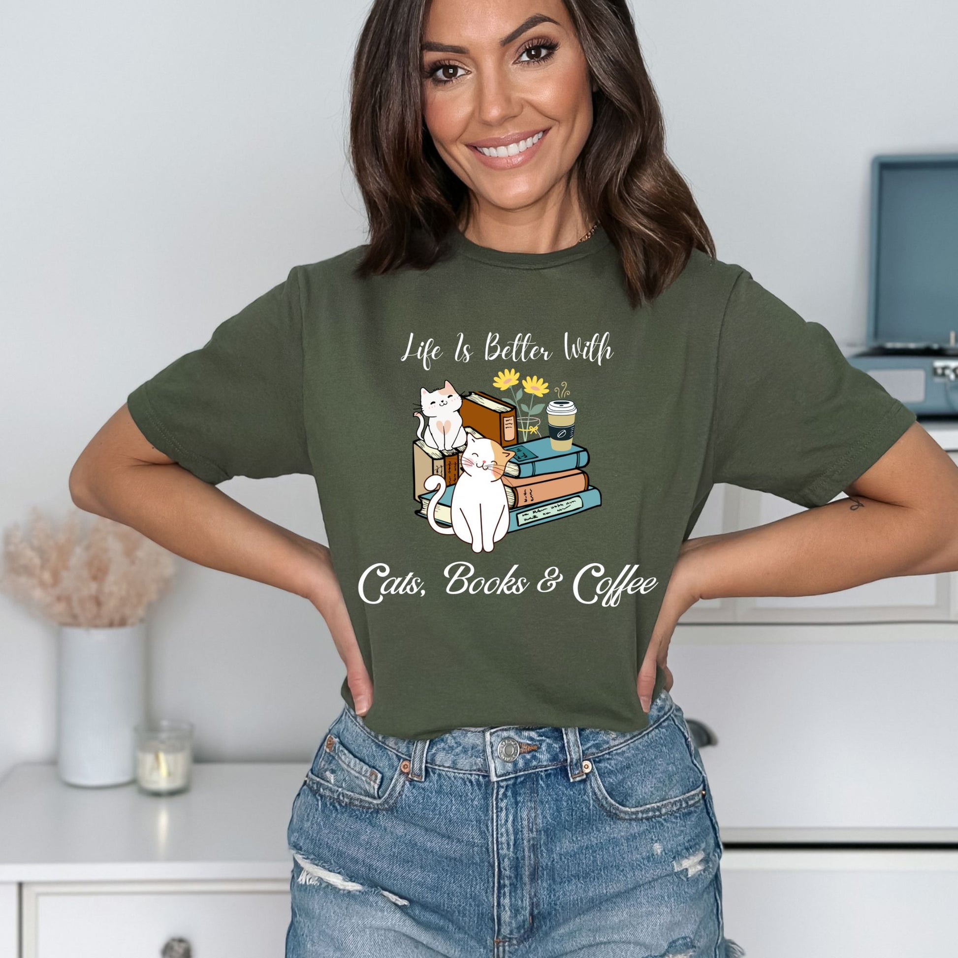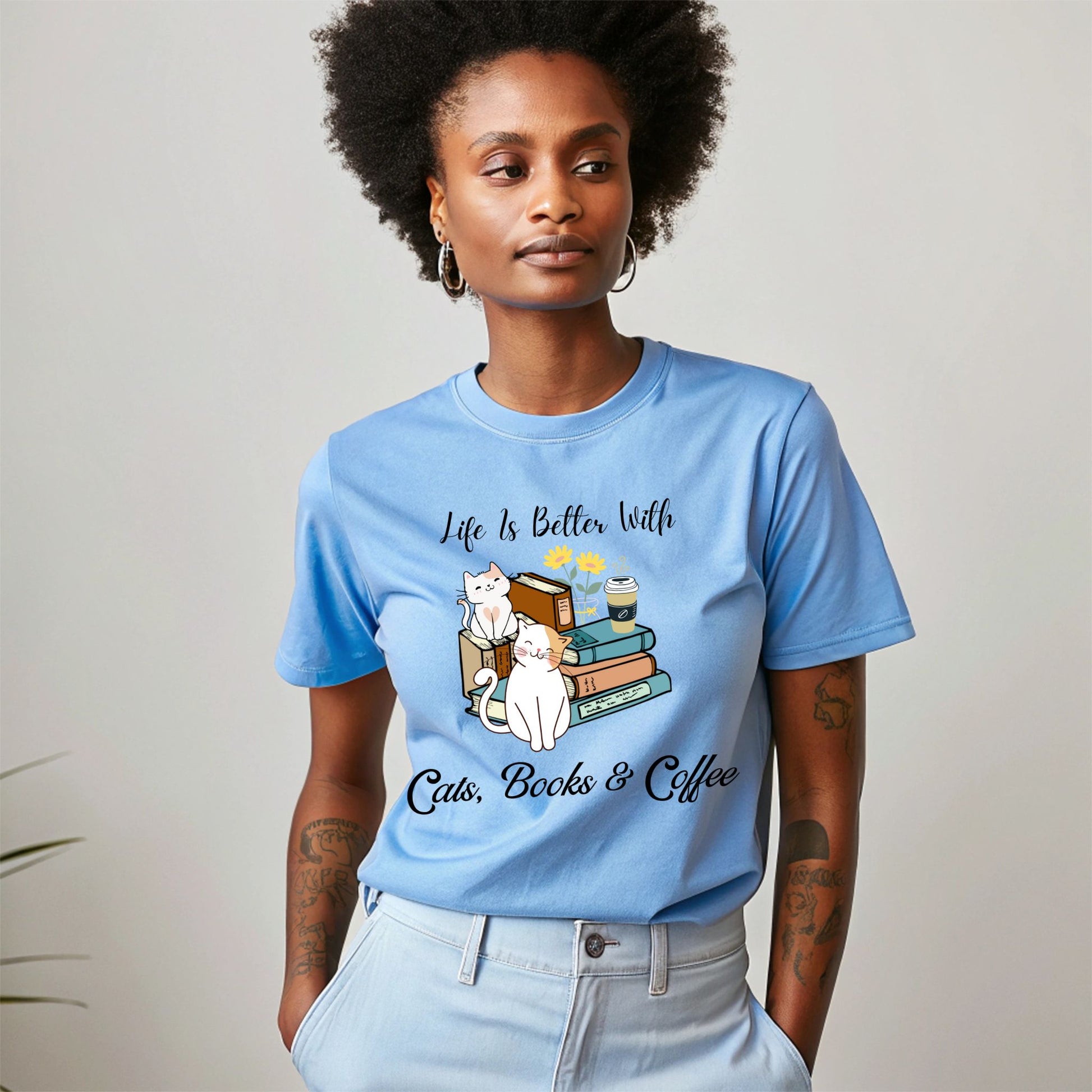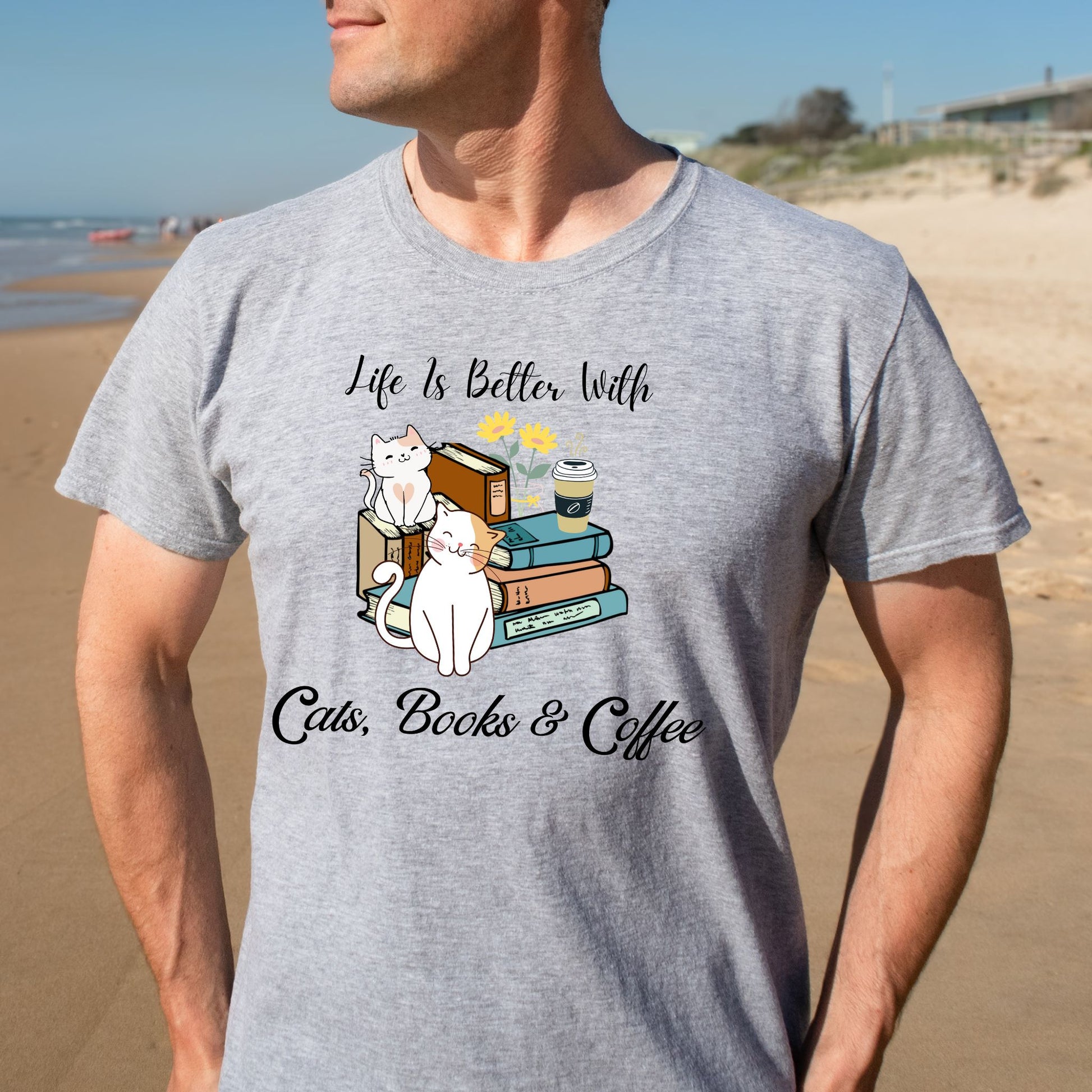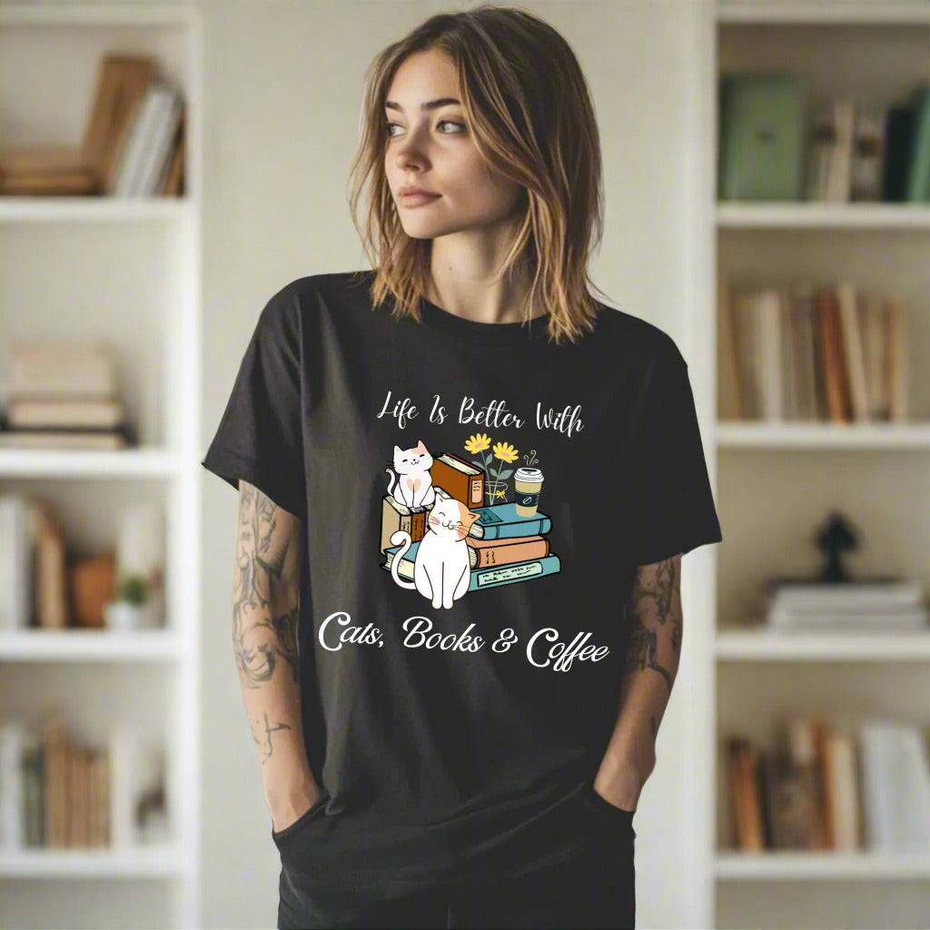 Life’s Better with Cats, Books, and Coffee T-Shirt – Cute Cat & Book Lover Graphic Tee